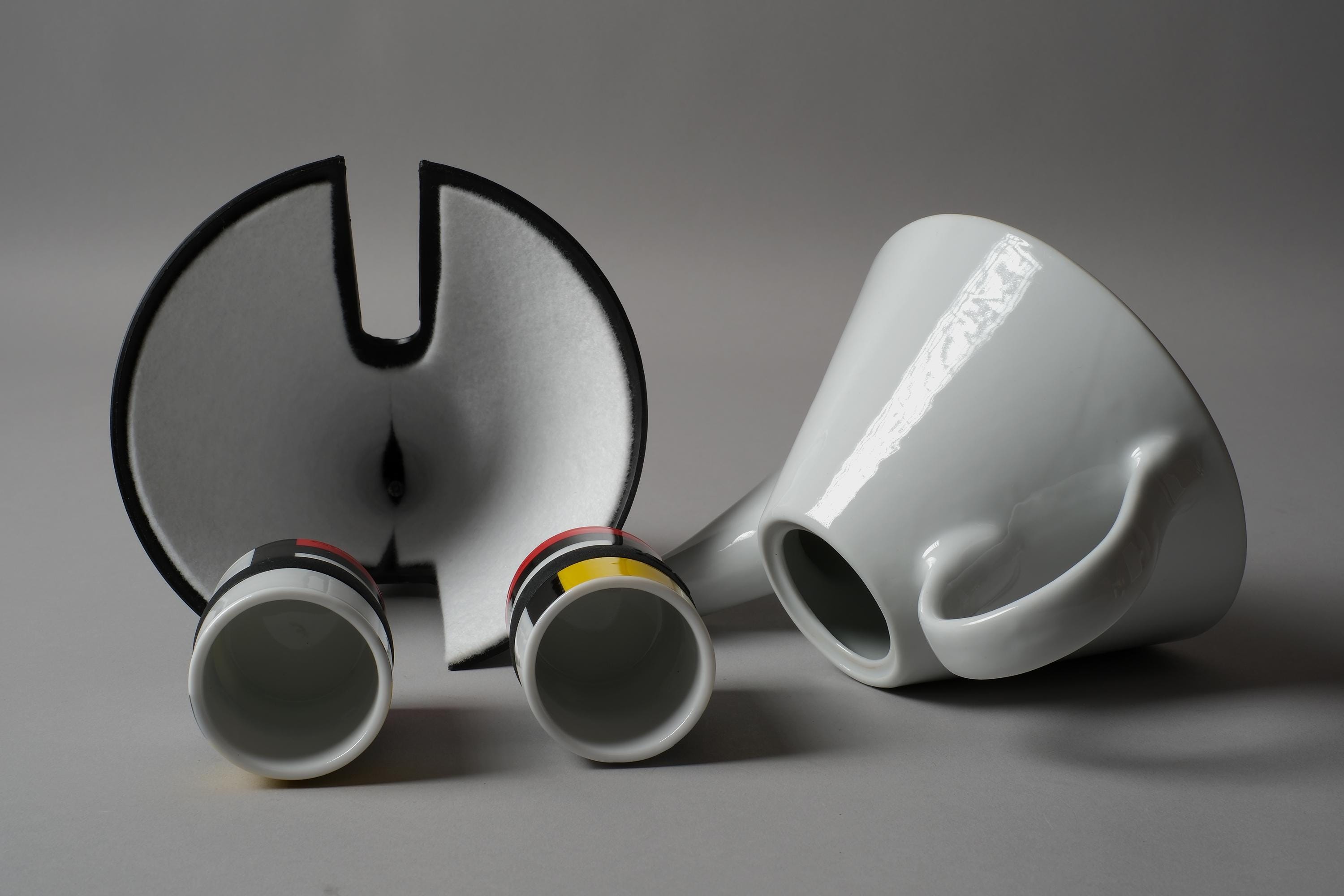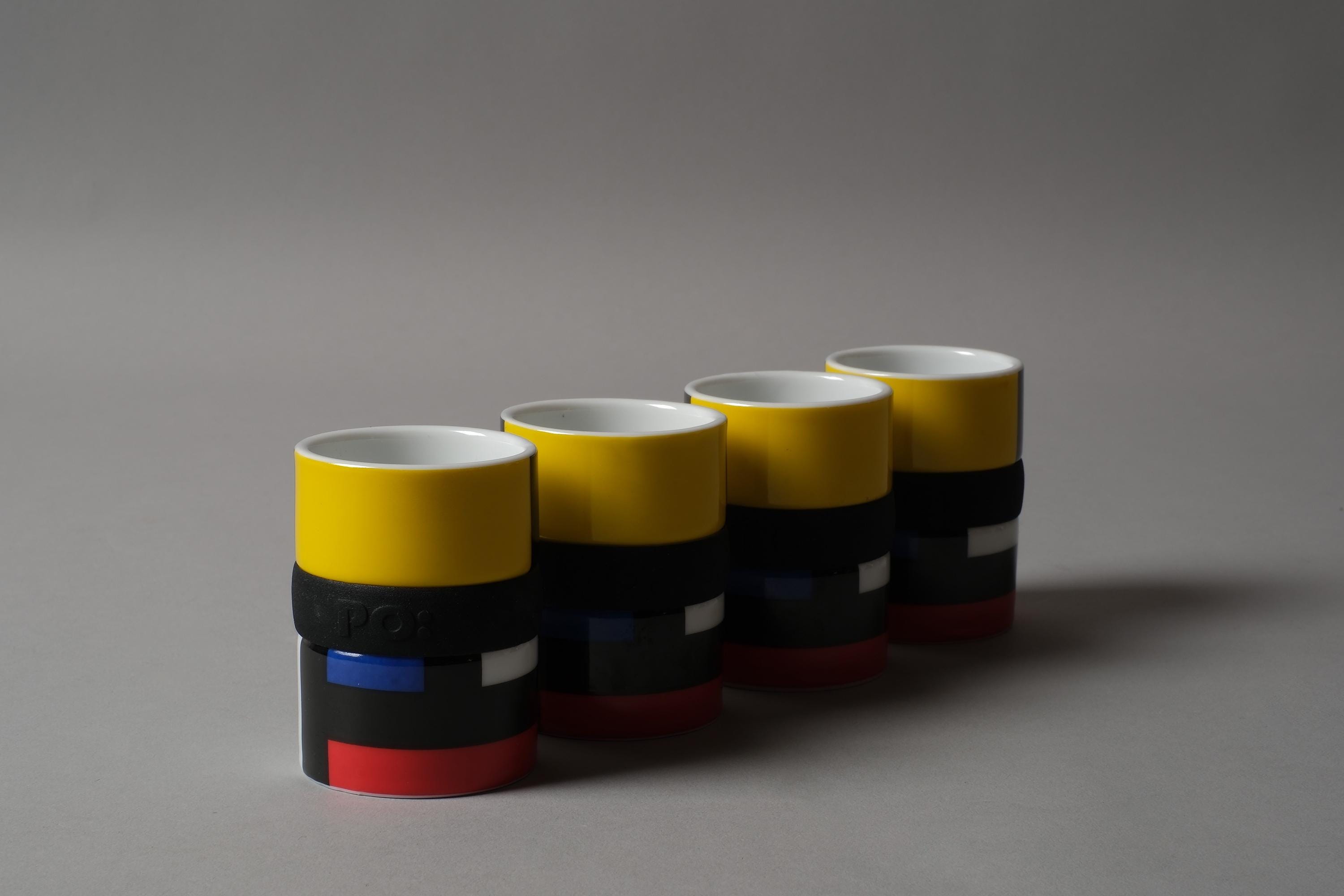 The PO Denmark Mondrian cups are porcelain with a silicone ring that allows you to hold a hot espresso without burning your fingers. The cups carry a De Stijl-inspired pattern in primary colours referencing Piet Mondrian's grid compositions.