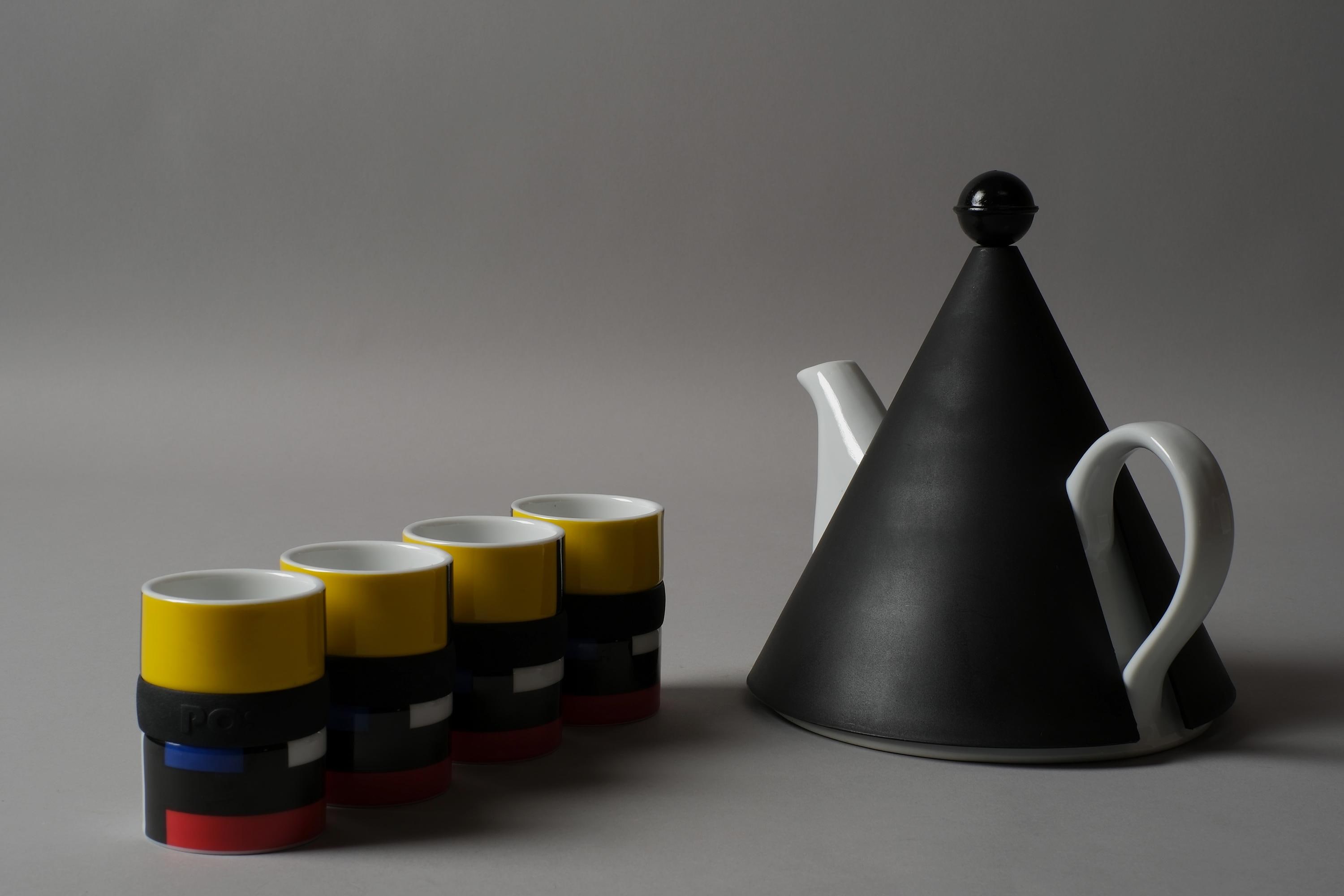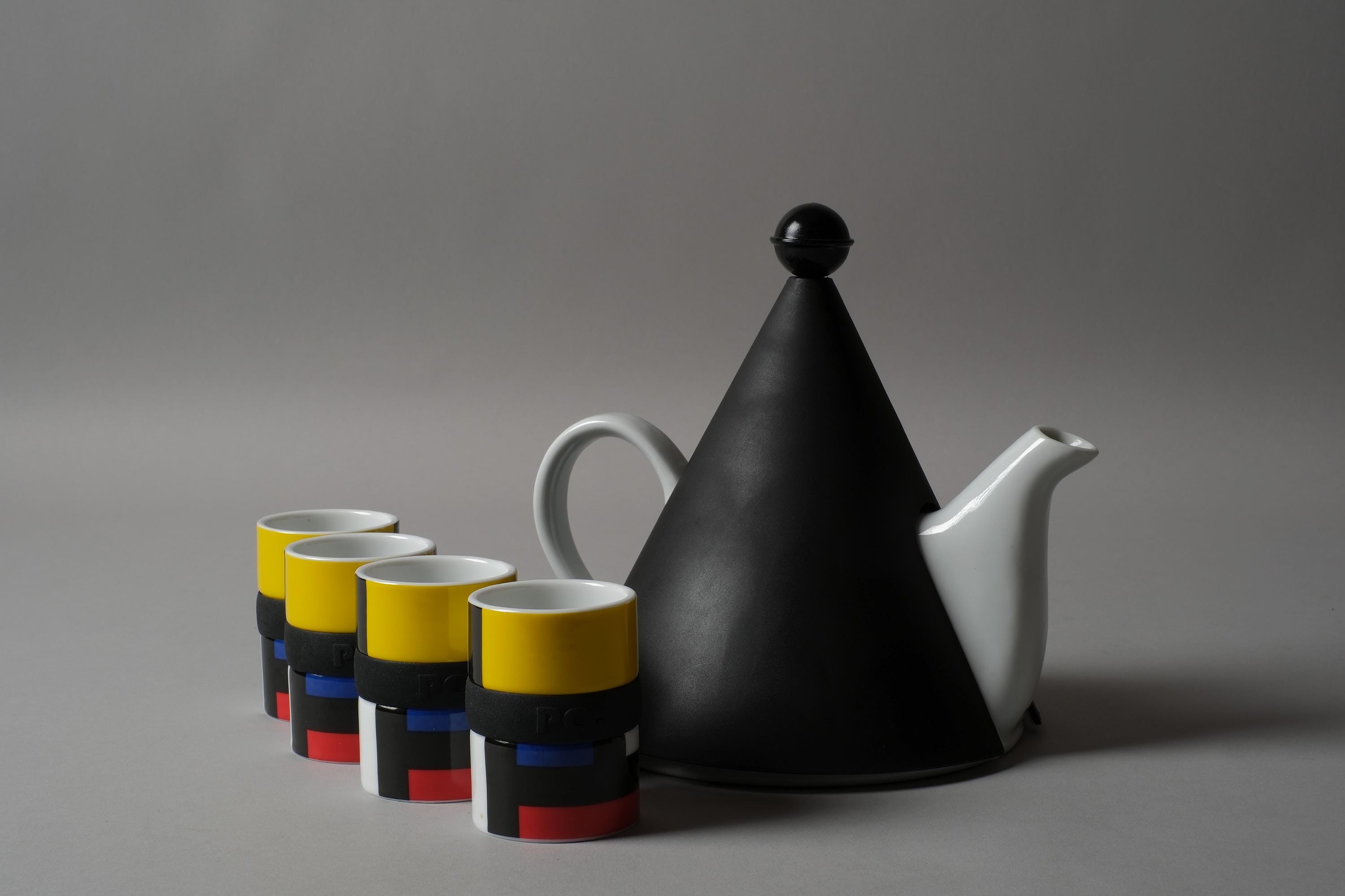 A curated espresso and tea set pairing four PO Denmark Mondrian espresso cups by Frank Kerdil with a late 1990s Puur ceramic teapot from Holland. These are two Dutch-connected design objects that share a visual language of geometric minimalism.