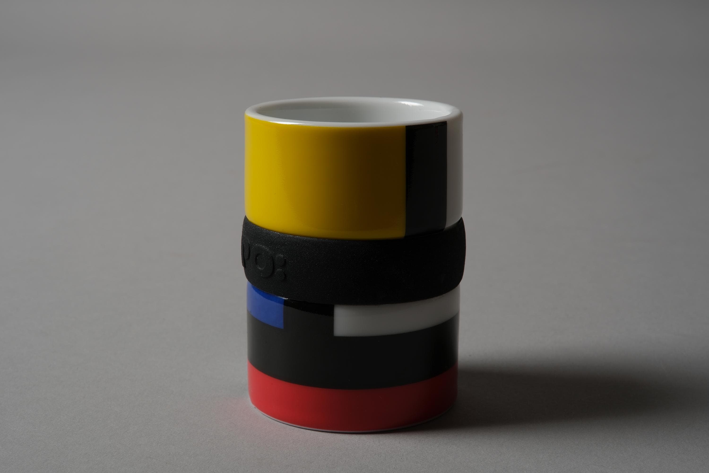• Cups: Set of 4, porcelain with silicone ring, De Stijl Mondrian pattern.