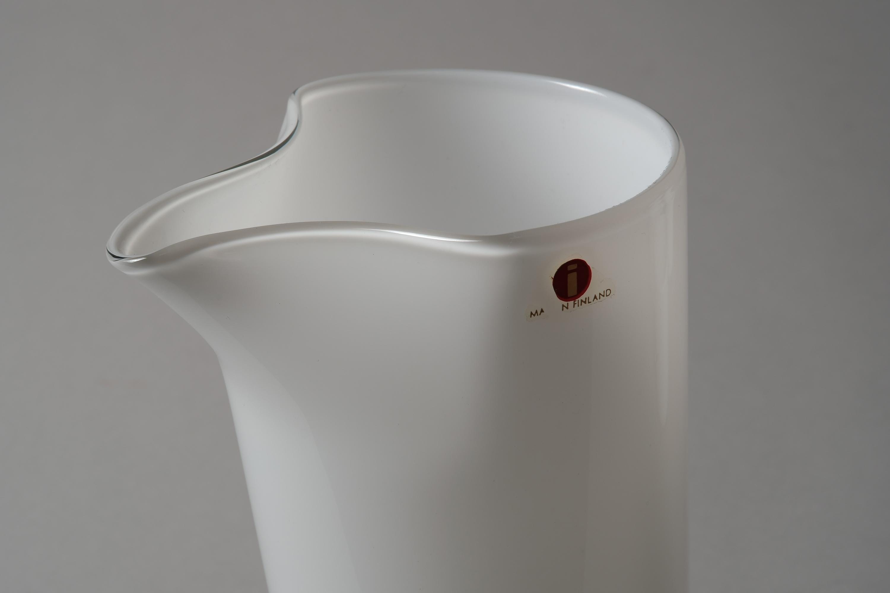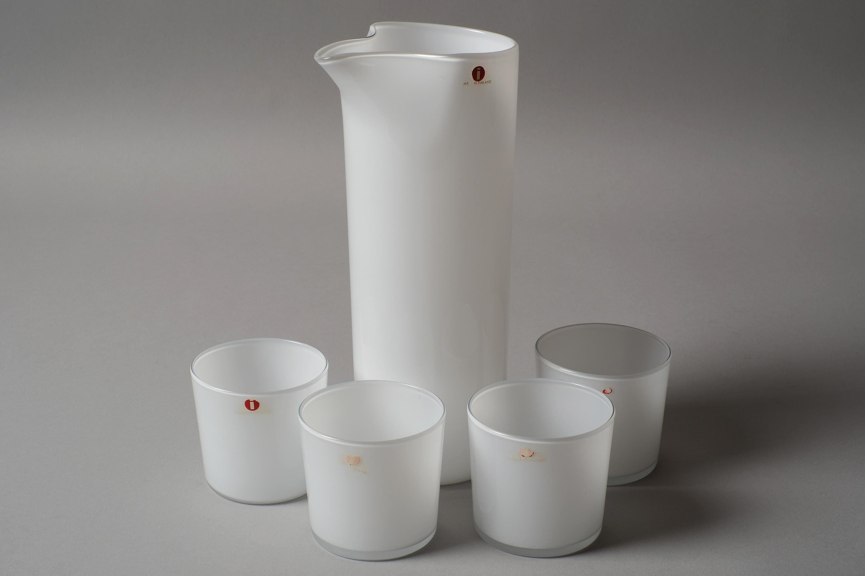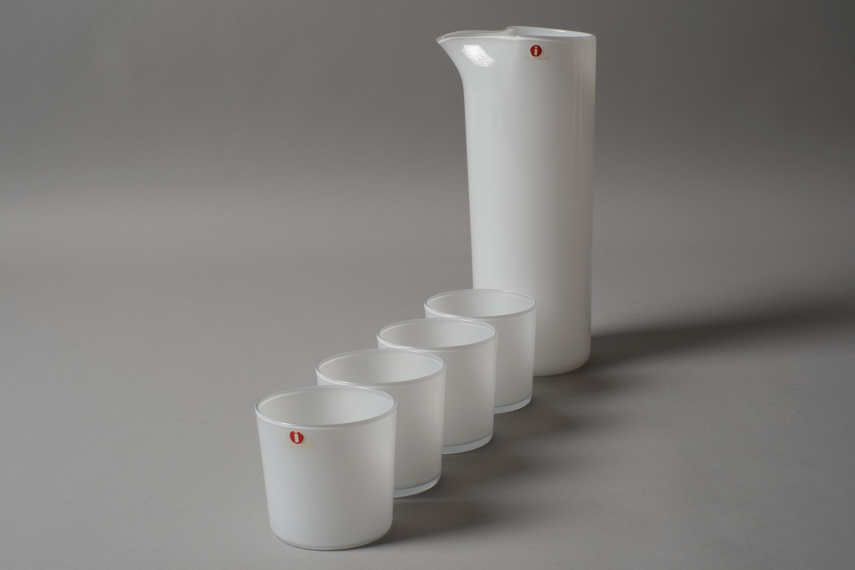 Elegant and sculptural, this vintage Iittala i‑Lasi glass set was designed by Timo Sarpaneva and produced in Finland in the 1960s. The set features one tall white glass carafe and four matching tumblers with a glossy finish, each accented with the classic red Iittala logo sticker.