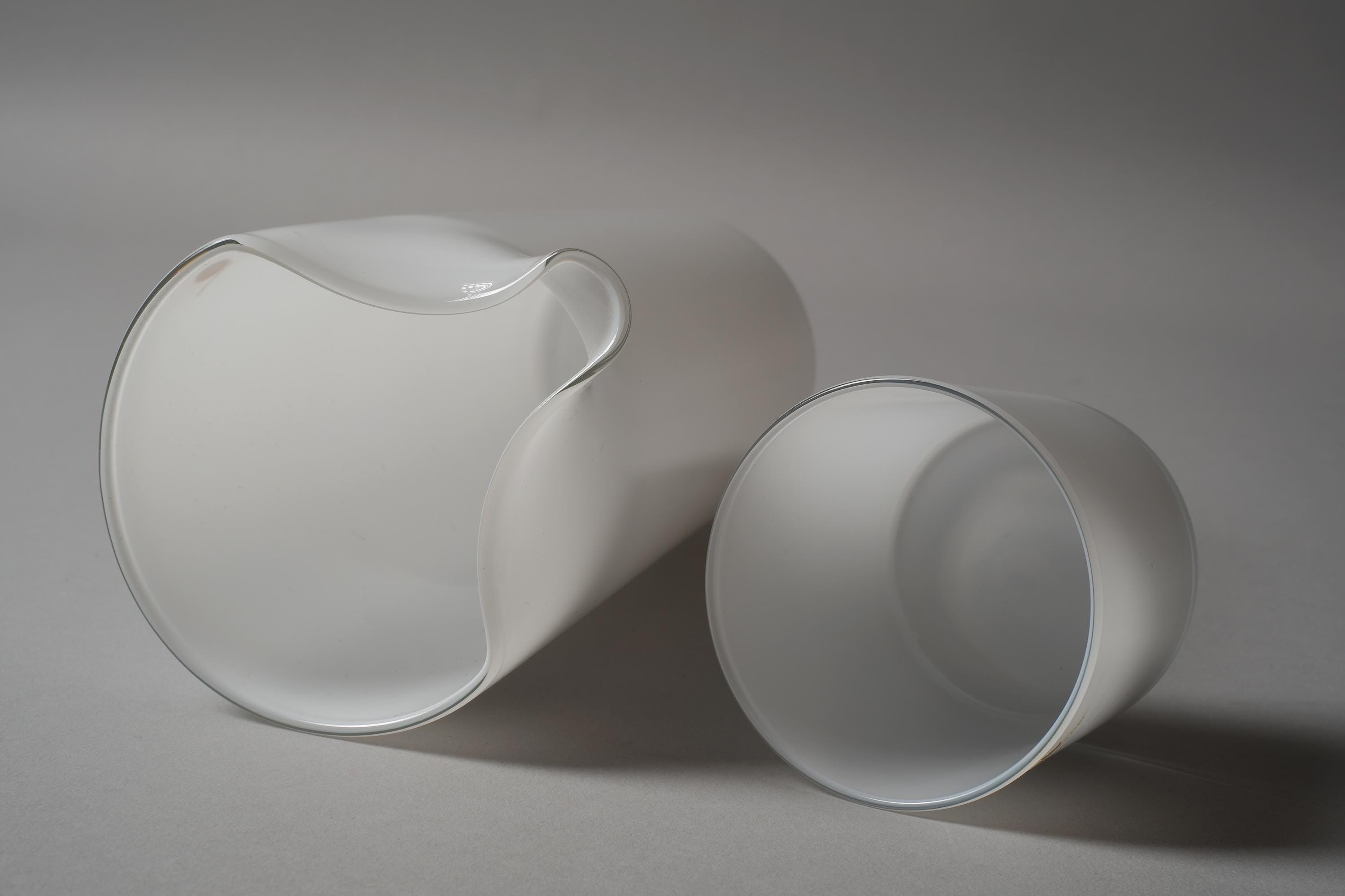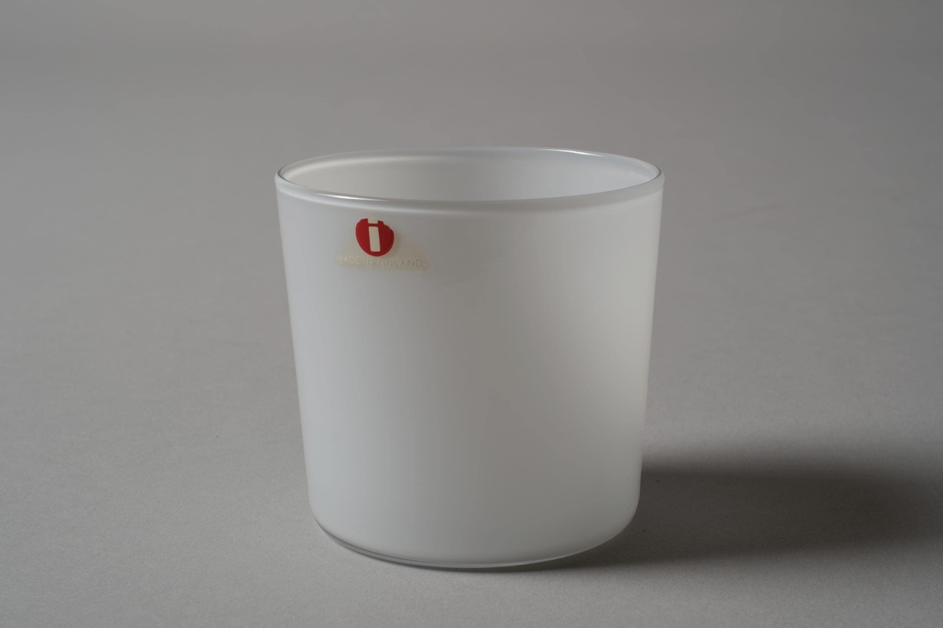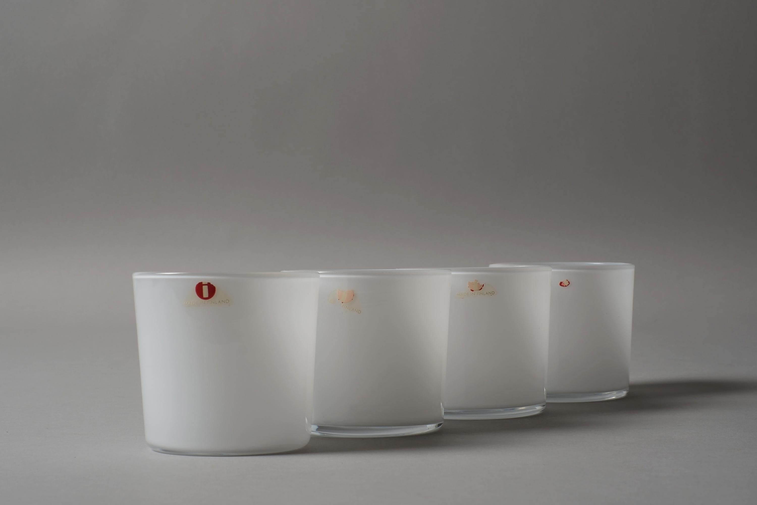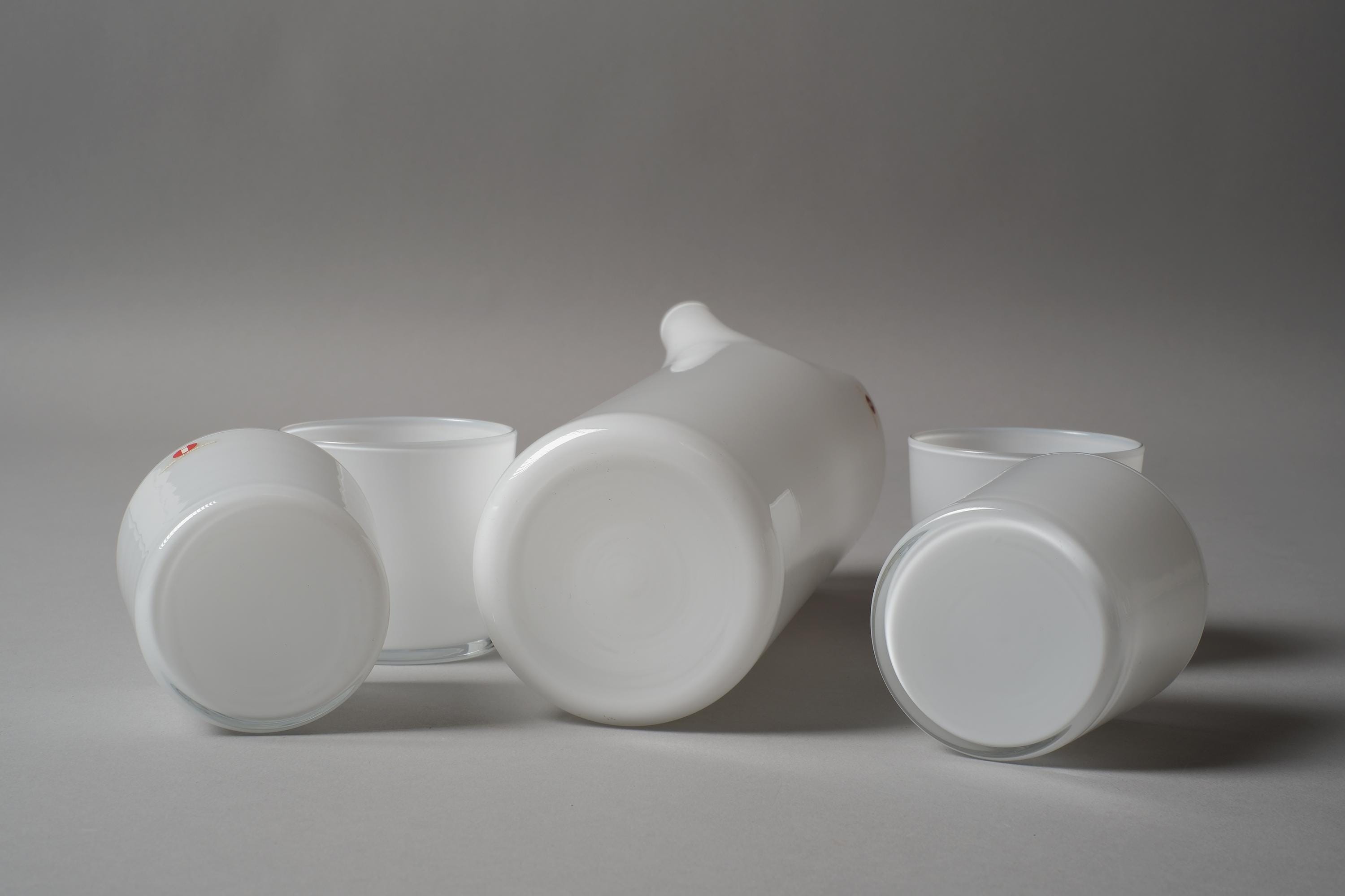 Elegant and sculptural, this vintage Iittala i‑Lasi glass set was designed by Timo Sarpaneva and produced in Finland in the 1960s. The set features one tall white glass carafe and four matching tumblers with a glossy finish, each accented with the classic red Iittala logo sticker.