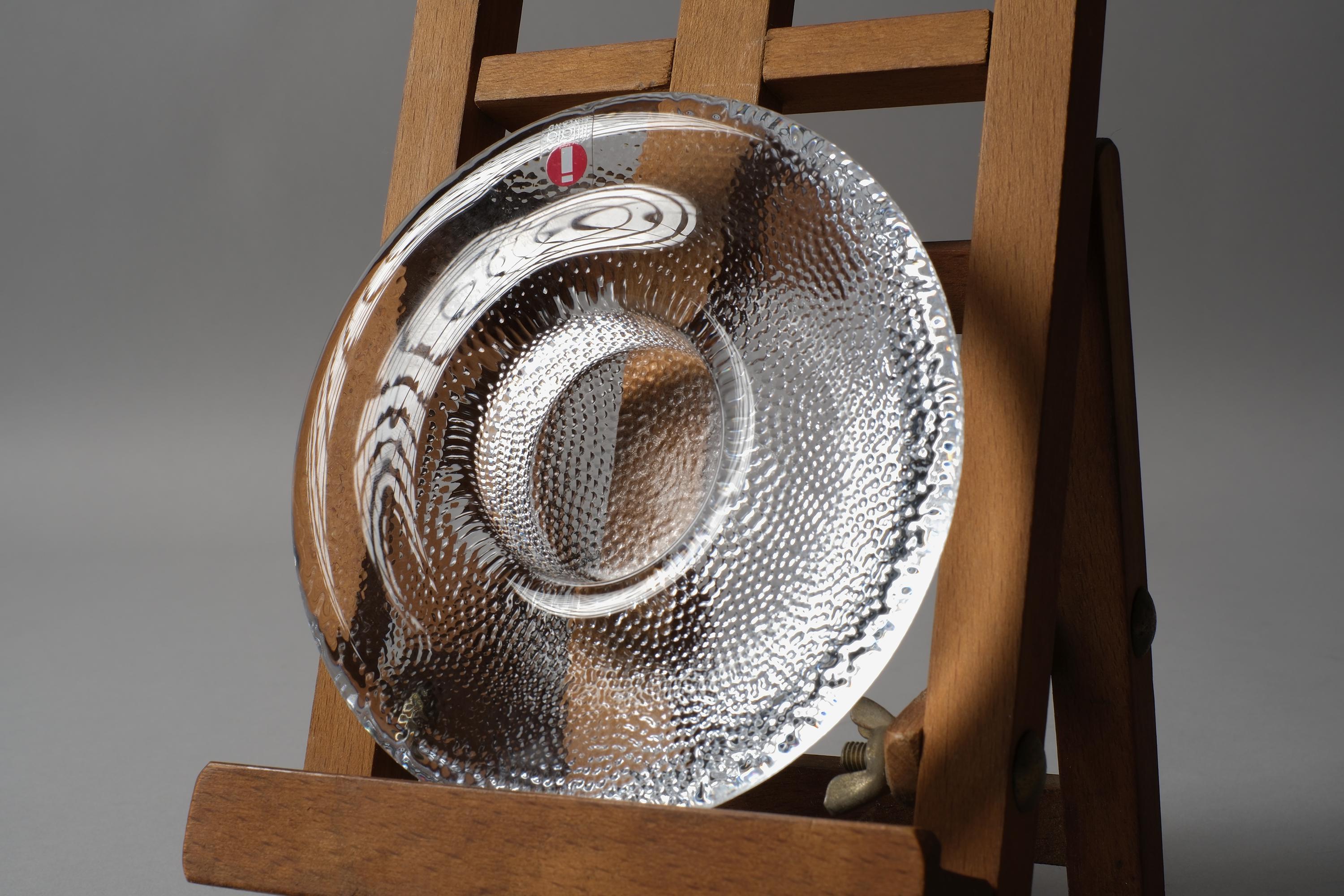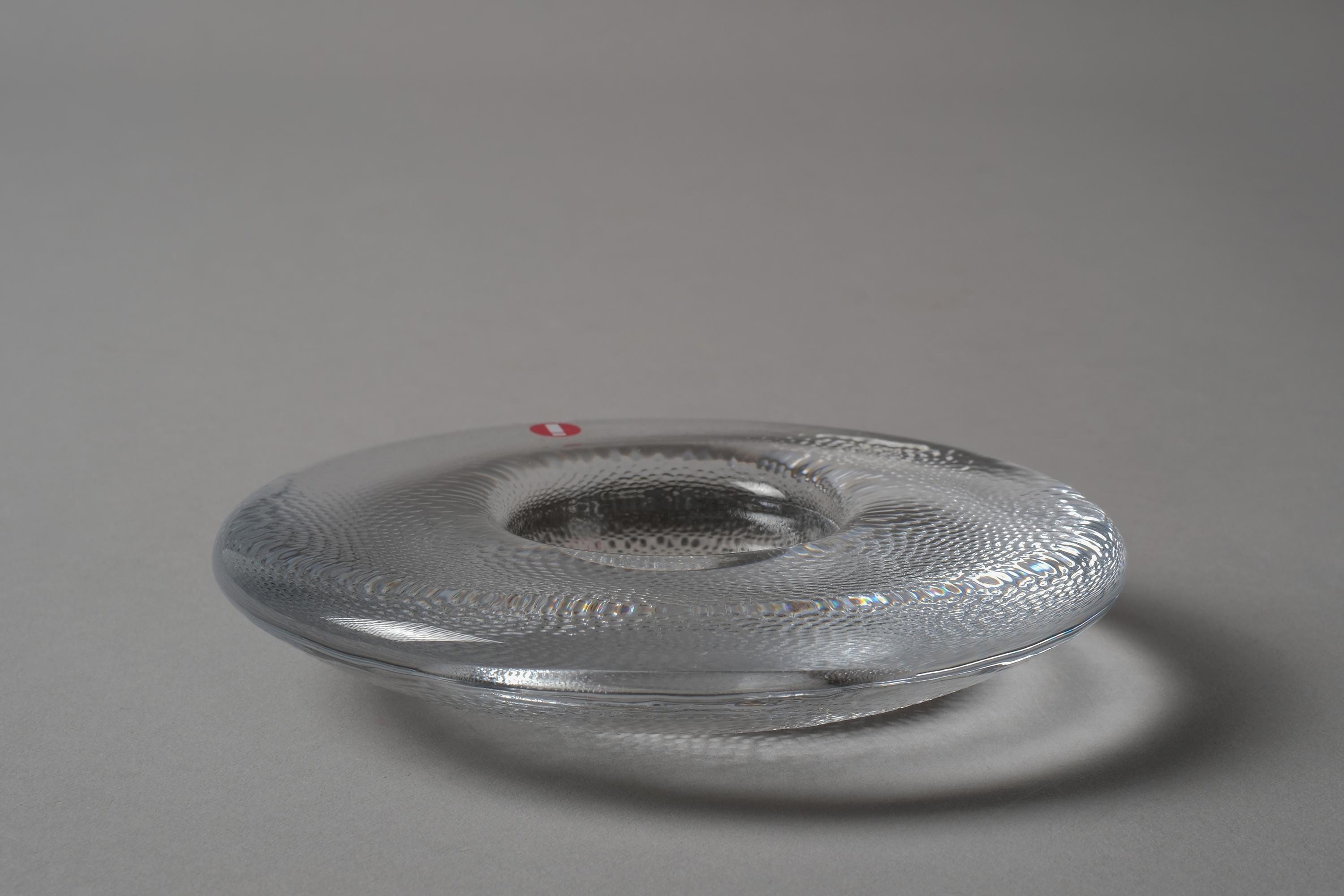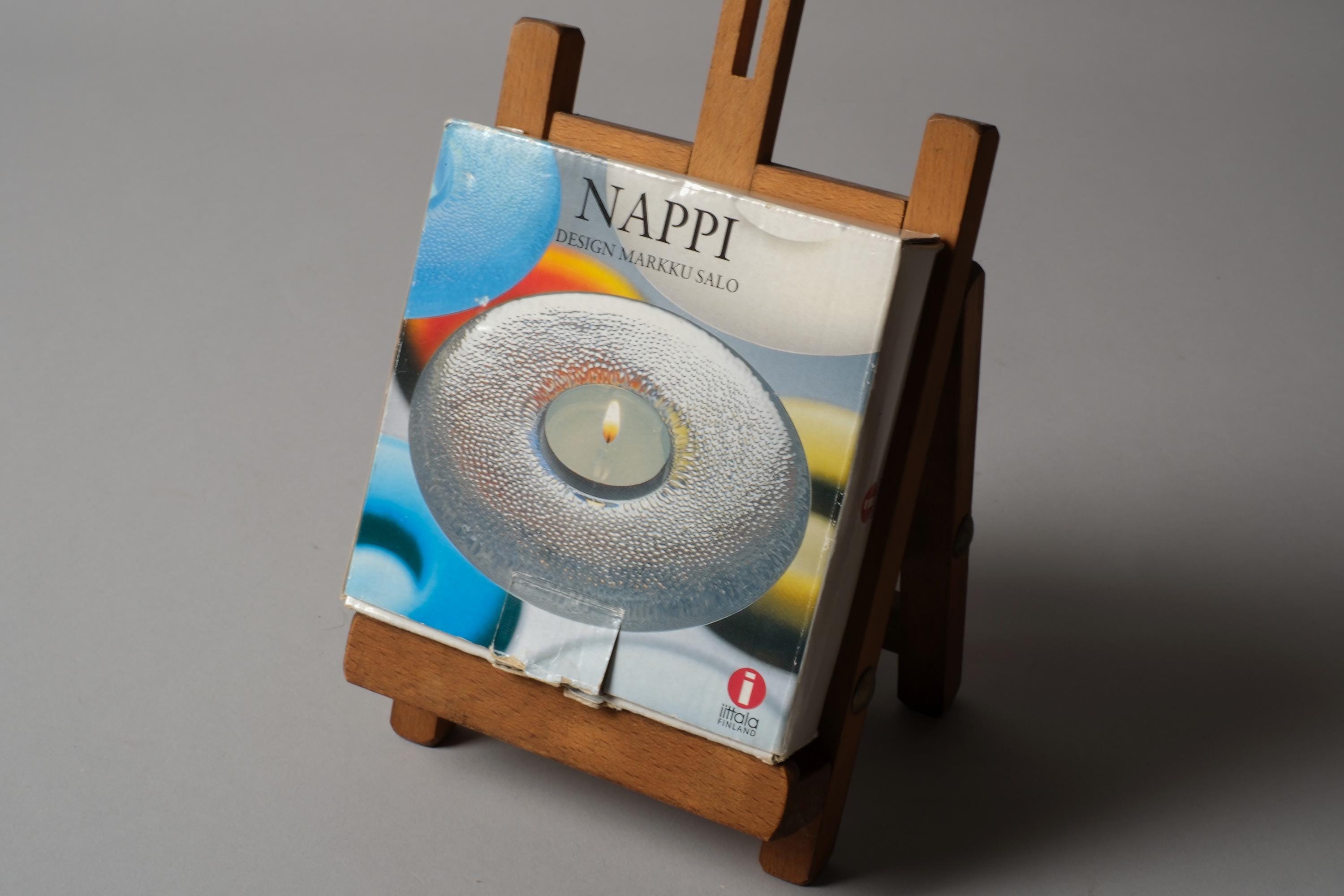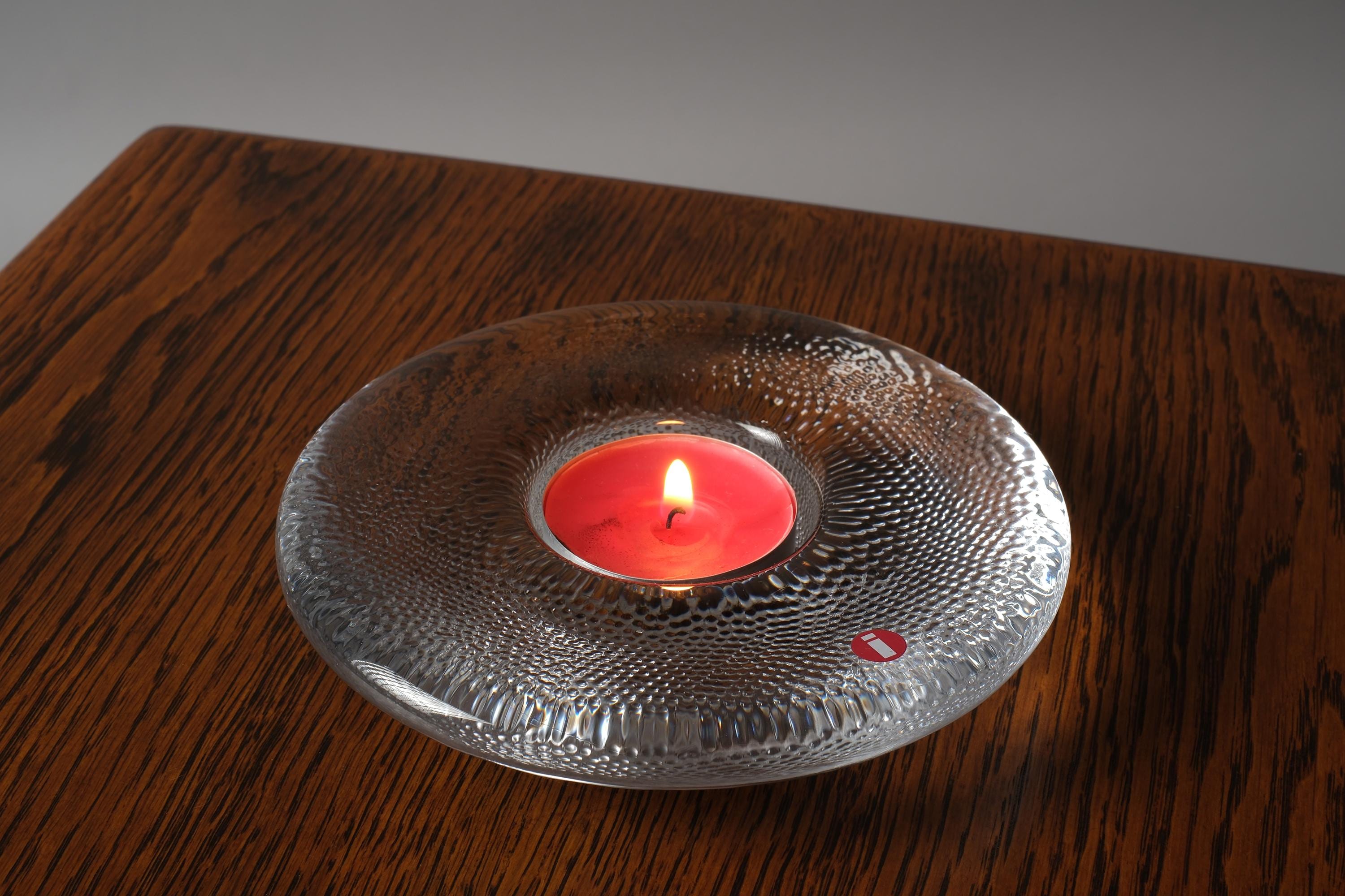 Iittala Nappi votive candle holder in clear textured glass by Markku Salo, Finland. The holder is a flat disc with a textured convex underside and a smooth polished top surface with a central tealight recess, in new old stock condition in its original first-issue Iittala box.