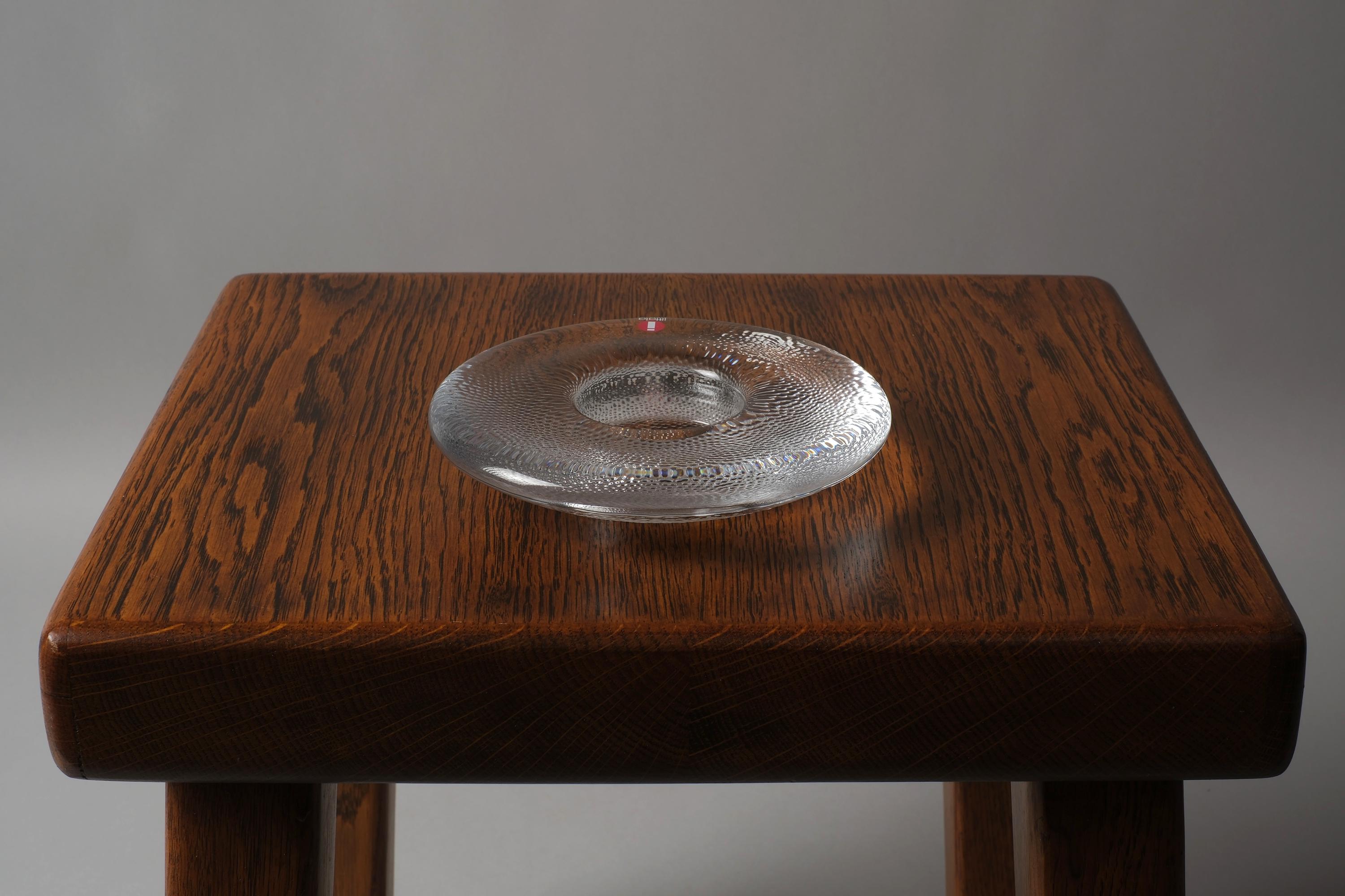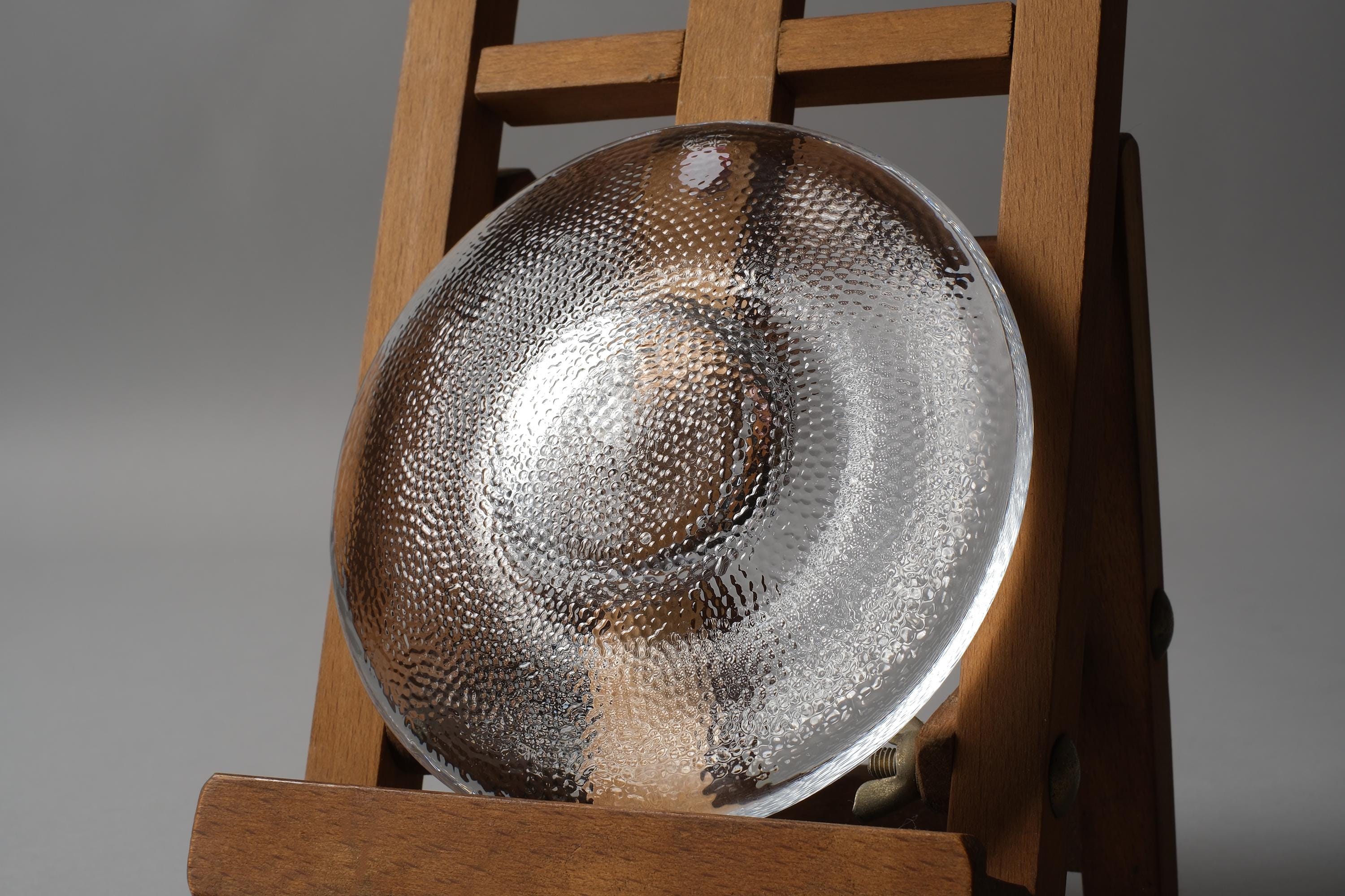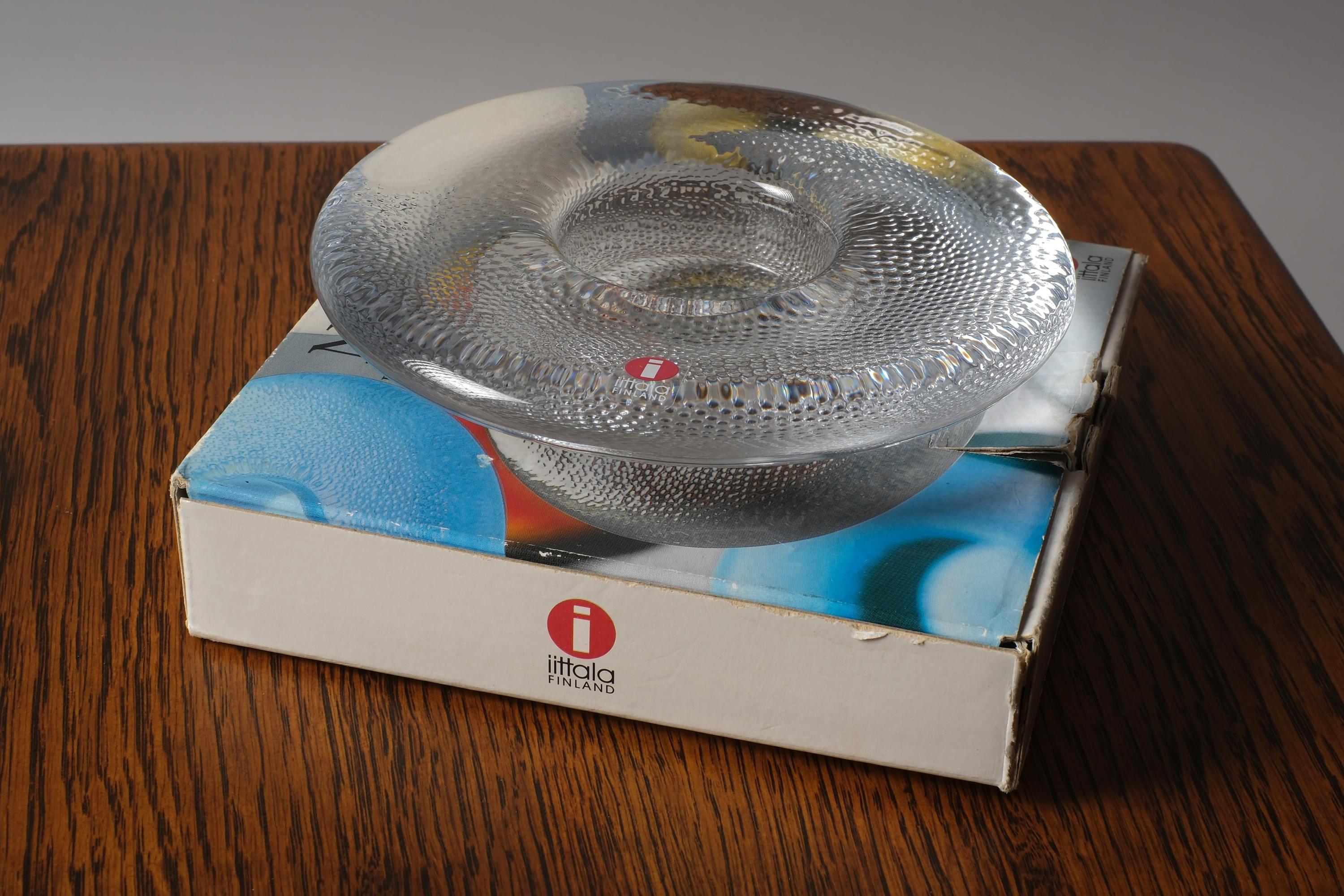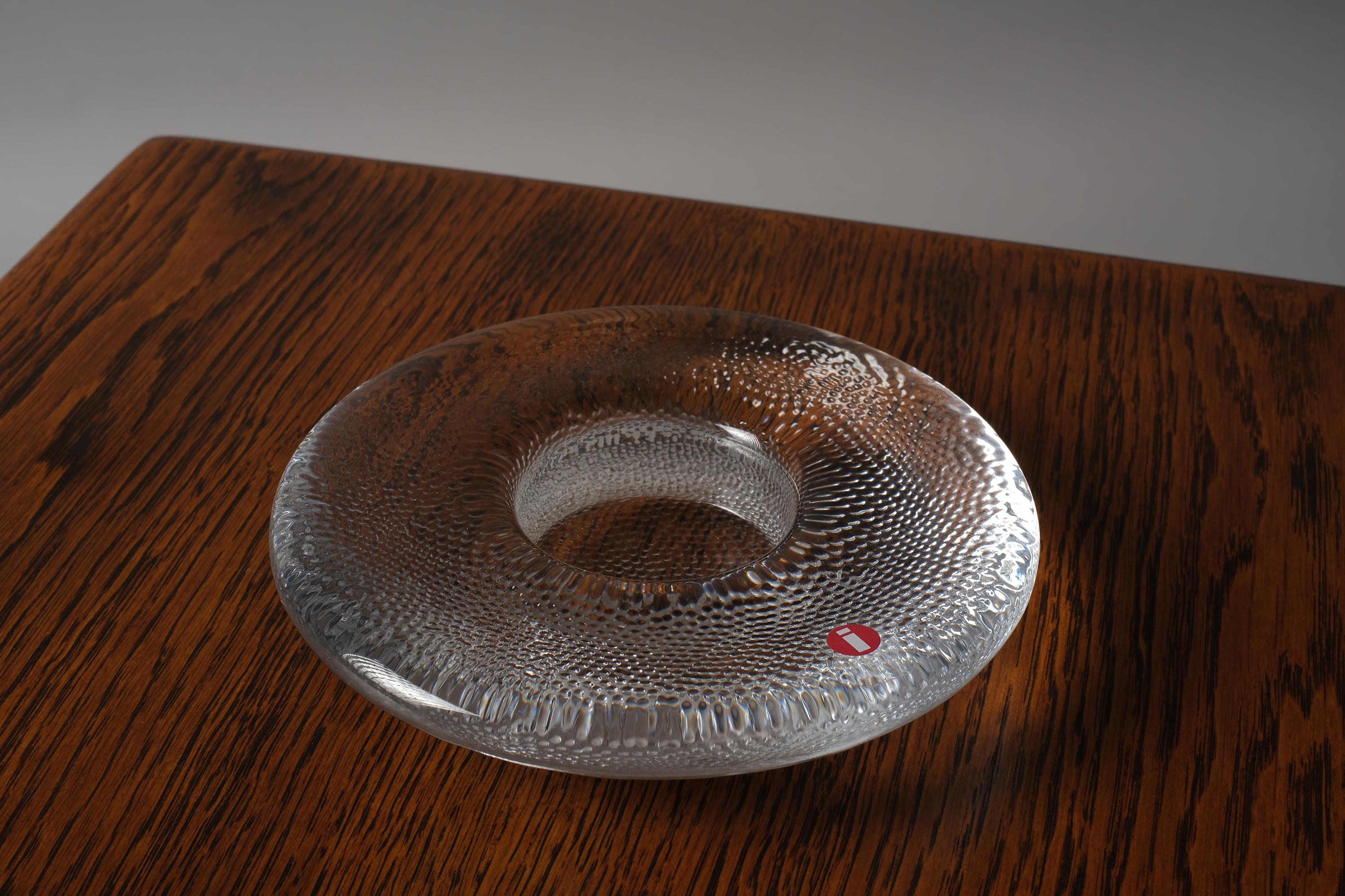 Iittala Nappi votive candle holder in clear textured glass by Markku Salo, Finland. The holder is a flat disc with a textured convex underside and a smooth polished top surface with a central tealight recess, in new old stock condition in its original first-issue Iittala box.