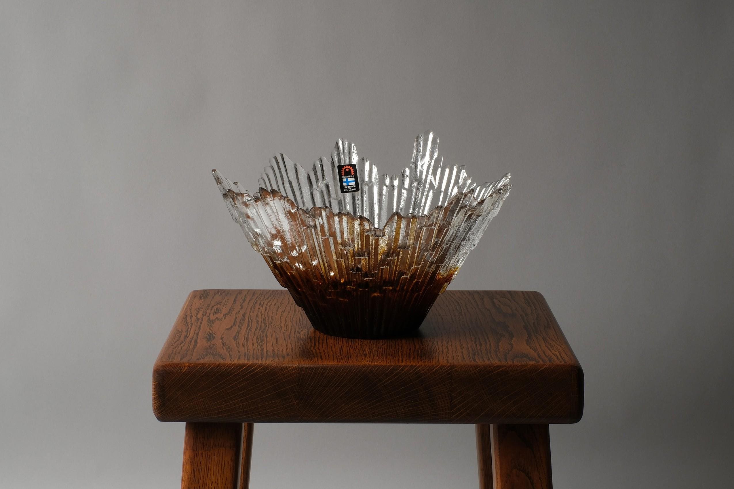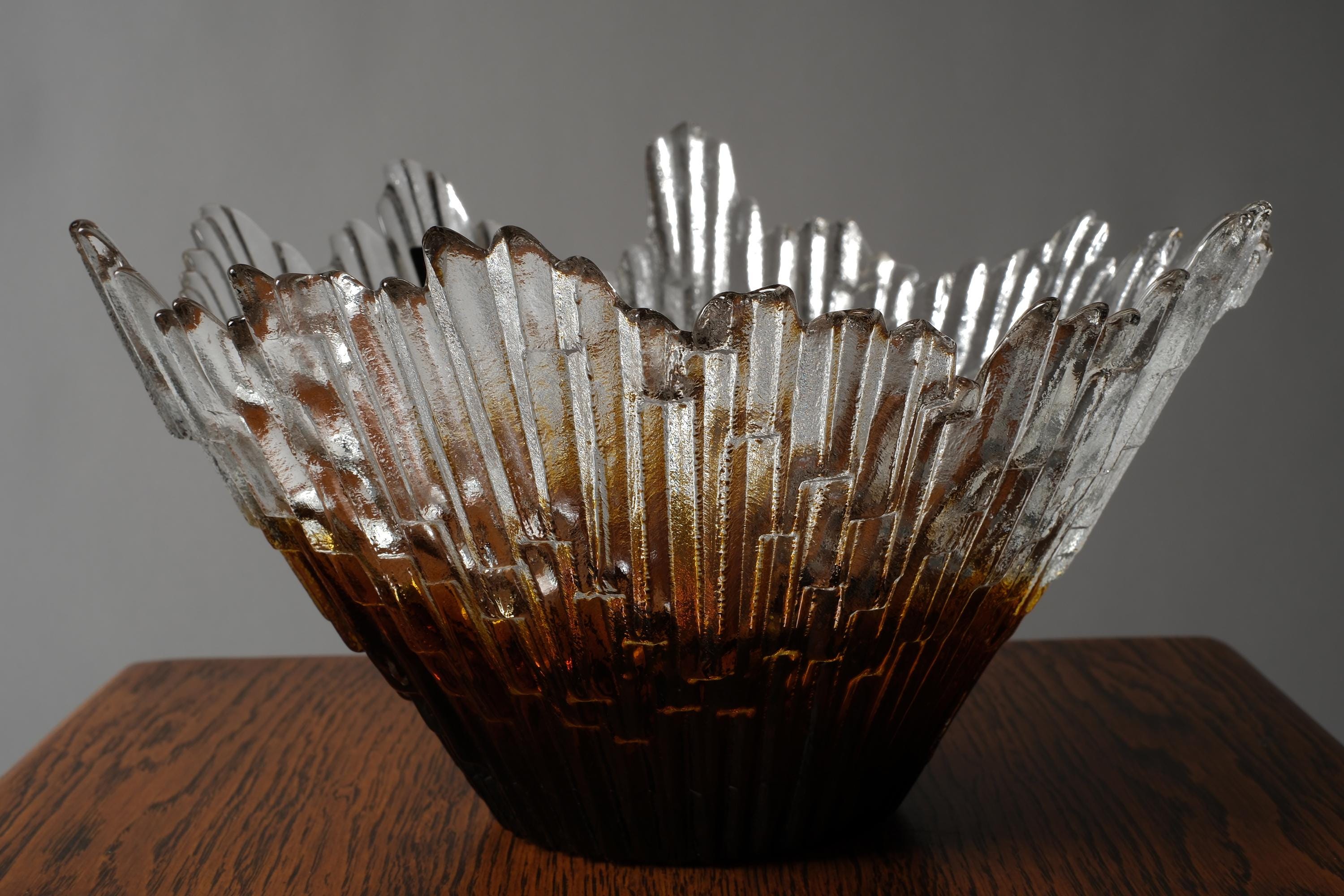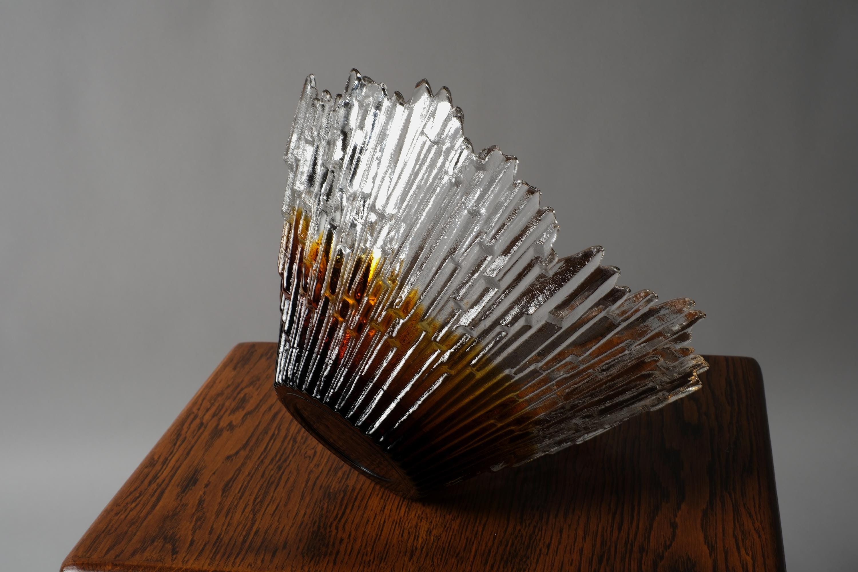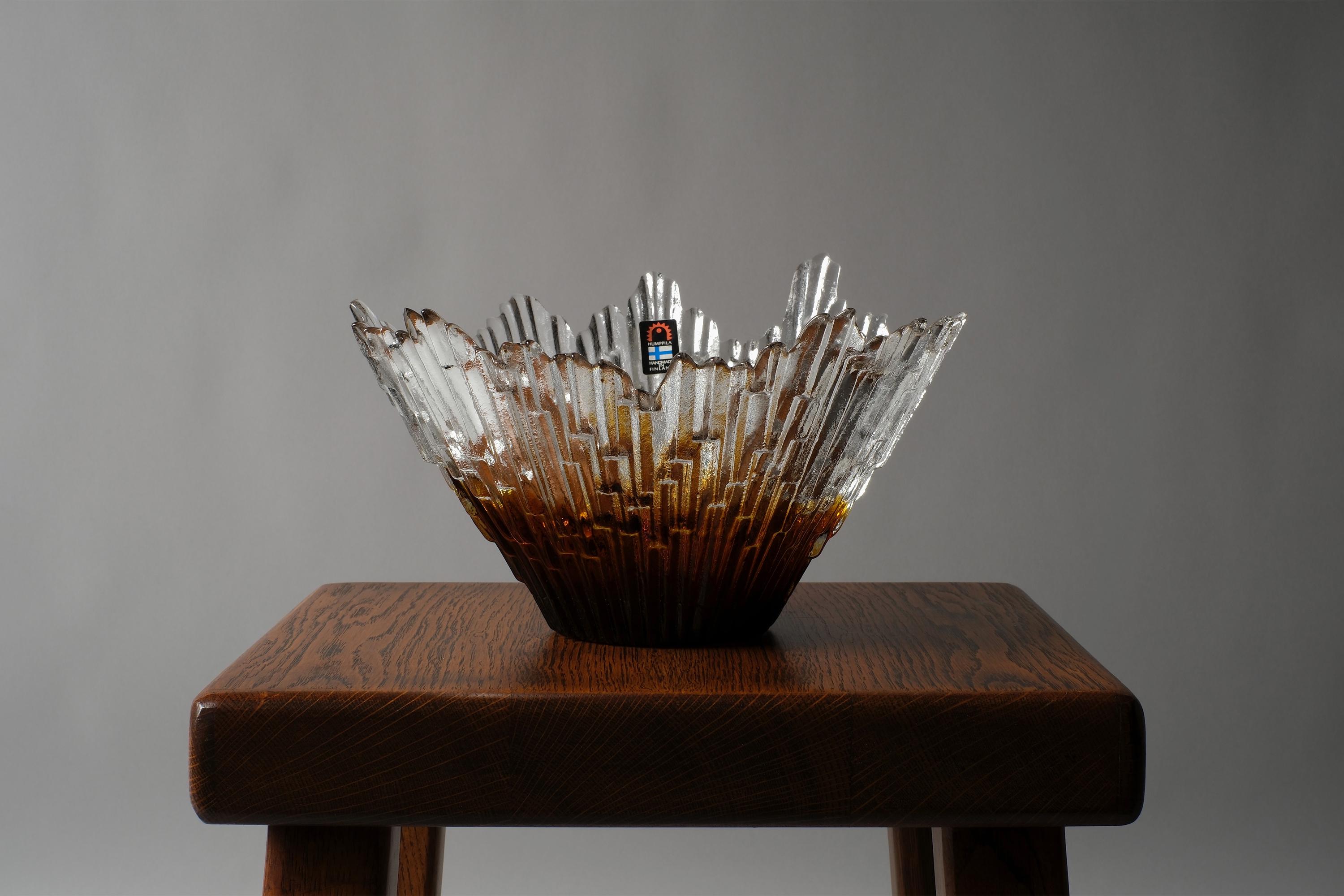 Vintage brutalist art glass bowl Revontulet 'Northern Lights' by Tauno Wirkkala, Finland. The exterior built from jagged upward-spiking ice crystal formations in thick cast glass, graduating from deep amber at the base through lighter amber to clear at the tips, the interior is smooth and polished.