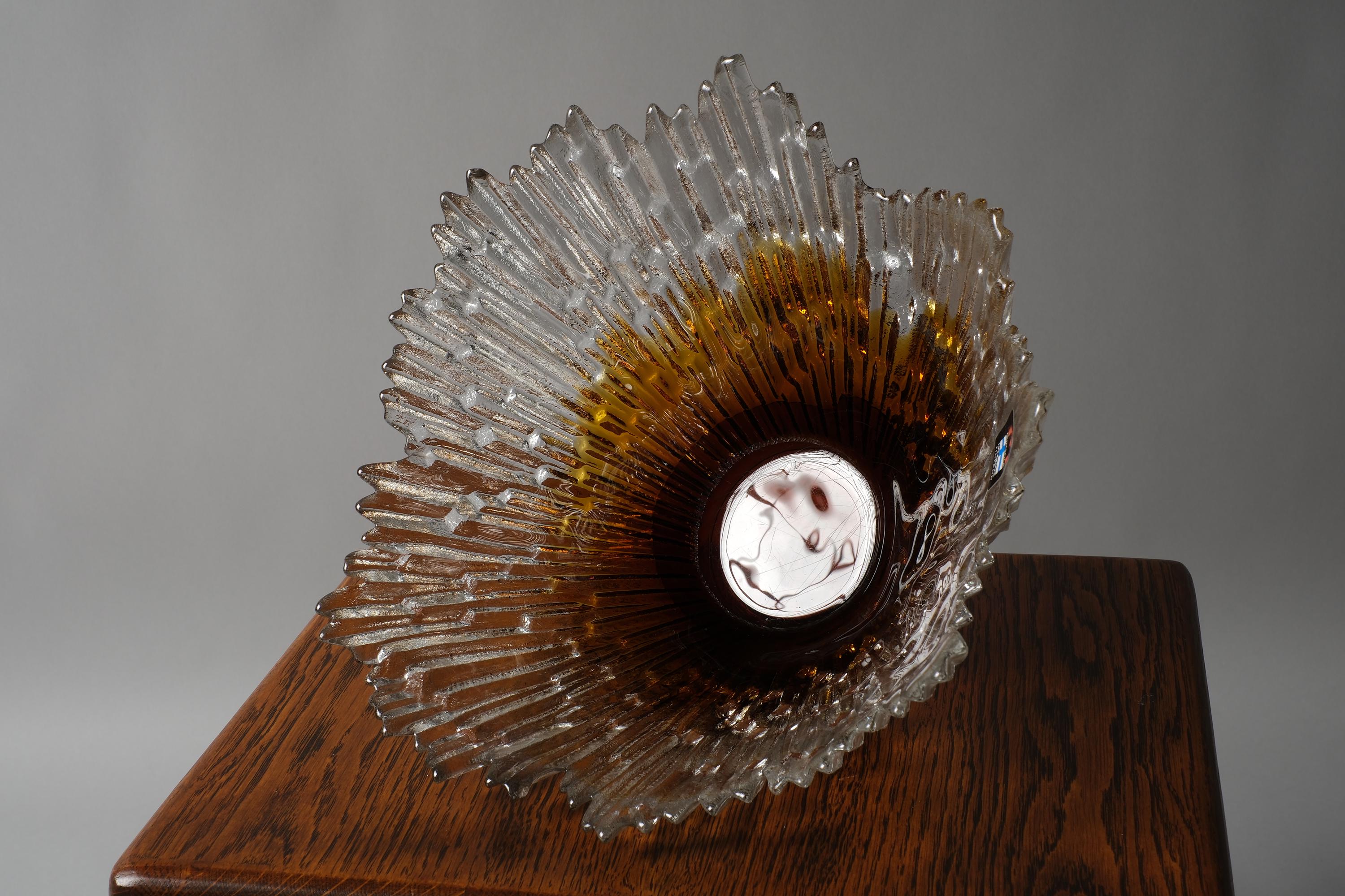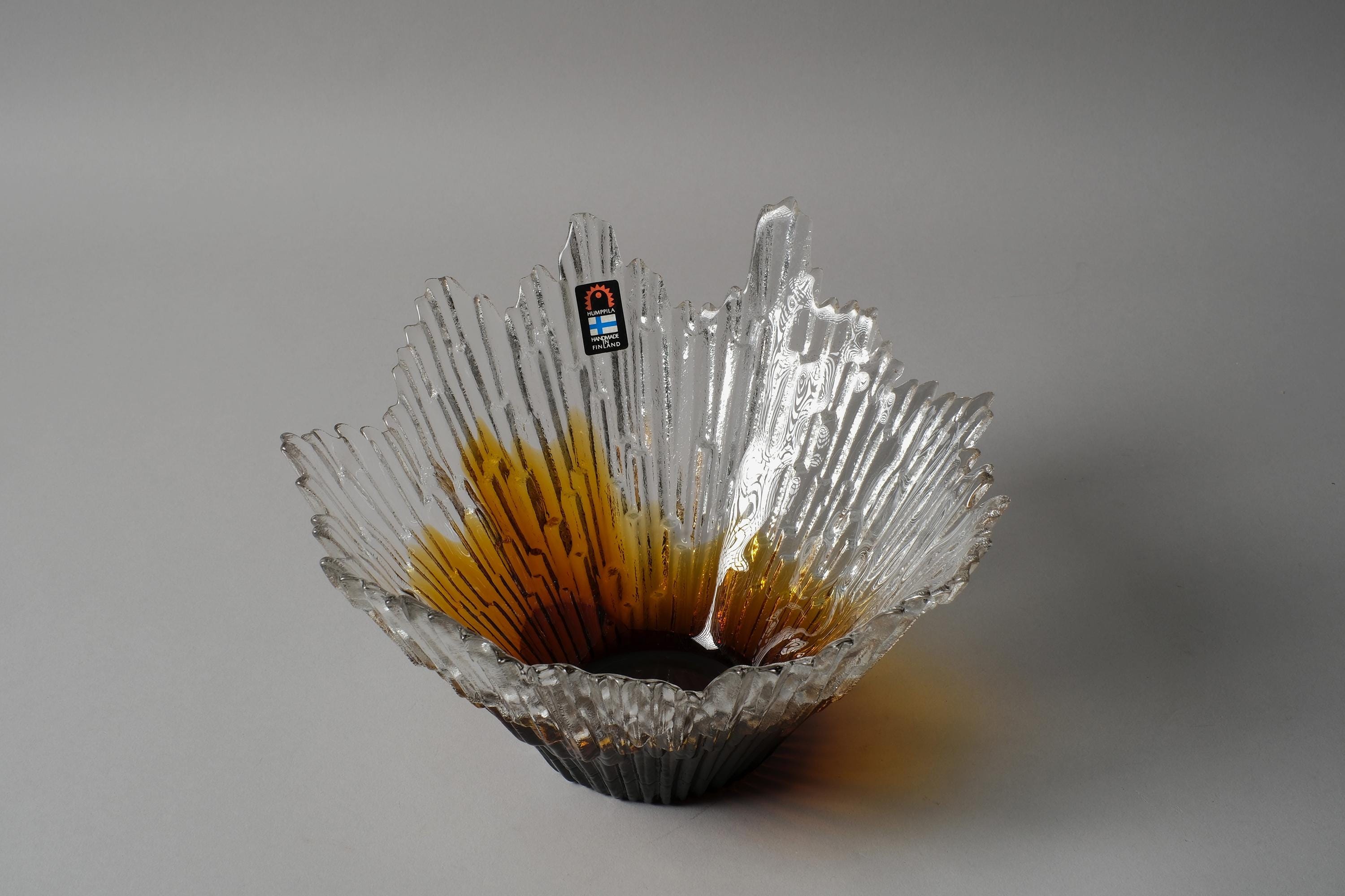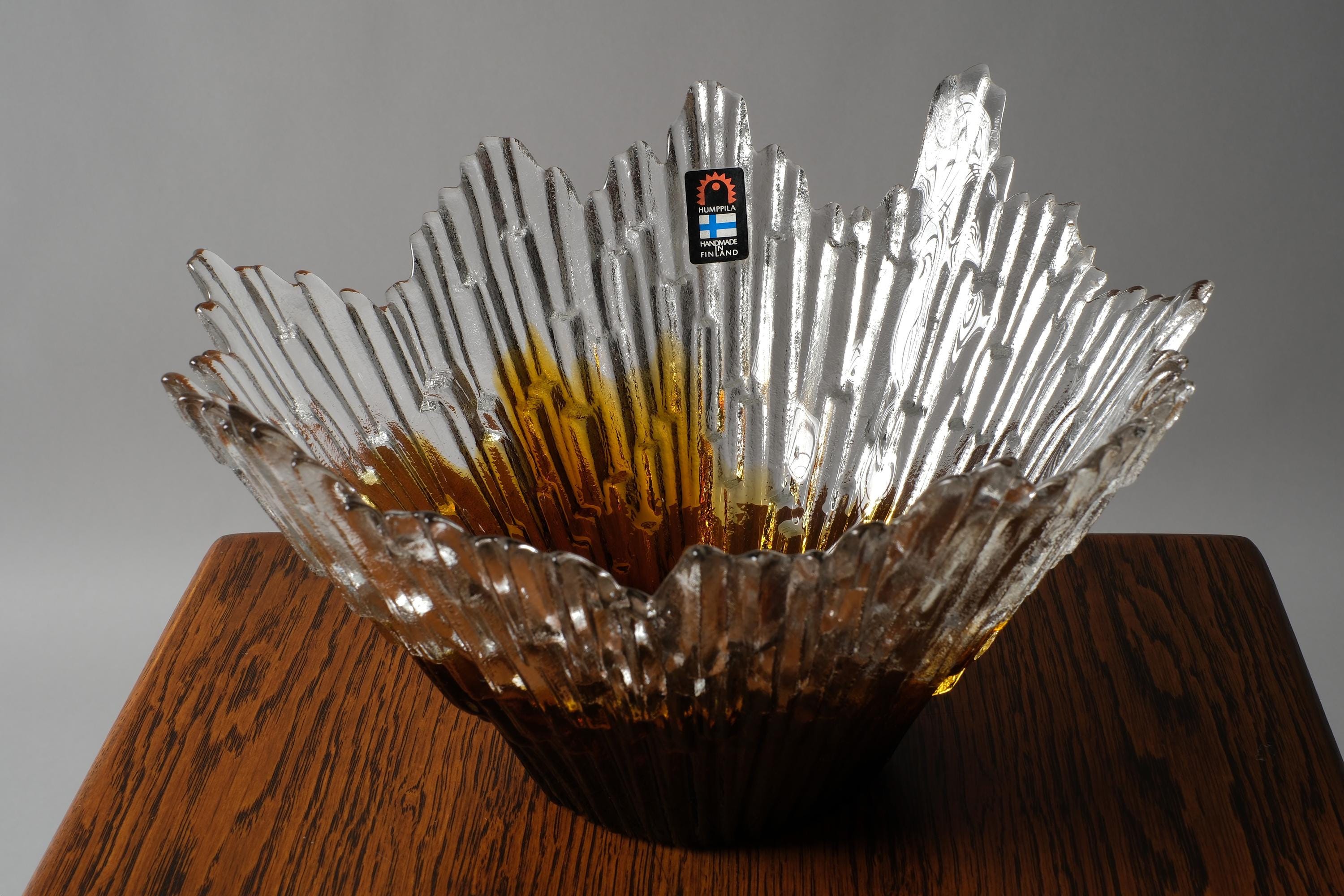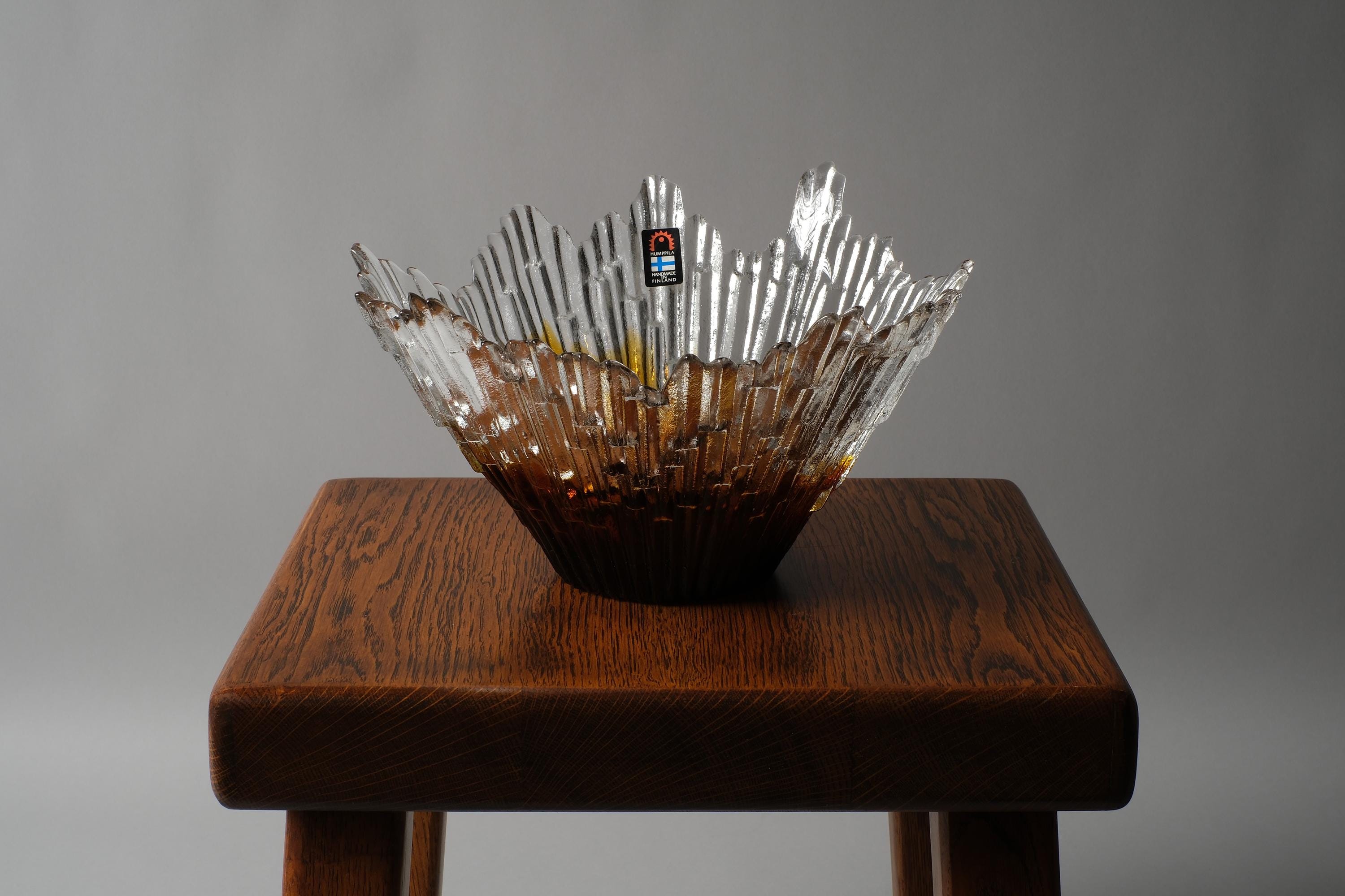 Vintage brutalist art glass bowl Revontulet 'Northern Lights' by Tauno Wirkkala, Finland. The exterior built from jagged upward-spiking ice crystal formations in thick cast glass, graduating from deep amber at the base through lighter amber to clear at the tips, the interior is smooth and polished.