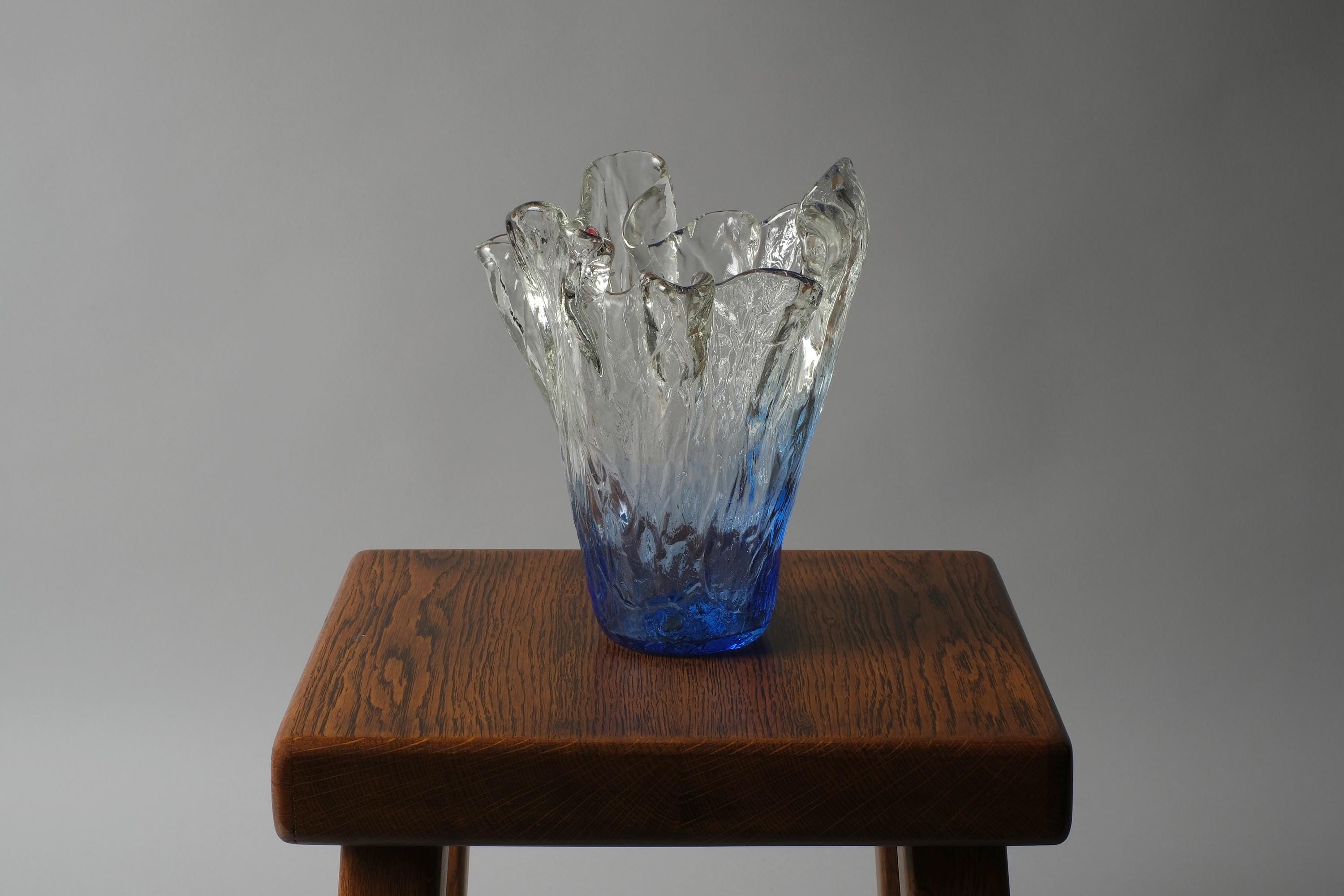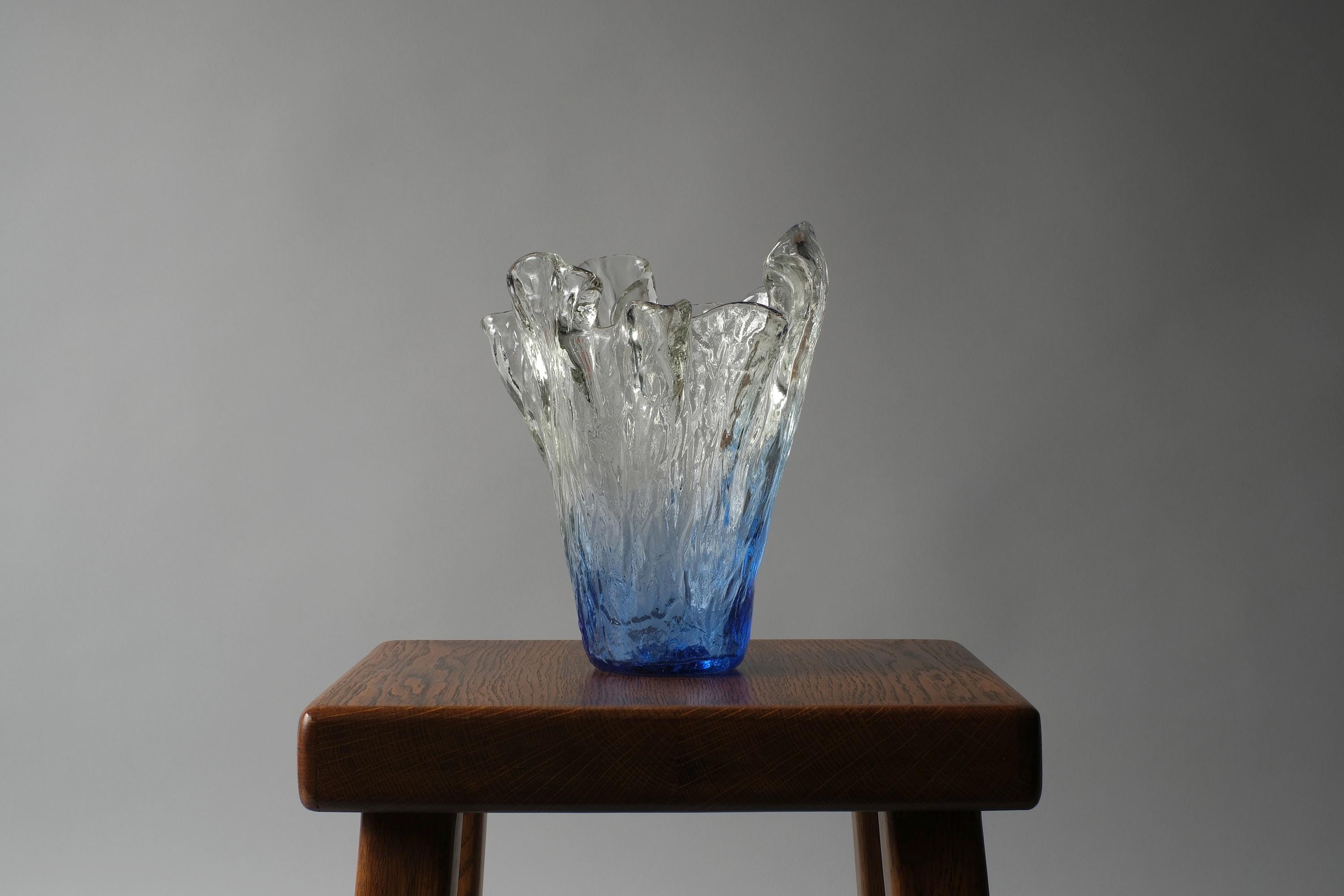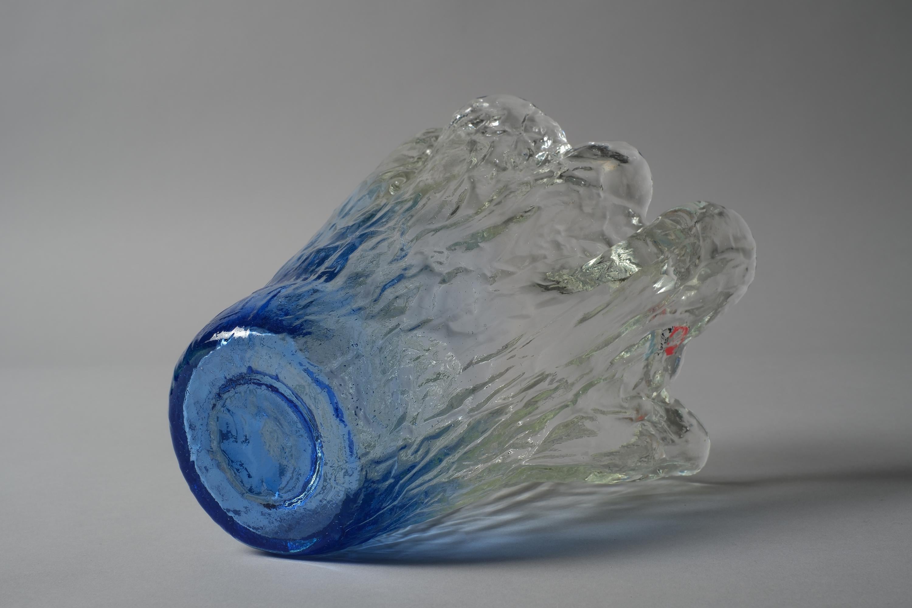 Vintage 1970s Lasilandia 'Art Lasi' free-form art glass vase, Finland. Handmade vase built from bark-textured, heavy glass in an organic form that graduates from deep blue at the base to lighter blues towards the top and finally clear towards the mouth. The exterior is textured in a bark and glacier effect of irregular ridges and bumps.
