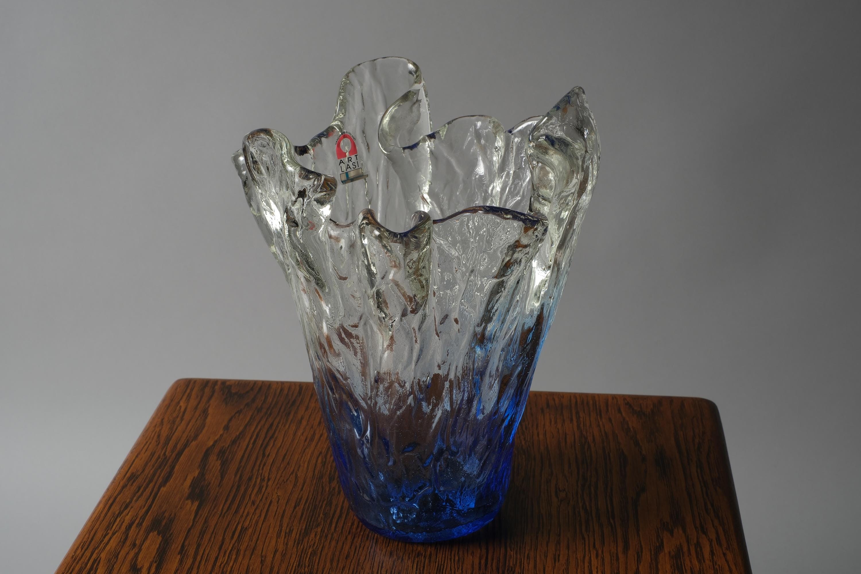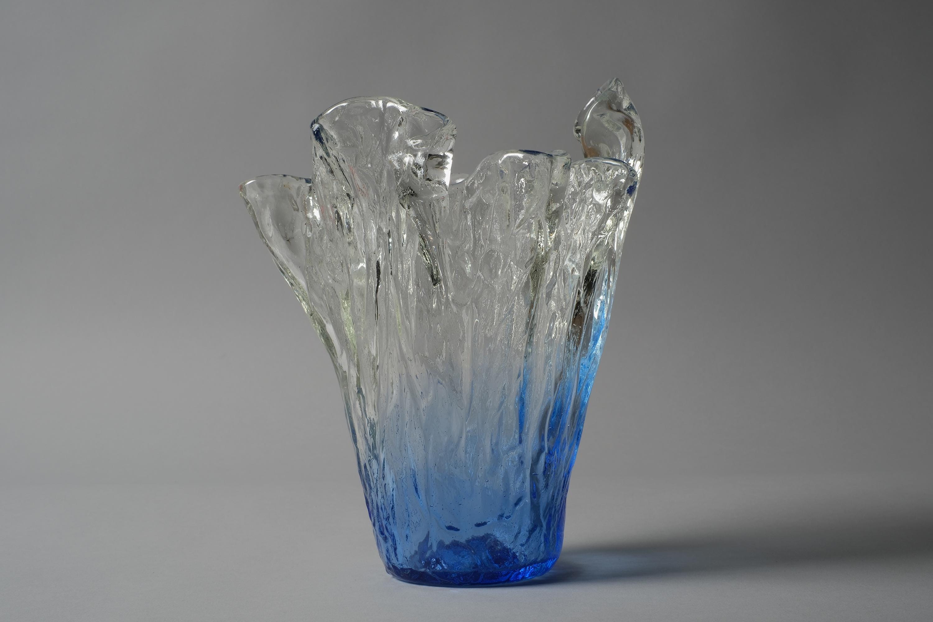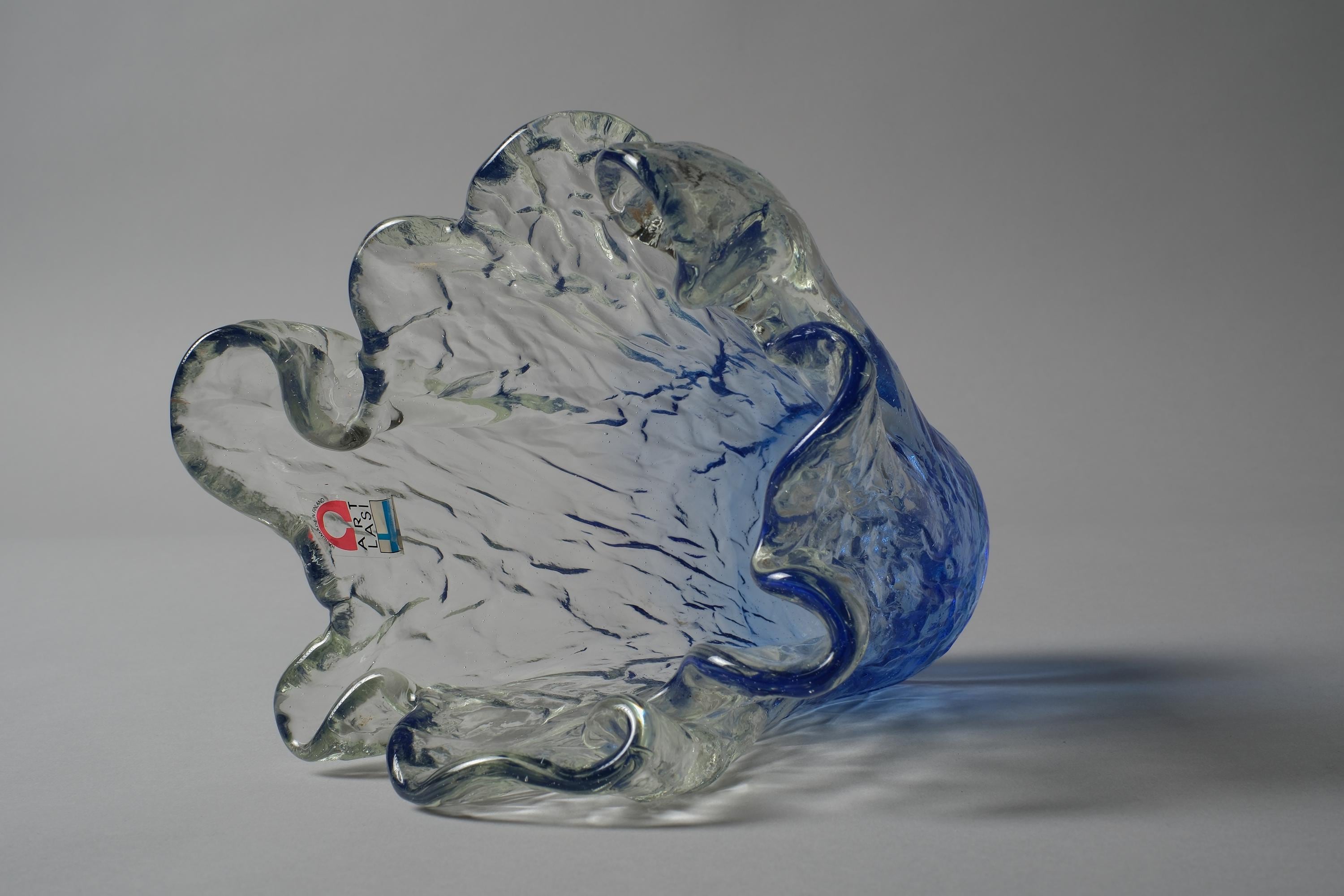 Vintage 1970s Lasilandia 'Art Lasi' free-form art glass vase, Finland. Handmade vase built from bark-textured, heavy glass in an organic form that graduates from deep blue at the base to lighter blues towards the top and finally clear towards the mouth. The exterior is textured in a bark and glacier effect of irregular ridges and bumps.