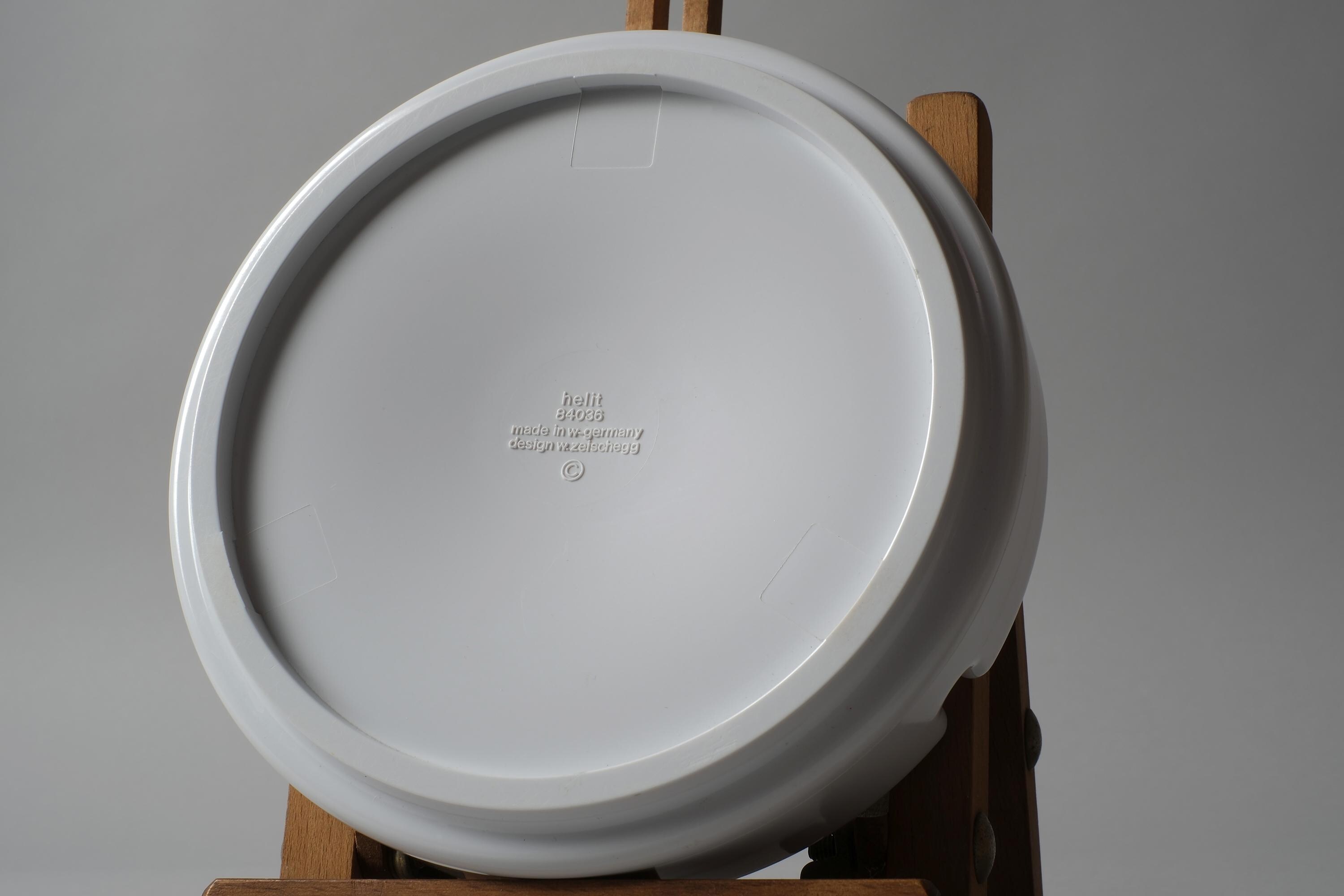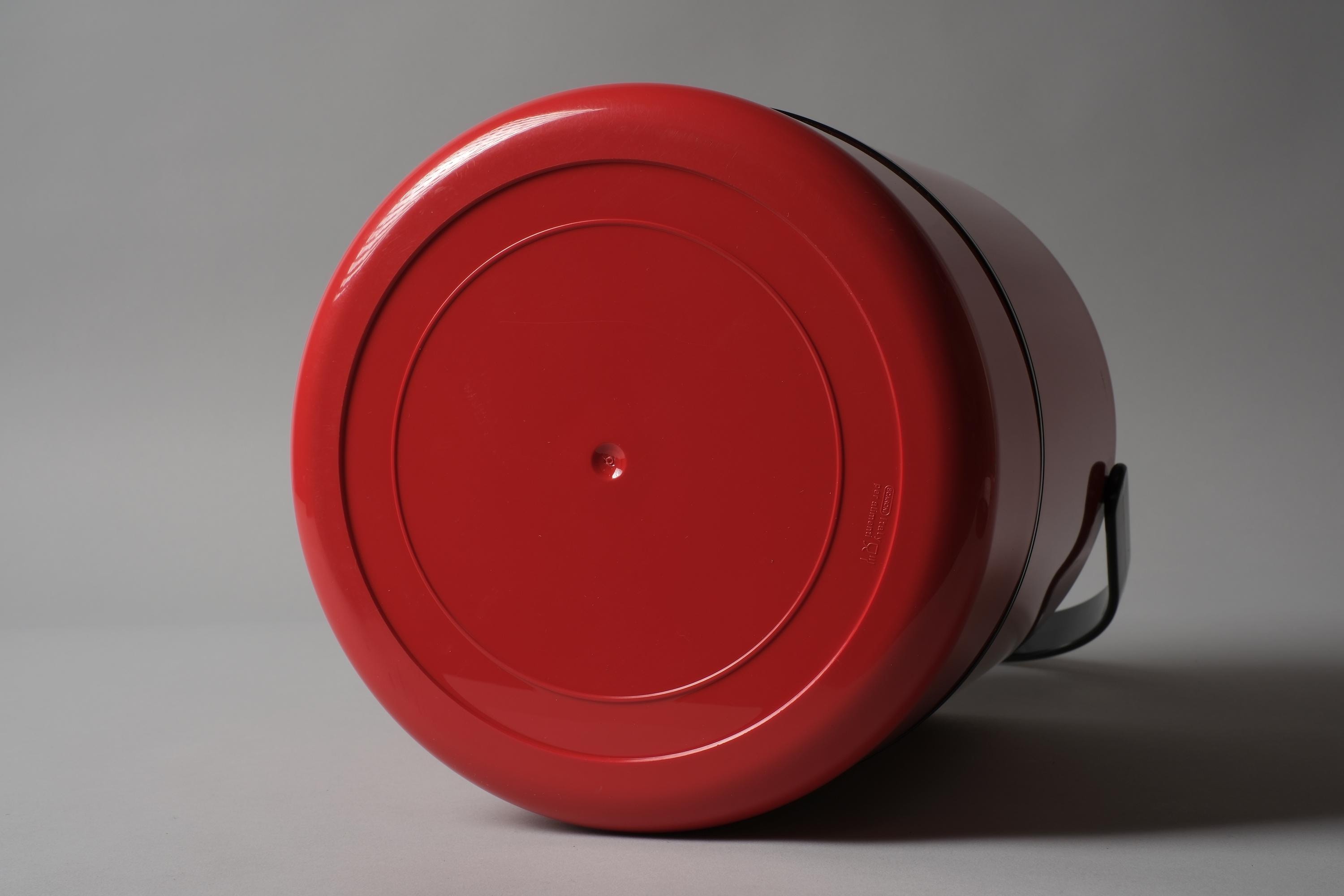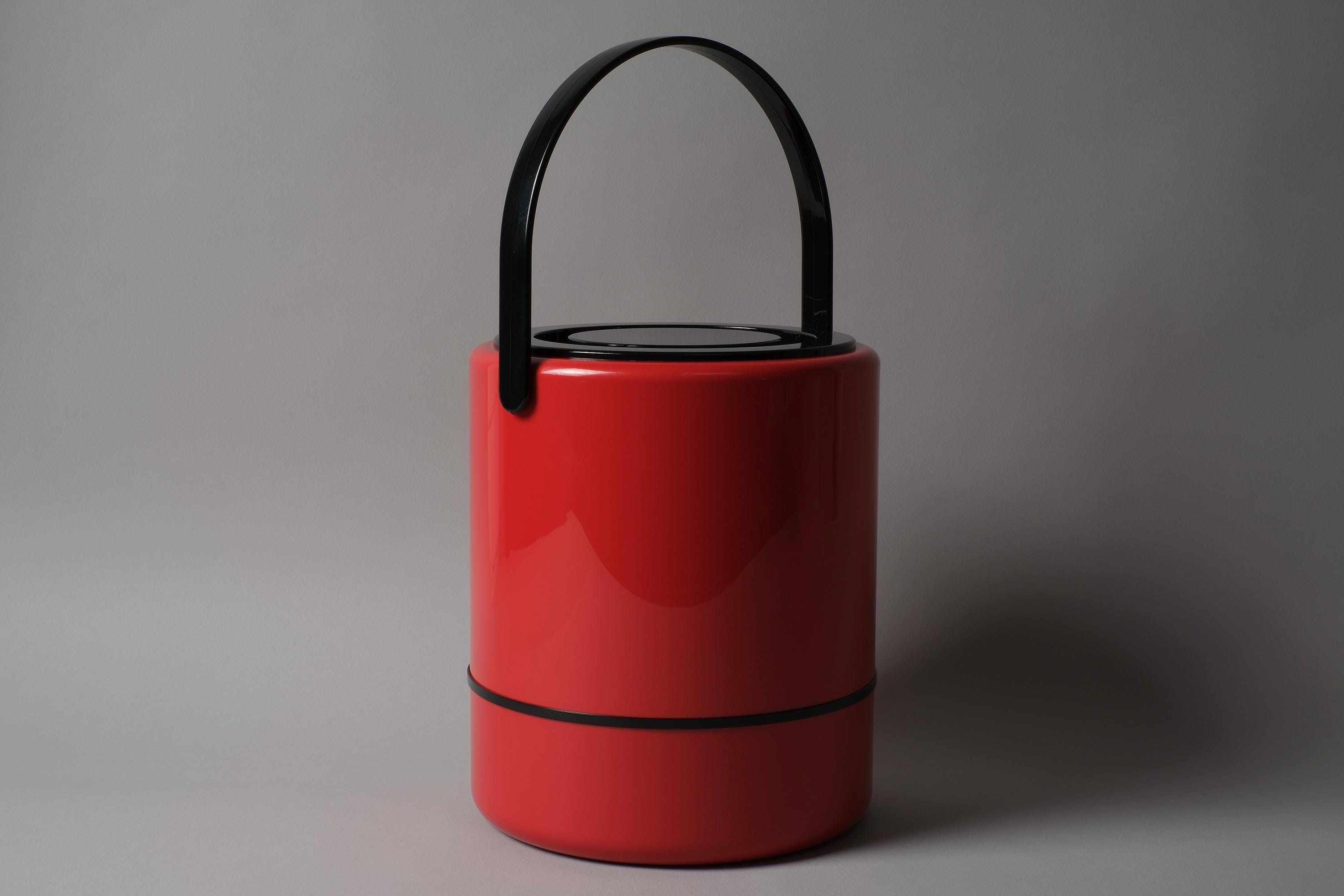 The three pieces share material and era logic. The Scaroni ice bucket arrives in its original wrapping, red body with black lid and wire bail handle, Ø20 x H24 cm. The Zeischegg ashtray is a characteristic piece from the designer's work for Helit, the white melamine disc with its clean circular form number 84036 stamped on the underside, Ø16 x H4 cm. The three anonymous bowls in green, yellow and red complement the set, each Ø11.5 x H6 cm, 400ml capacity.