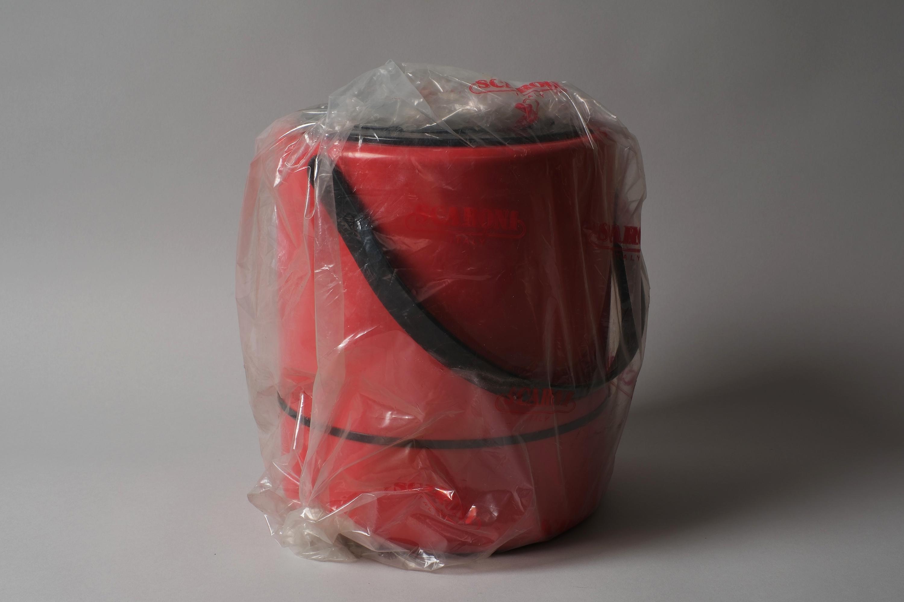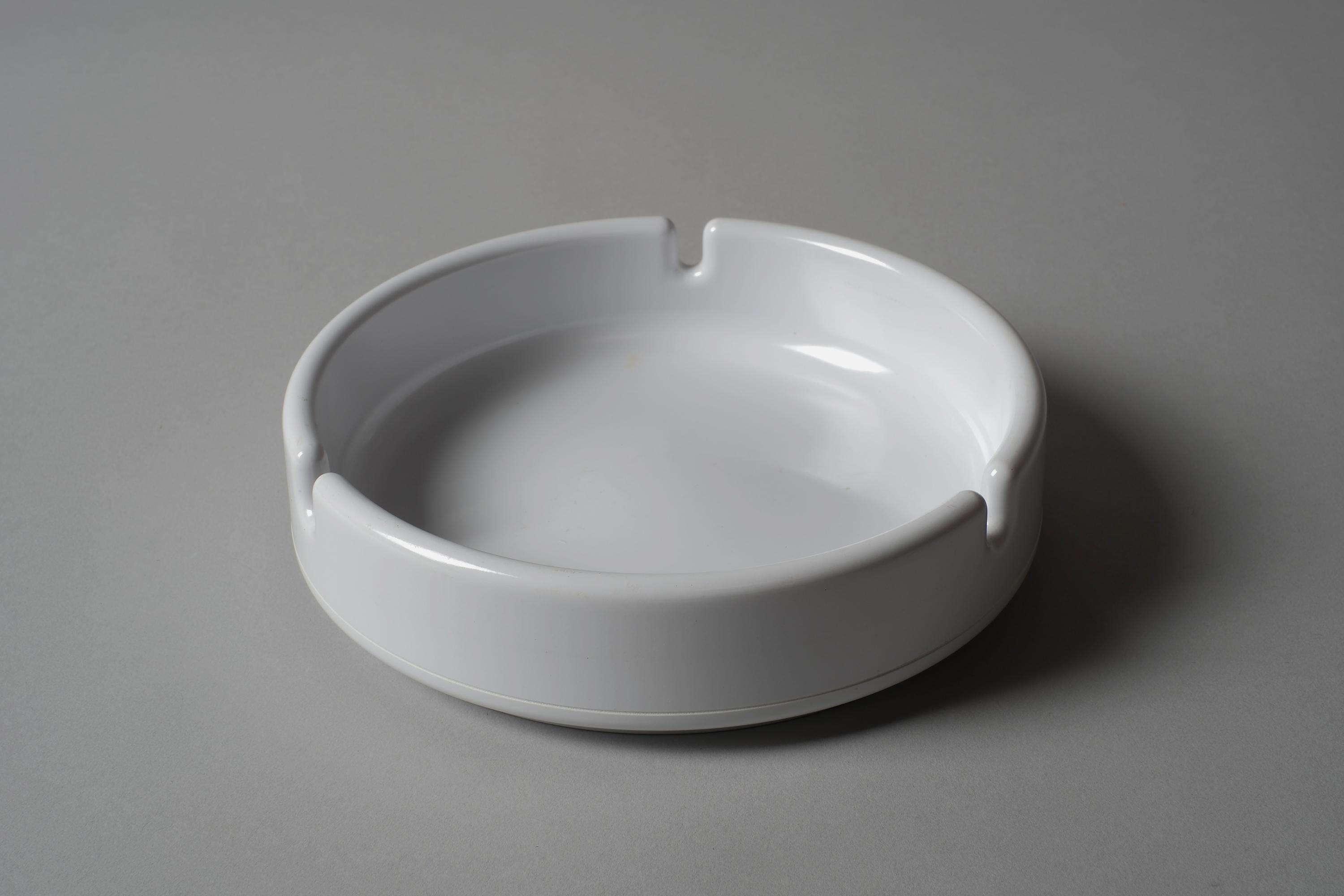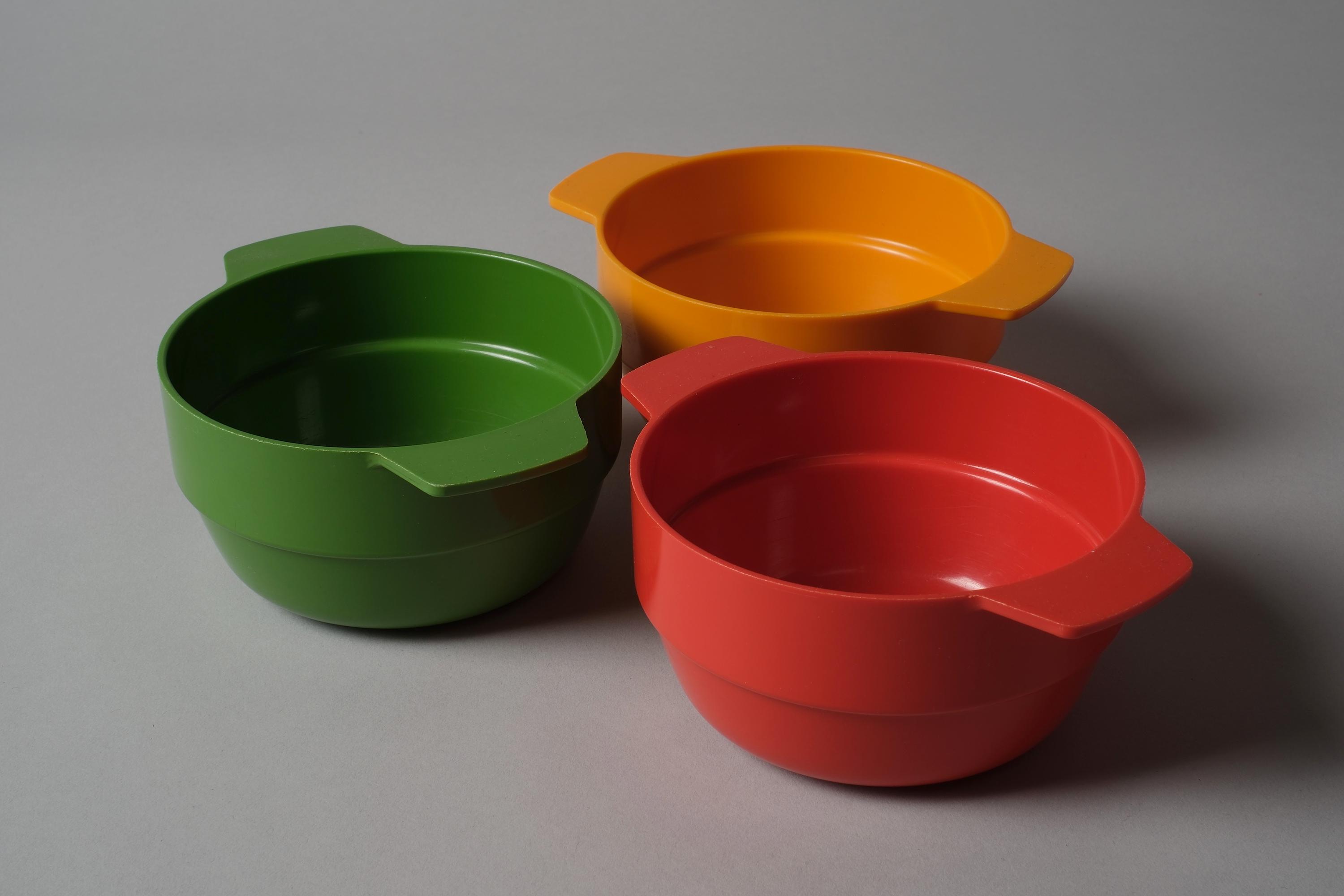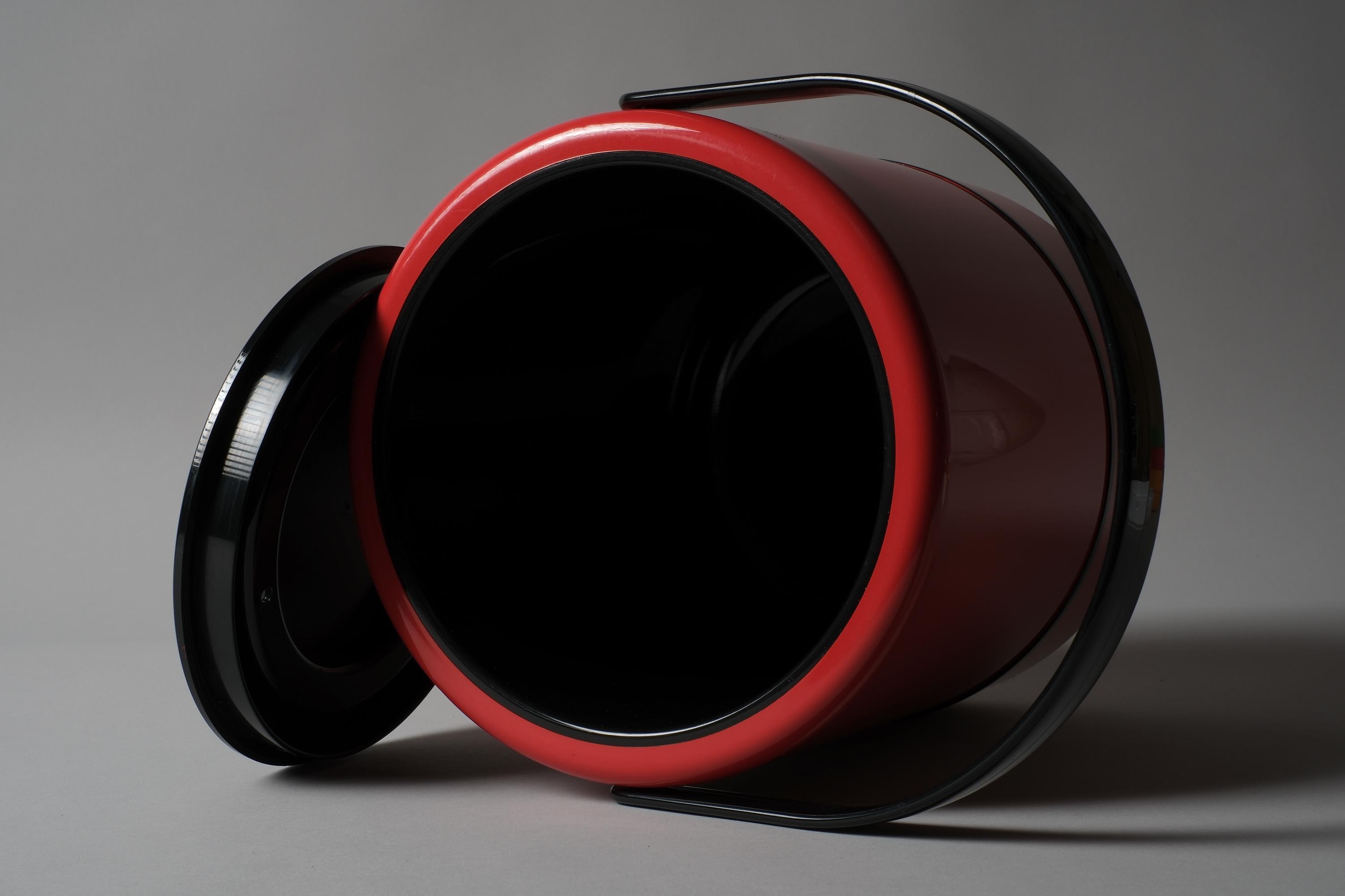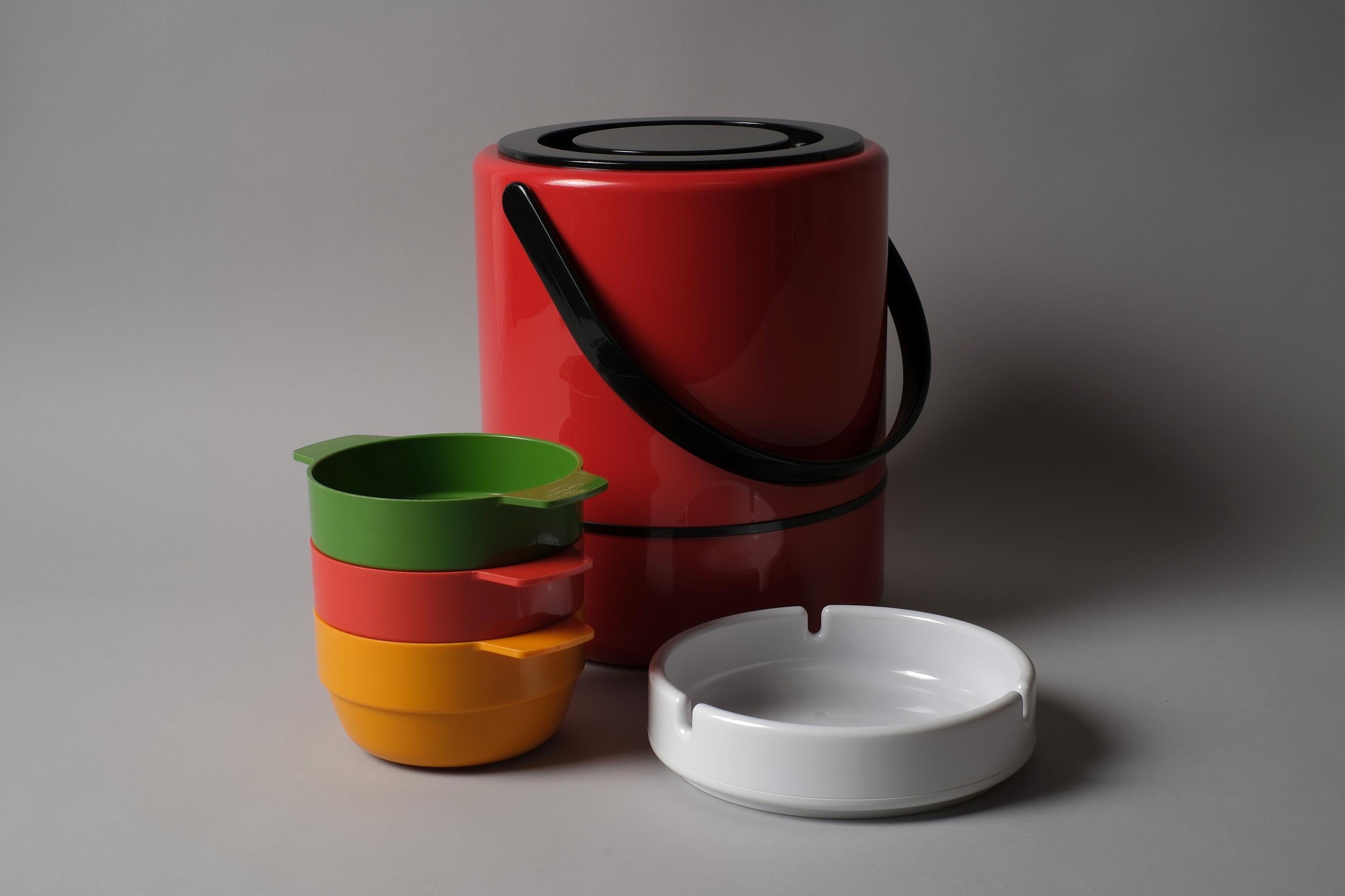 A bundle of three new old stock Space Age plastic objects from Italy and West Germany, 1970s-1980s, a Scaroni Casa Bar ice bucket in red and black ABS, a Walter Zeischegg Helit white melamine ashtray, and three anonymous colorful plastic bowls, all unused.
