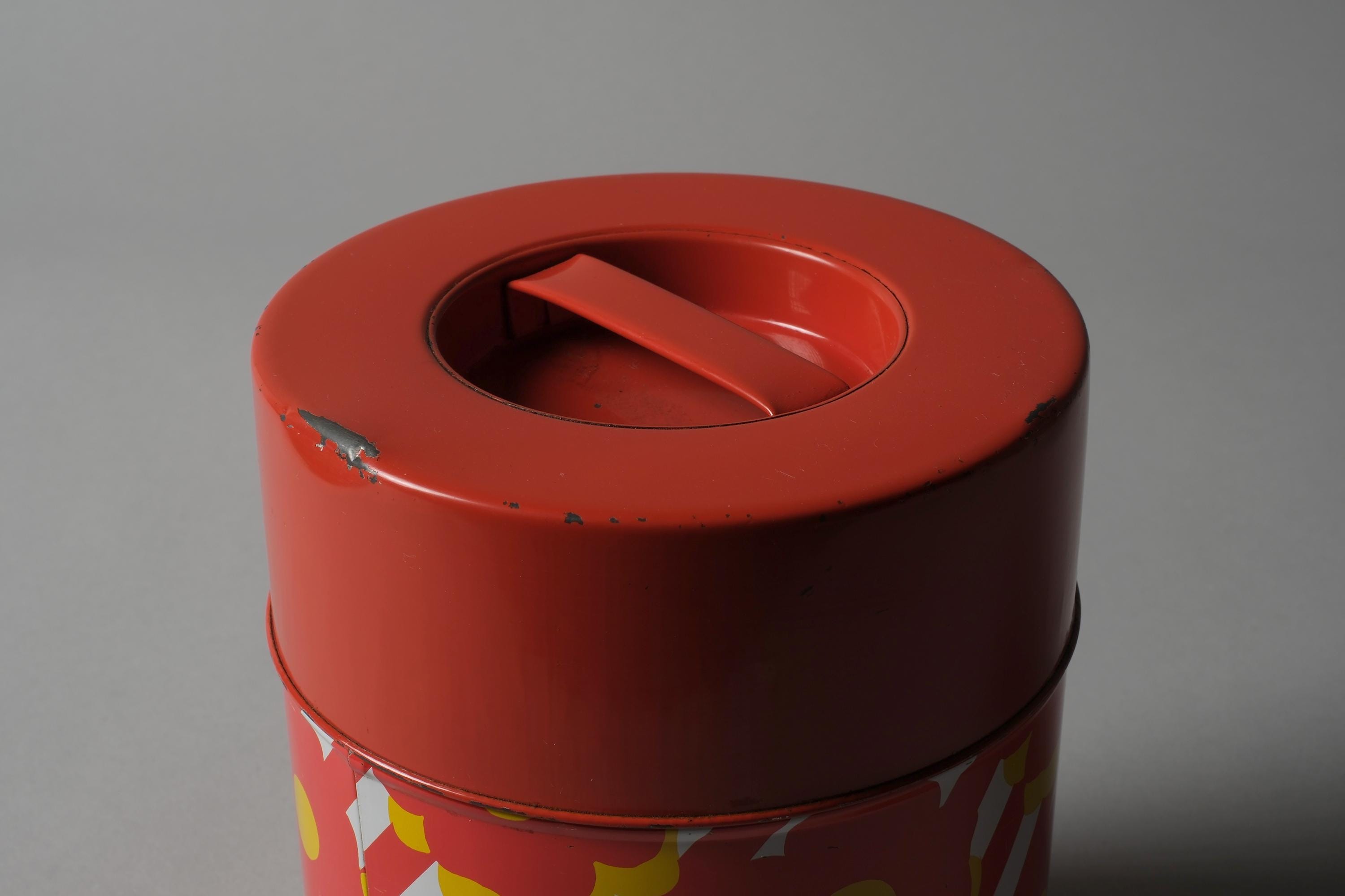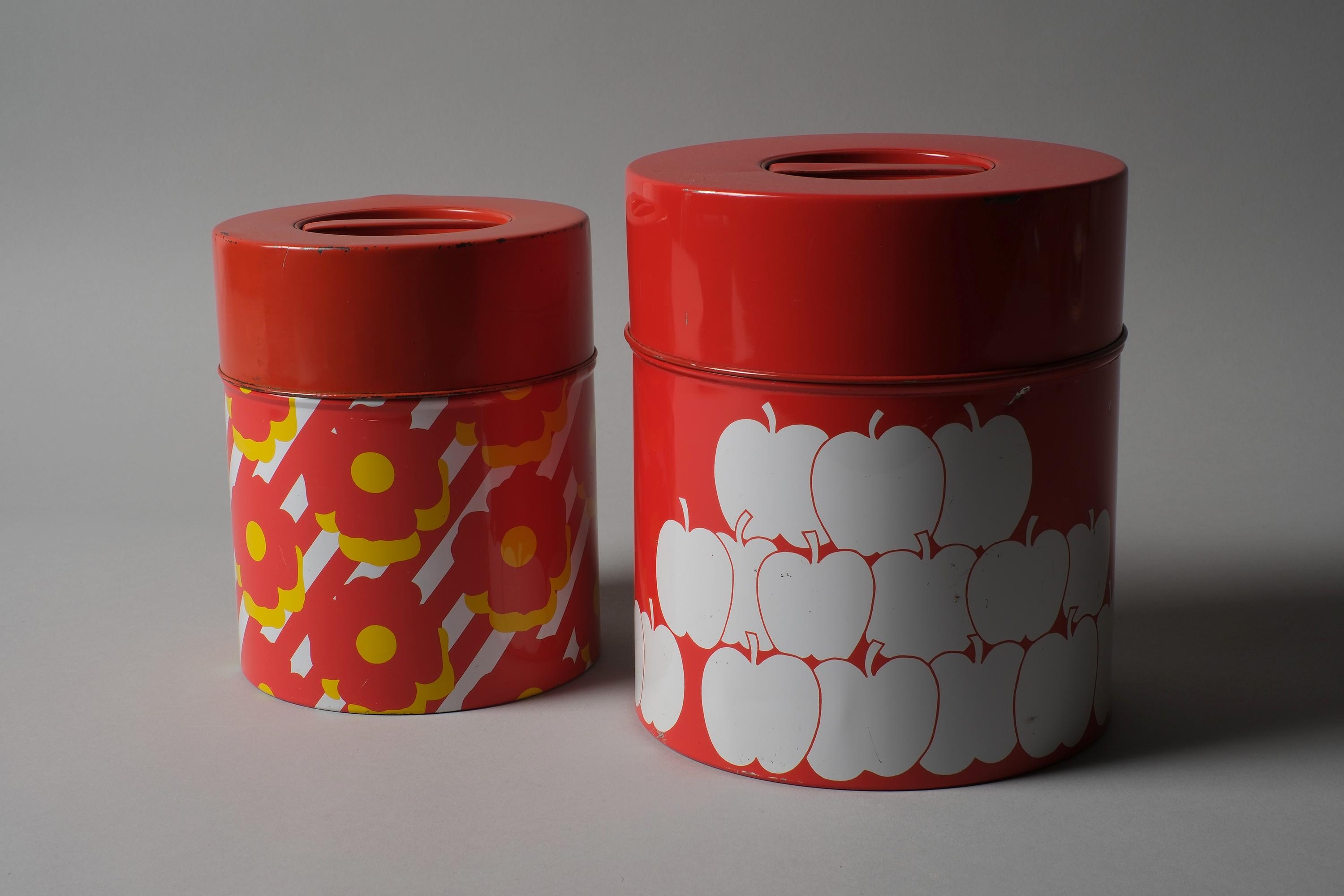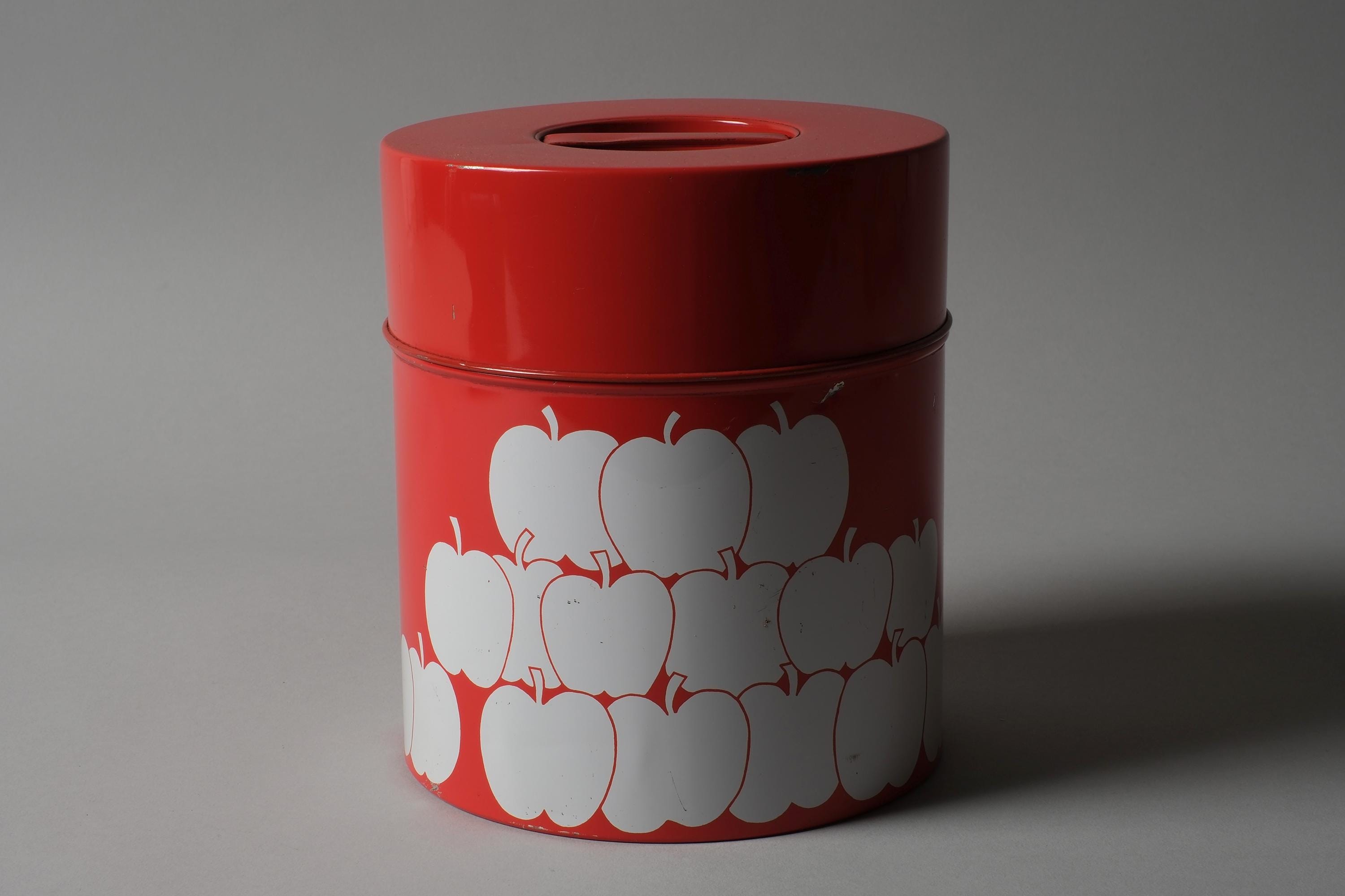 • Massilly tin (apple motif): red and white retro apple pattern, Ø16 x H18 cm, approx. 3600 cc / 122 oz, 1970s.