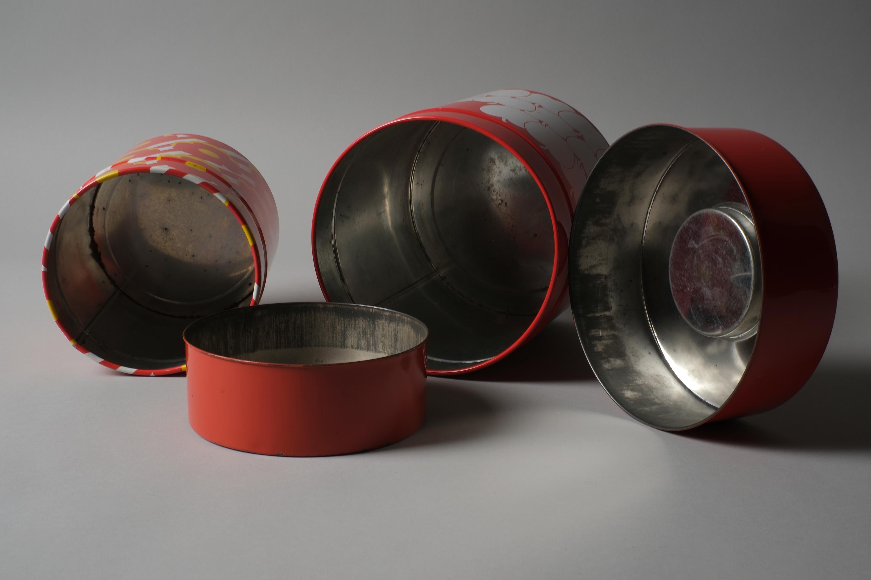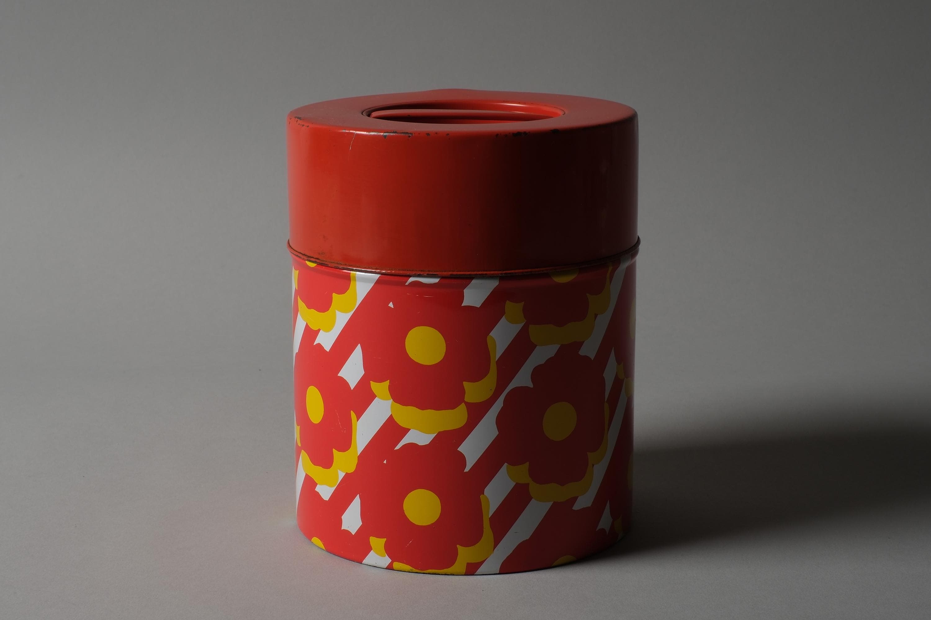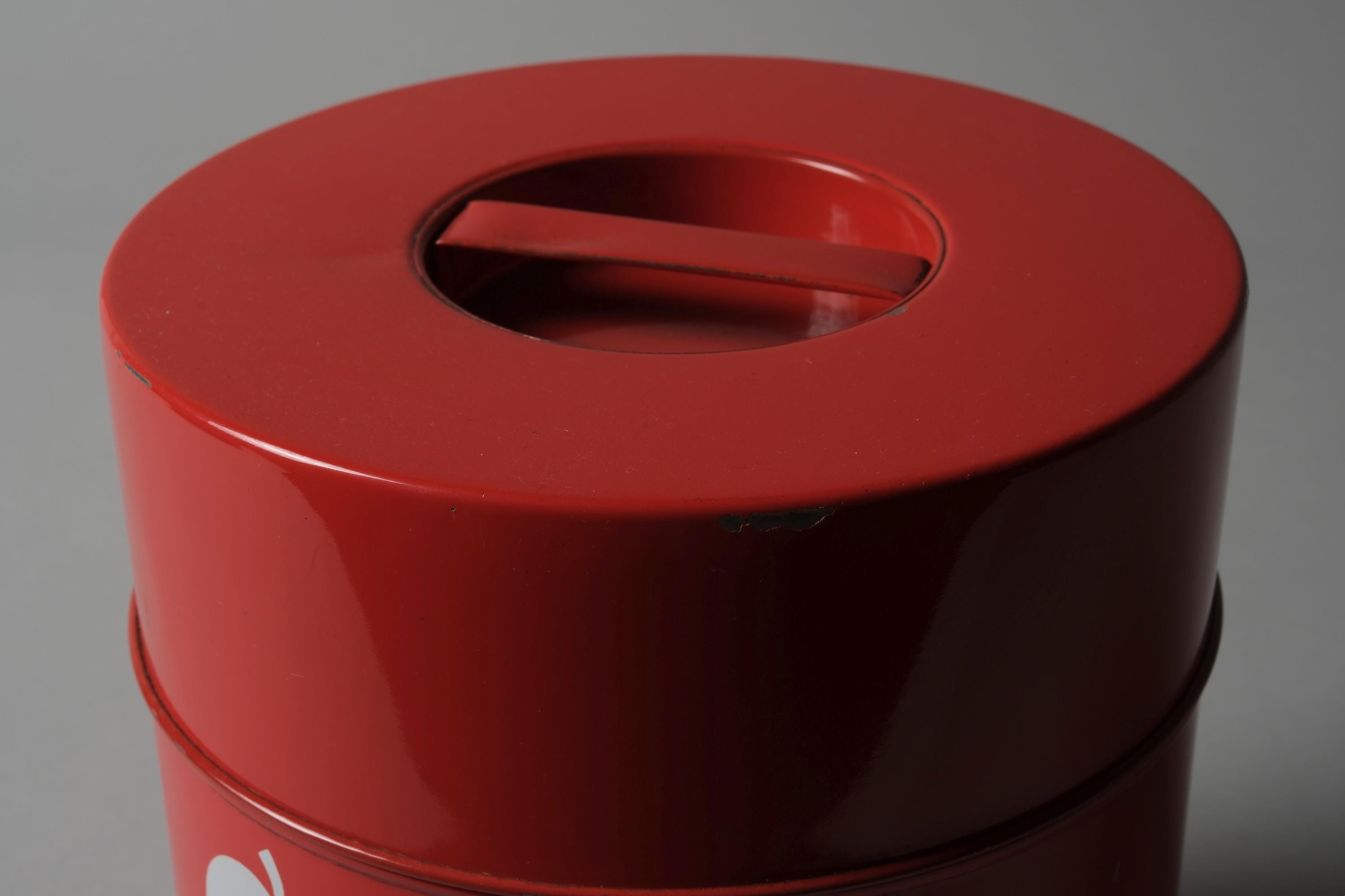 • Massilly tin (apple motif): red and white retro apple pattern, Ø16 x H18 cm, approx. 3600 cc / 122 oz, 1970s.