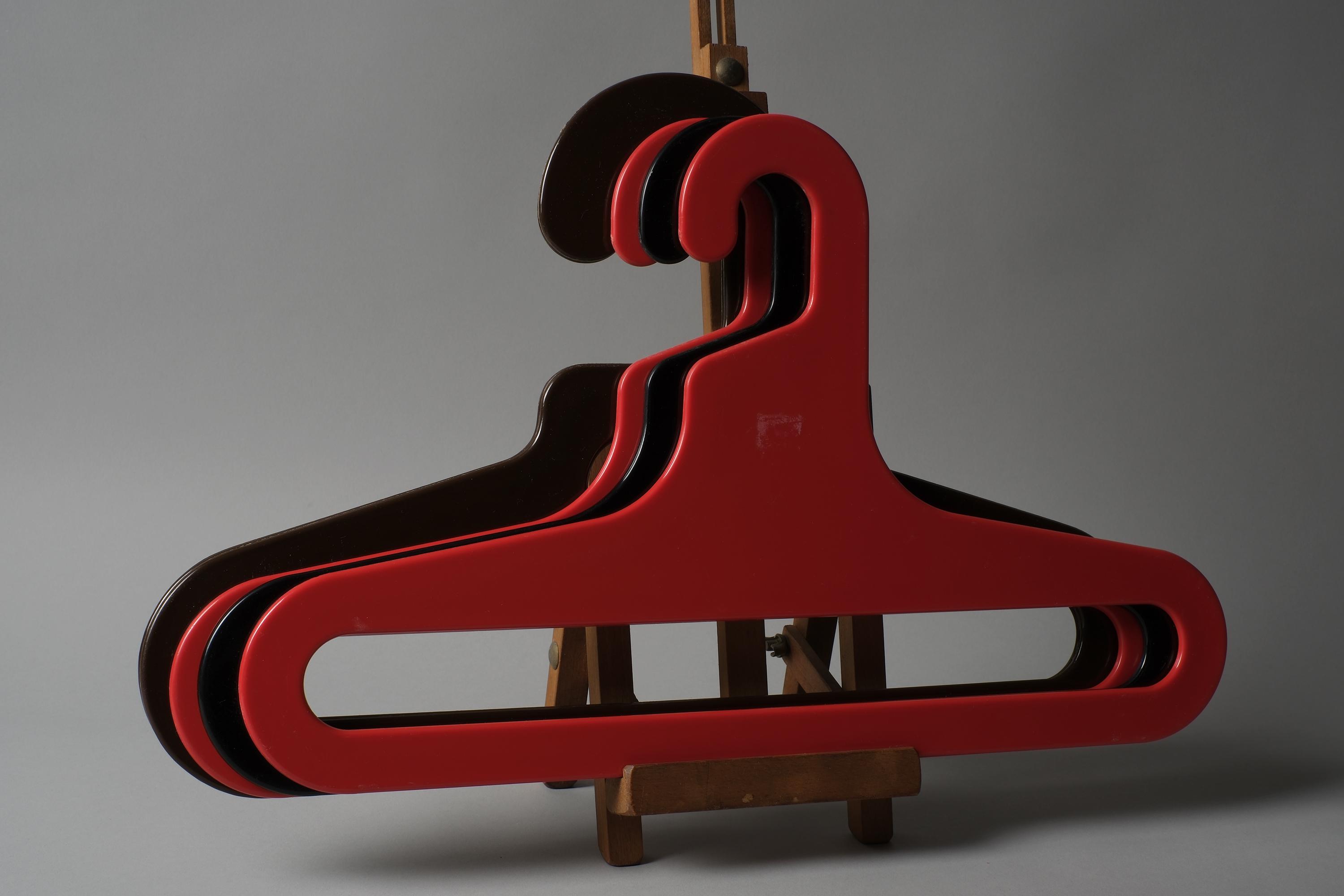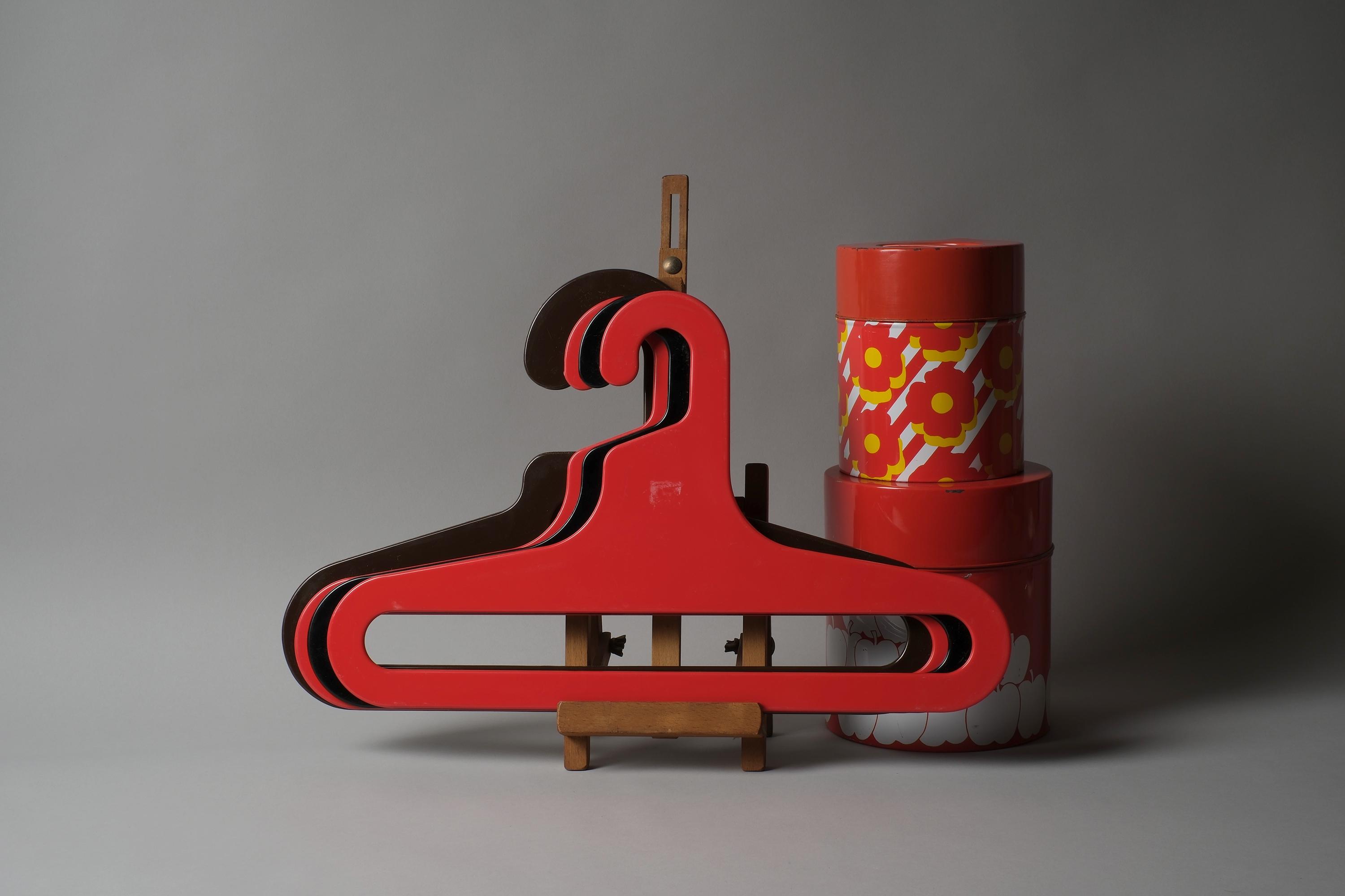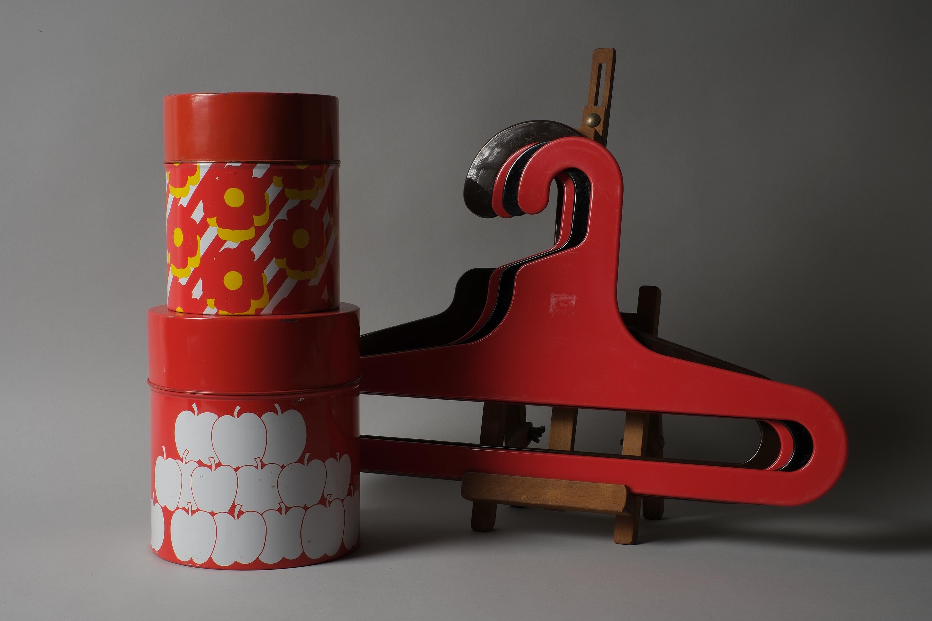 A curated bundle of 1970s Space Age domestic objects, the bundle consists of three Ingo Maurer Design M plastic coat hangers in black and red, two Massilly France vintage tin containers and a pair of Flair Holland plastic hangers in brown.