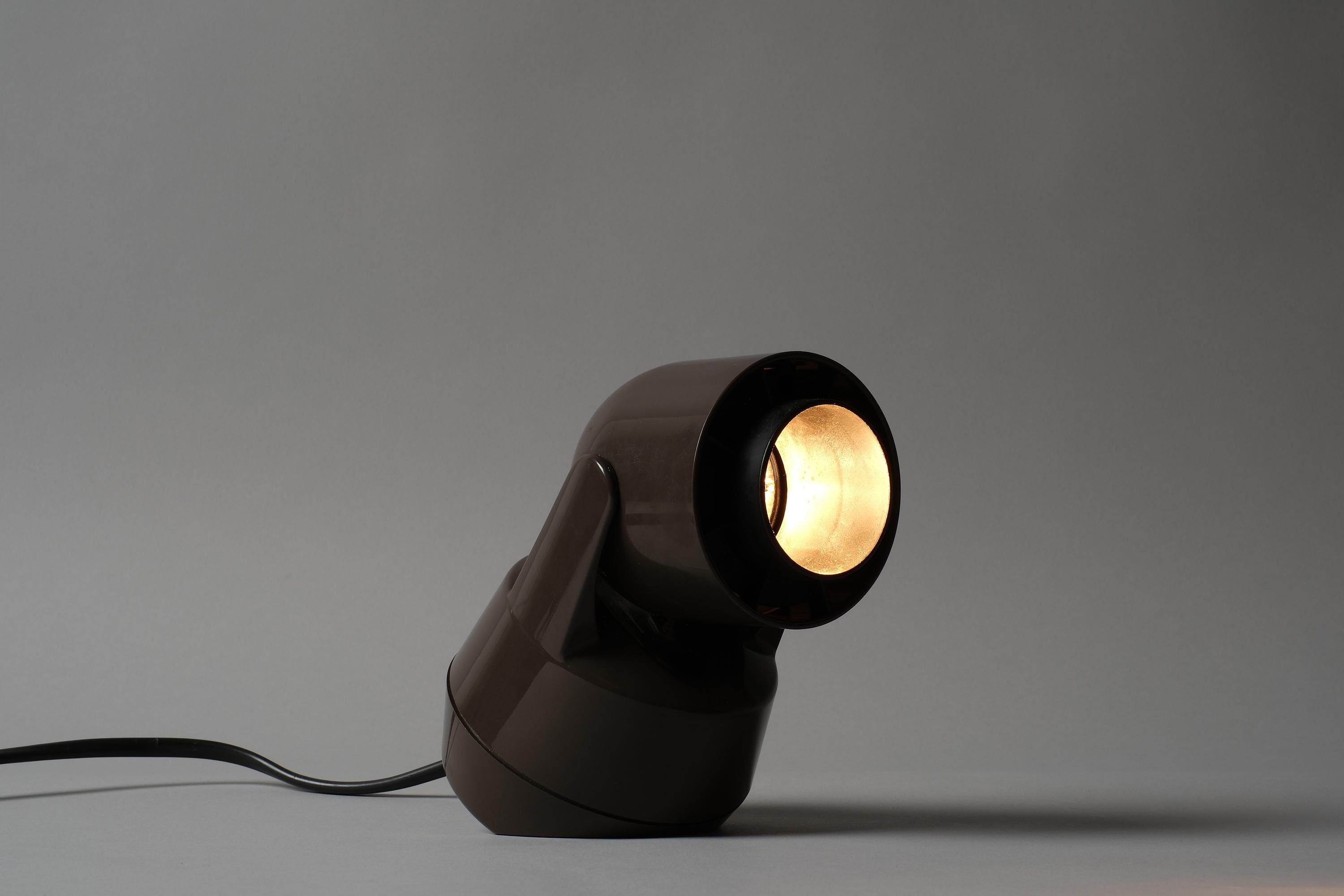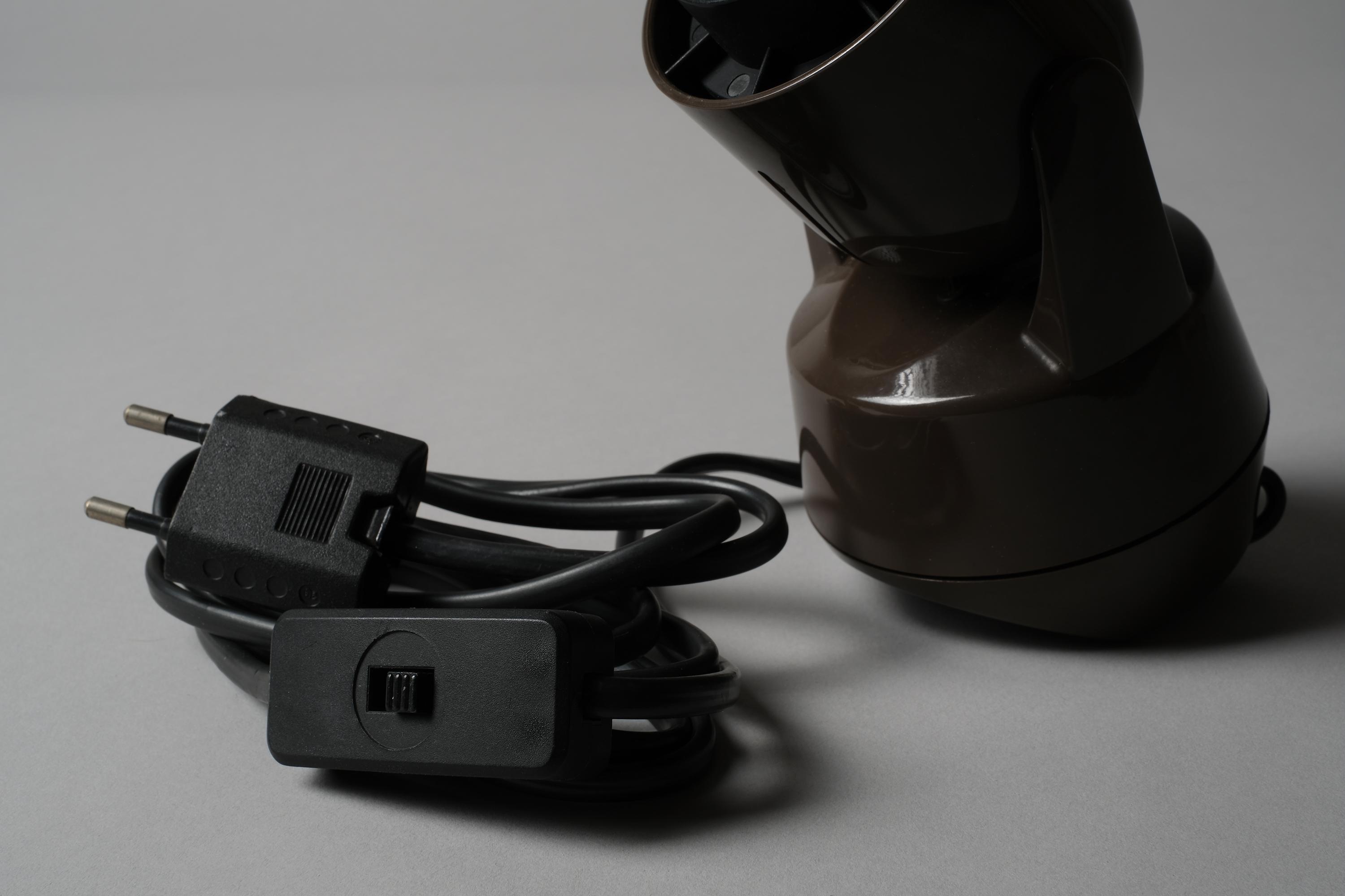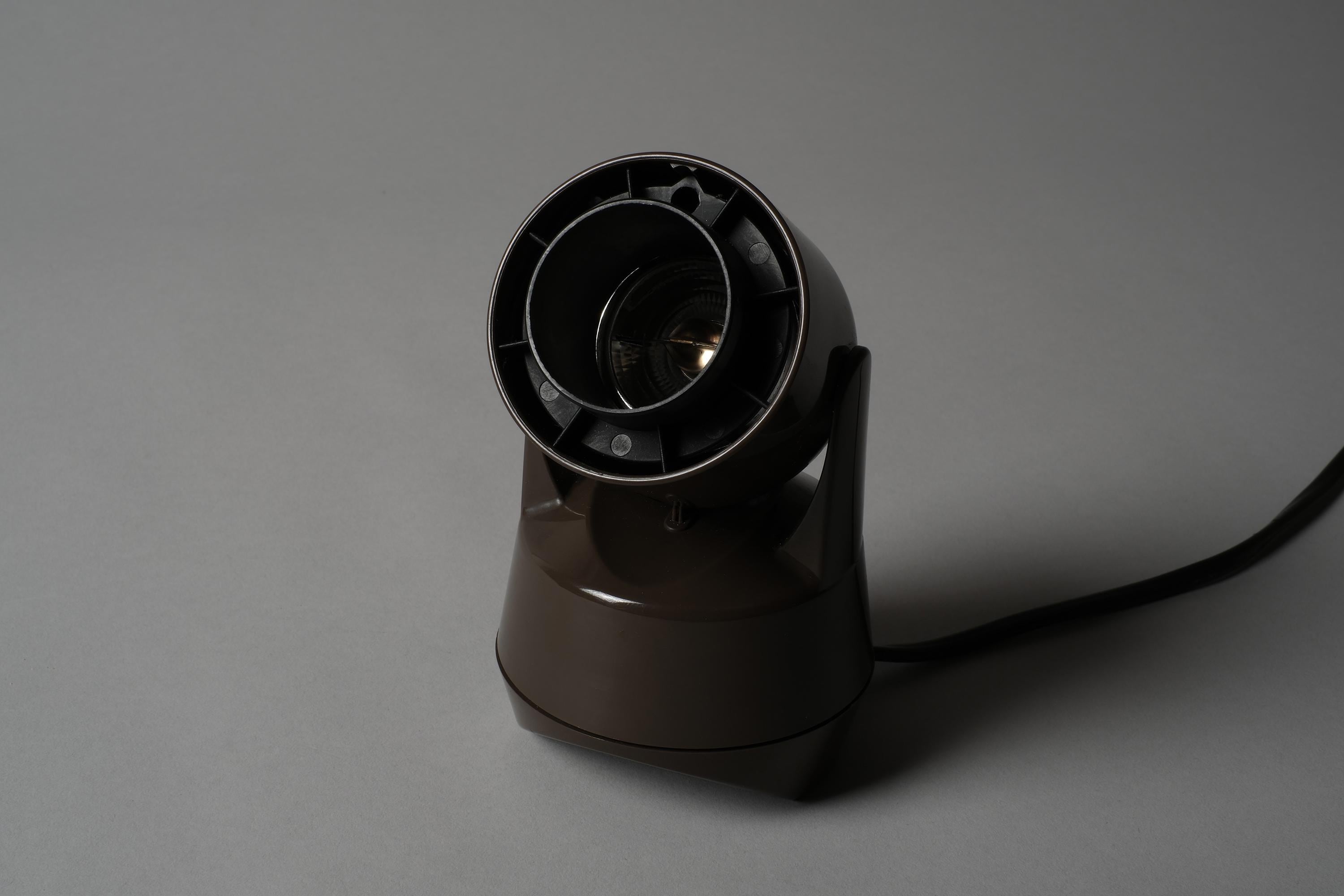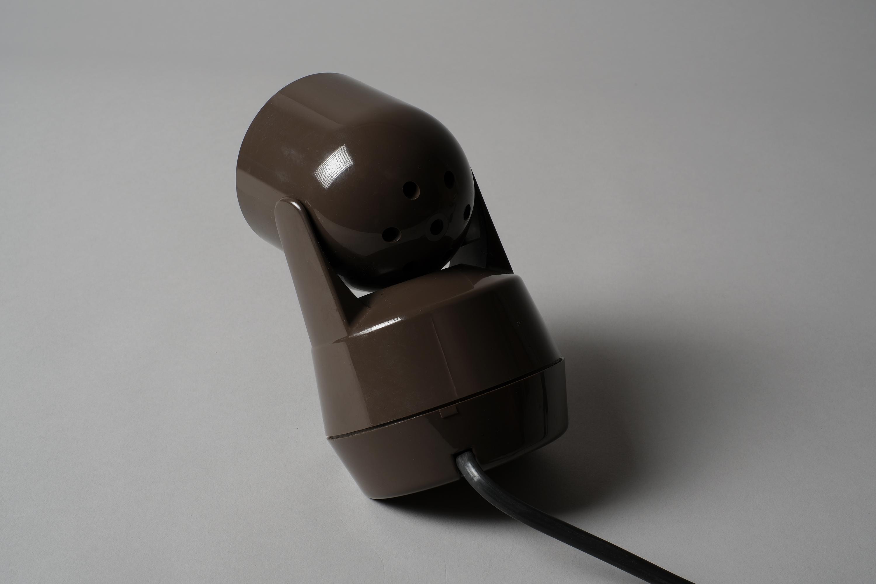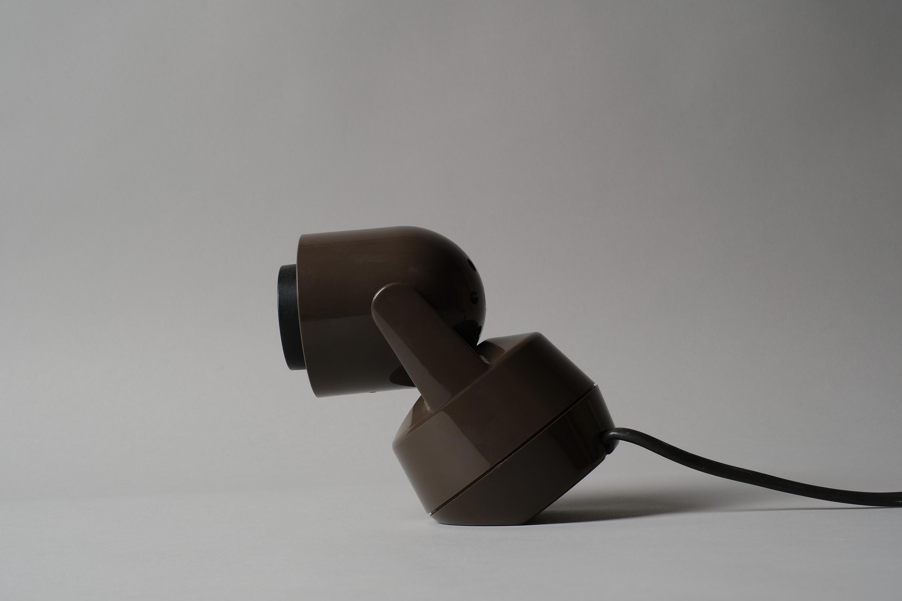 Vintage Eichhoff Werke Type E3374 directional halogen spot light in chocolate brown plastic, West Germany, 1980s. The articulated head tilts up-and-down on the weighted circular base, the snout-shaped reflector housing directs a tight beam of halogen light at any angle.