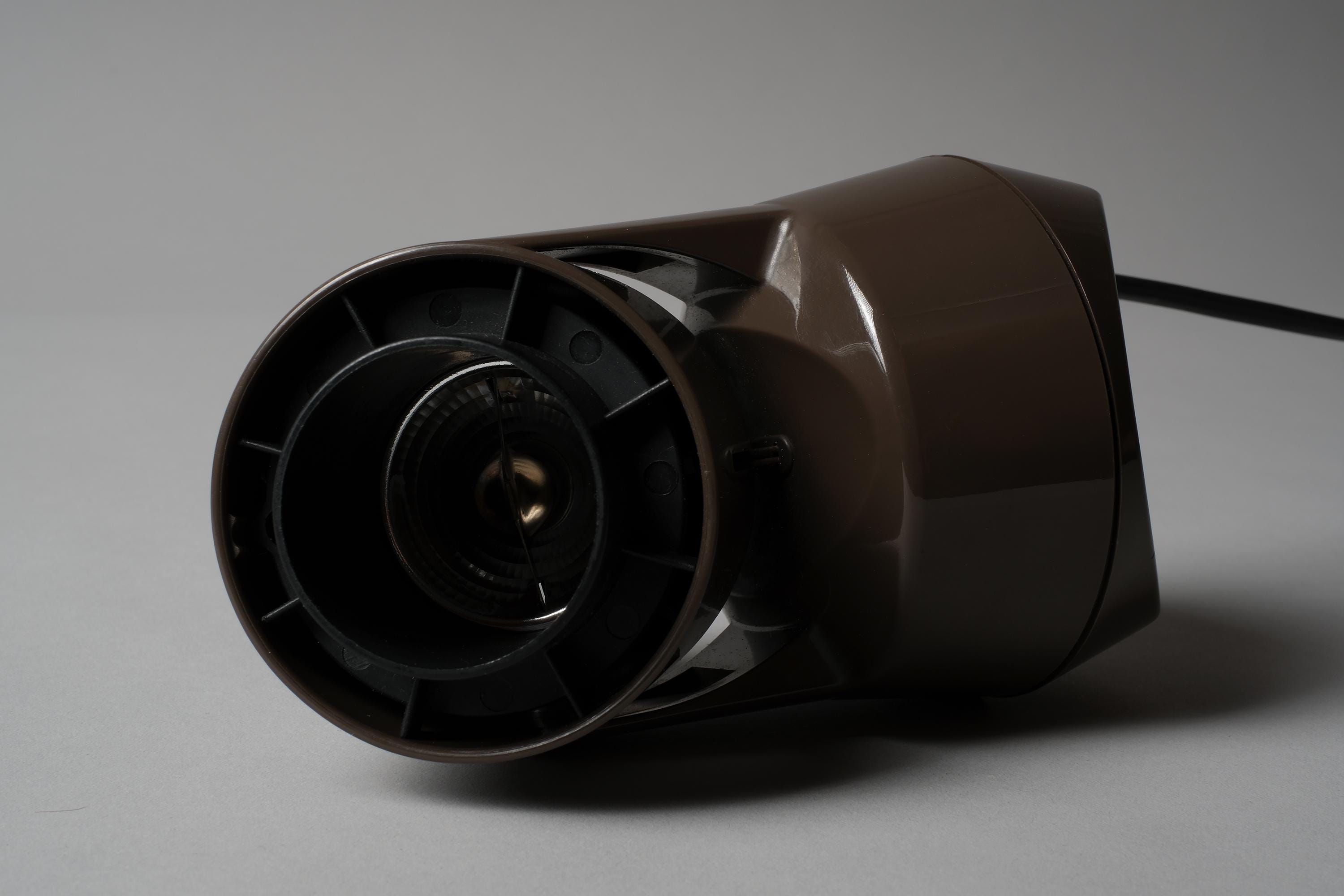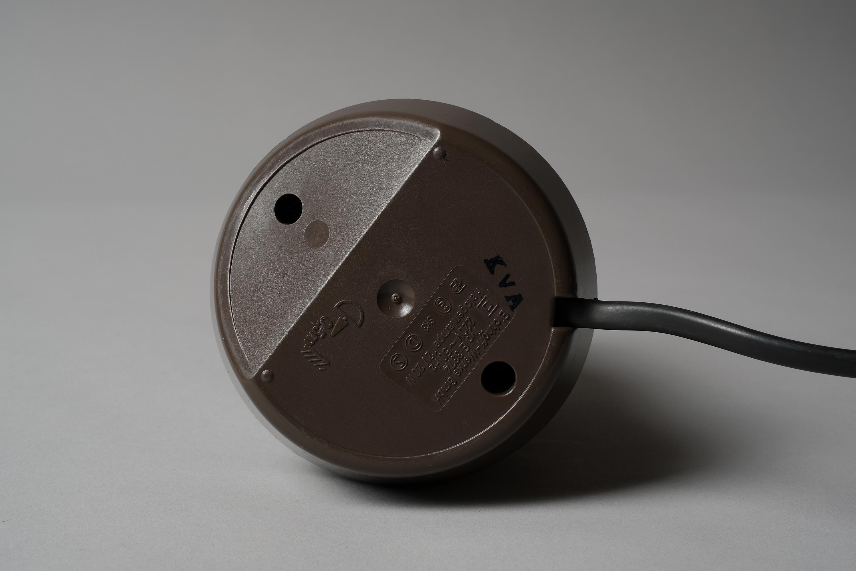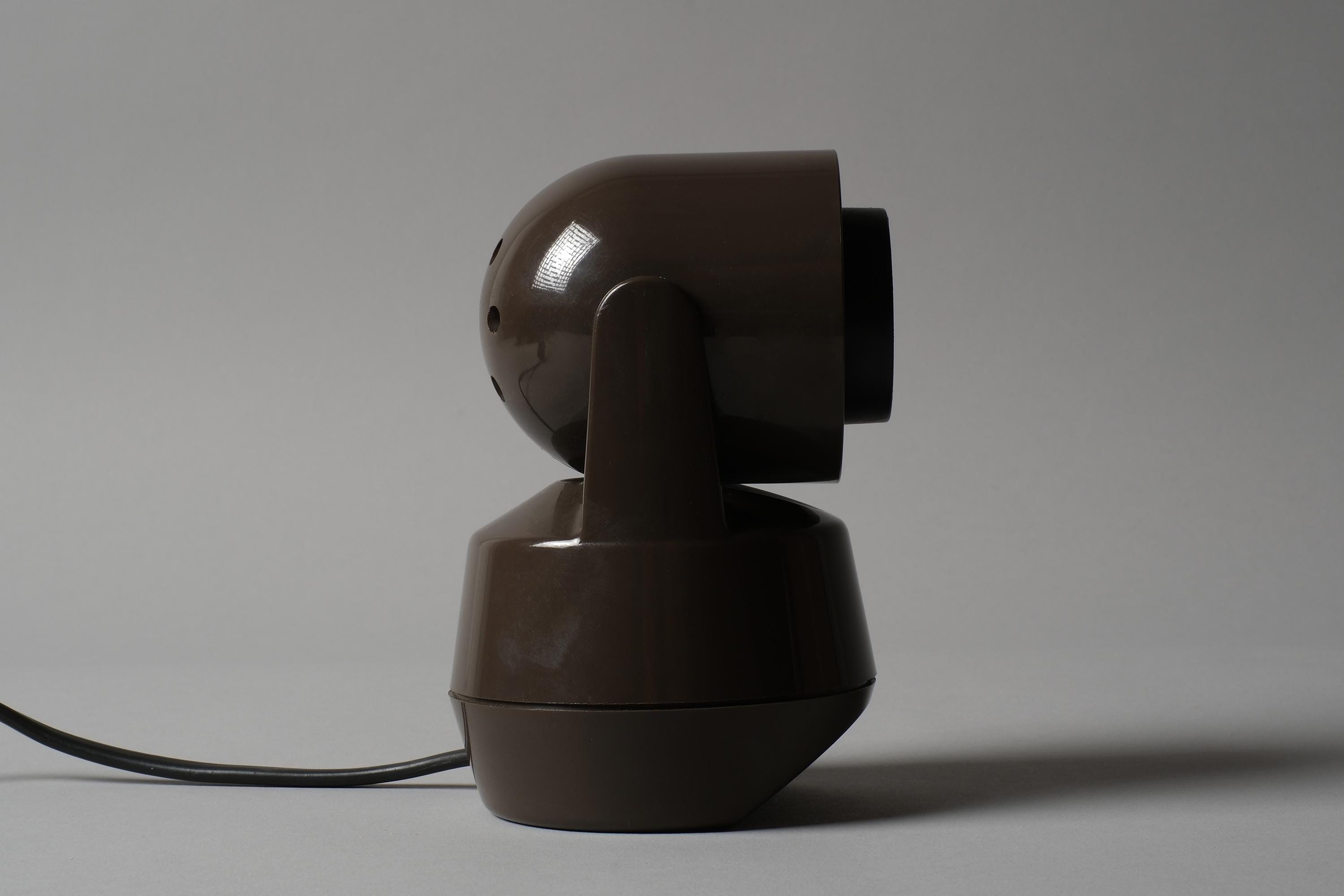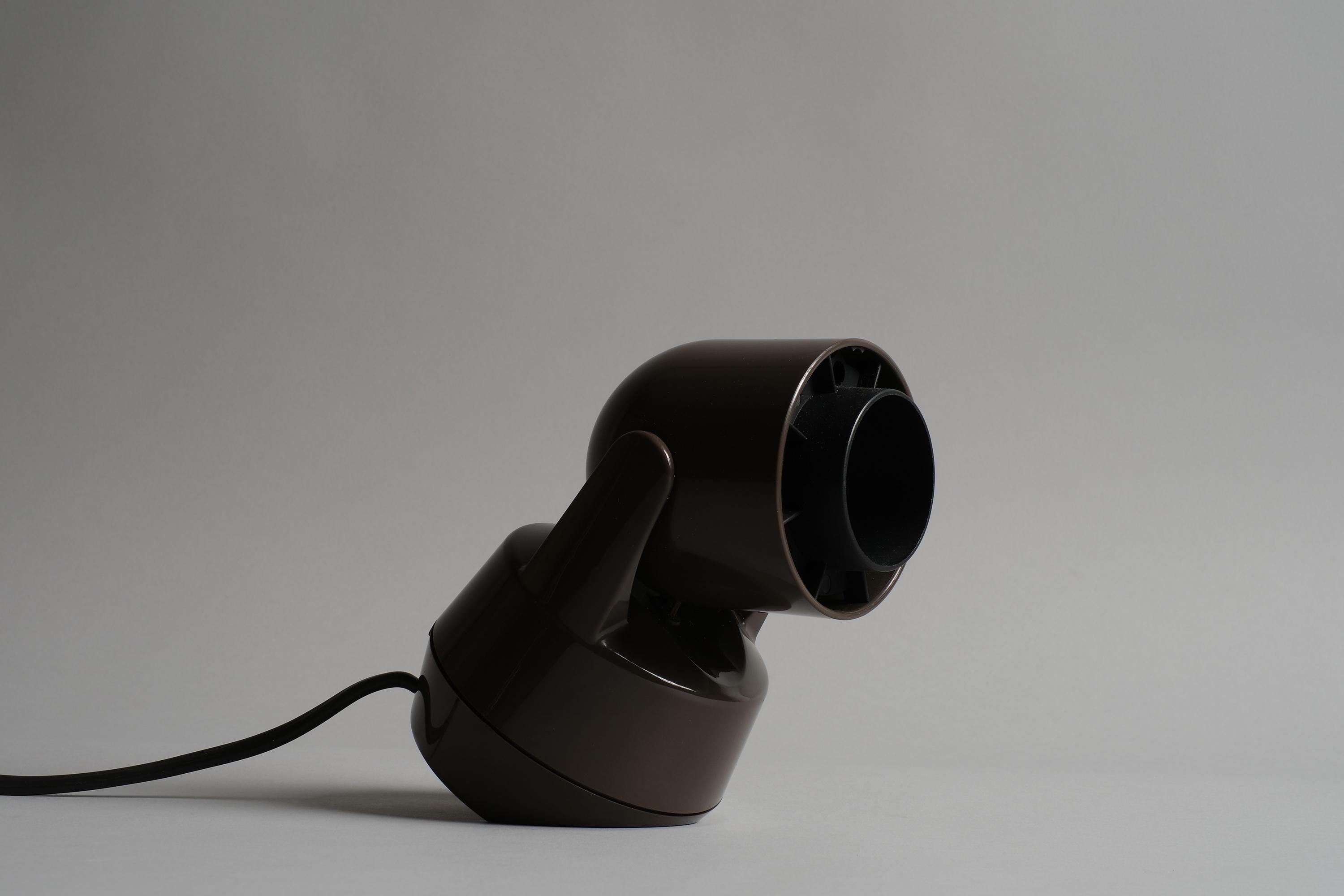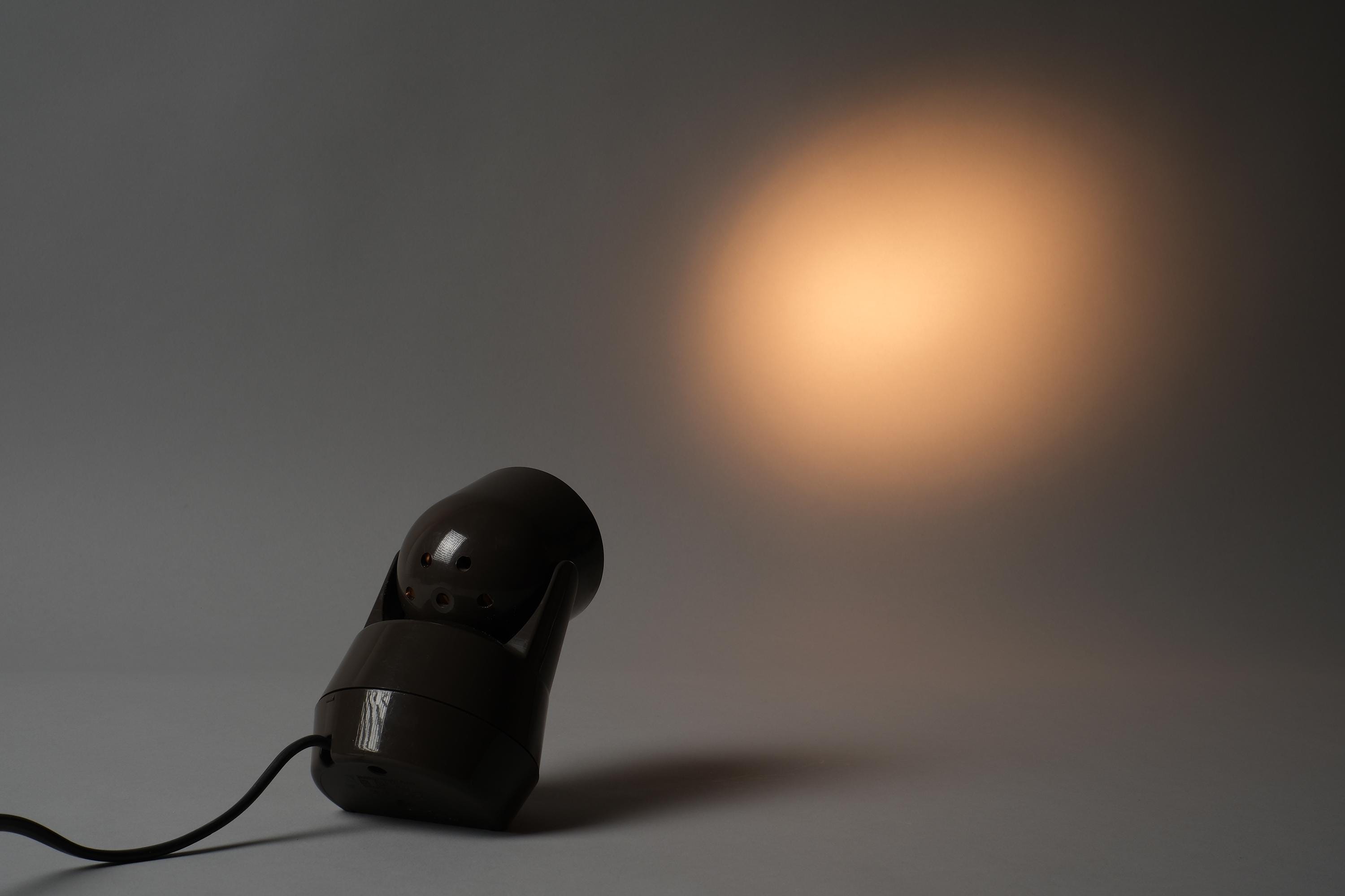 Vintage Eichhoff Werke Type E3374 directional halogen spot light in chocolate brown plastic, West Germany, 1980s. The articulated head tilts up-and-down on the weighted circular base, the snout-shaped reflector housing directs a tight beam of halogen light at any angle.