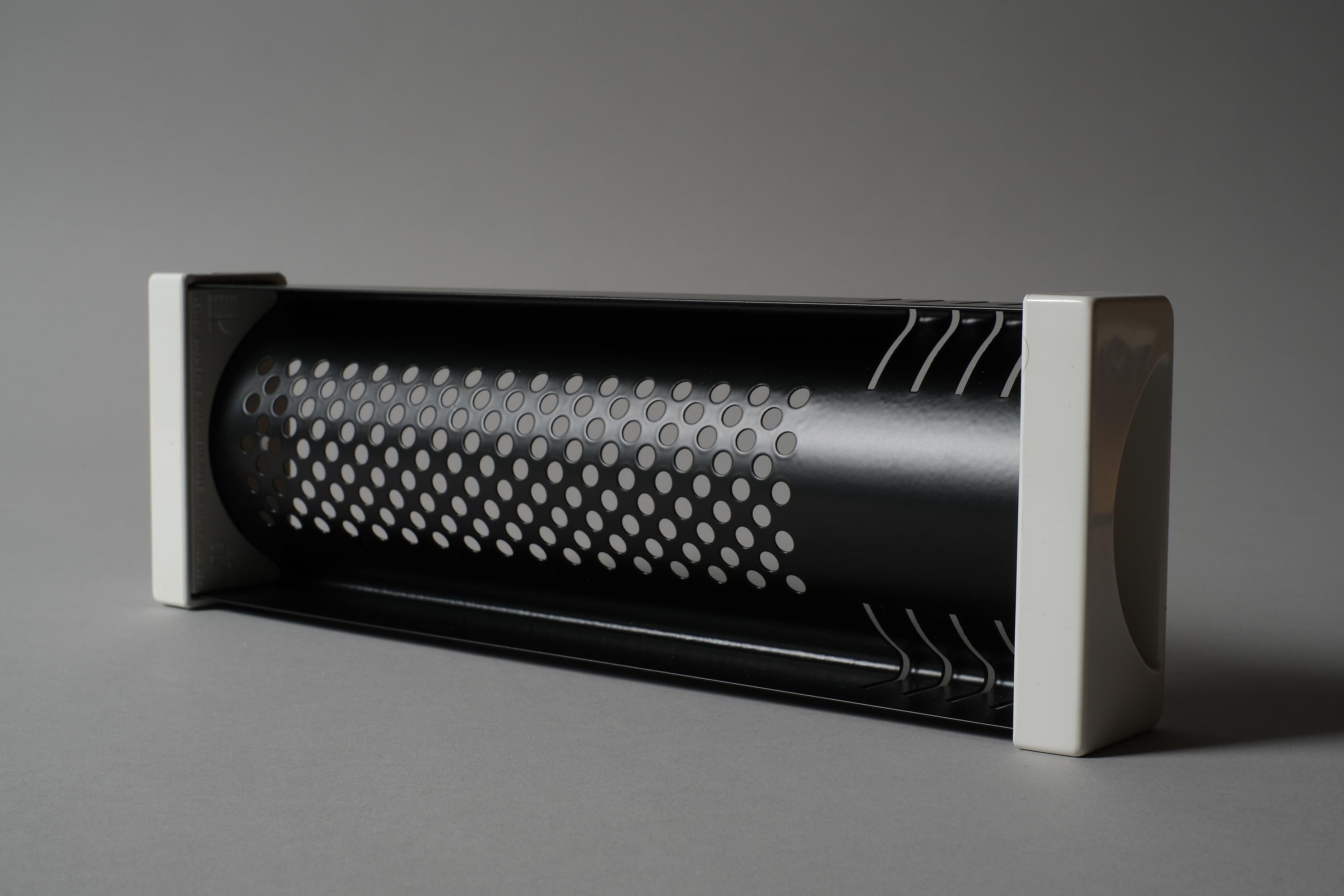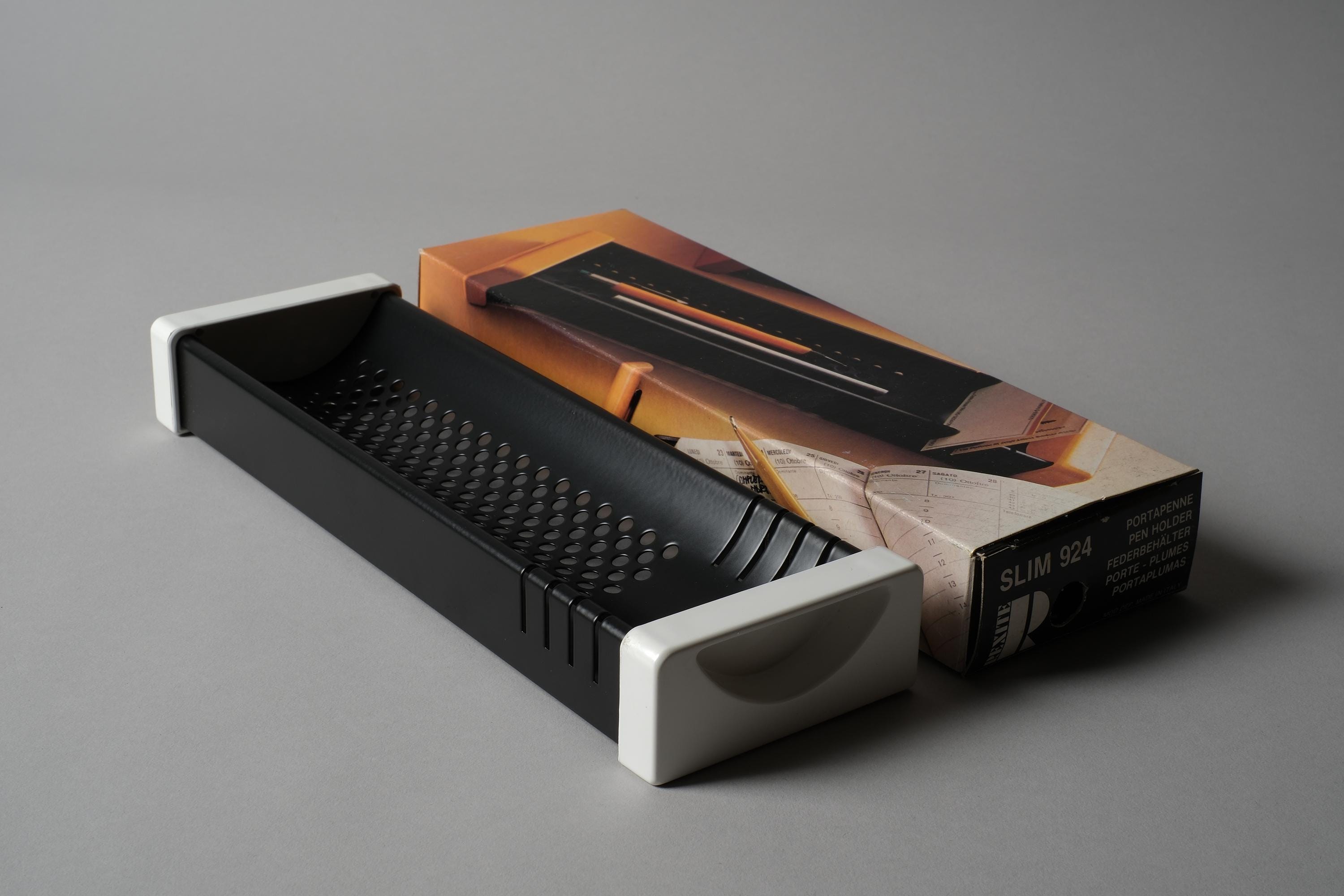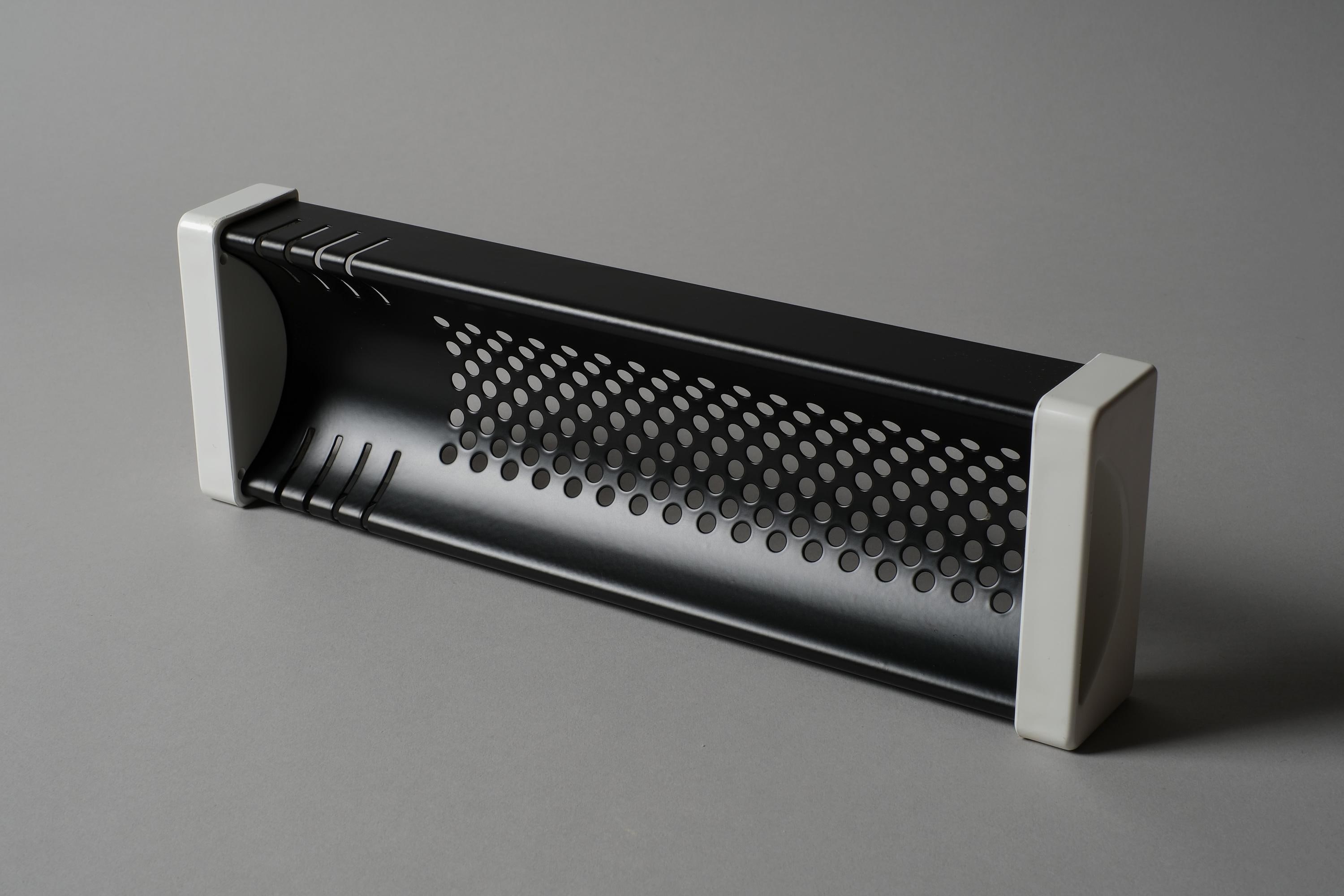 Vintage 1980s Rexite Slim pen holder by Raul Barbieri and Giorgio Marianelli, Italy. A long, low trough in perforated black metal set into a white plastic cradle, the combination of industrial perforation and clean plastic housing characteristic of Rexite design language. New in box, unused, in original packaging.
