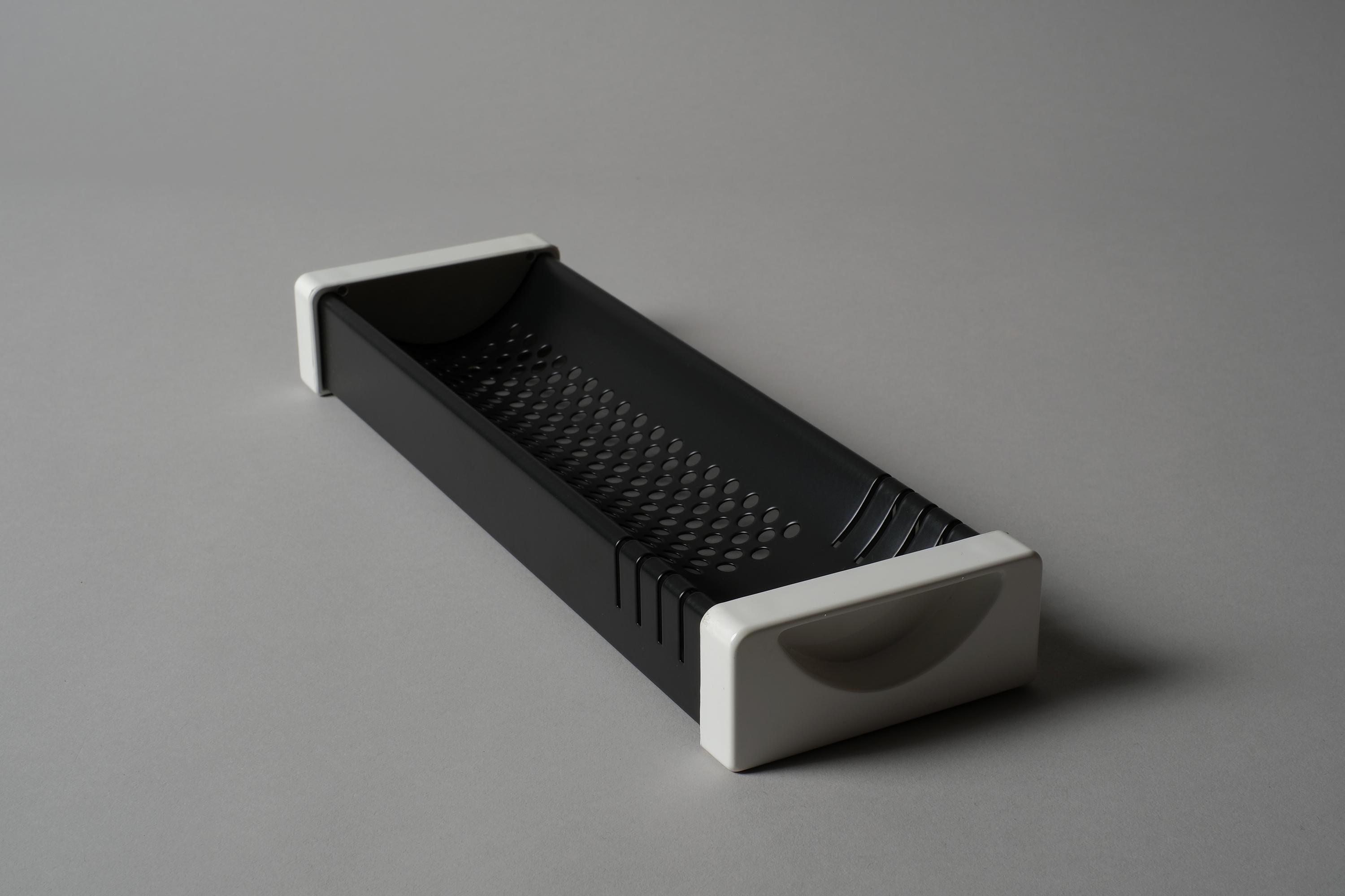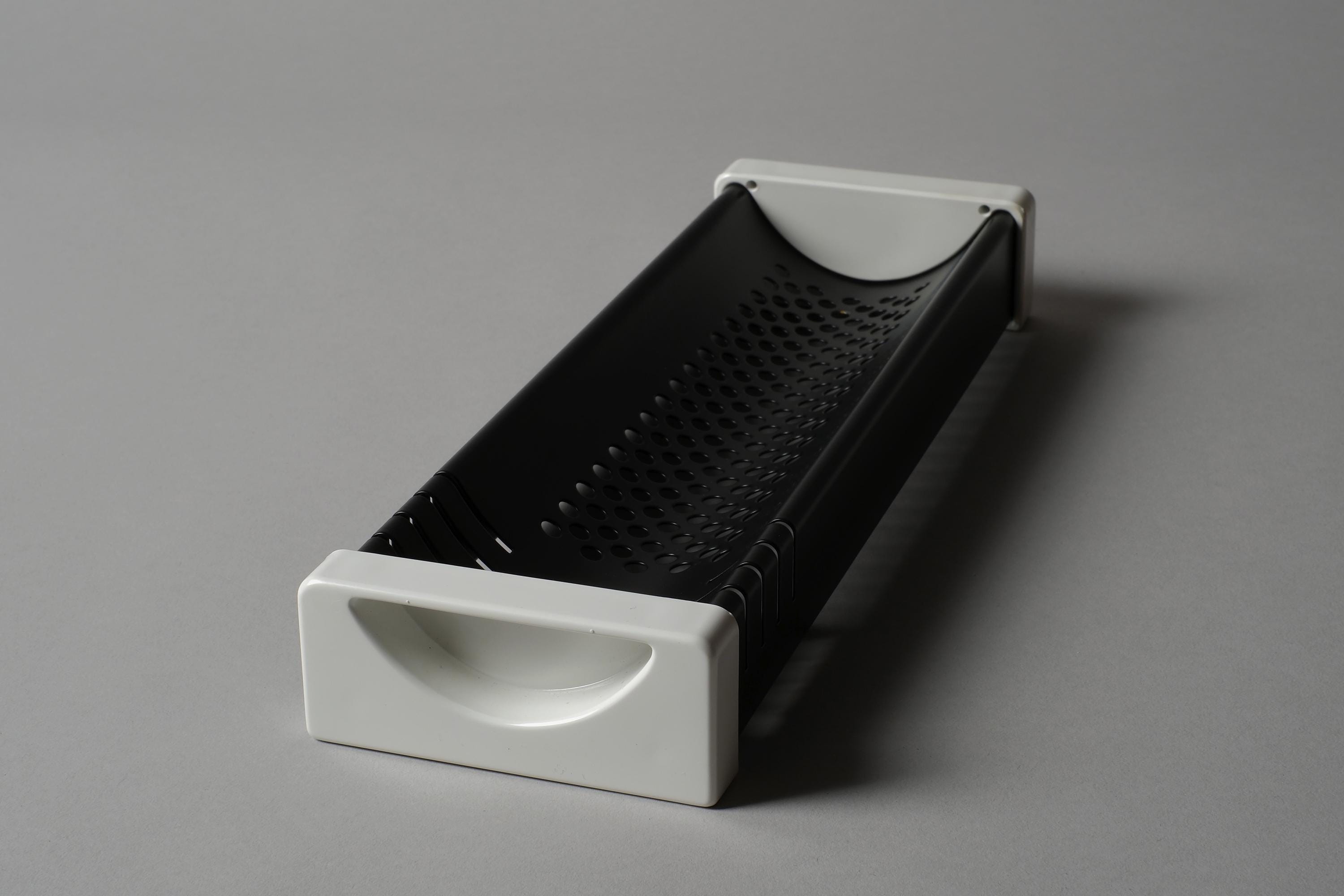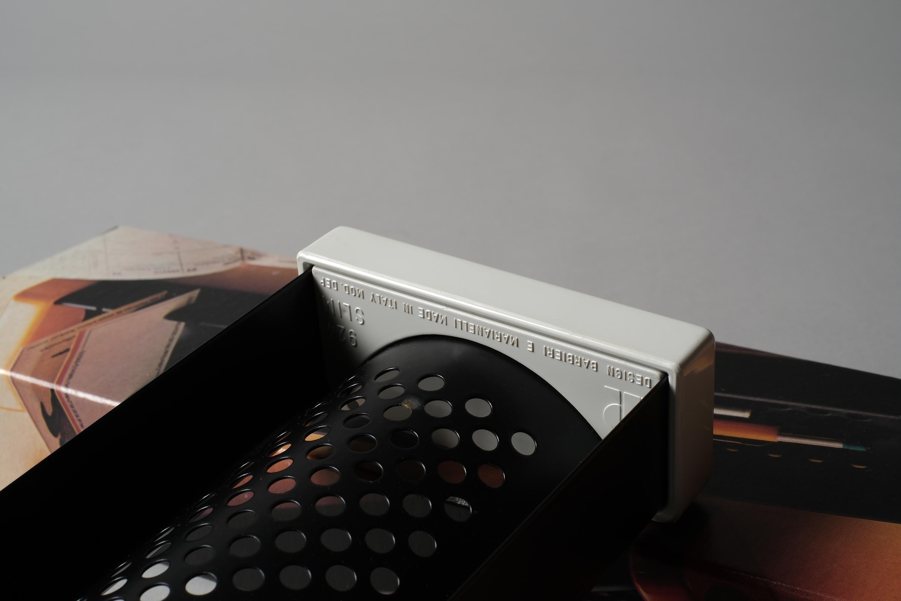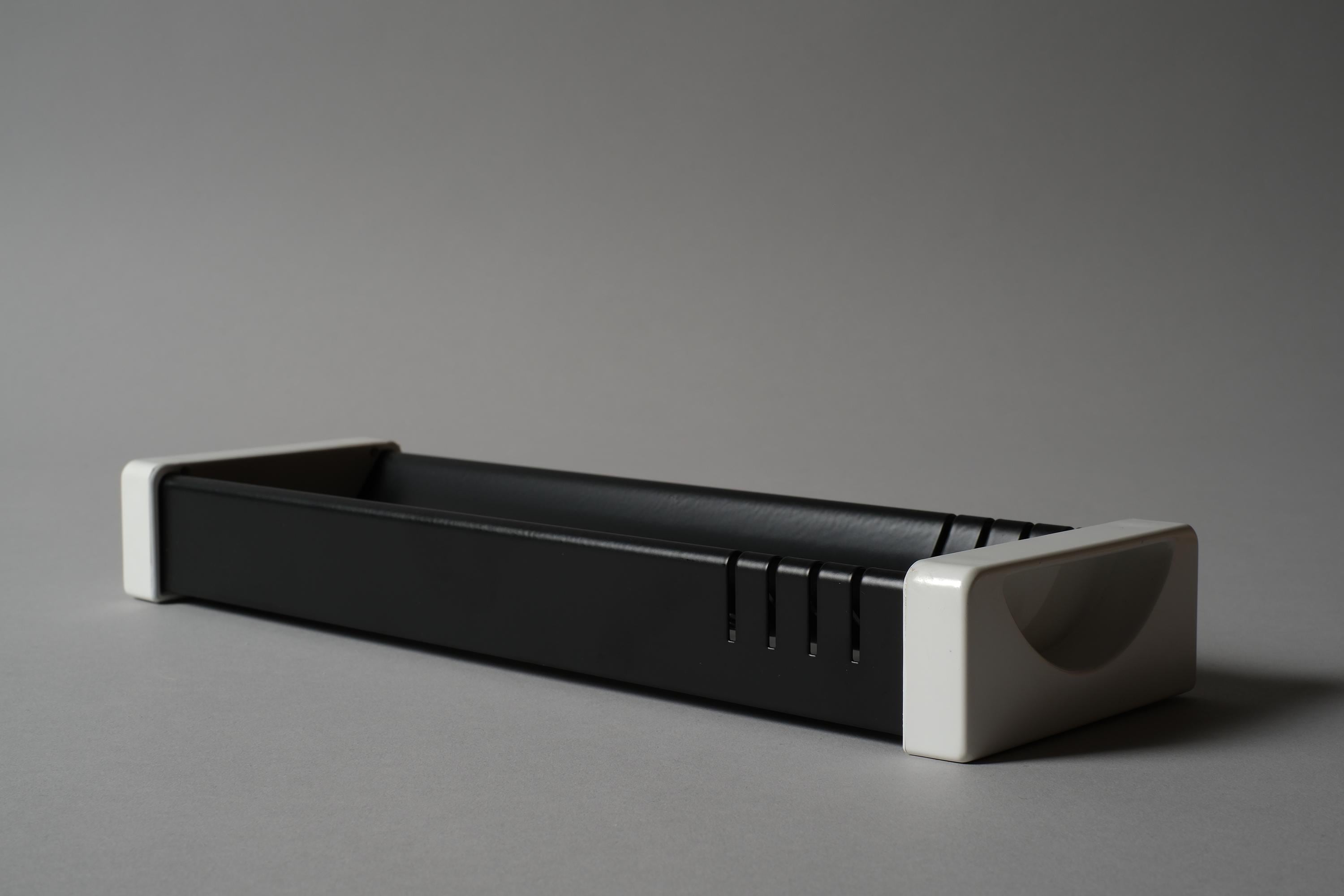 Vintage 1980s Rexite Slim pen holder by Raul Barbieri and Giorgio Marianelli, Italy. A long, low trough in perforated black metal set into a white plastic cradle, the combination of industrial perforation and clean plastic housing characteristic of Rexite design language. New in box, unused, in original packaging.