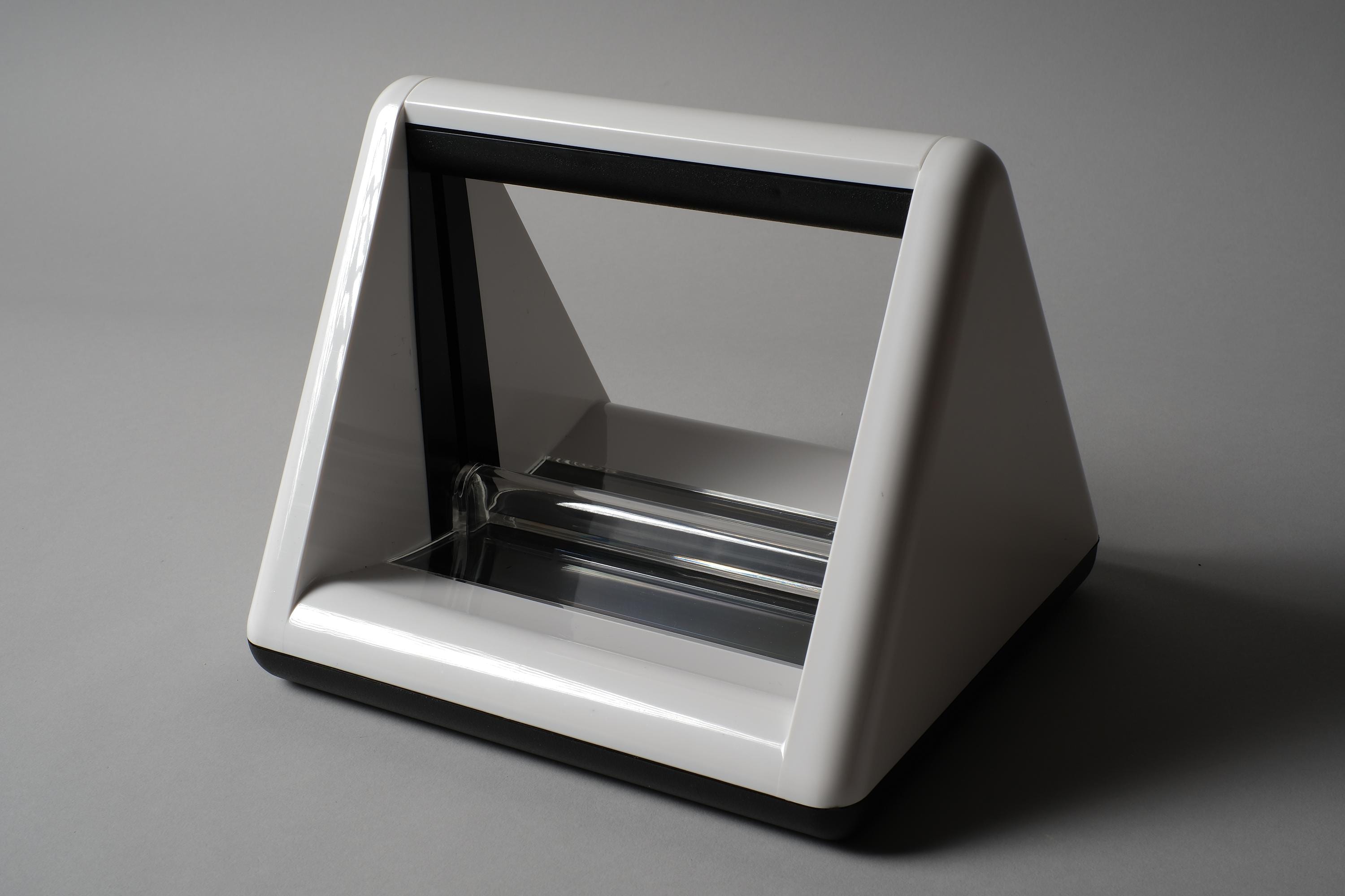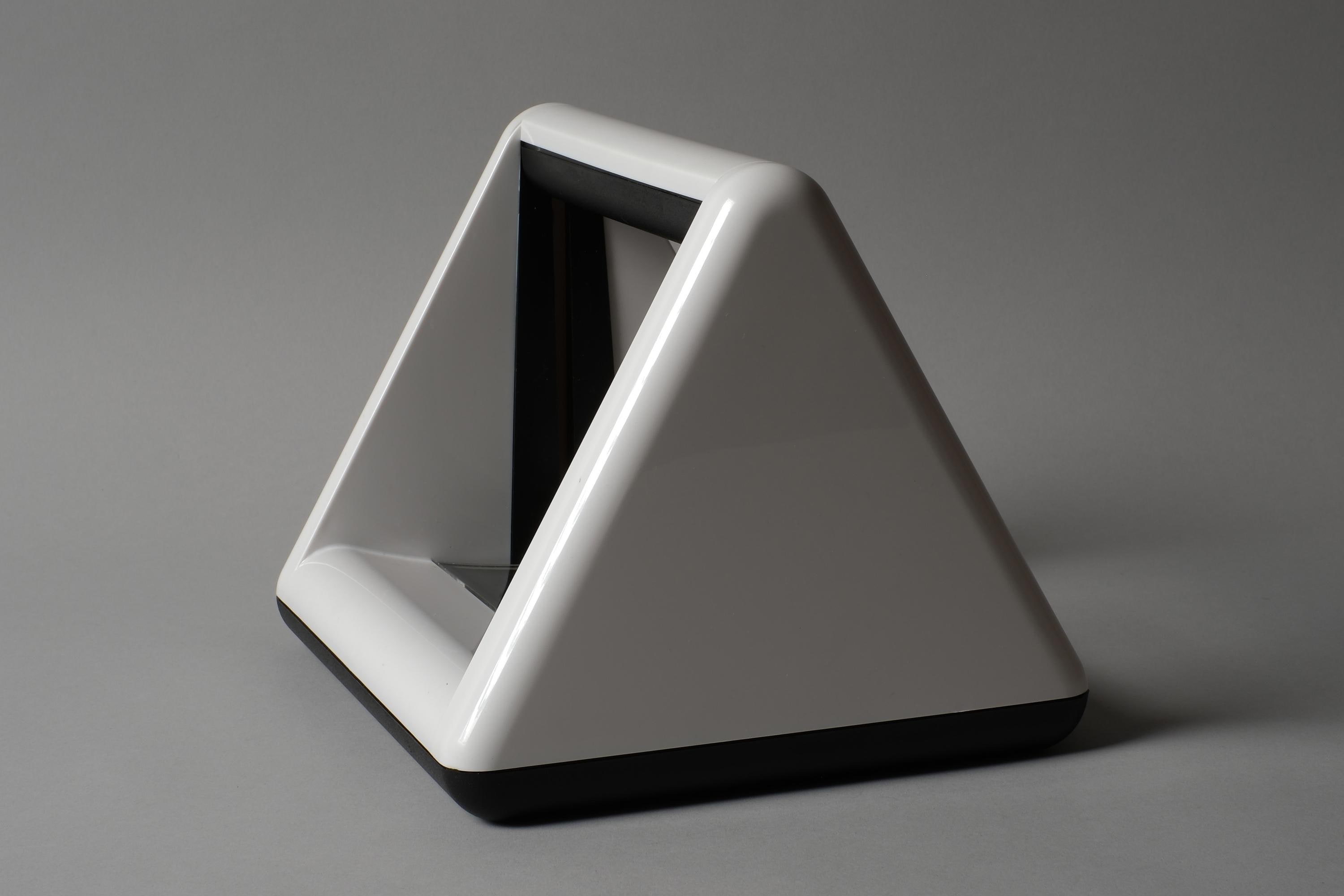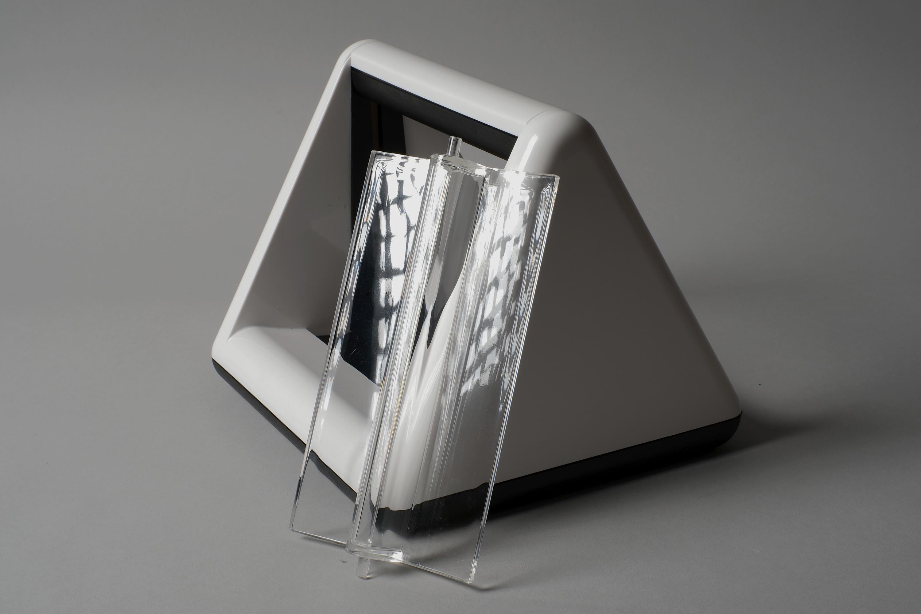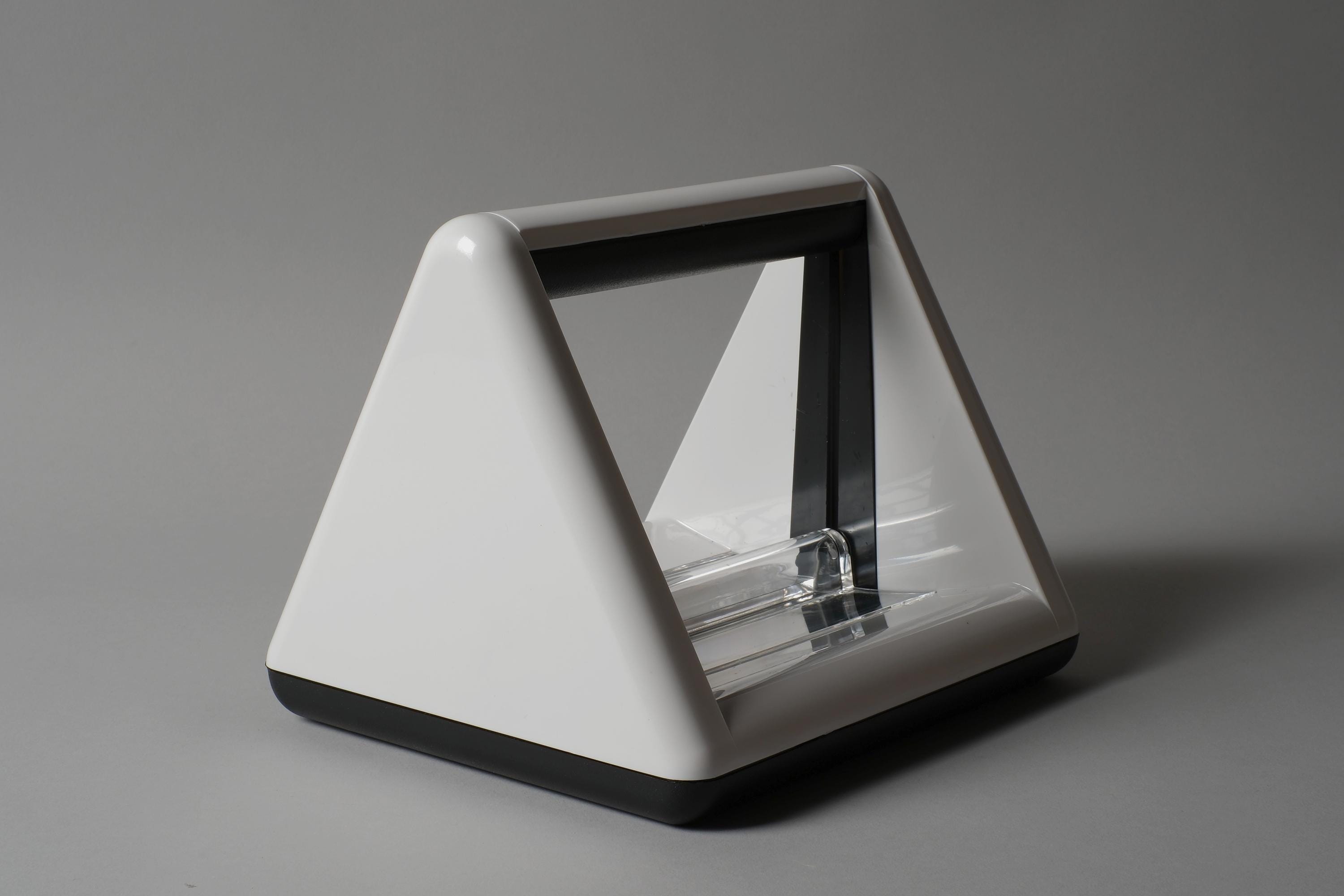 Vintage 1980s Biesse Delta napkin holder by Pino Spagnolo, Italy. A triangular white and black ABS plastic construction with a transparent rectangular plastic slot to keep napkins in place, the right-angle triangular profile giving the object an architectural presence on any surface. New in box, unused, original packaging intact.
