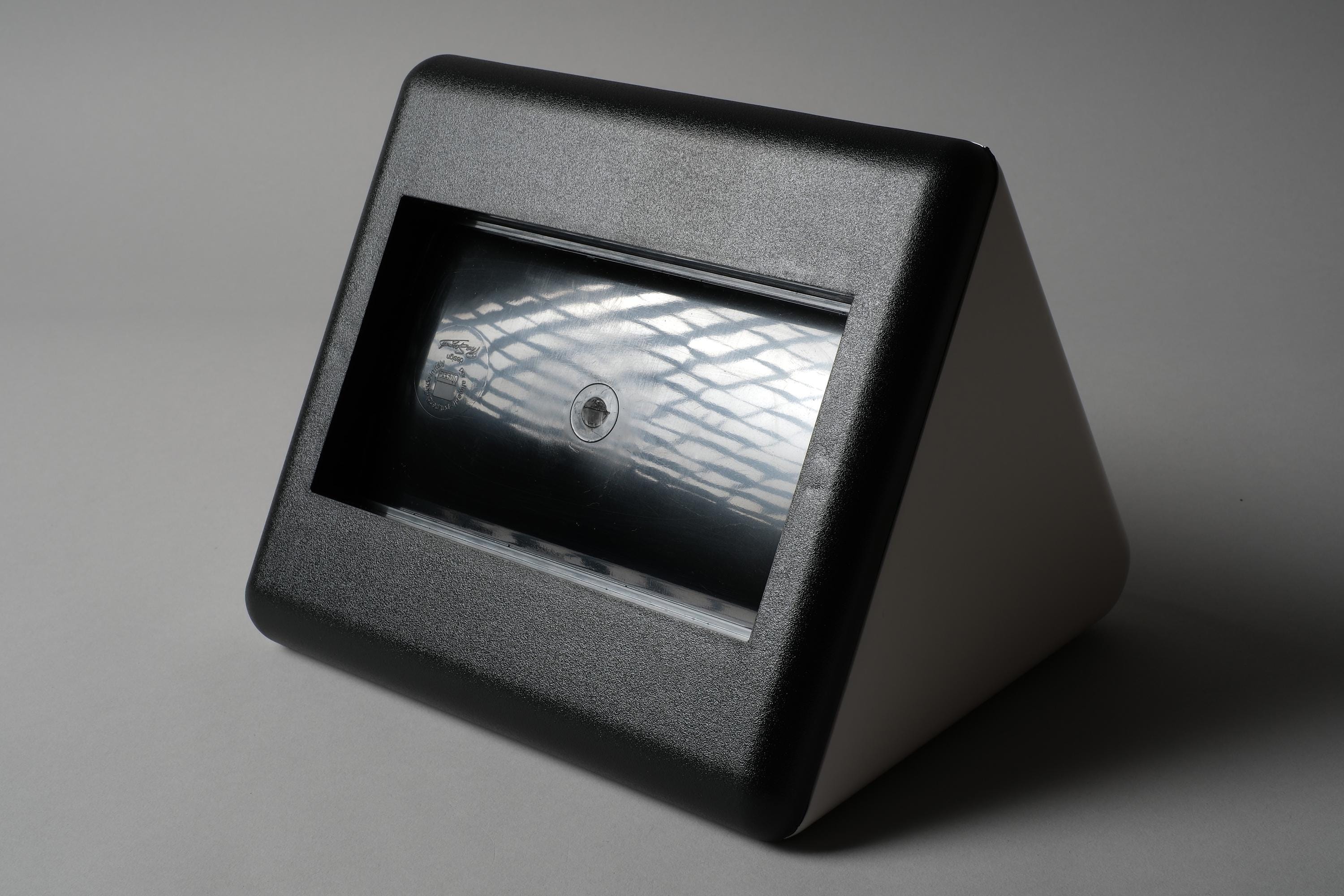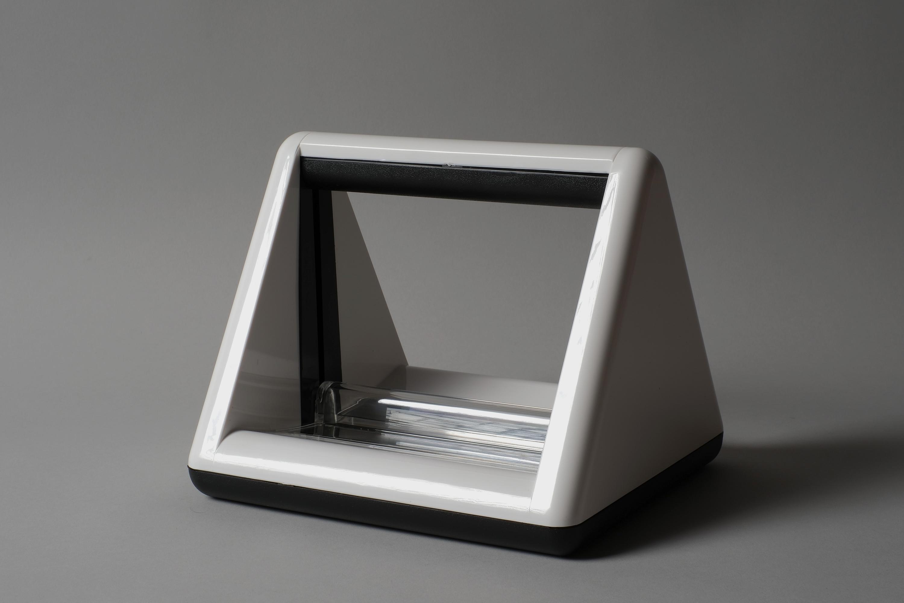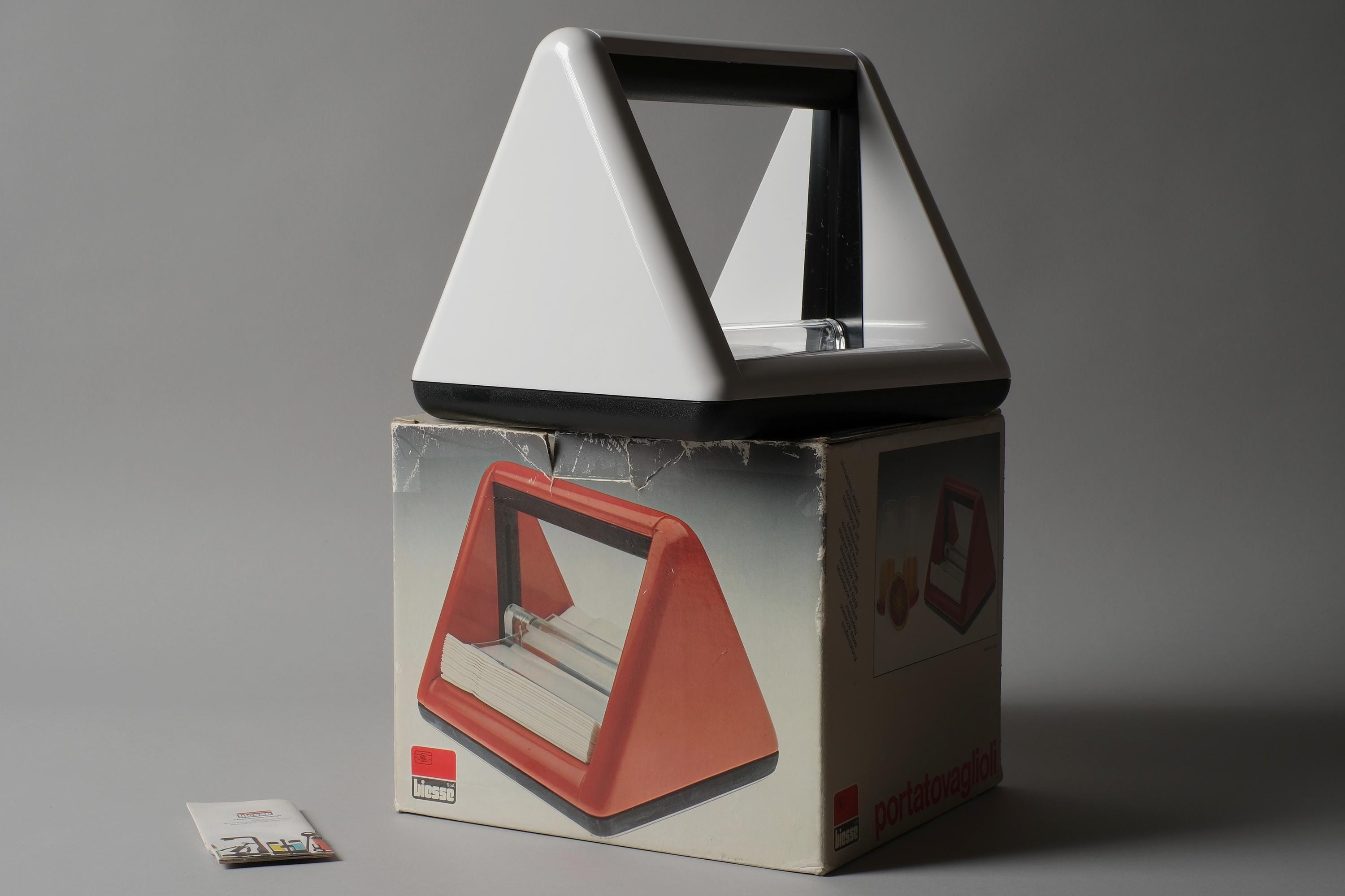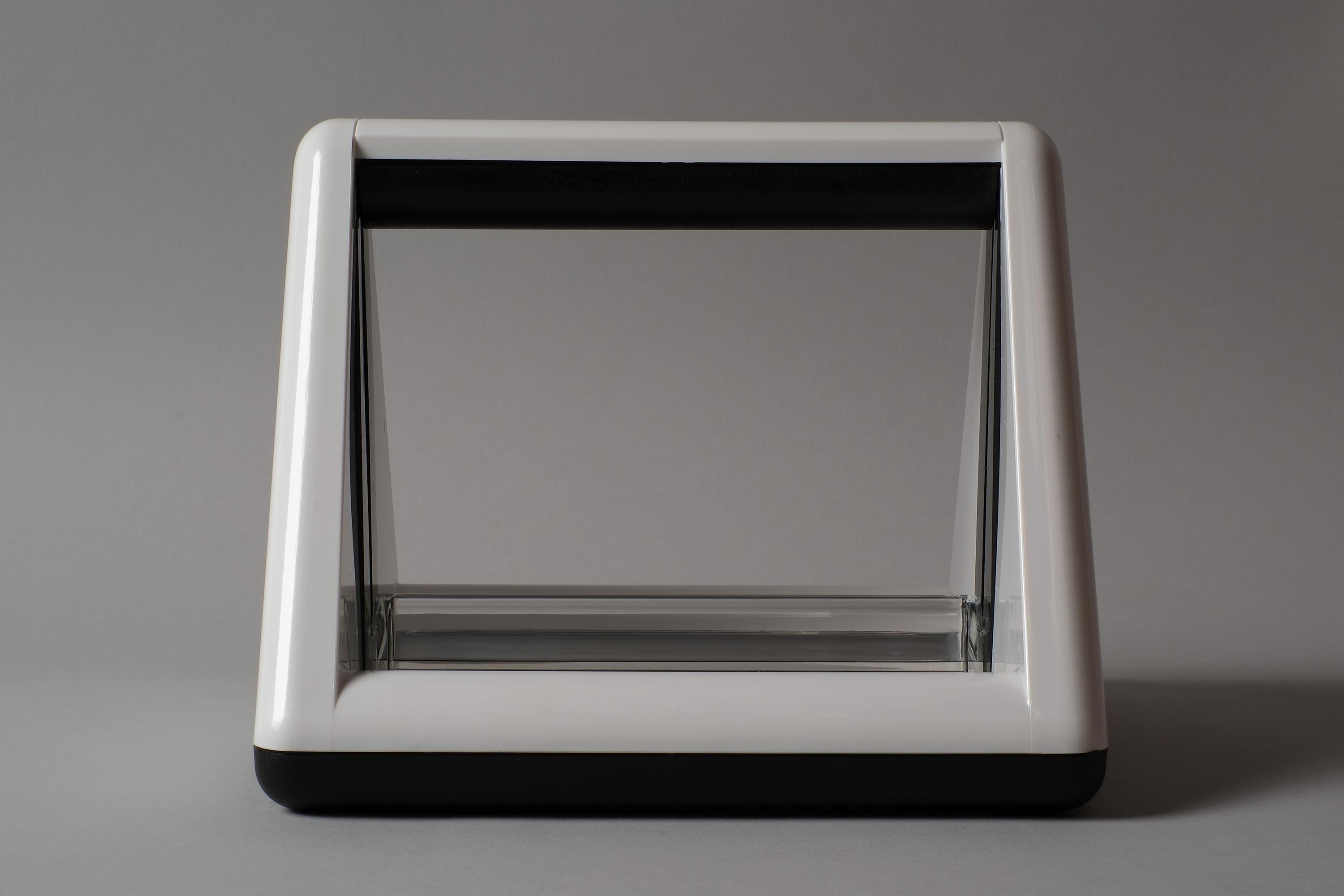 Vintage 1980s Biesse Delta napkin holder by Pino Spagnolo, Italy. A triangular white and black ABS plastic construction with a transparent rectangular plastic slot to keep napkins in place, the right-angle triangular profile giving the object an architectural presence on any surface. New in box, unused, original packaging intact.
