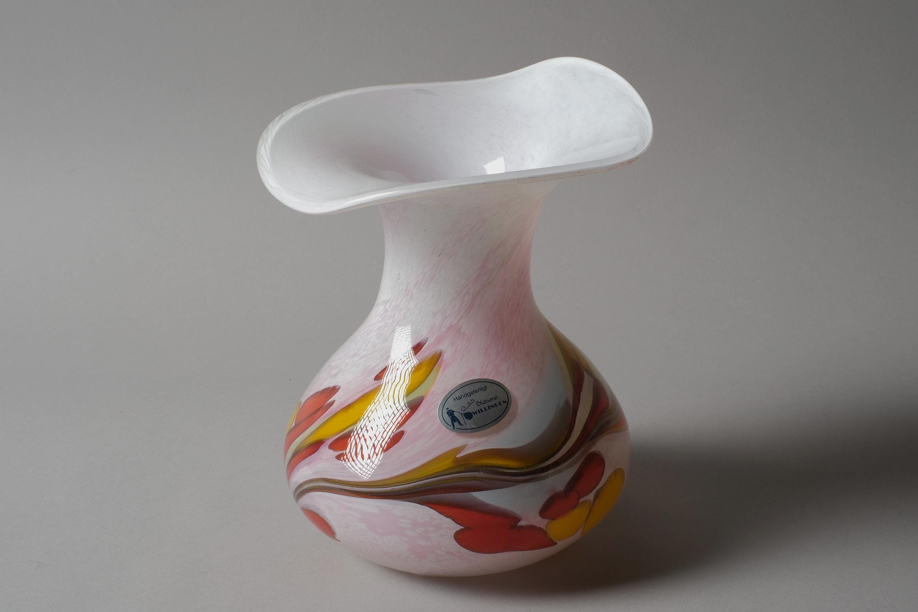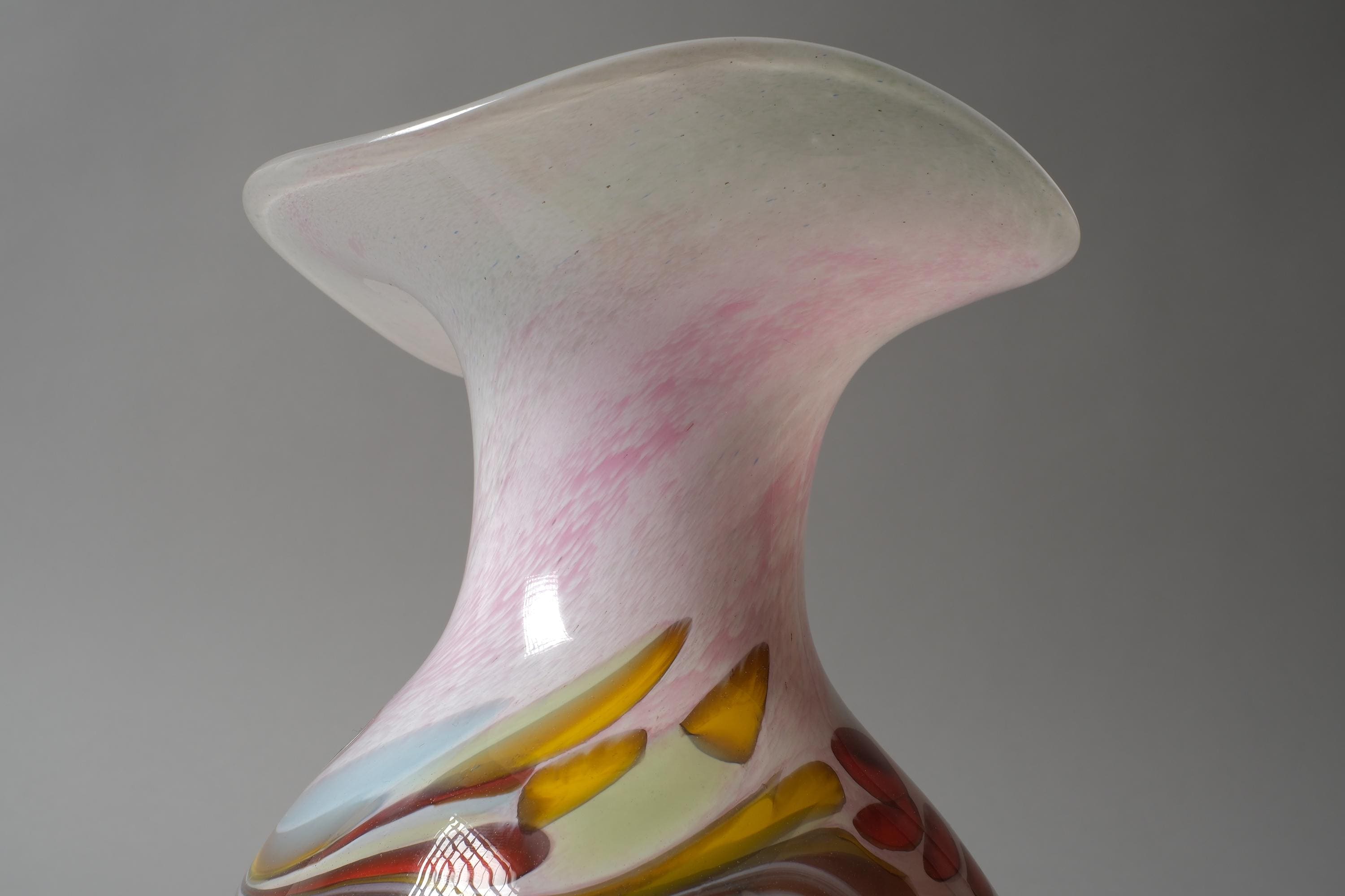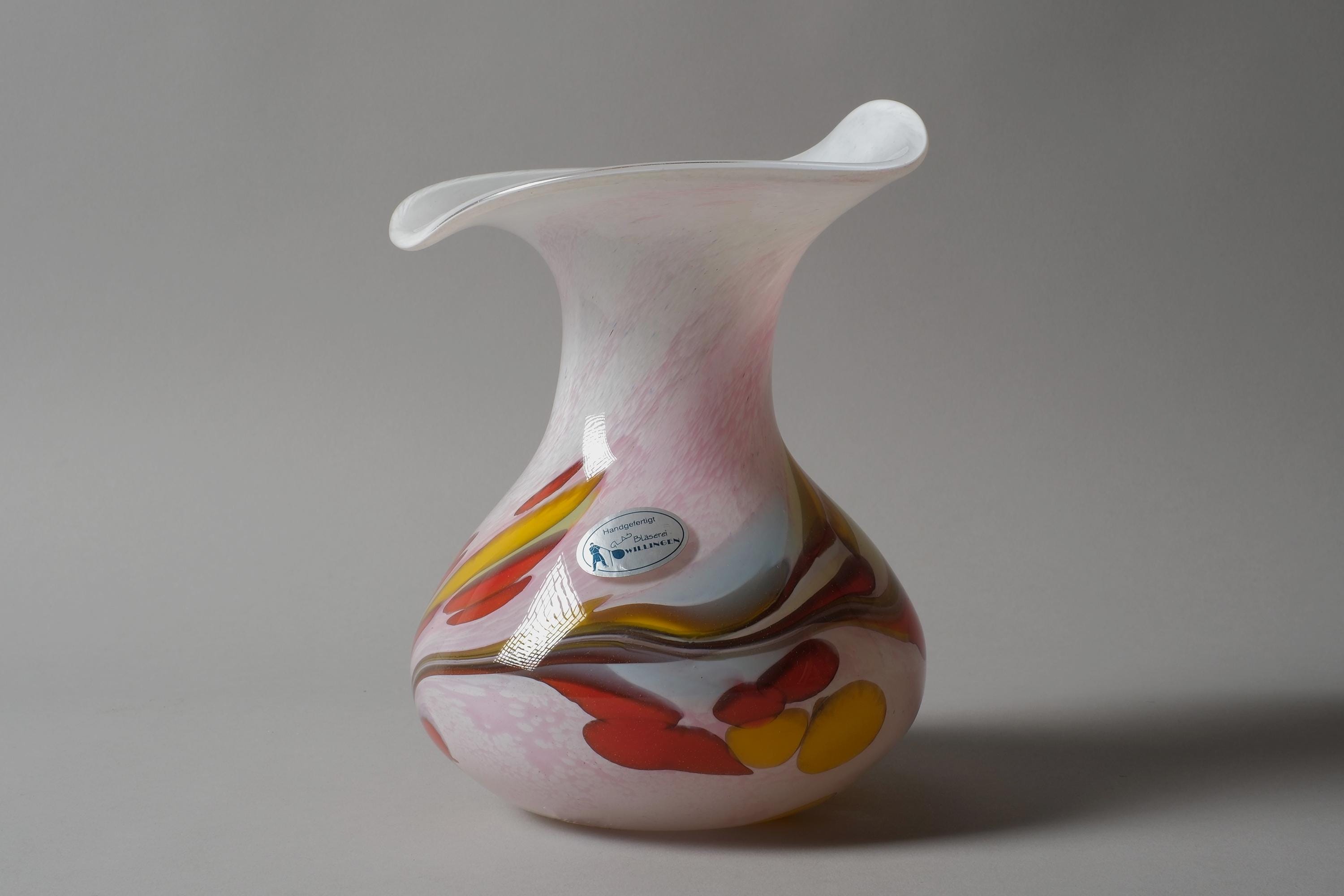 Vintage 1990s Willinger Glasmanufaktur mouth-blown art glass vase, Germany. The bulbous body in opaline white glass with a multicolor swirl design of red, yellow, pink and brown worked into the glass itself, the neck rises to a wide flared rim with a wavy white edge.