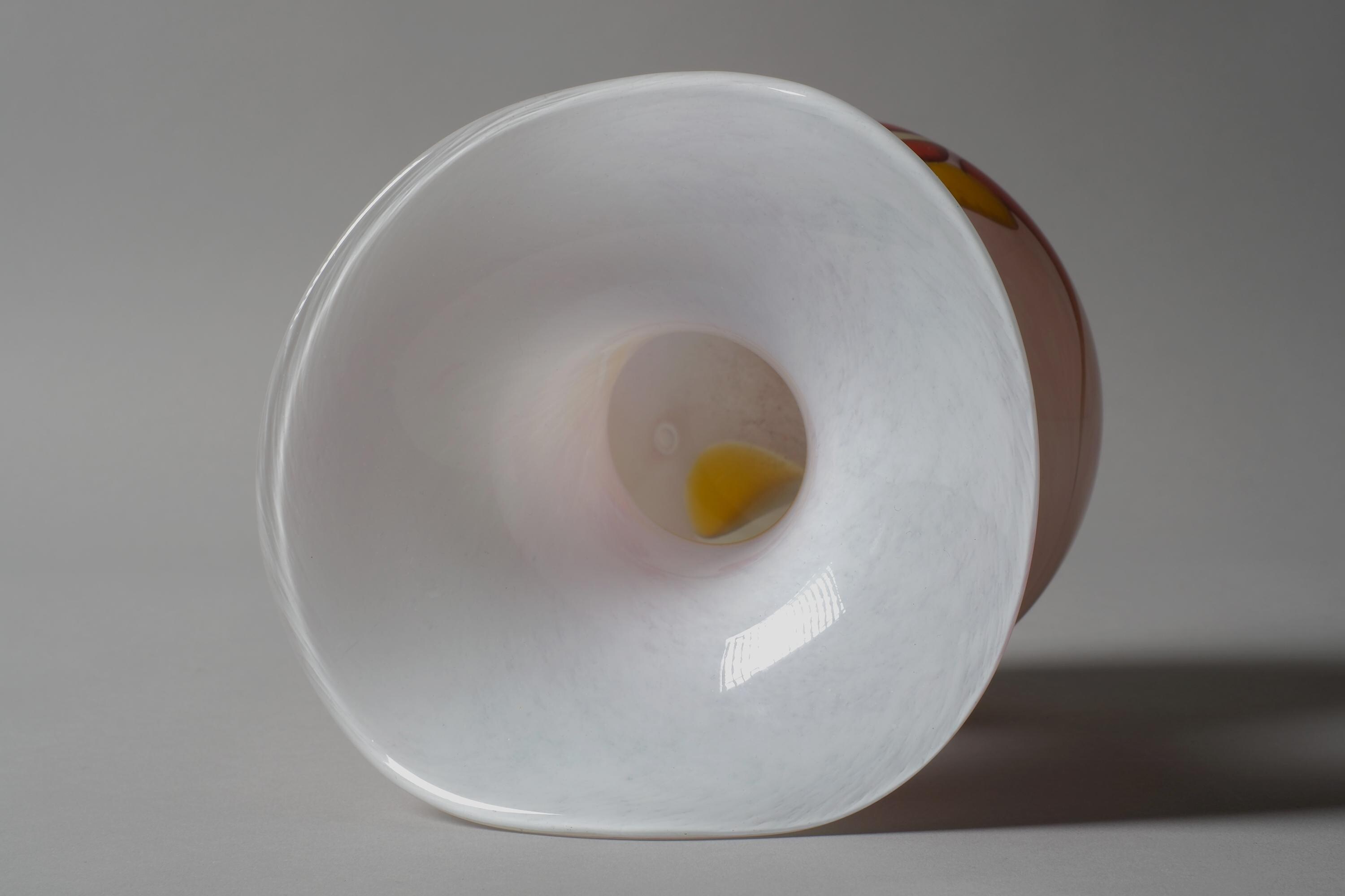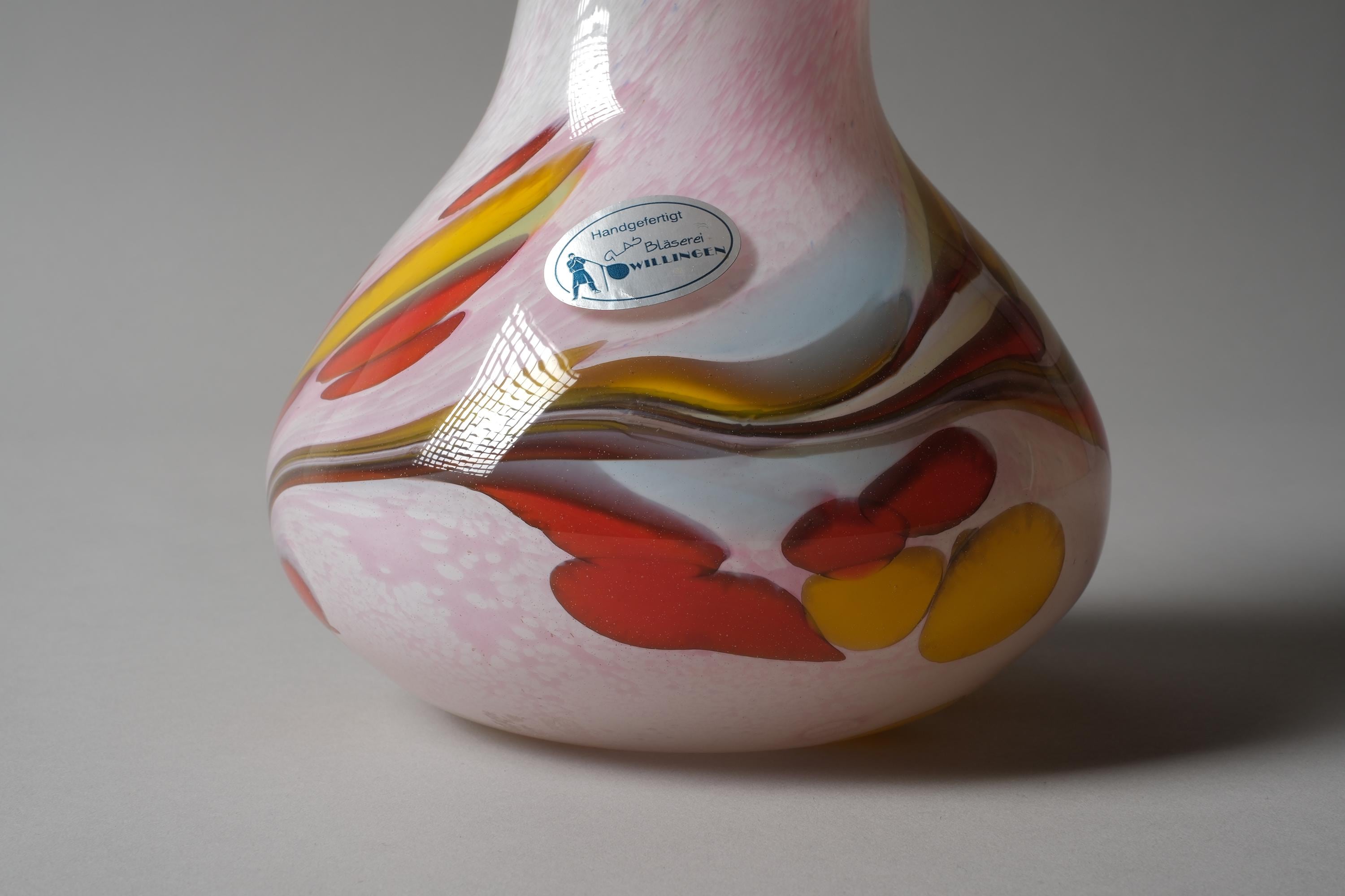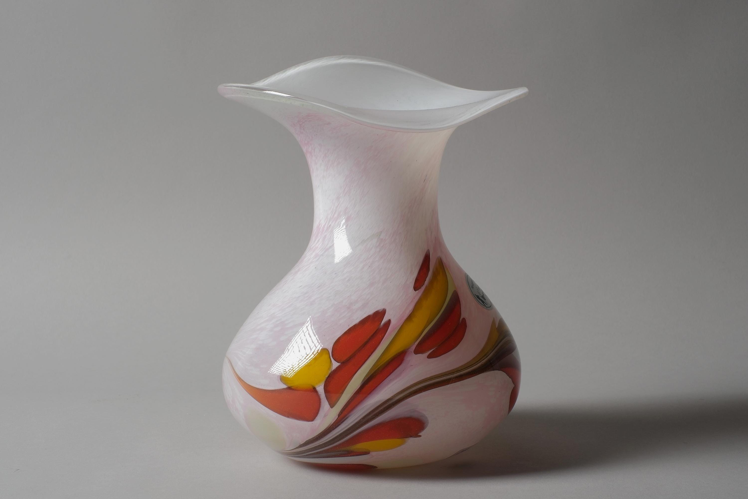 Vintage 1990s Willinger Glasmanufaktur mouth-blown art glass vase, Germany. The bulbous body in opaline white glass with a multicolor swirl design of red, yellow, pink and brown worked into the glass itself, the neck rises to a wide flared rim with a wavy white edge.