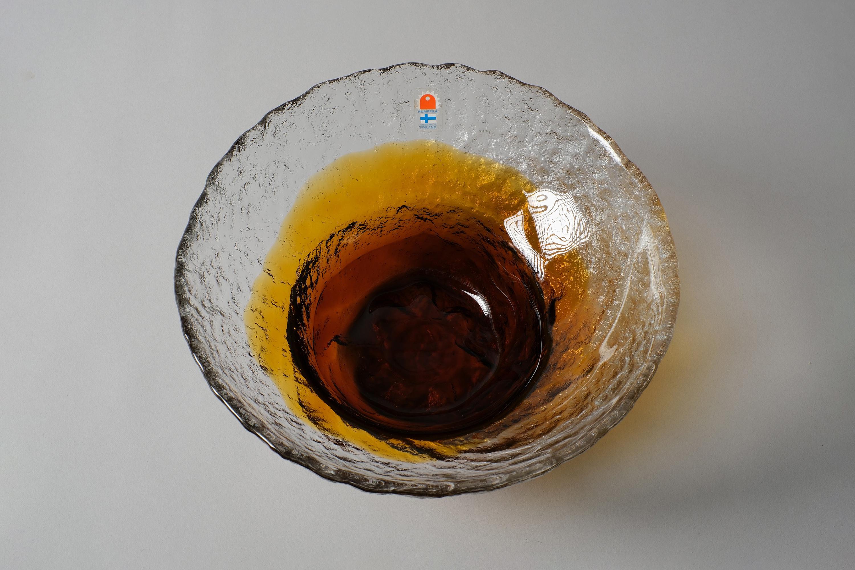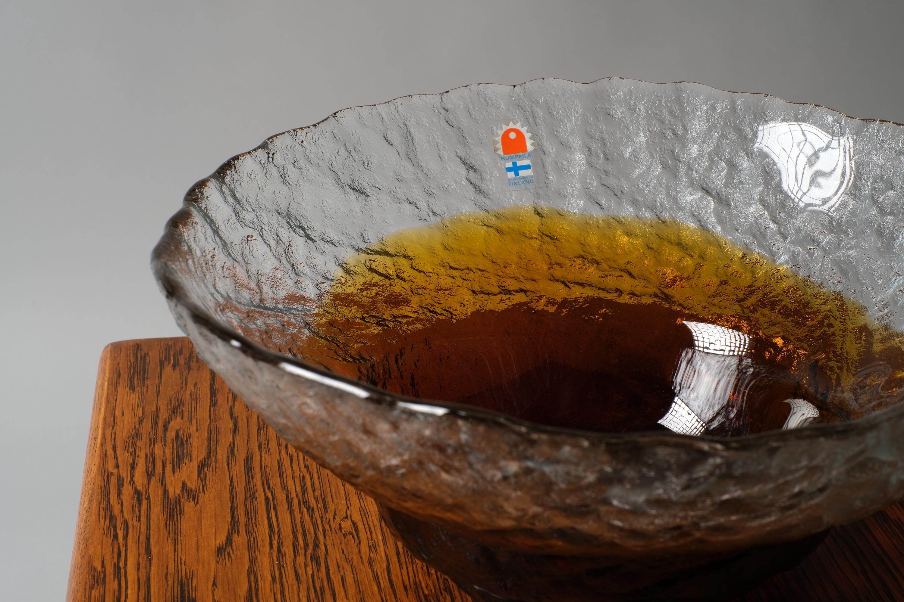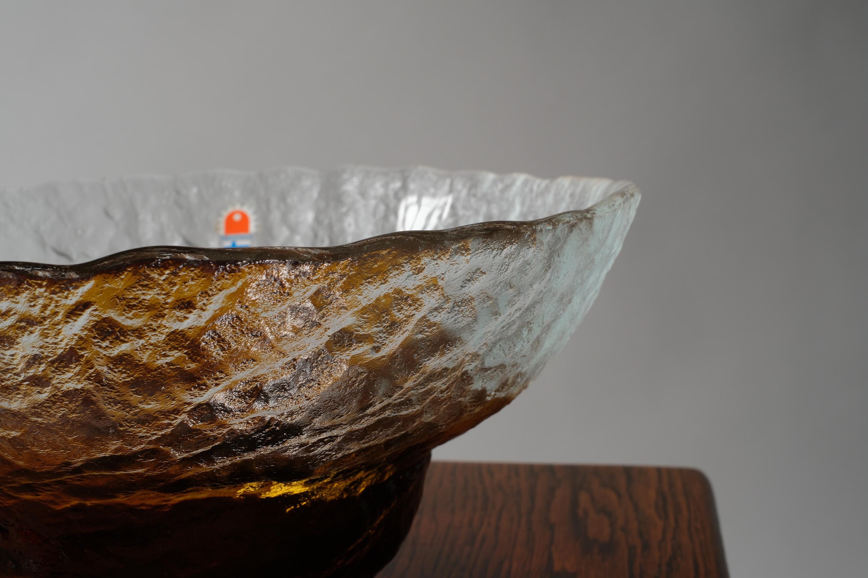 Vintage 1970s Humppila Kivi-Set art glass bowl by Pertti Santalahti, Finland. A deep bowl in clear and amber cast glass, the exterior surface textured in an irregular pebble and stone formation, the interior is smooth and polished, the amber concentration pools at the base and radiates outward to clear at the rim. Signed by the artist on the underside. Original Humppila sticker intact.