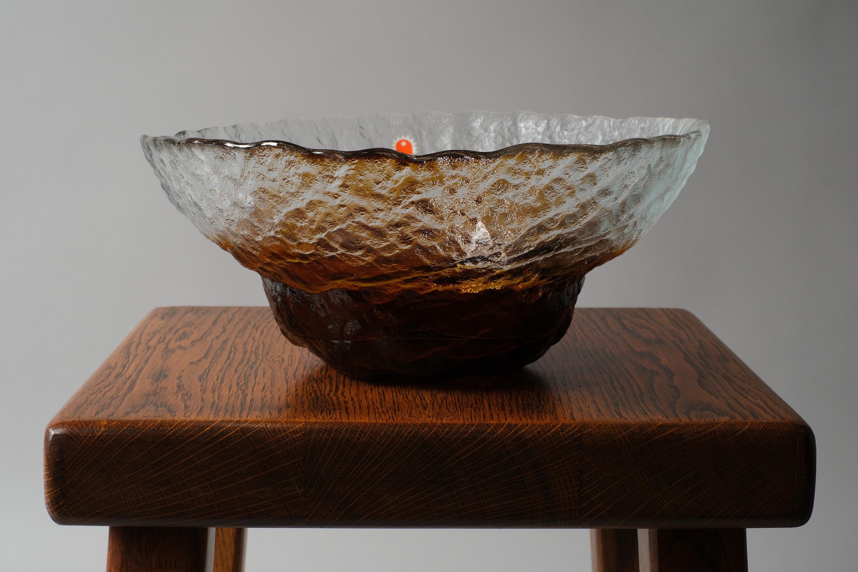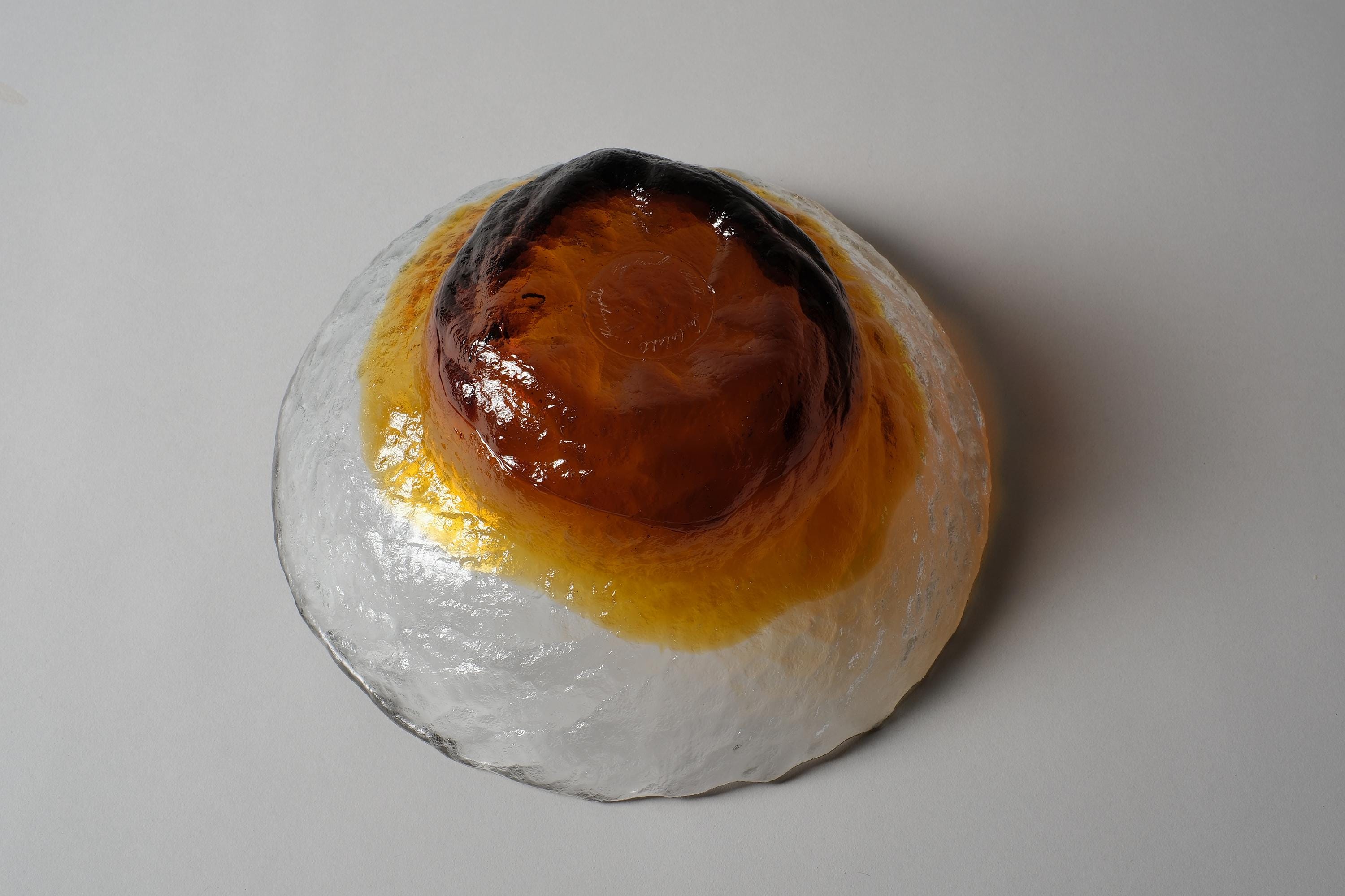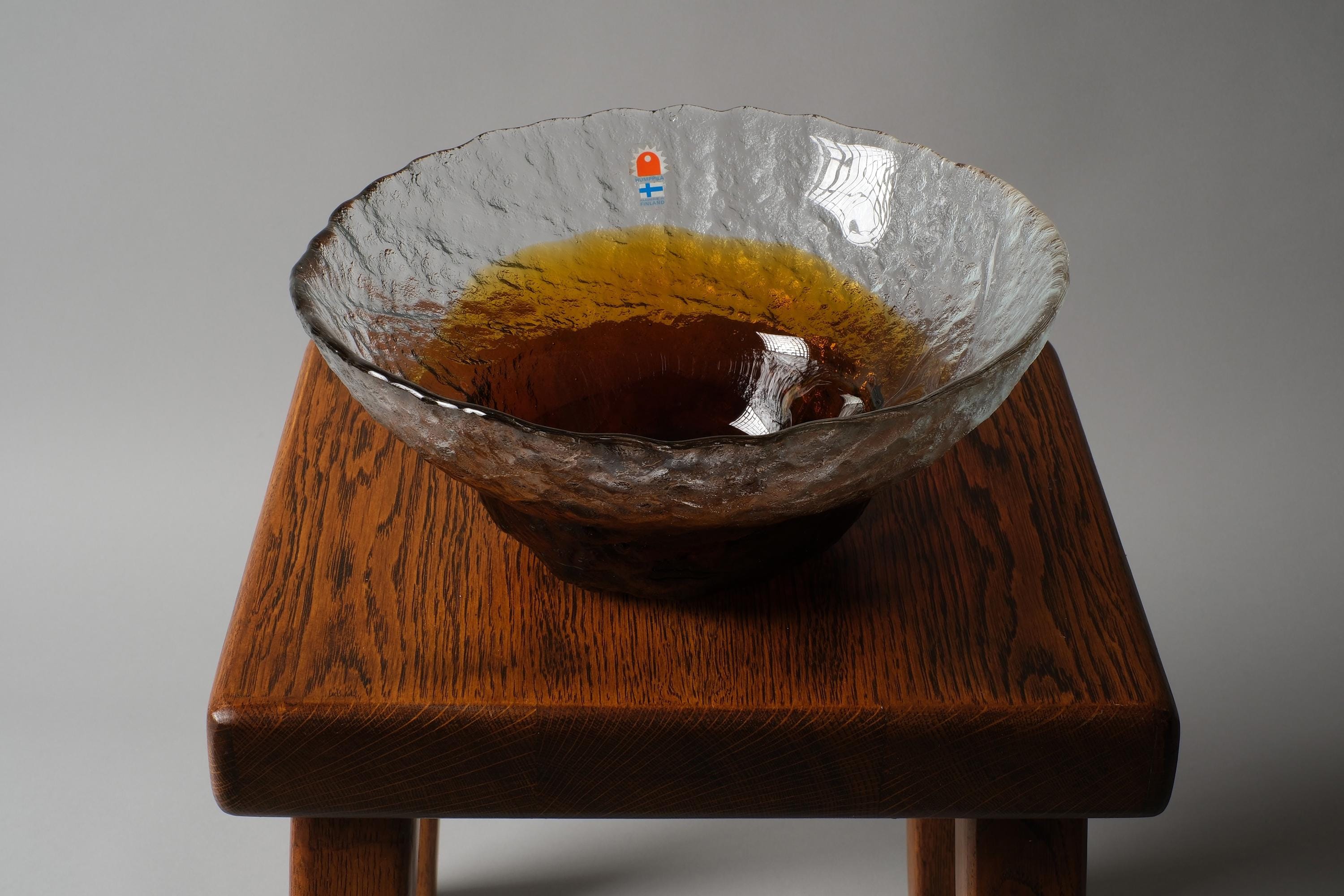 Vintage 1970s Humppila Kivi-Set art glass bowl by Pertti Santalahti, Finland. A deep bowl in clear and amber cast glass, the exterior surface textured in an irregular pebble and stone formation, the interior is smooth and polished, the amber concentration pools at the base and radiates outward to clear at the rim. Signed by the artist on the underside. Original Humppila sticker intact.
