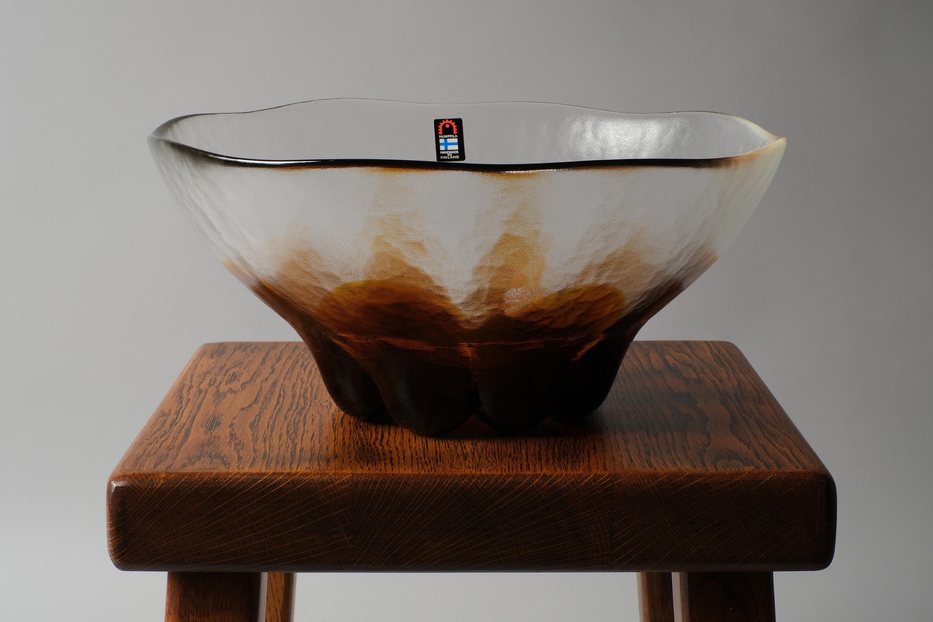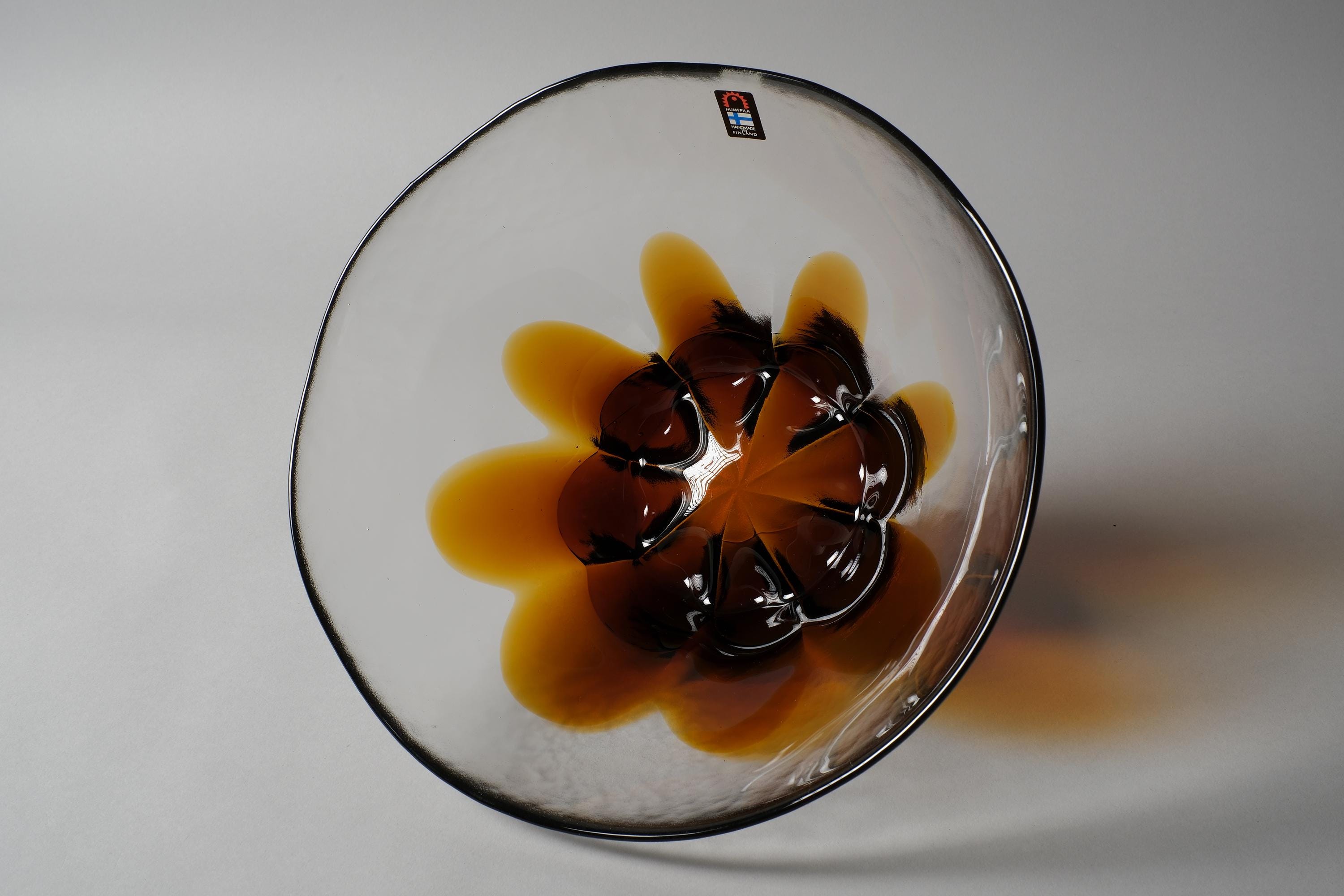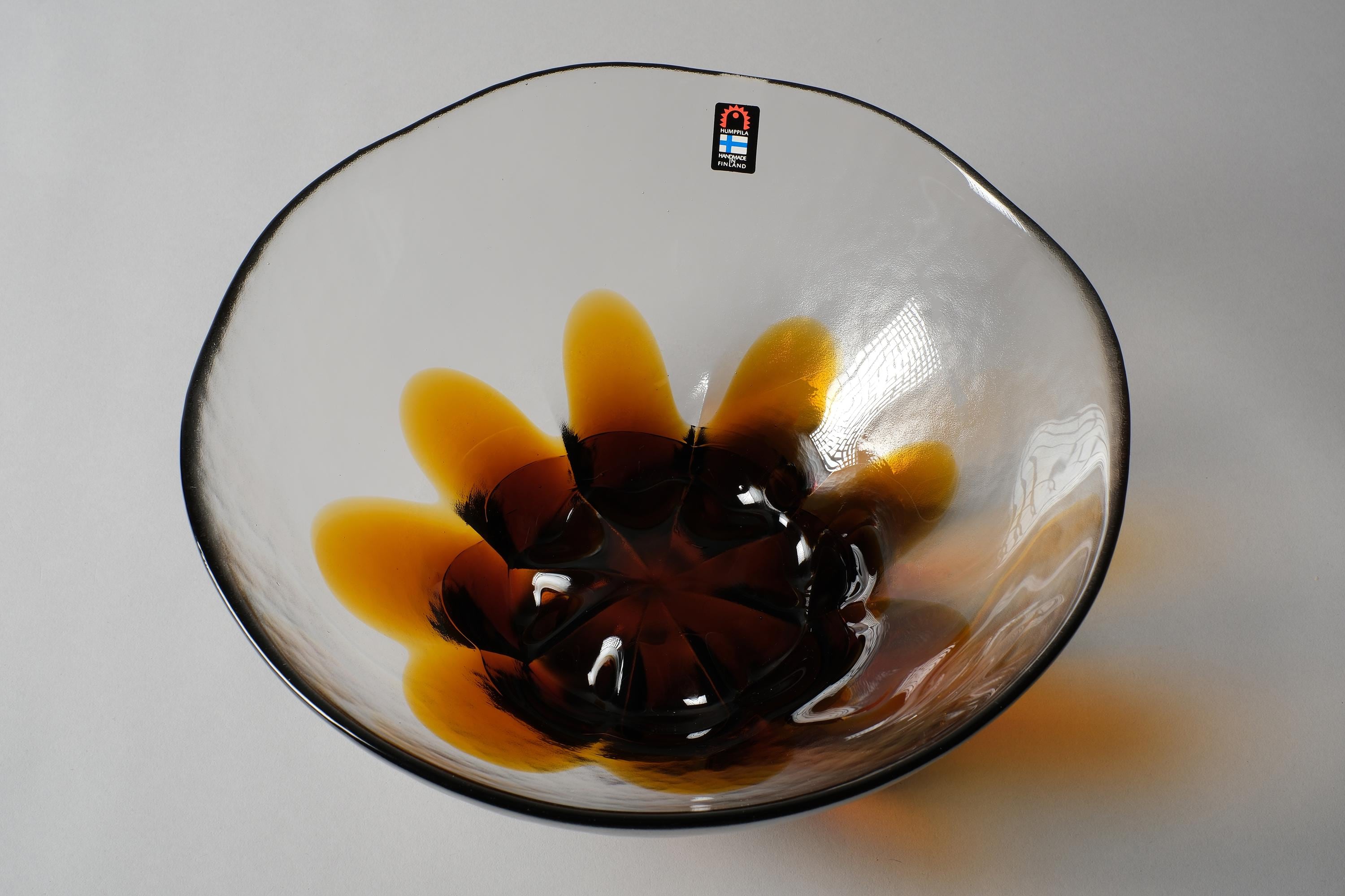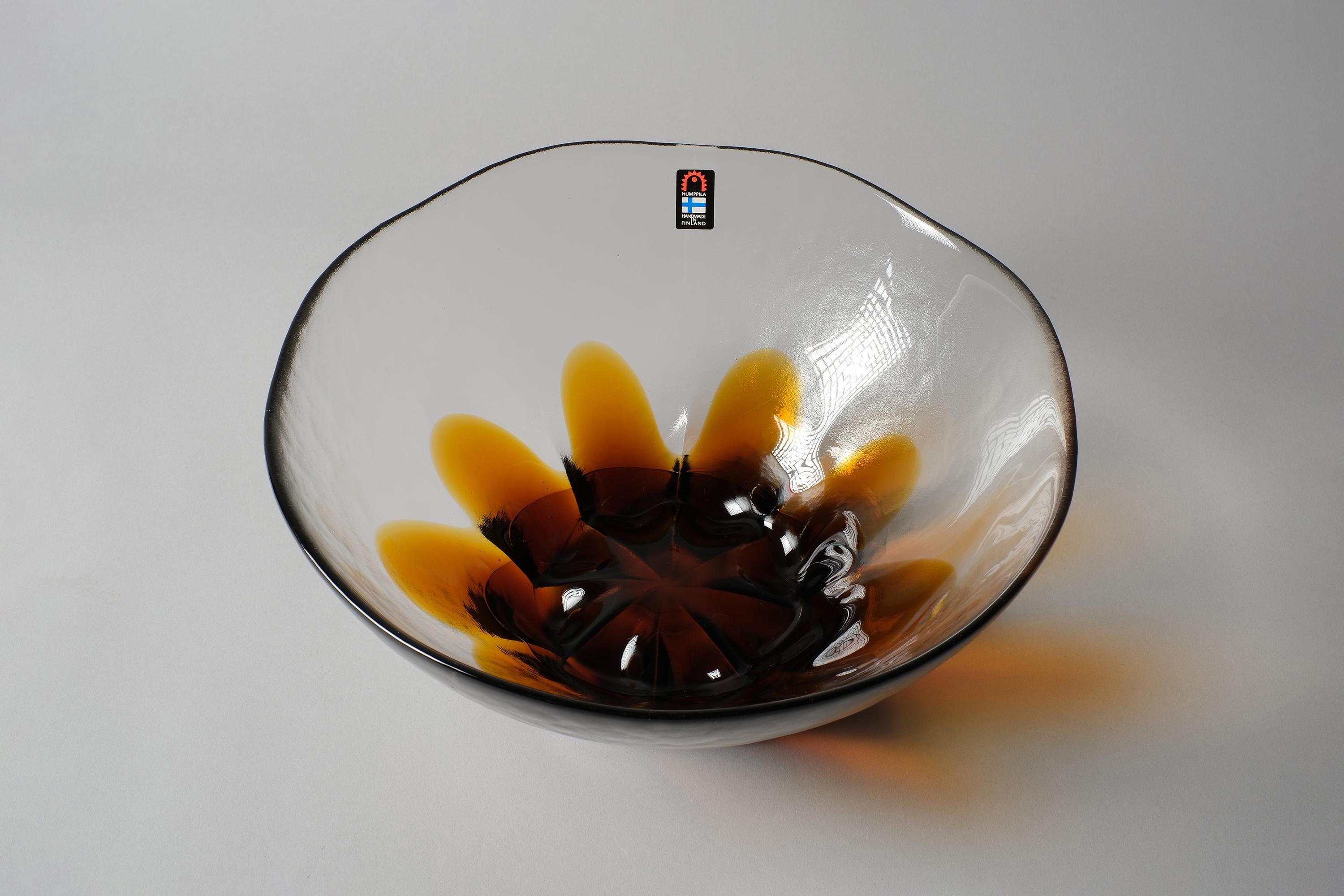 Vintage 1970s Humppila art glass bowl, Finland. A wide, clear glass bowl with a deep amber and dark brown sunburst petal pattern worked into the base of the glass, the colour radiates outward in organic petal forms, from a concentrated dark centre, the clear glass body allows the pattern to be read from above and through the sides simultaneously. Original Humppila Handmade in Finland sticker intact.