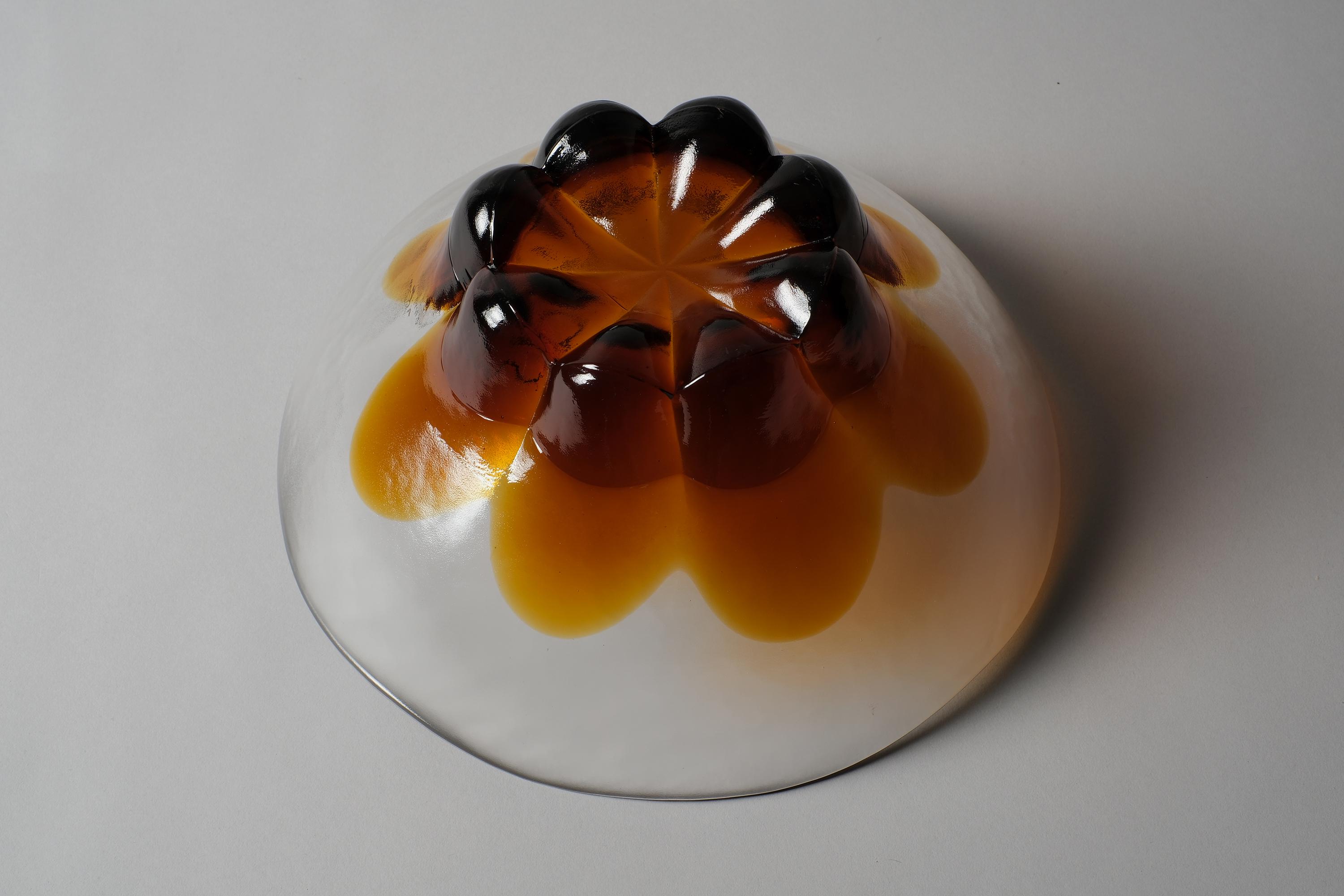 • Material: Clear glass with amber and dark brown glass inclusions.