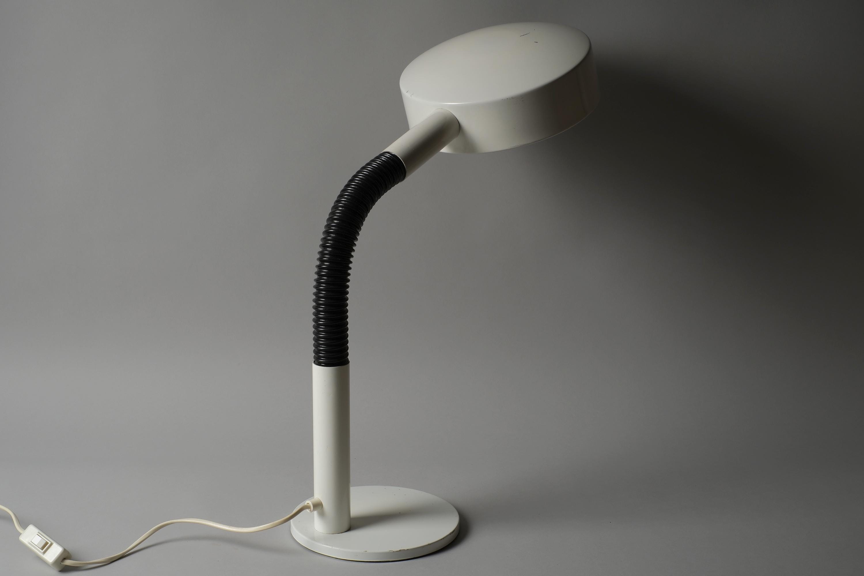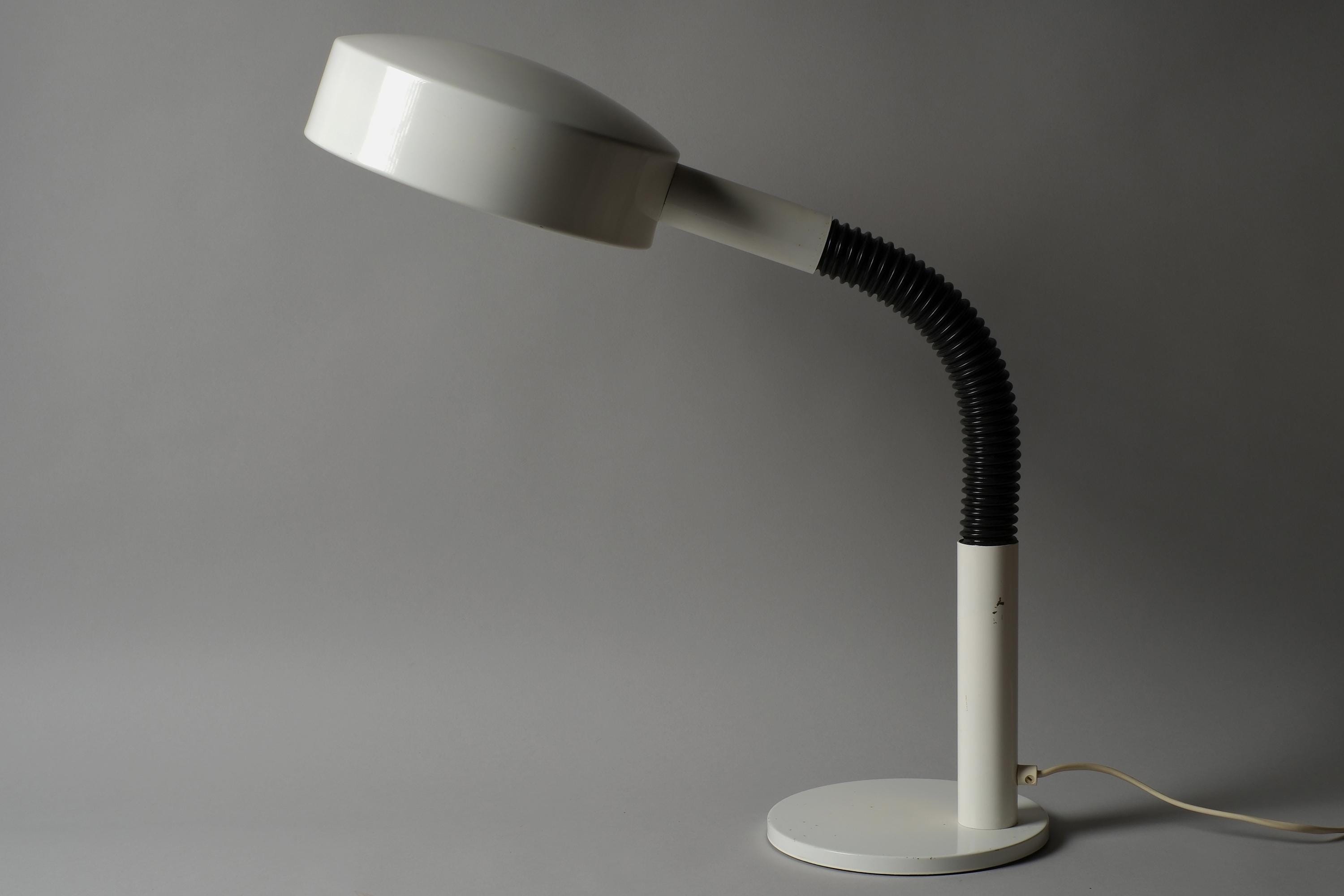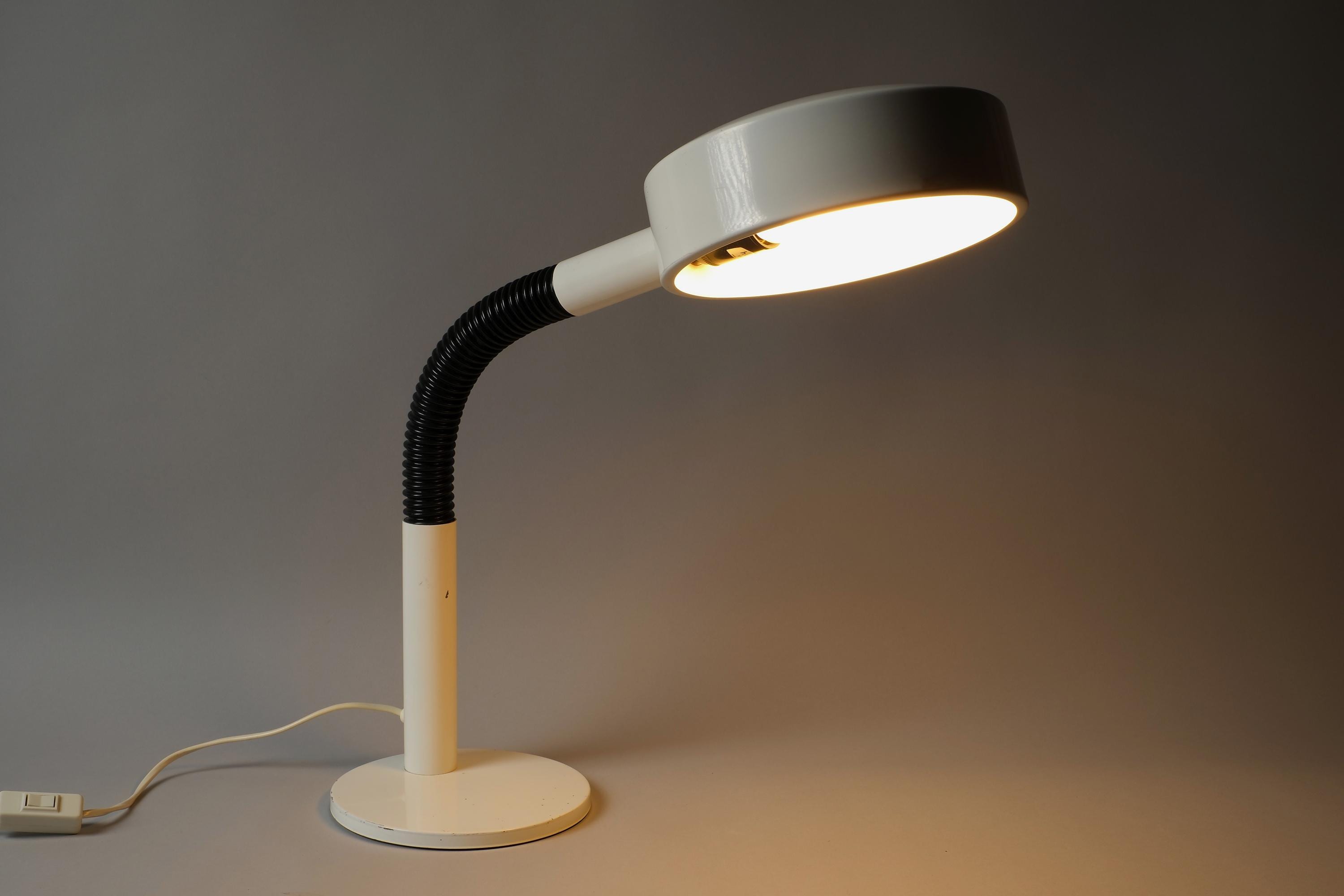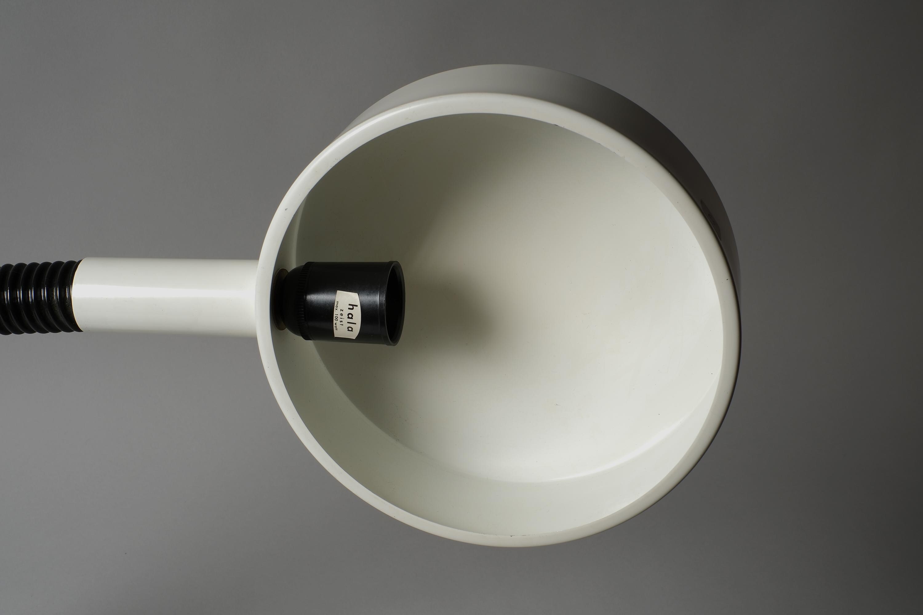 Vintage 1970s Hala Zeist gooseneck desk lamp in white lacquered metal, Netherlands. The classic design features a circular disc shade on a flexible black gooseneck arm rising from a white round weighted base, the height is adjustable between 50 and 65cm by repositioning the arm.