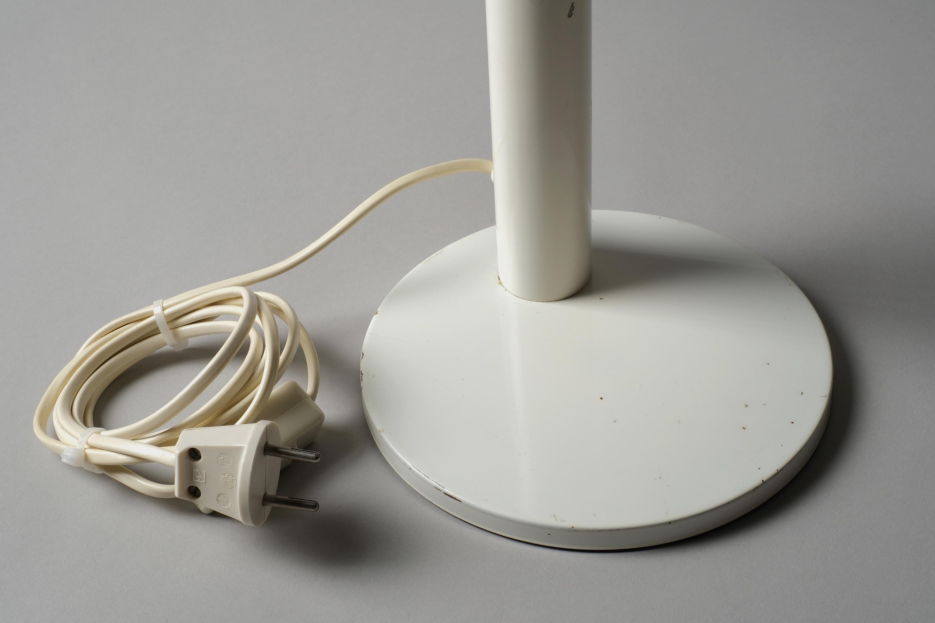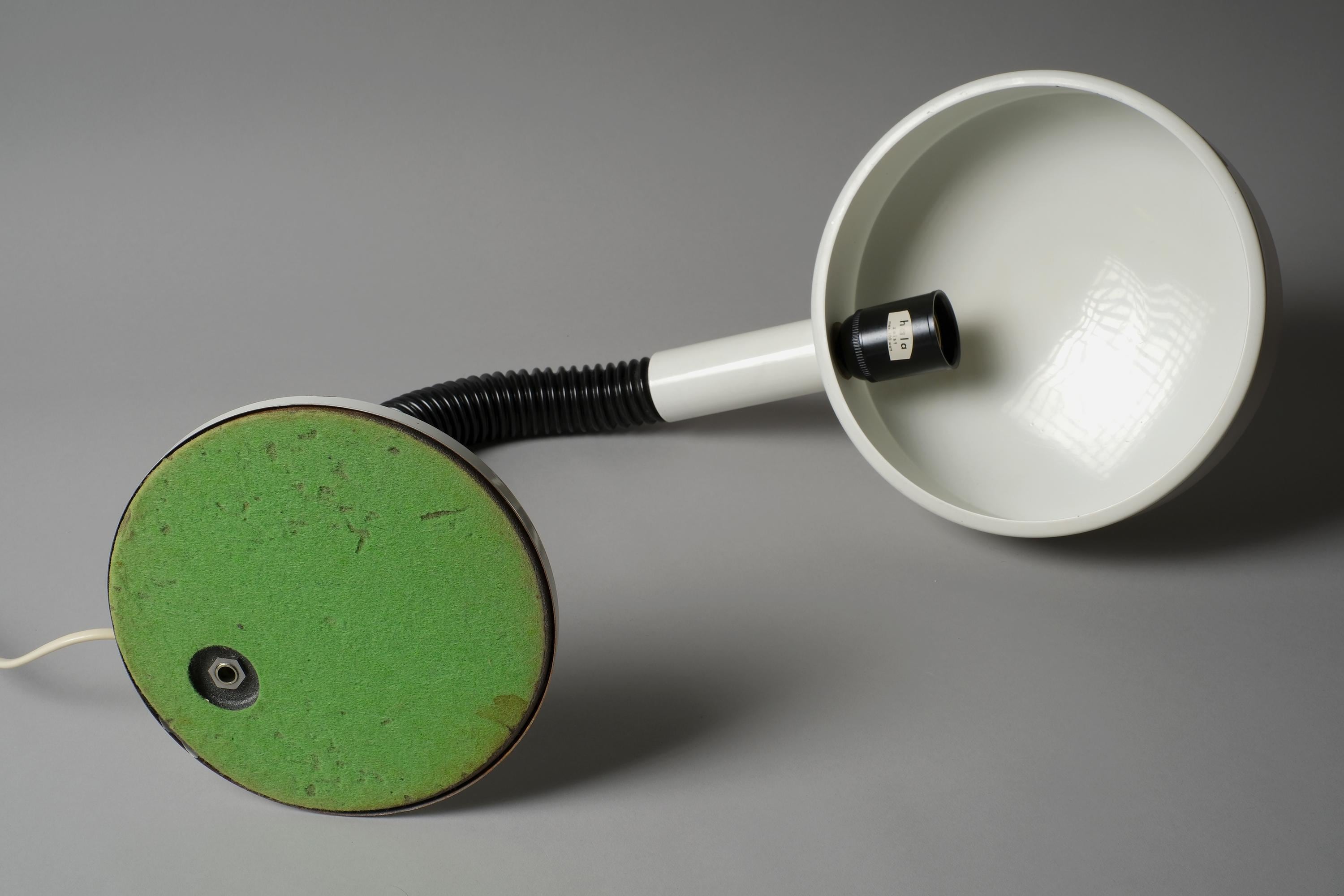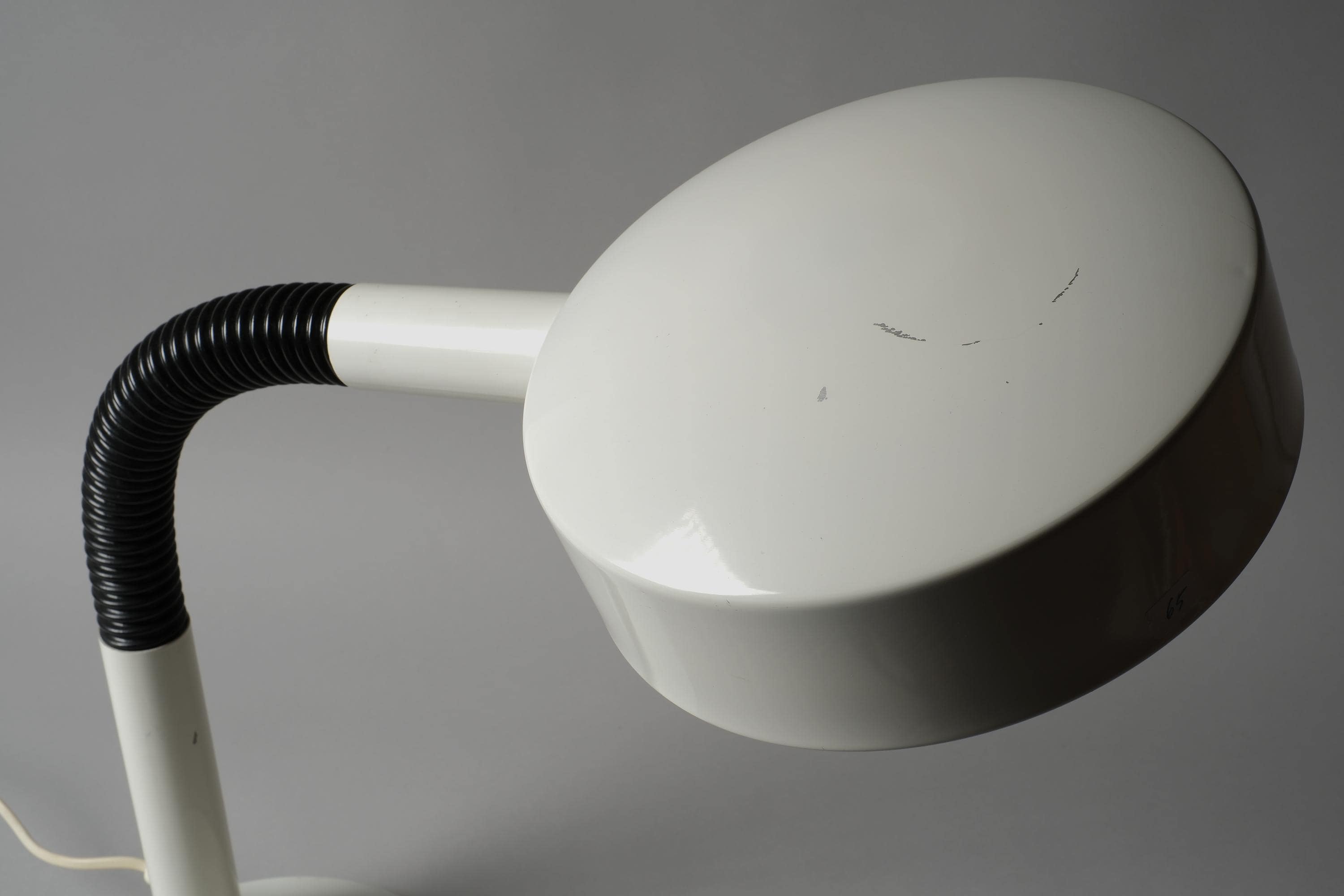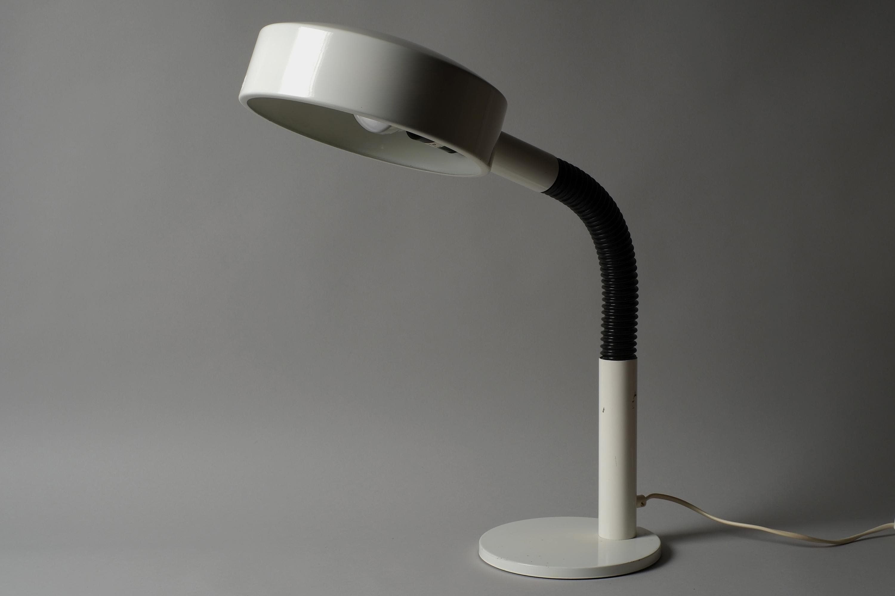 Vintage 1970s Hala Zeist gooseneck desk lamp in white lacquered metal, Netherlands. The classic design features a circular disc shade on a flexible black gooseneck arm rising from a white round weighted base, the height is adjustable between 50 and 65cm by repositioning the arm.