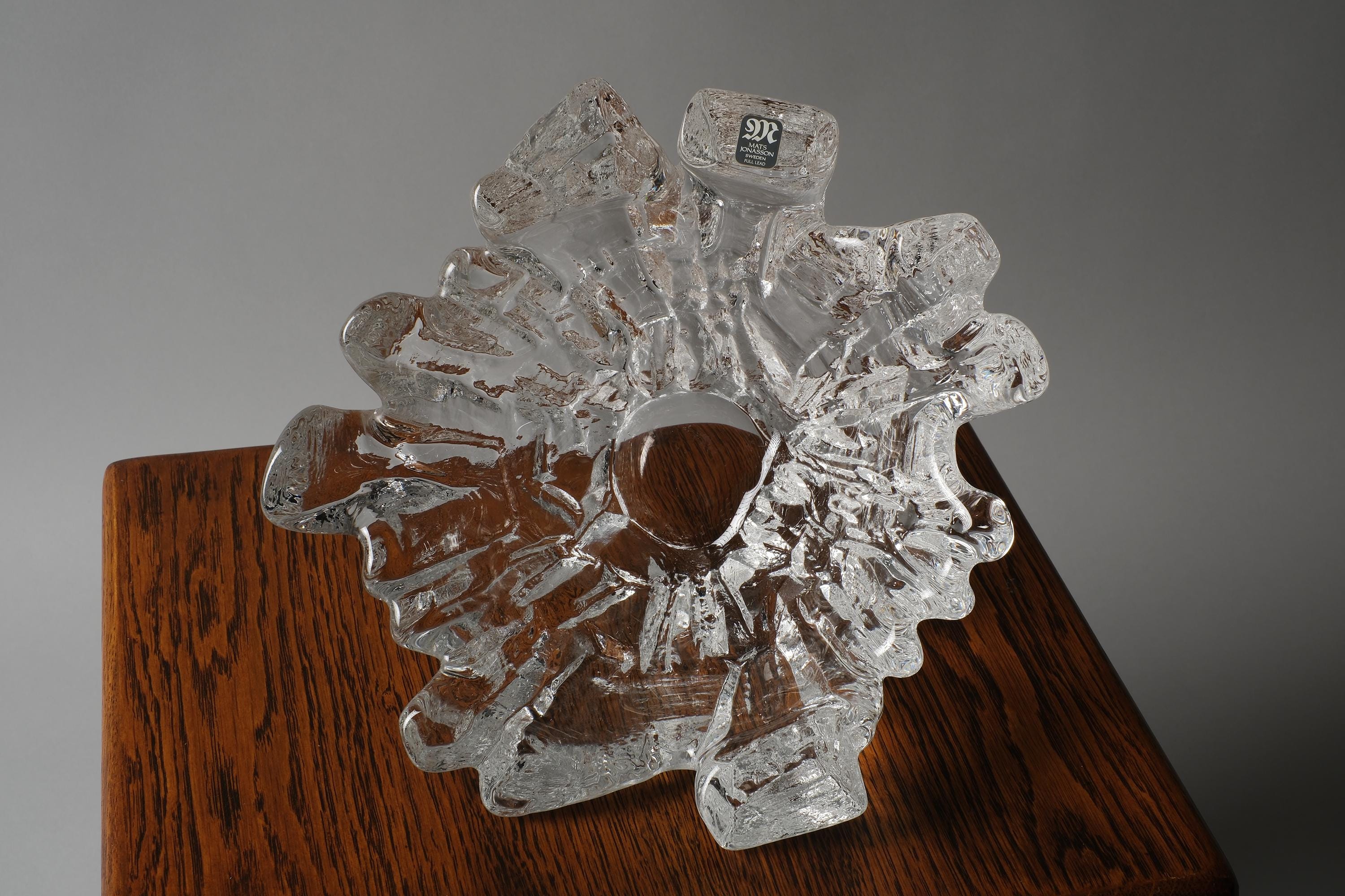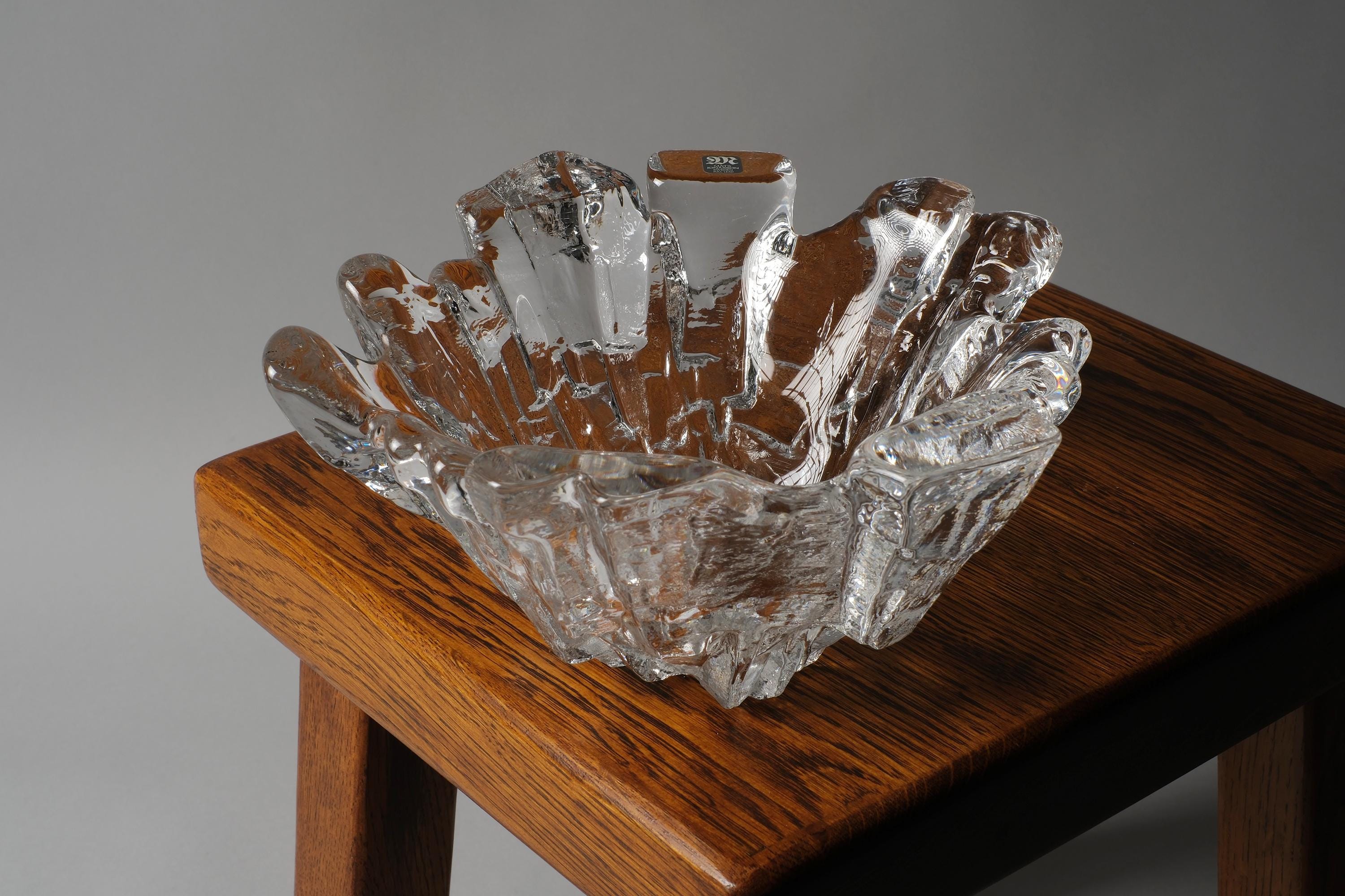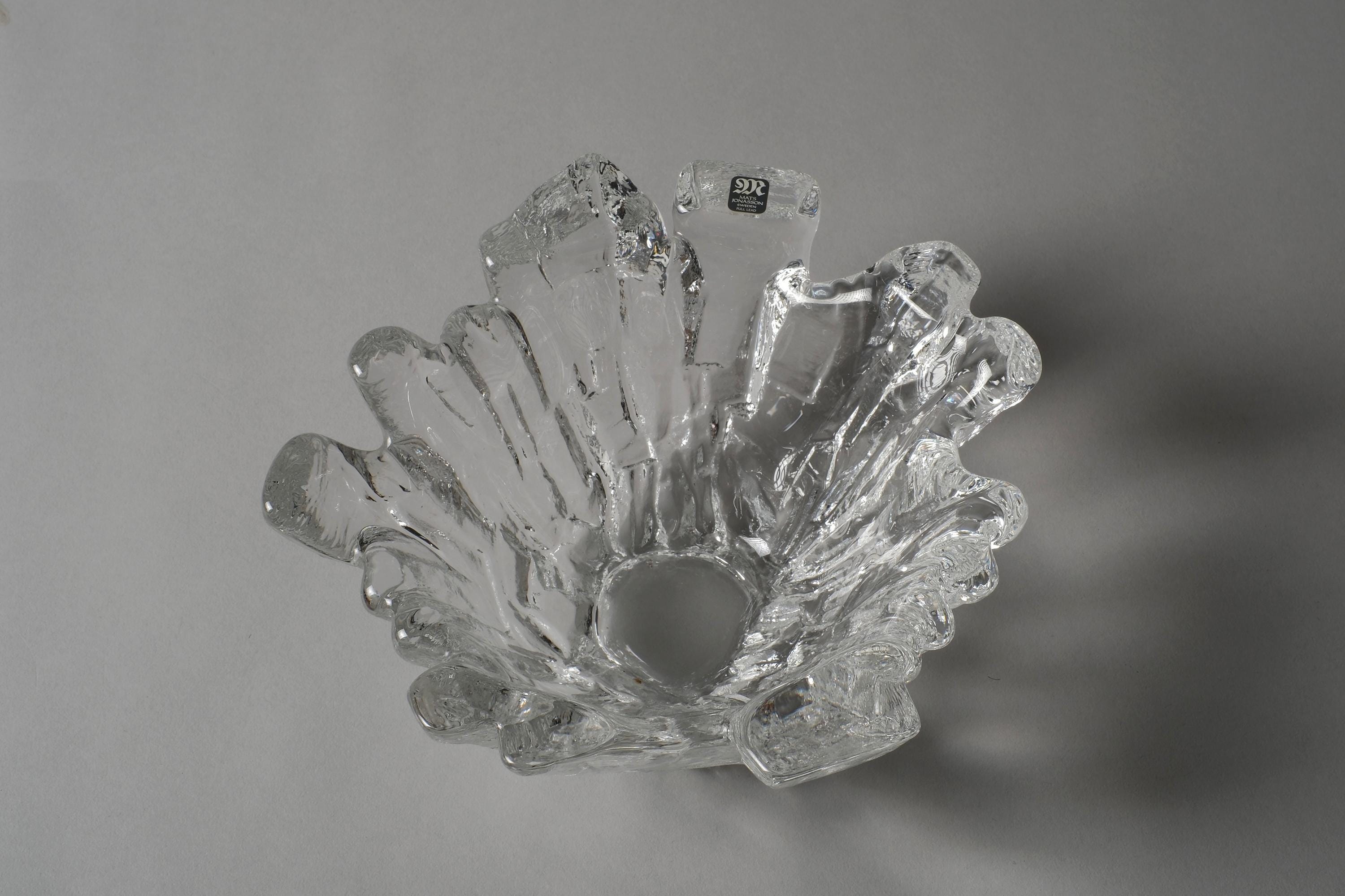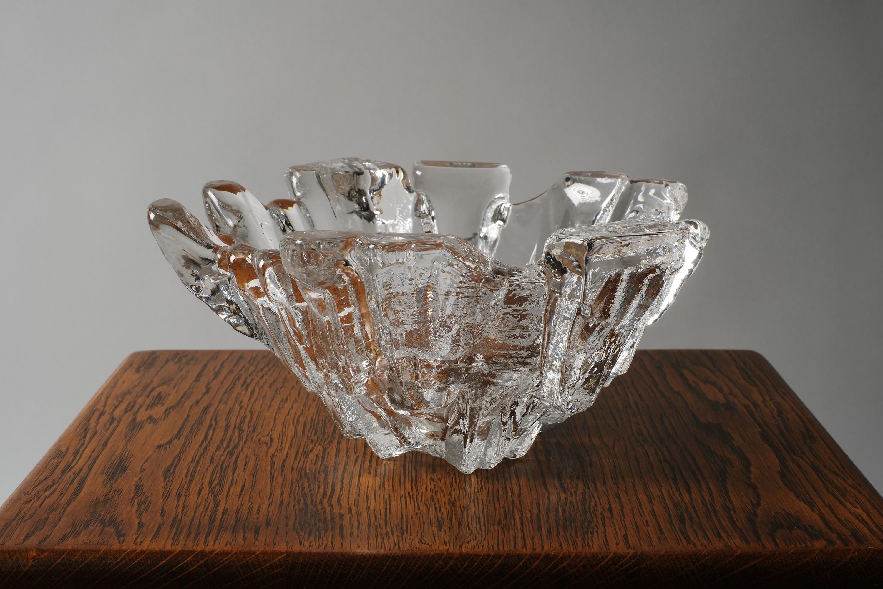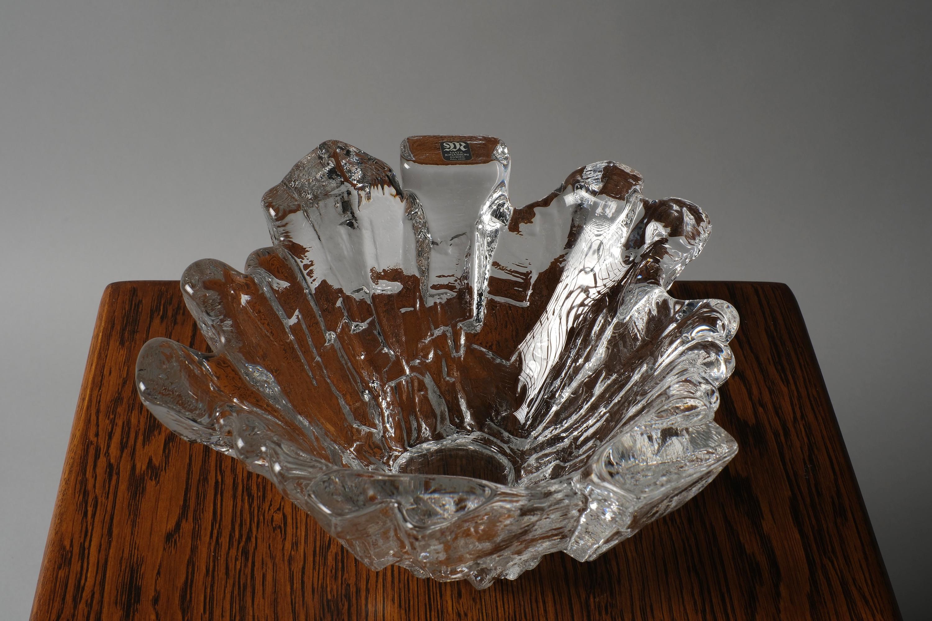 Vintage 1970s Maleras 'Isak' lead crystal bowl by Mats Jonasson, Sweden. The bowl features a wide form in clear crystal with a deeply textured ice surface, the irregular frozen formations catch light across any surface it sits on. Original label intact.