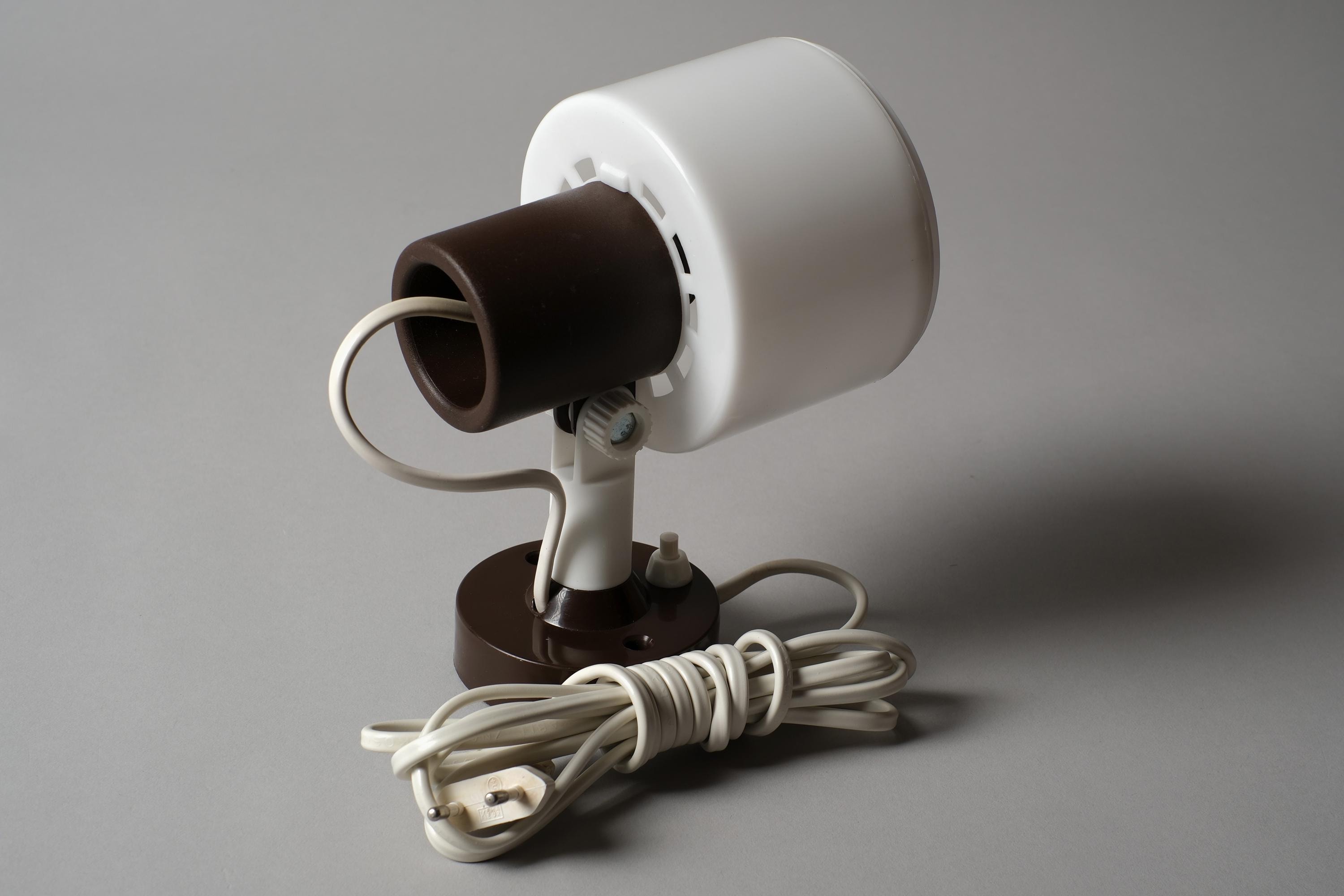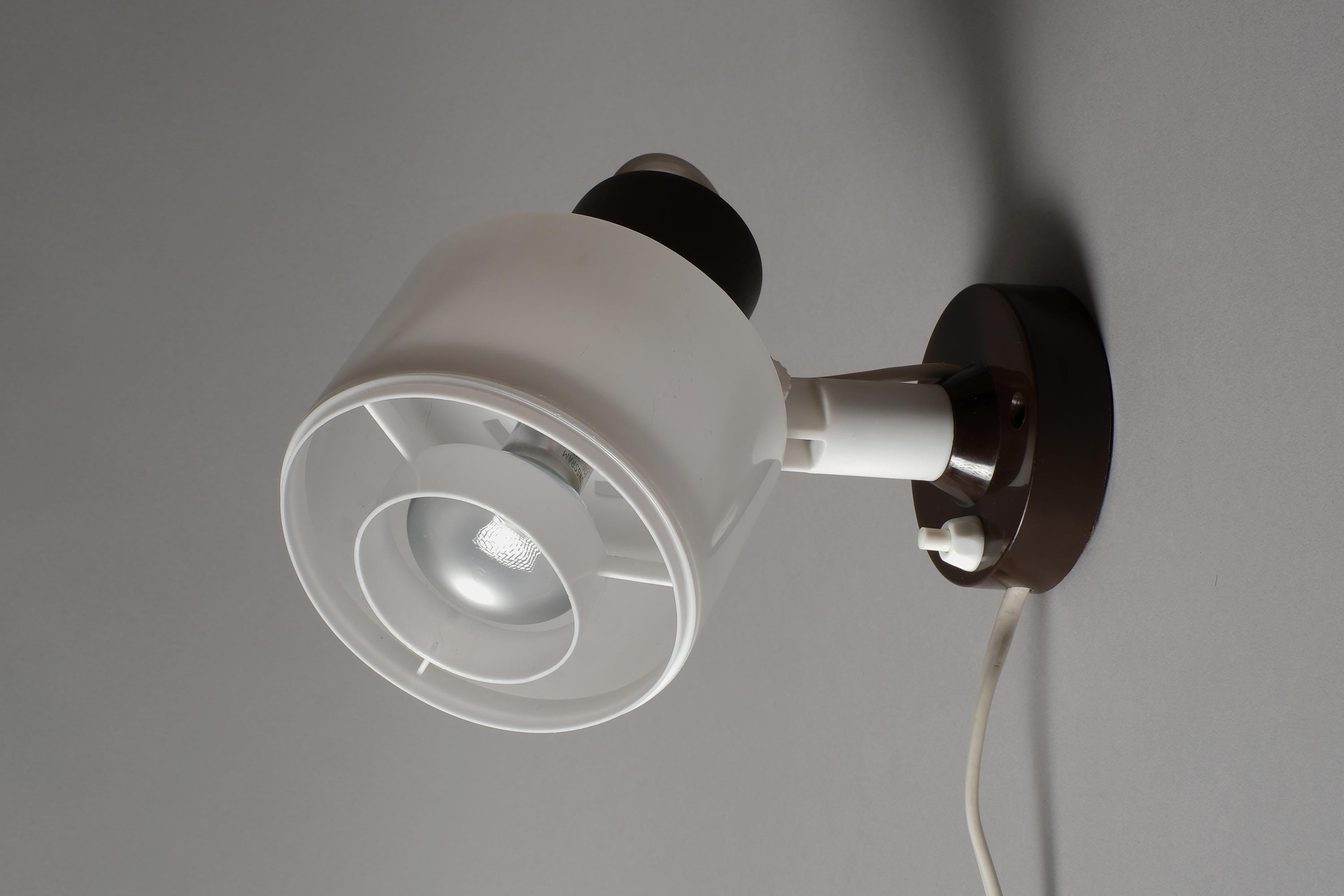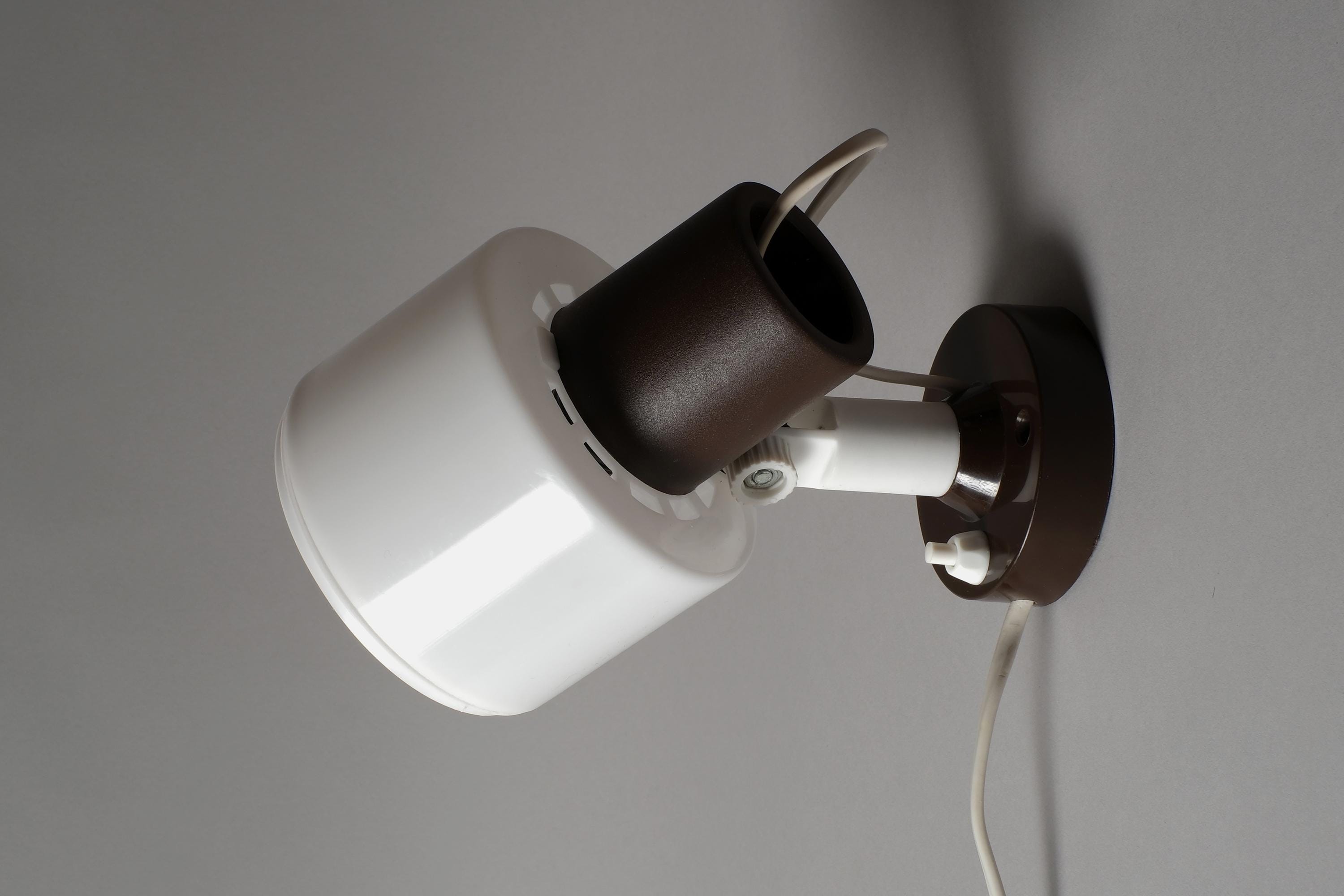 Vintage 1970s Elidus wall spot lamp in white plastic with a brown swivel mount. The cylindrical drum shade rotates on a pivoting bracket to give directional light controlled by repositioning the shade.