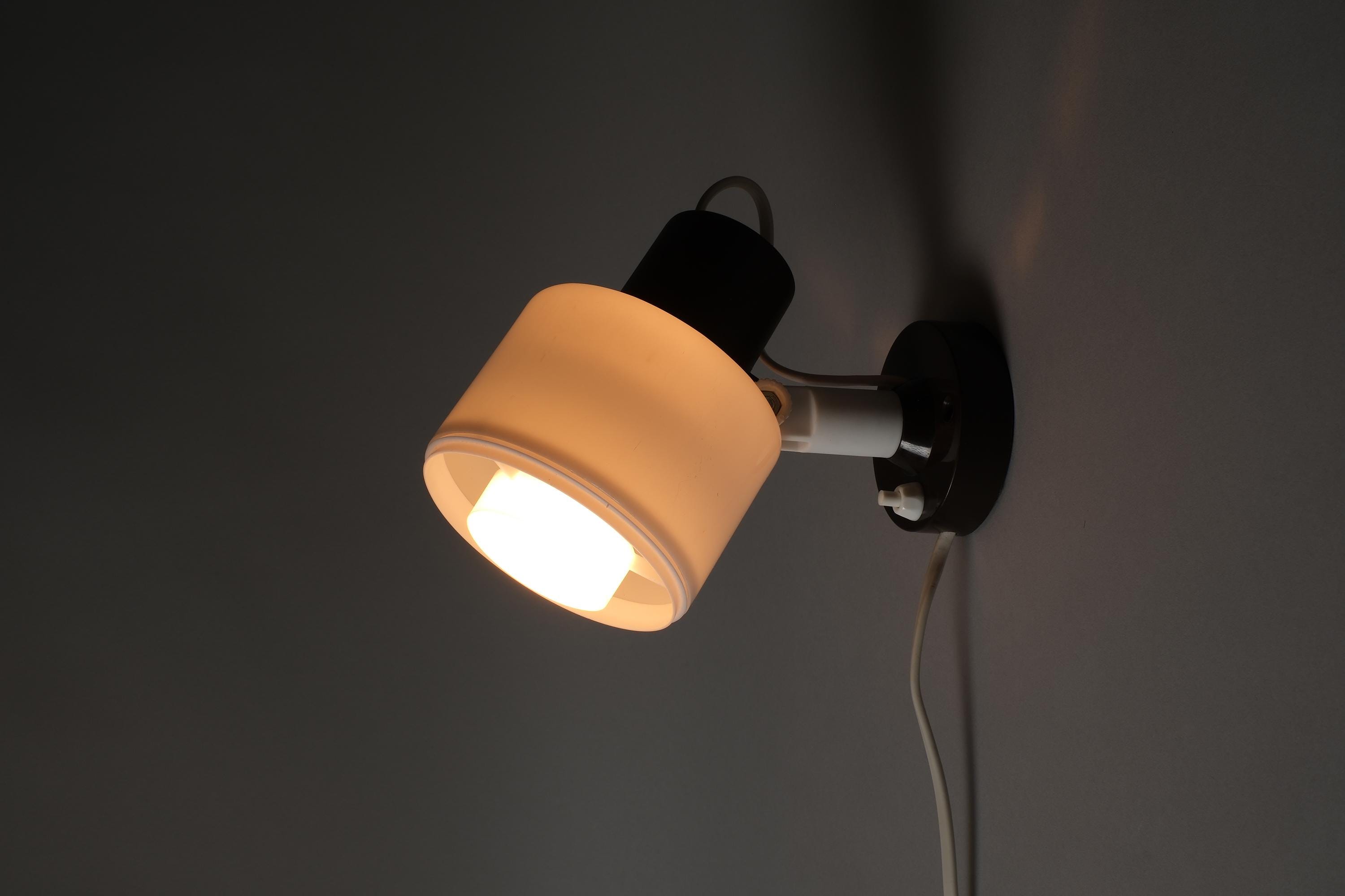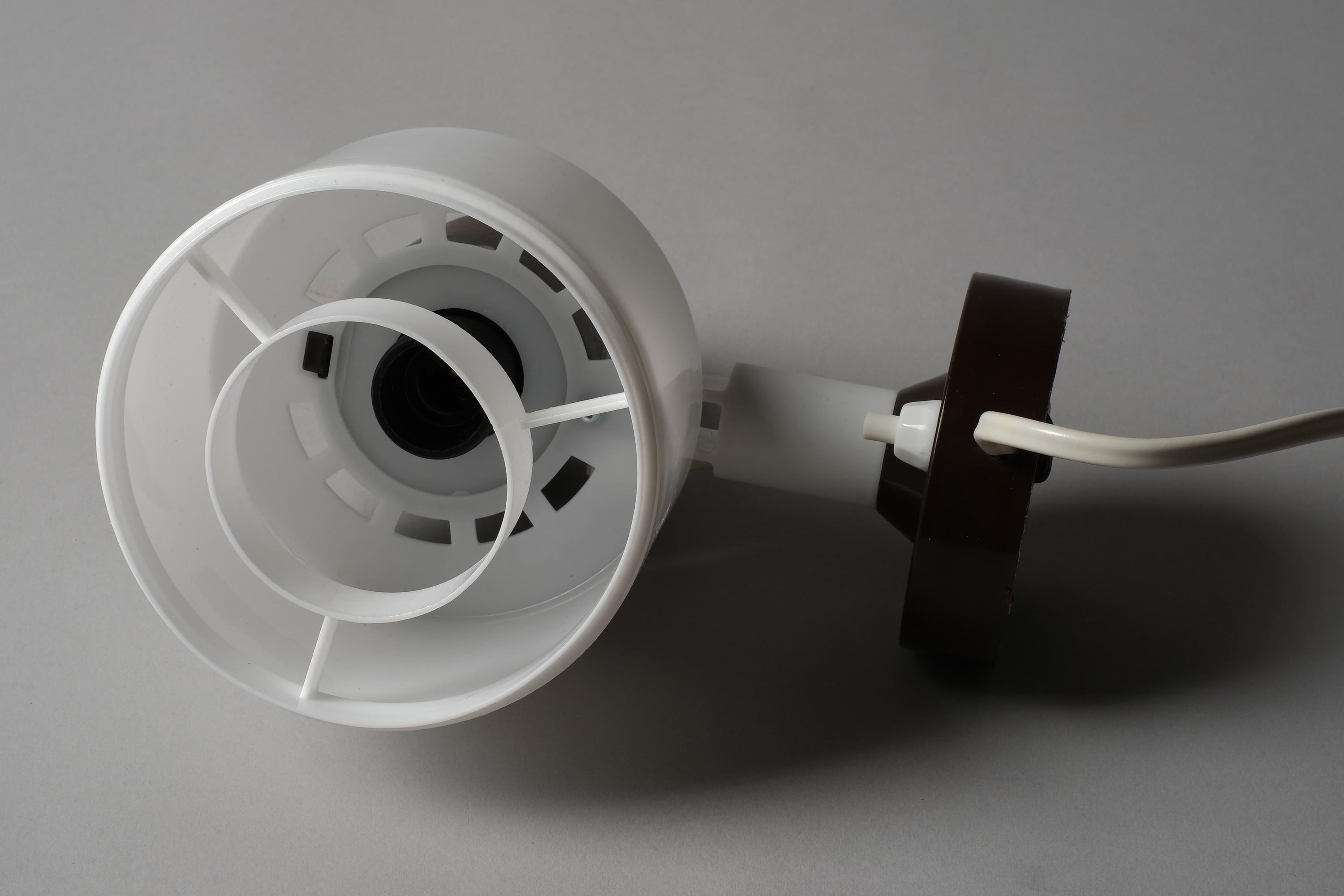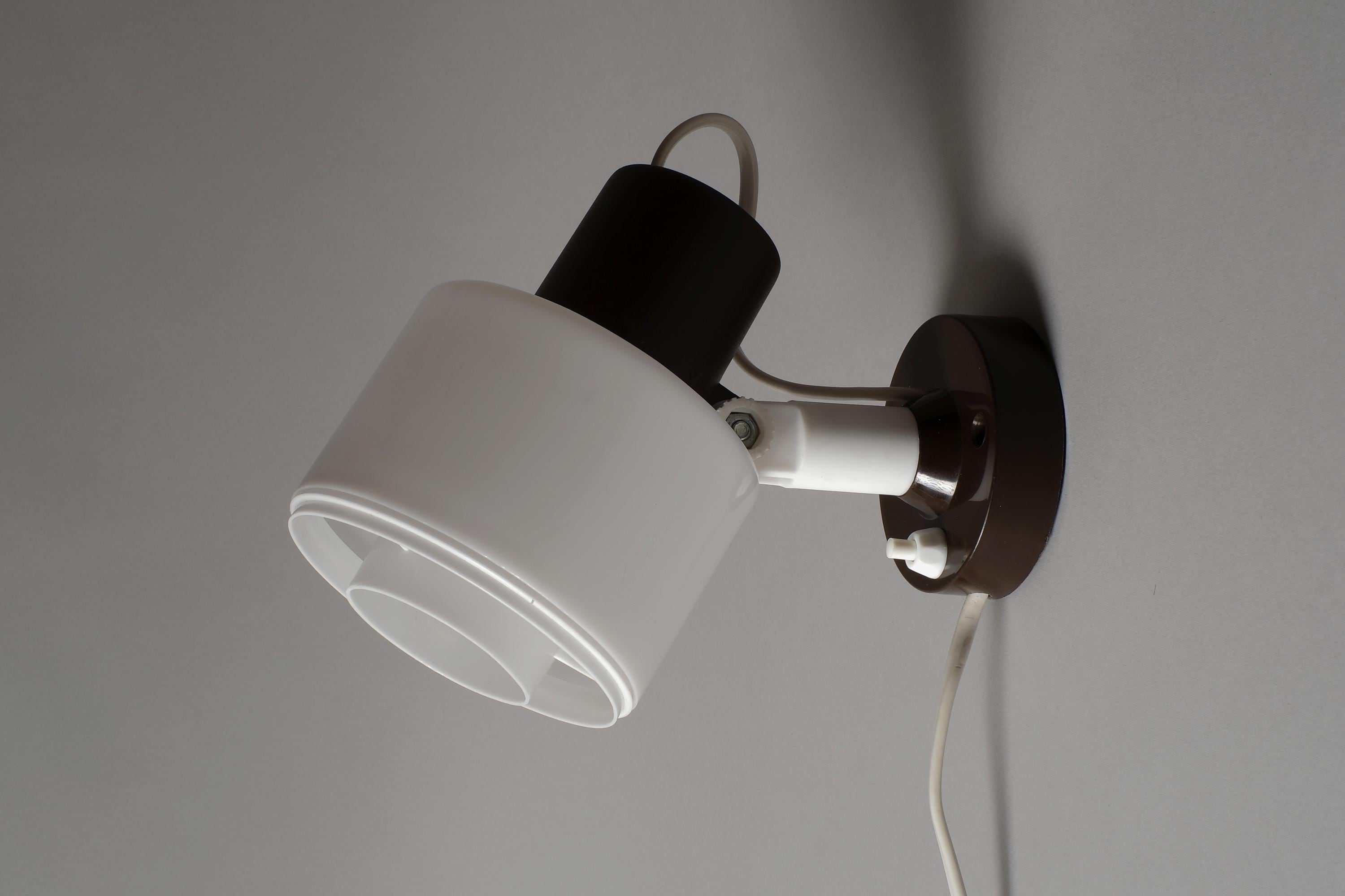 Vintage 1970s Elidus wall spot lamp in white plastic with a brown swivel mount. The cylindrical drum shade rotates on a pivoting bracket to give directional light controlled by repositioning the shade.