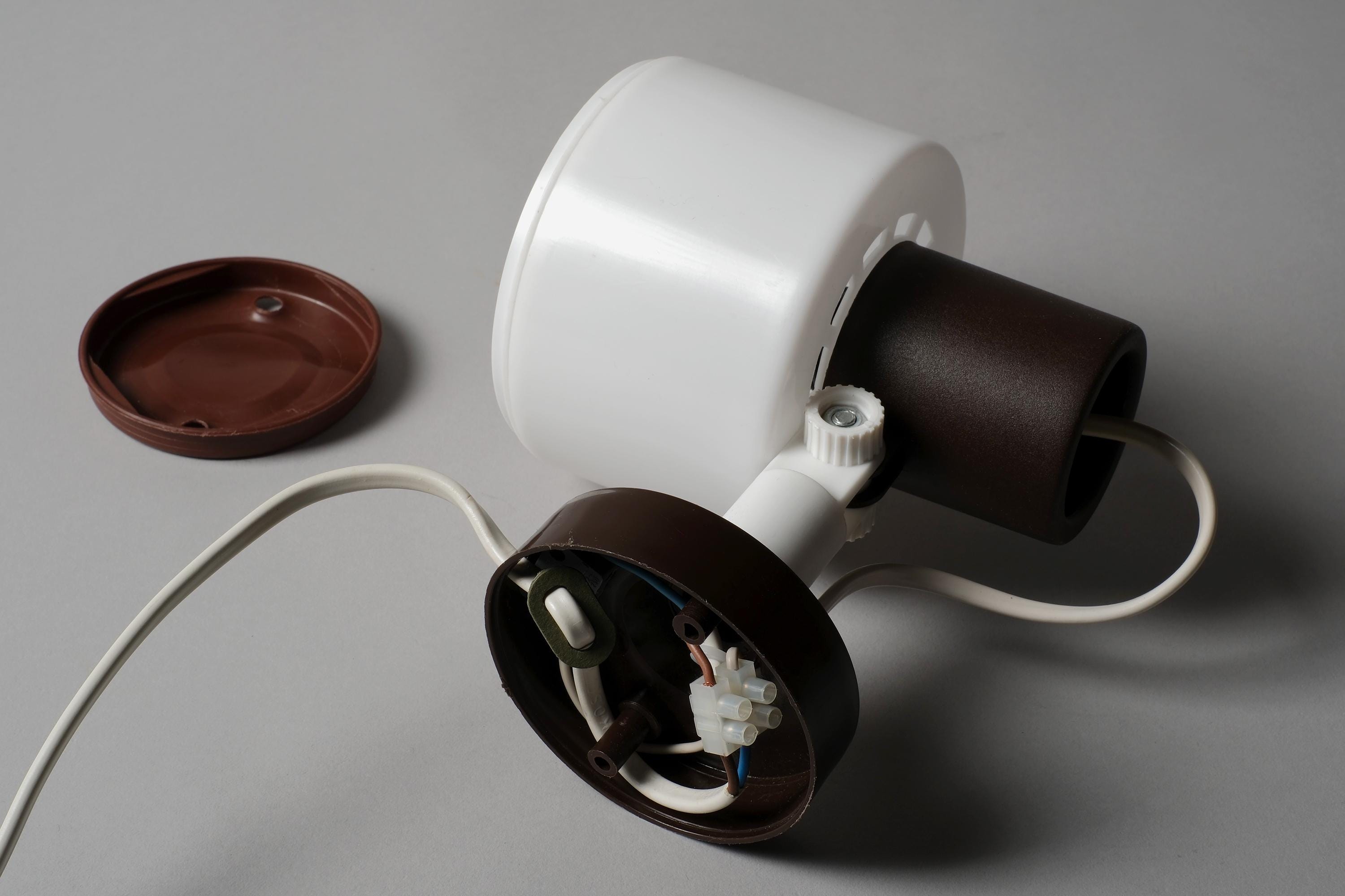 • Material: White plastic drum shade, brown plastic swivel mount.