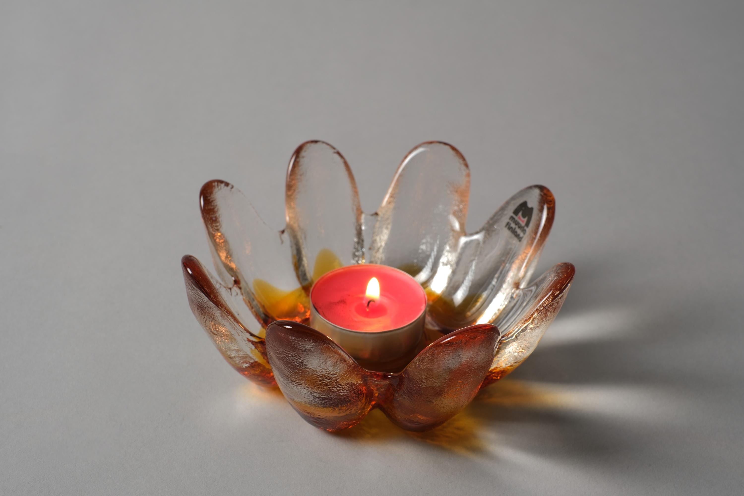 Vintage 1970s Muurla Tähti (Star) art glass votive candle holder by Juhani Ruuskanen, Finland. The flower-form in clear and amber art glass, the petal-shaped lobes radiate from a warm amber centre, the whole object transforms when a tealight is placed inside: the amber glass pools the light, the clear petals catch and scatter it.