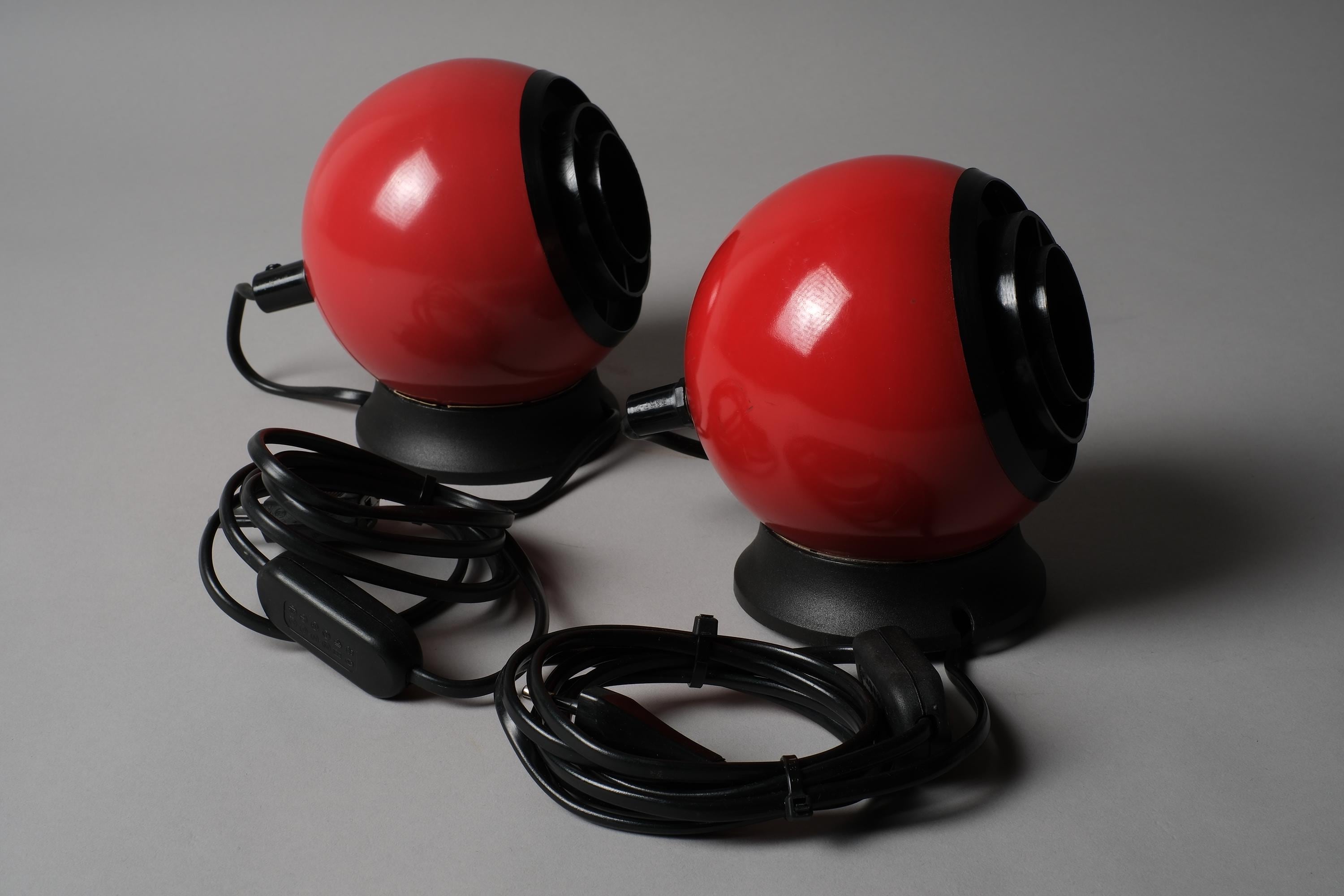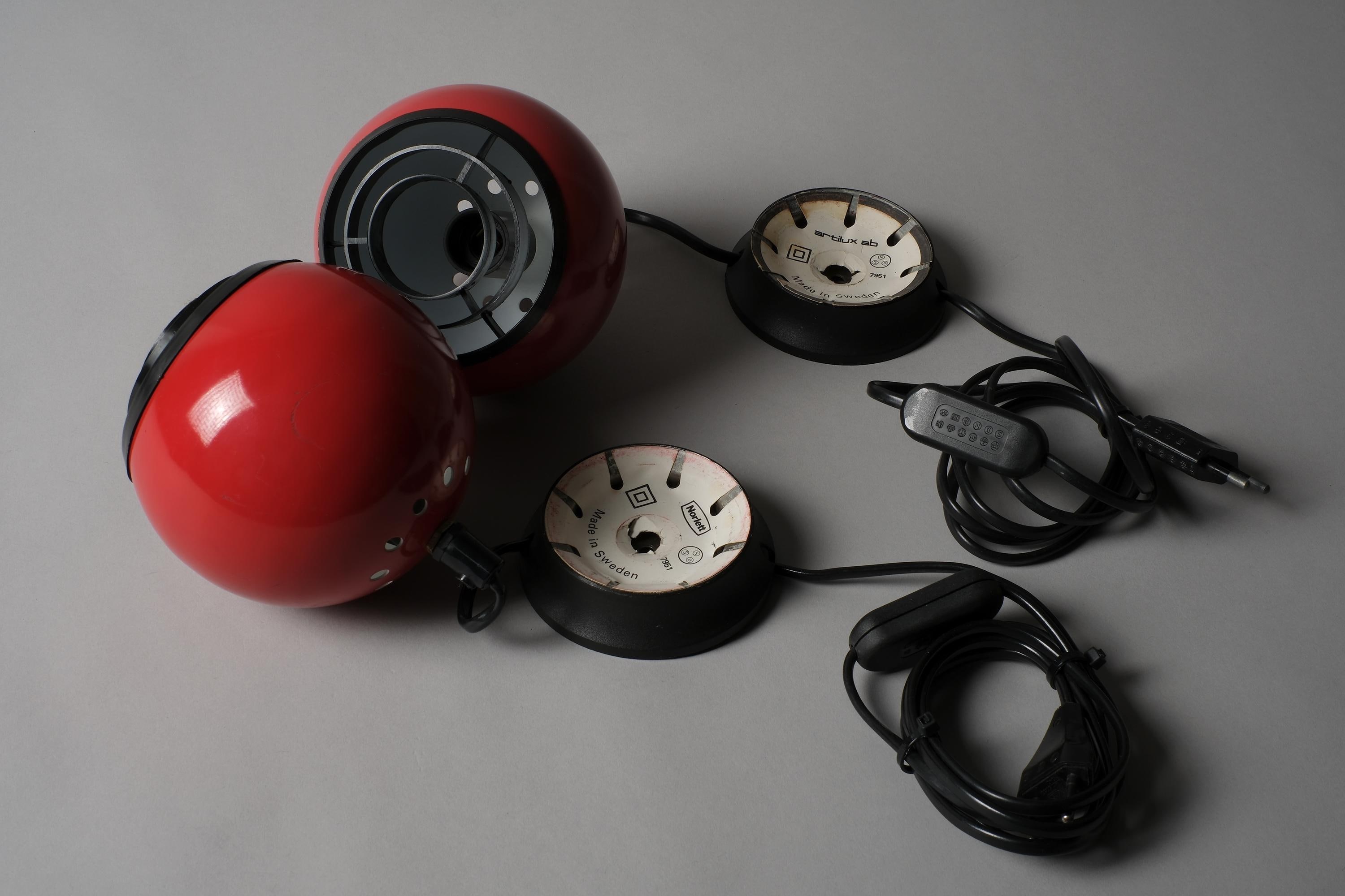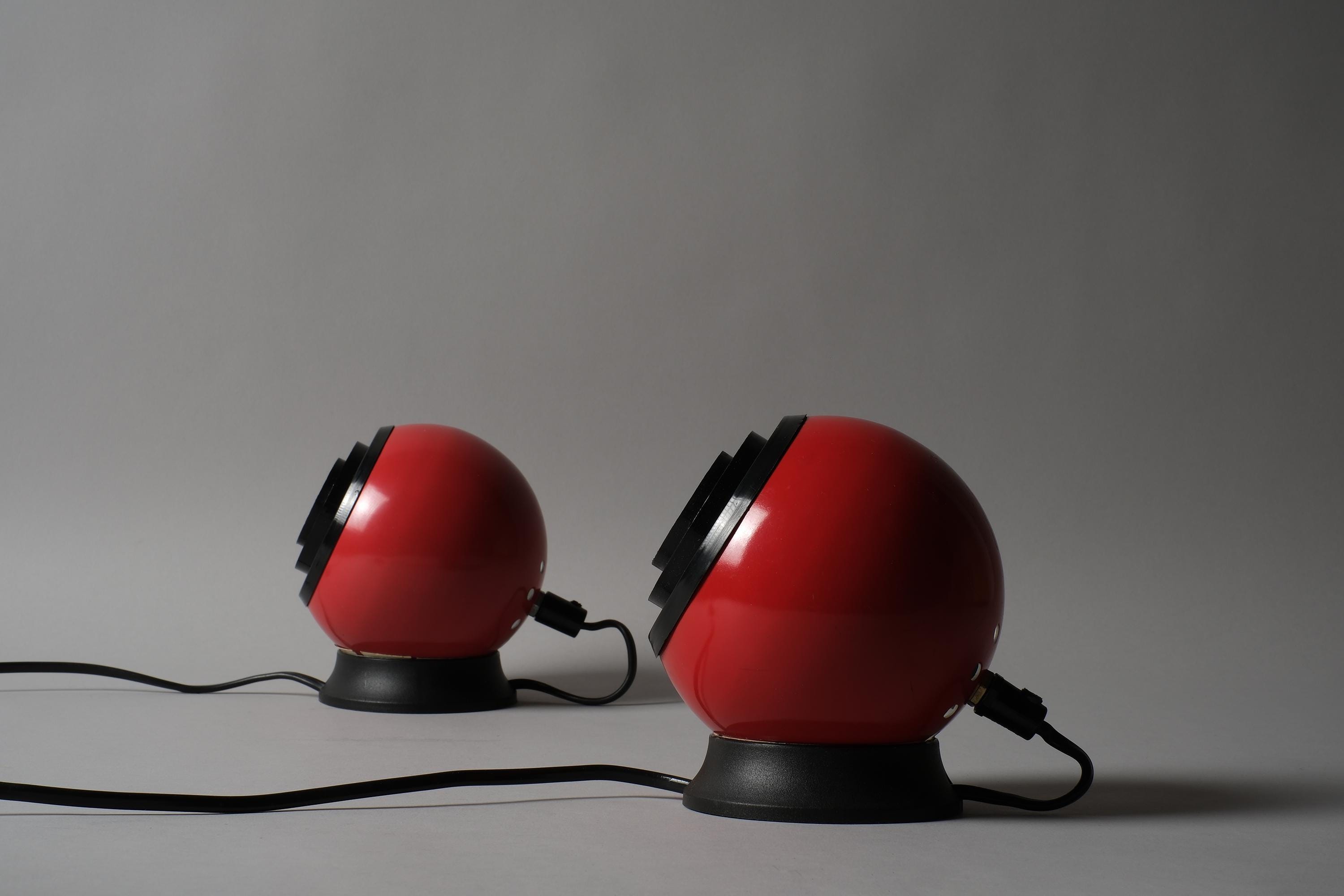 Pair of red lacquered metal magnetic ball lamps, one Artilux AB, Sweden, one Norlett, Norway, 1970s Space Age design. Each lamp consists of a red lacquered metal sphere mounted on a magnetic black plastic base, the ball tilting and rotating freely in any direction on the magnet, functioning as a desk lamp, table lamp or wall-mounted spot. E14 fitting. Excellent condition with normal signs of age. Both fully functional.