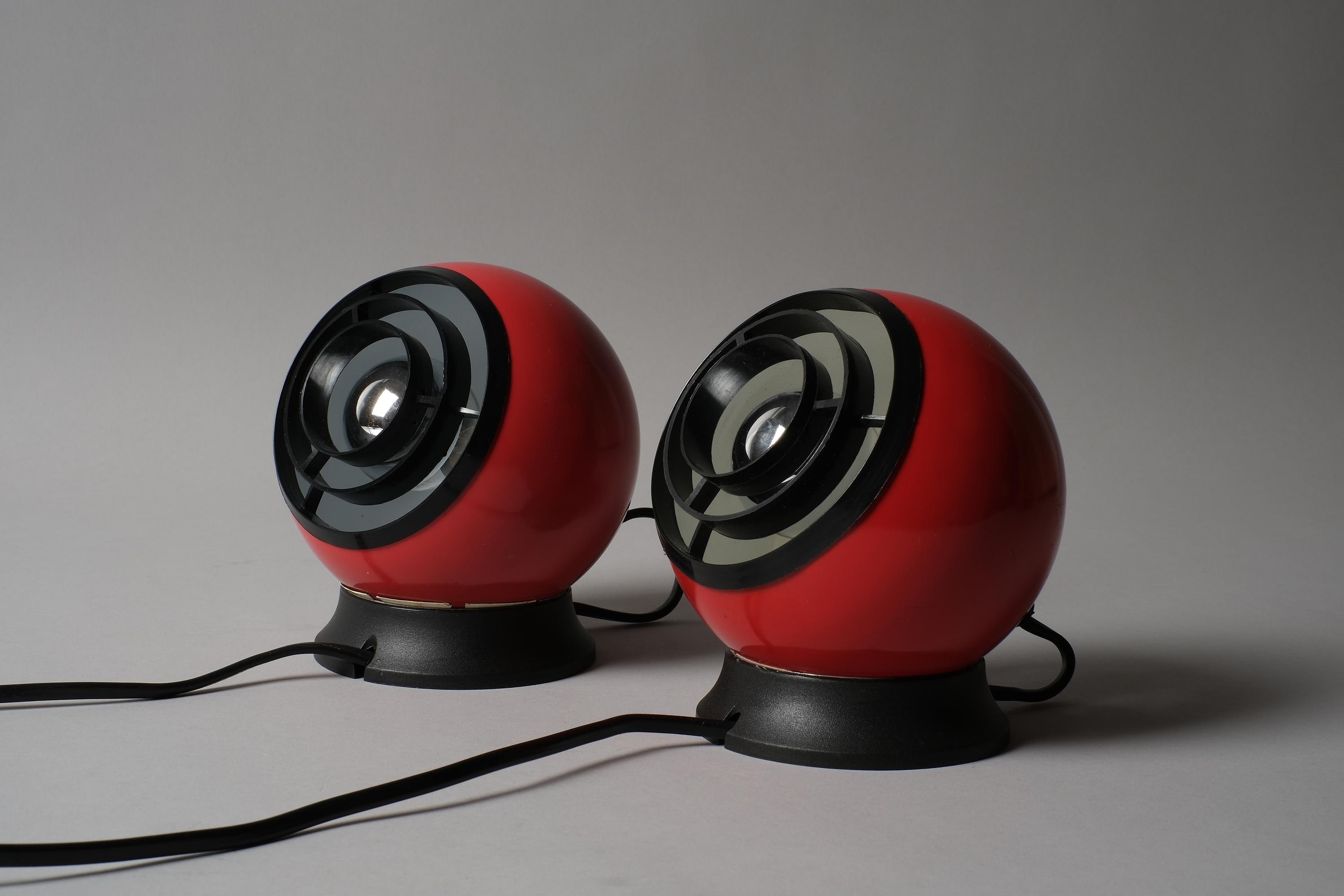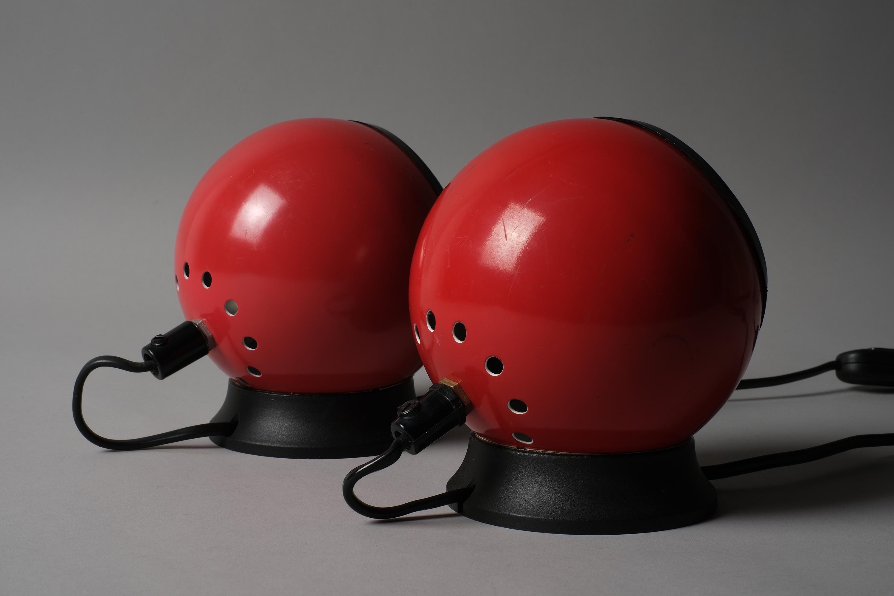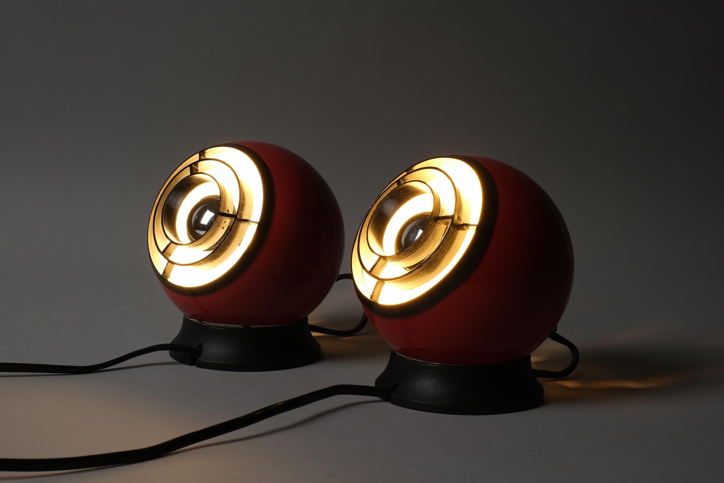 Pair of red lacquered metal magnetic ball lamps, one Artilux AB, Sweden, one Norlett, Norway, 1970s Space Age design. Each lamp consists of a red lacquered metal sphere mounted on a magnetic black plastic base, the ball tilting and rotating freely in any direction on the magnet, functioning as a desk lamp, table lamp or wall-mounted spot. E14 fitting. Excellent condition with normal signs of age. Both fully functional.