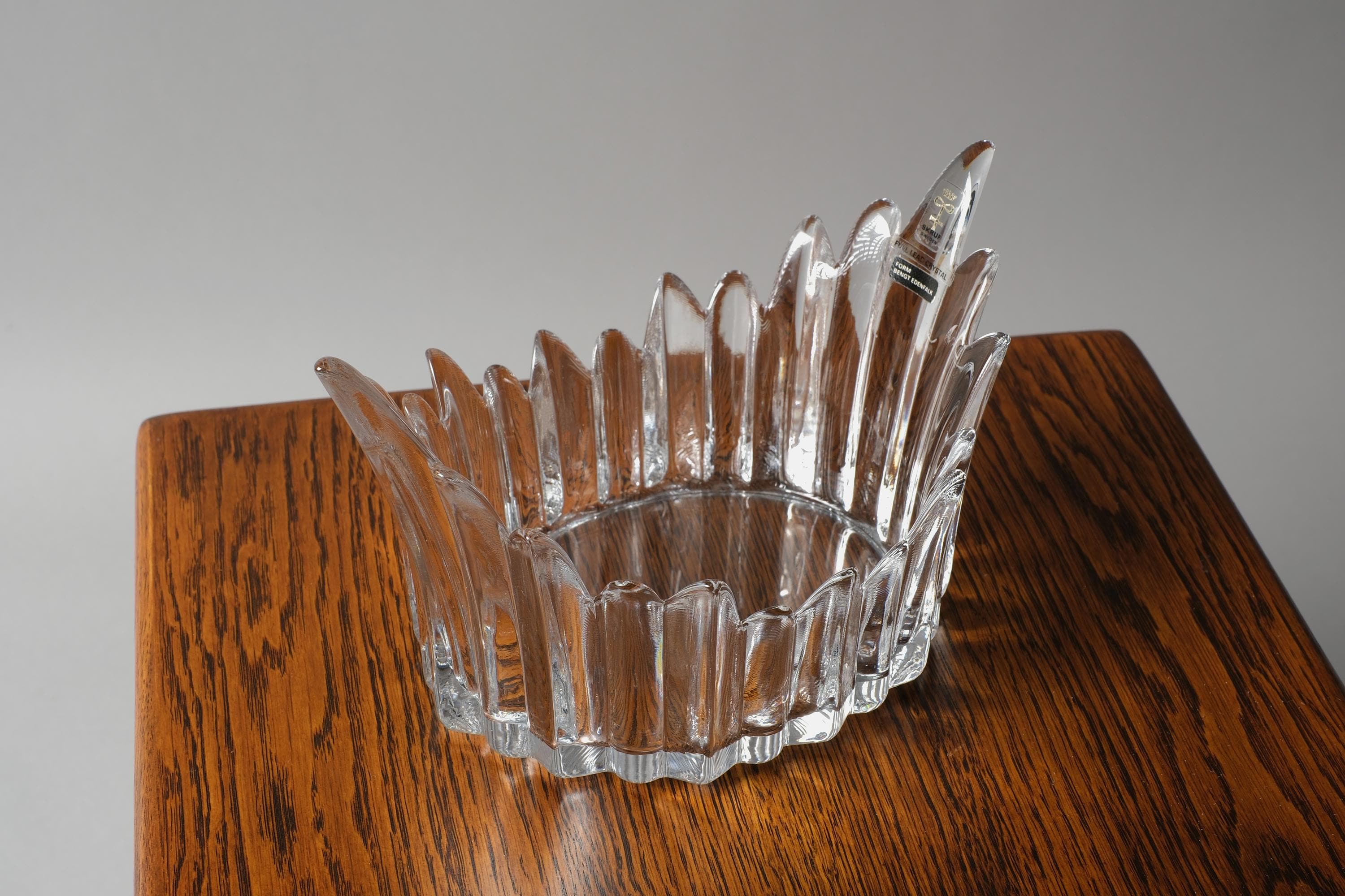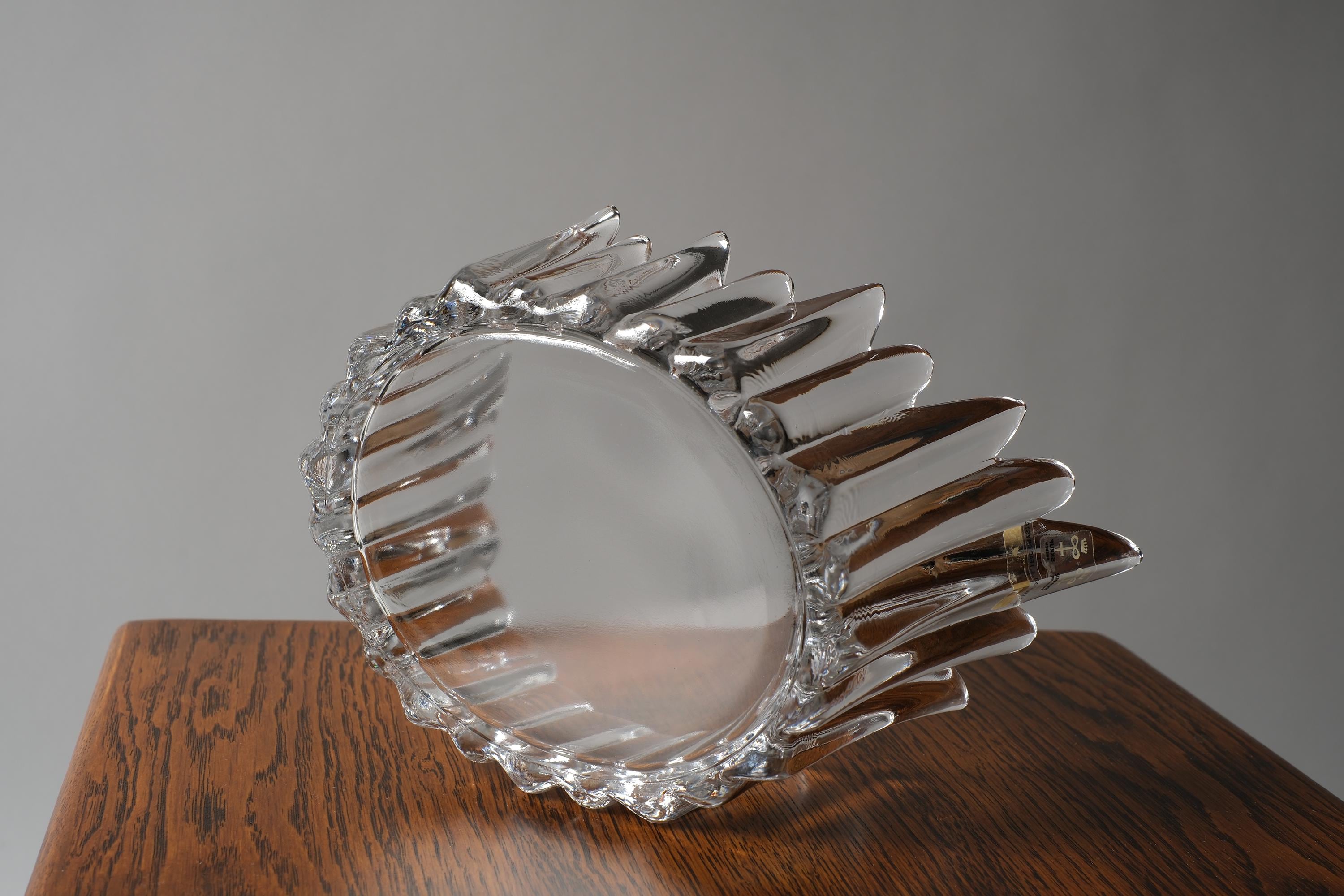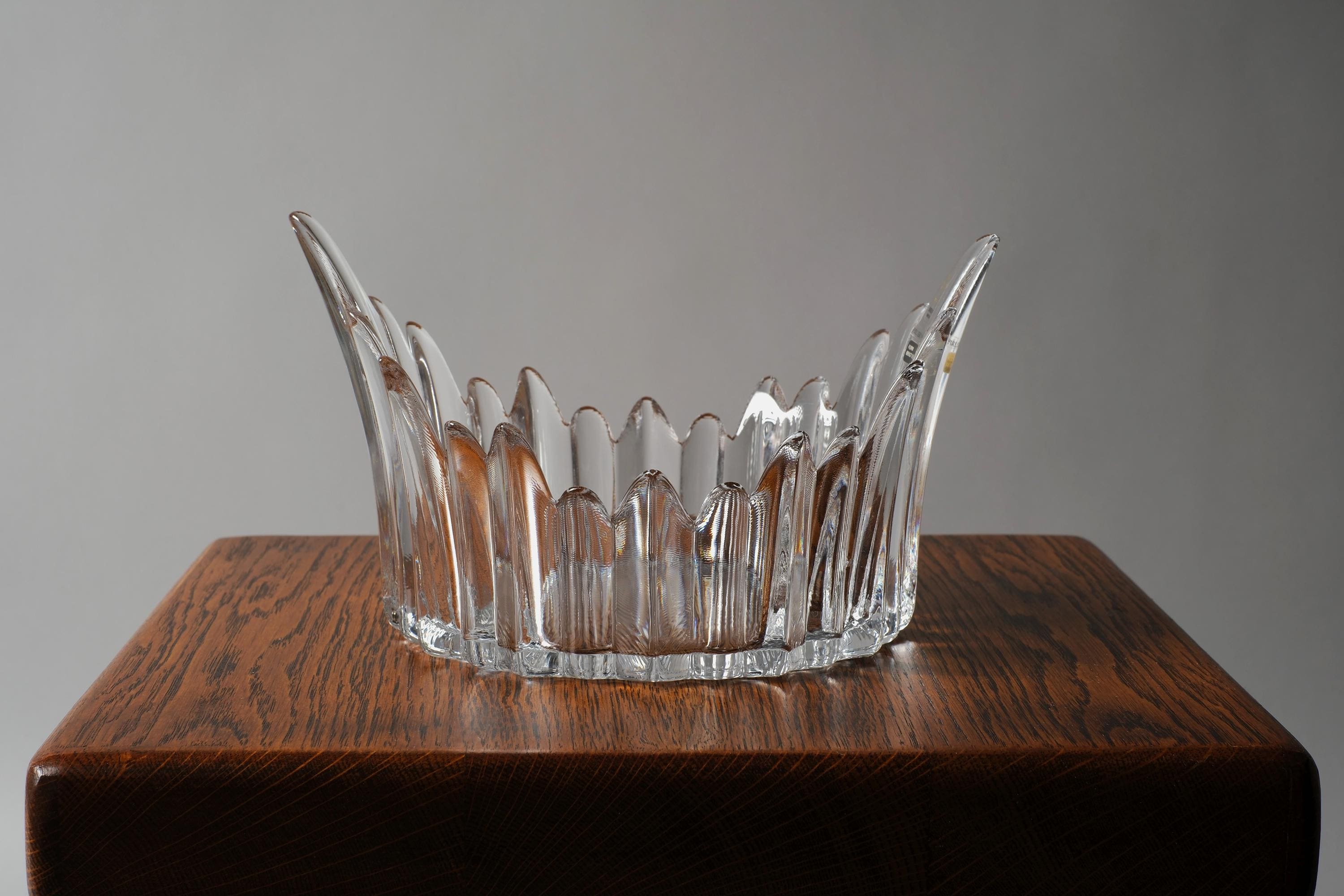 Vintage 1970s Skruf Glasbruk Crown crystal vessel by Bengt Edenfalk, Sweden. Oval bowl form in clear lead crystal with upward-pointing spike formations rising from the rim, each spike faceted and tapering to a fine point. The bowl catches light with the precision of cut ice. Excellent condition, no chips or cracks. Original stickers present.