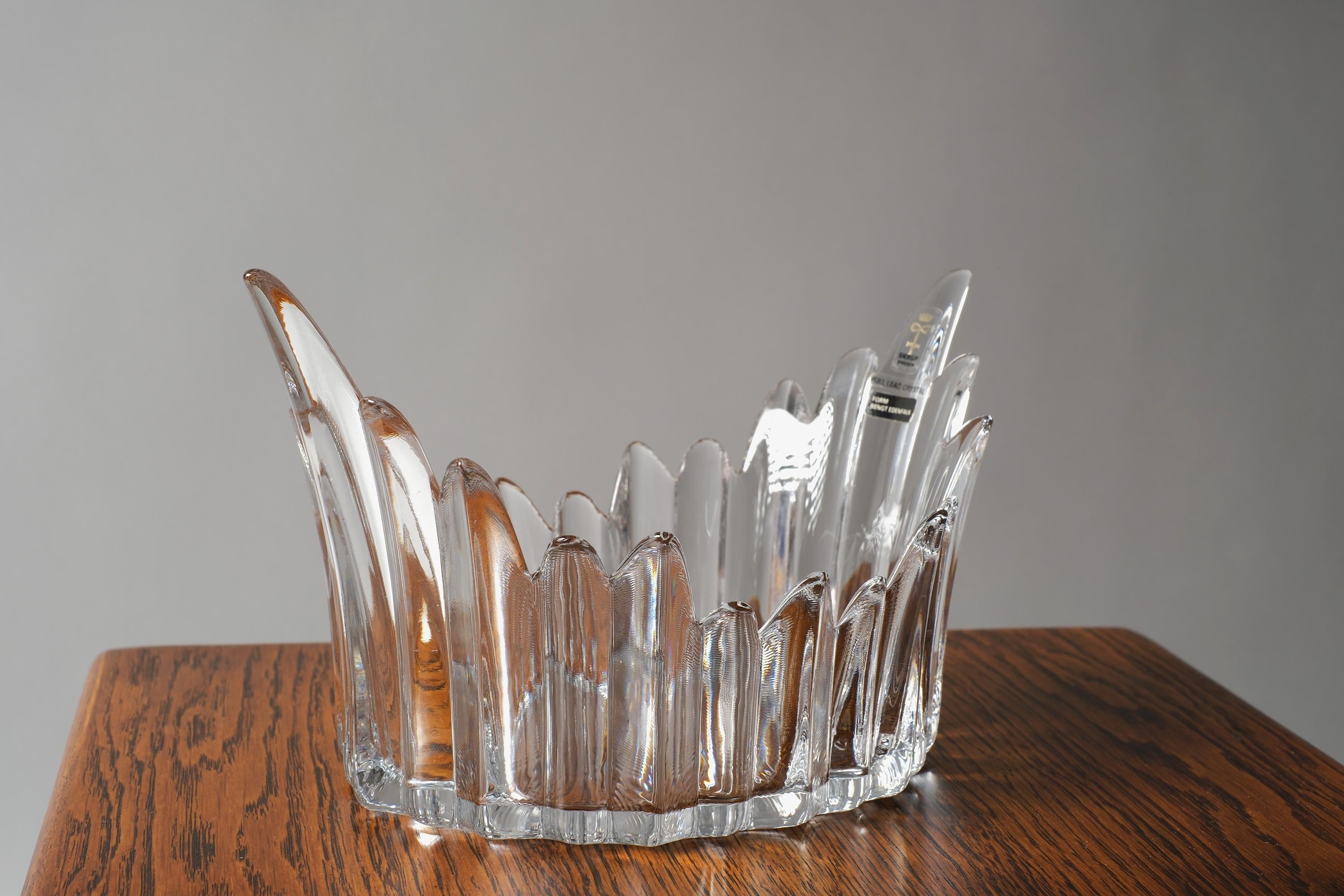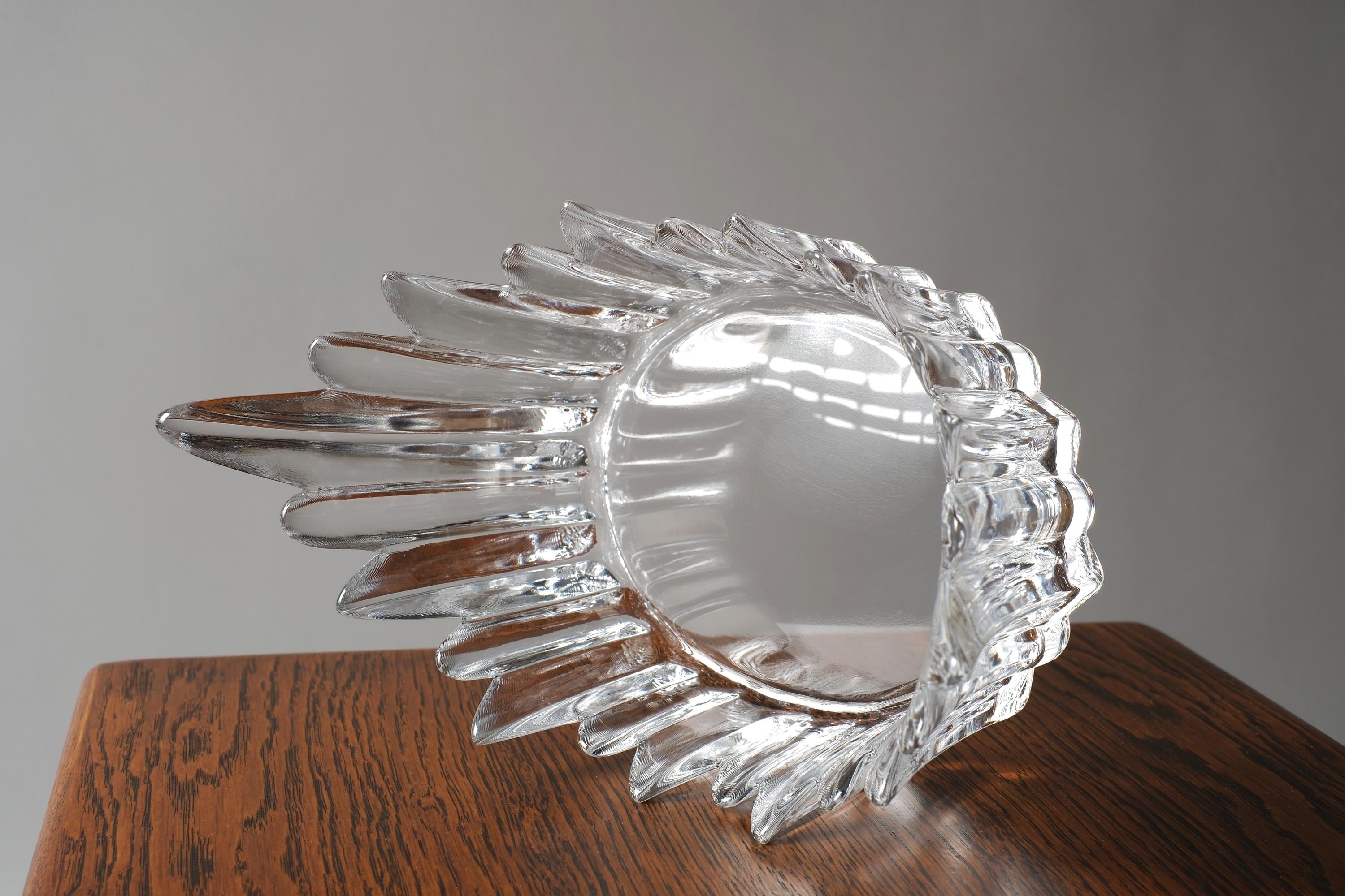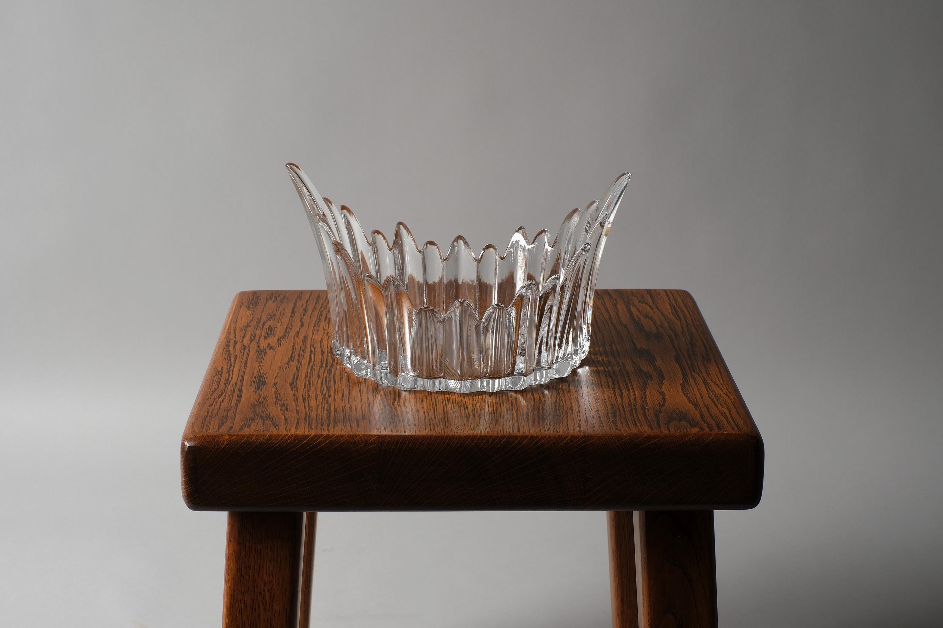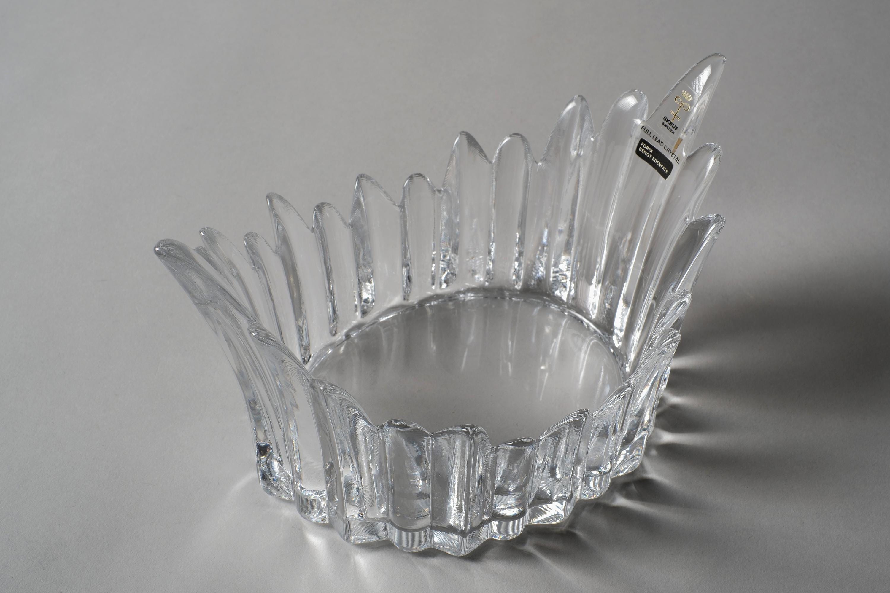 Vintage 1970s Skruf Glasbruk Crown crystal vessel by Bengt Edenfalk, Sweden. Oval bowl form in clear lead crystal with upward-pointing spike formations rising from the rim, each spike faceted and tapering to a fine point. The bowl catches light with the precision of cut ice. Excellent condition, no chips or cracks. Original stickers present.