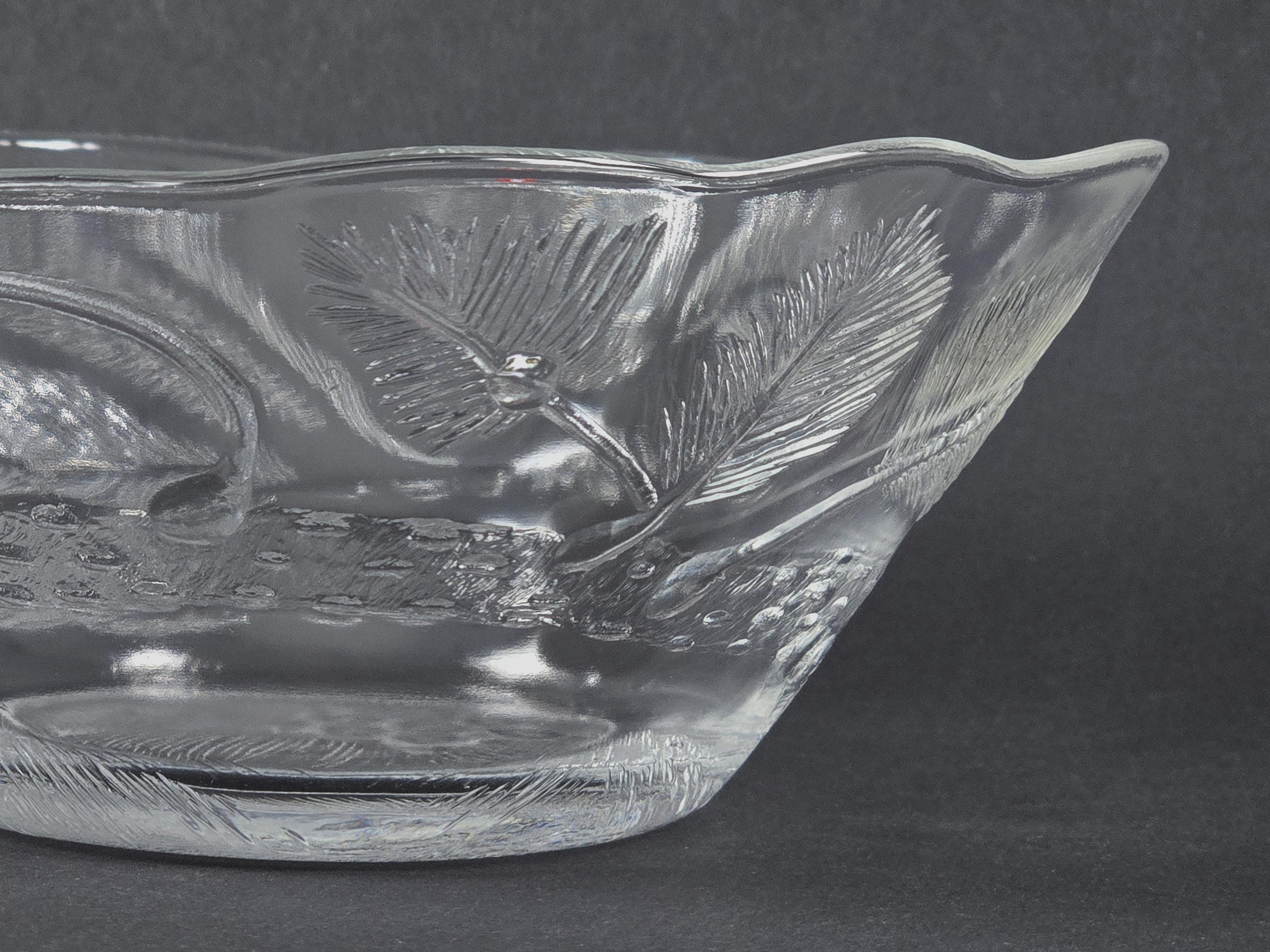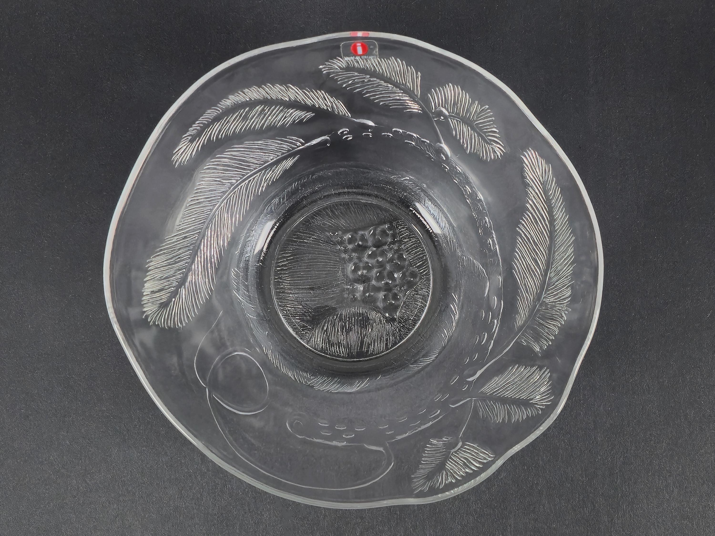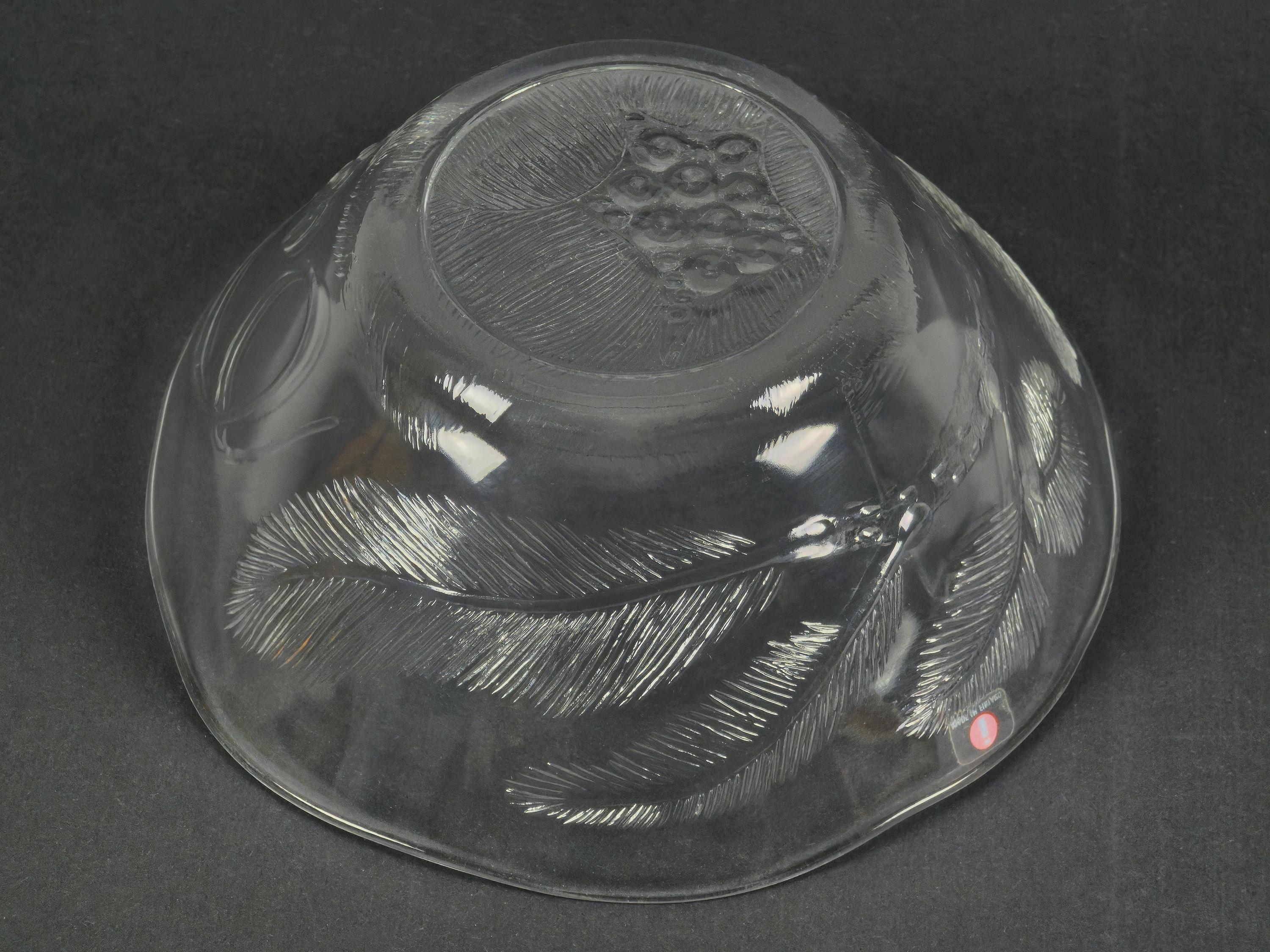 Vintage 1970s Iittala Pioni (Peony) glass bowl by Oiva Toikka, Finland. A wide shallow bowl in clear glass with moulded botanical relief decoration of peony flowers and foliage on the exterior surface, the interior is smooth and polished, the form is open and quietly elegant.