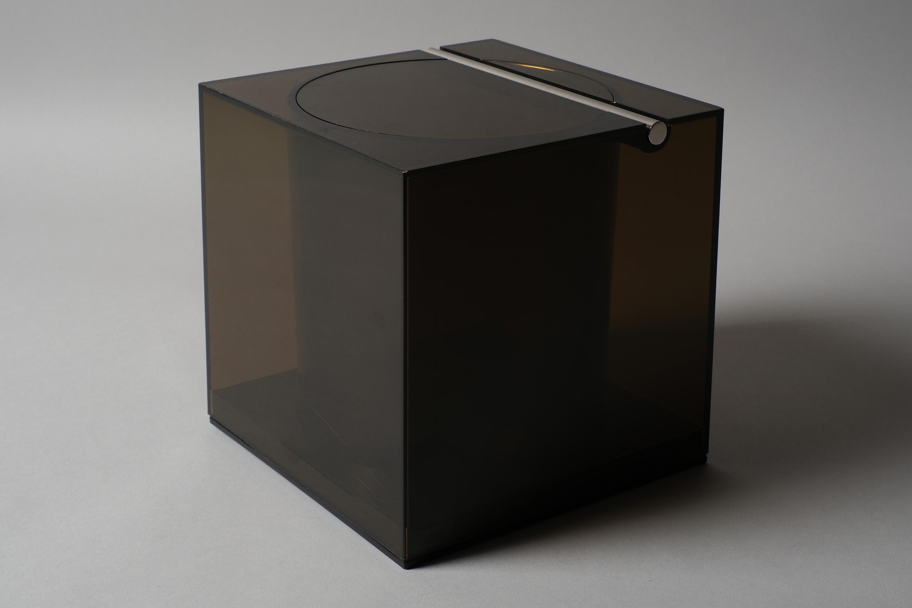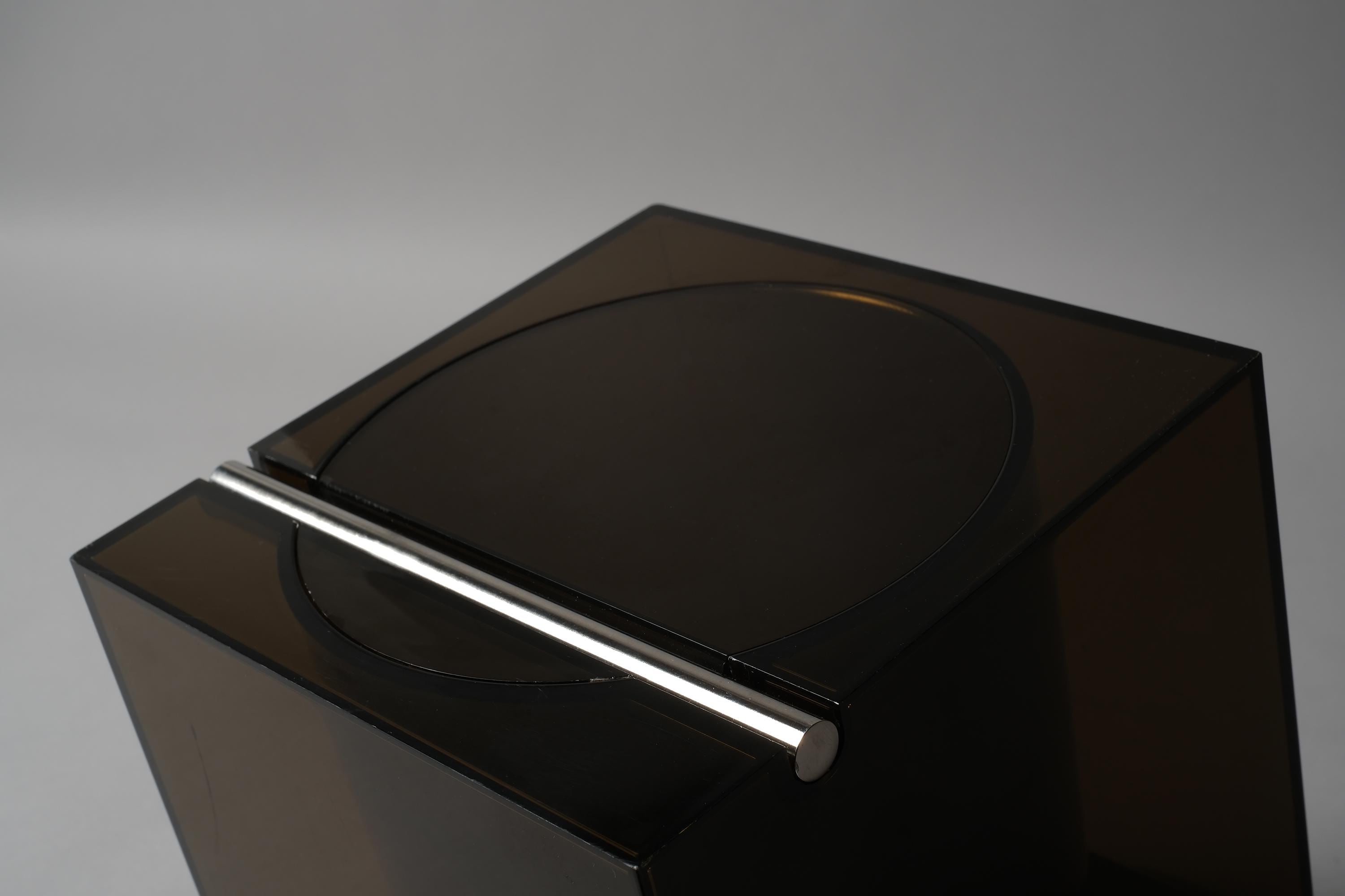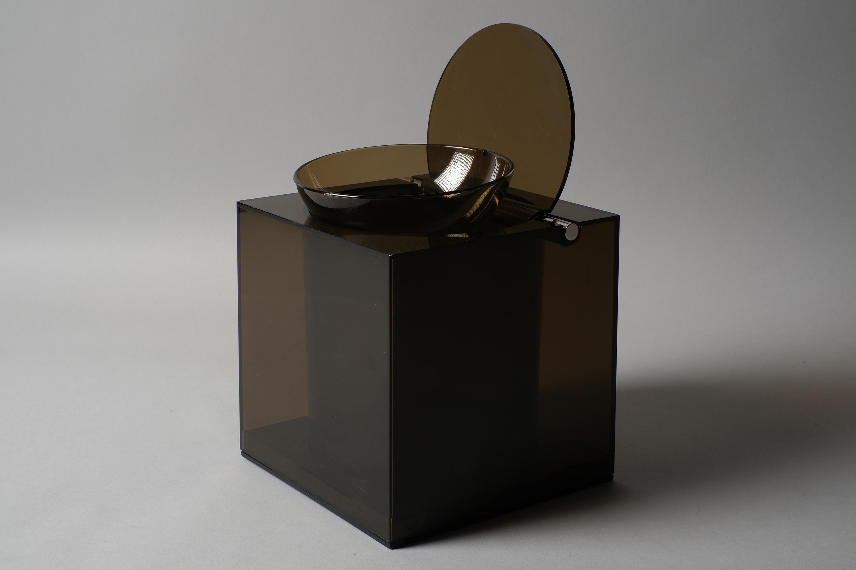 Vintage 1970s Cini & Nils ice bucket by Studio O.P.I. Milano, Franco Bettonica and Mario Melocchi. The ice bucket is highly collectible and a serious design object with it's cubic form in smoked brown acrylic with a circular flip-top lid on a stainless steel hinge, the whole object is a minimal sculptural block when closed.