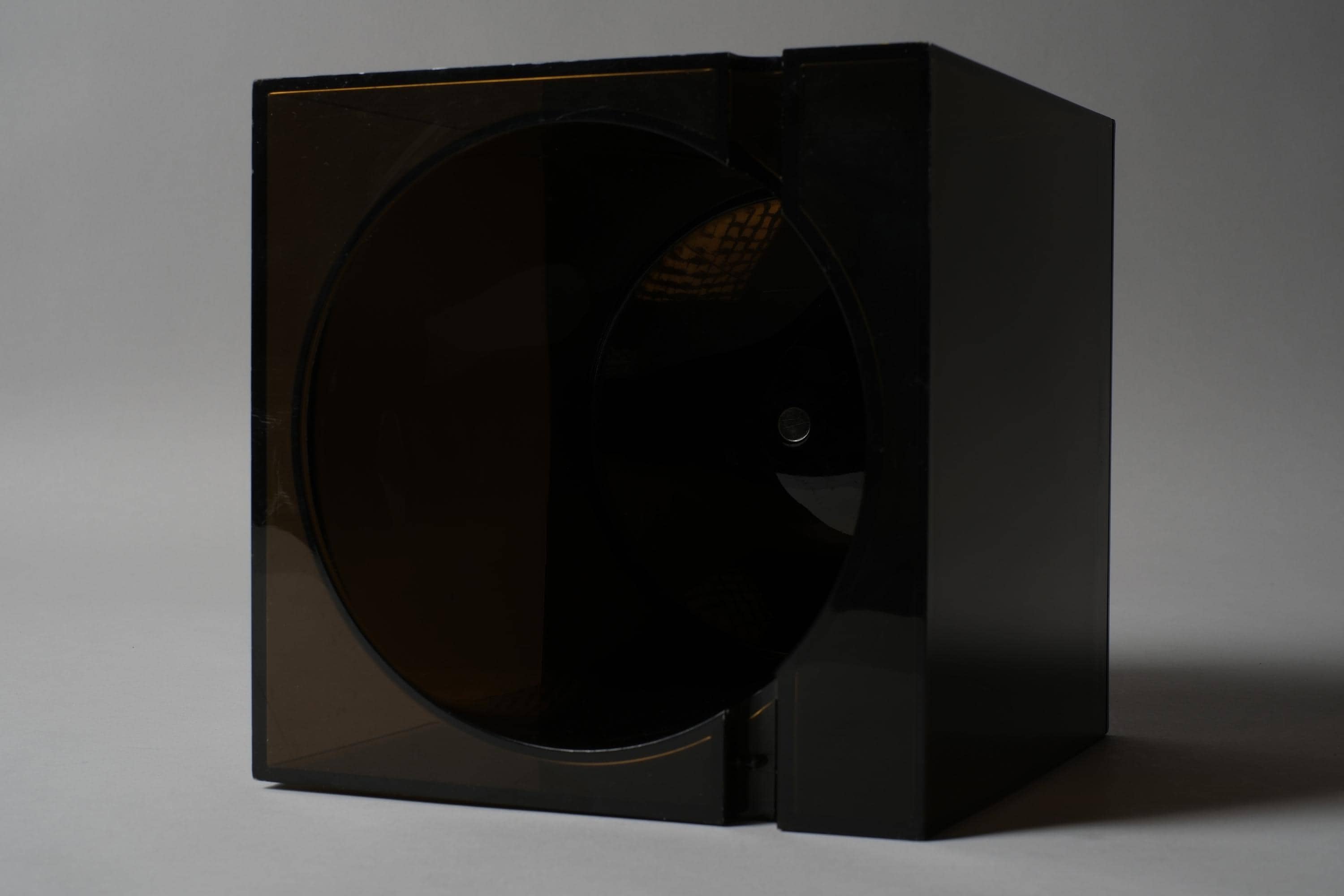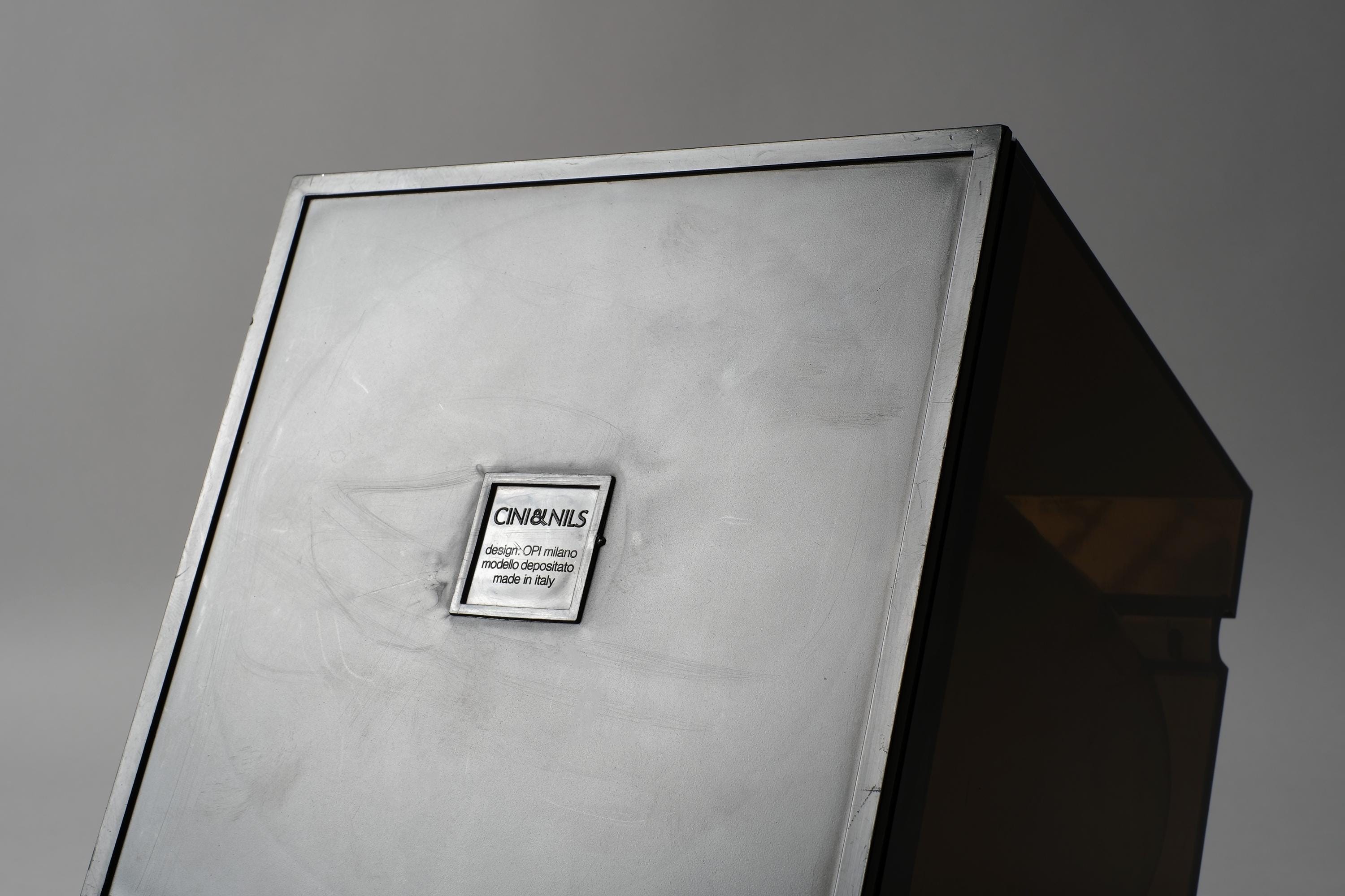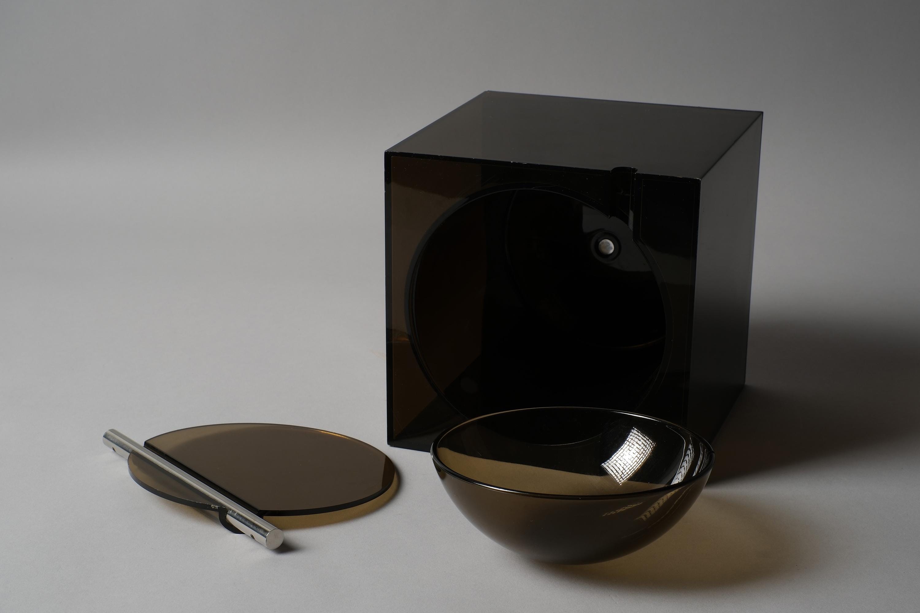Vintage 1970s Cini & Nils ice bucket by Studio O.P.I. Milano, Franco Bettonica and Mario Melocchi. The ice bucket is highly collectible and a serious design object with it's cubic form in smoked brown acrylic with a circular flip-top lid on a stainless steel hinge, the whole object is a minimal sculptural block when closed.