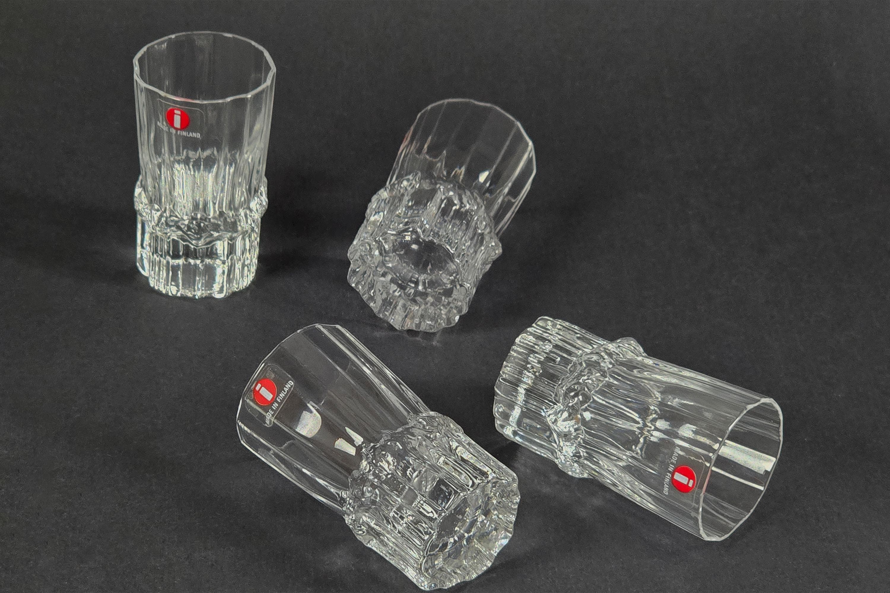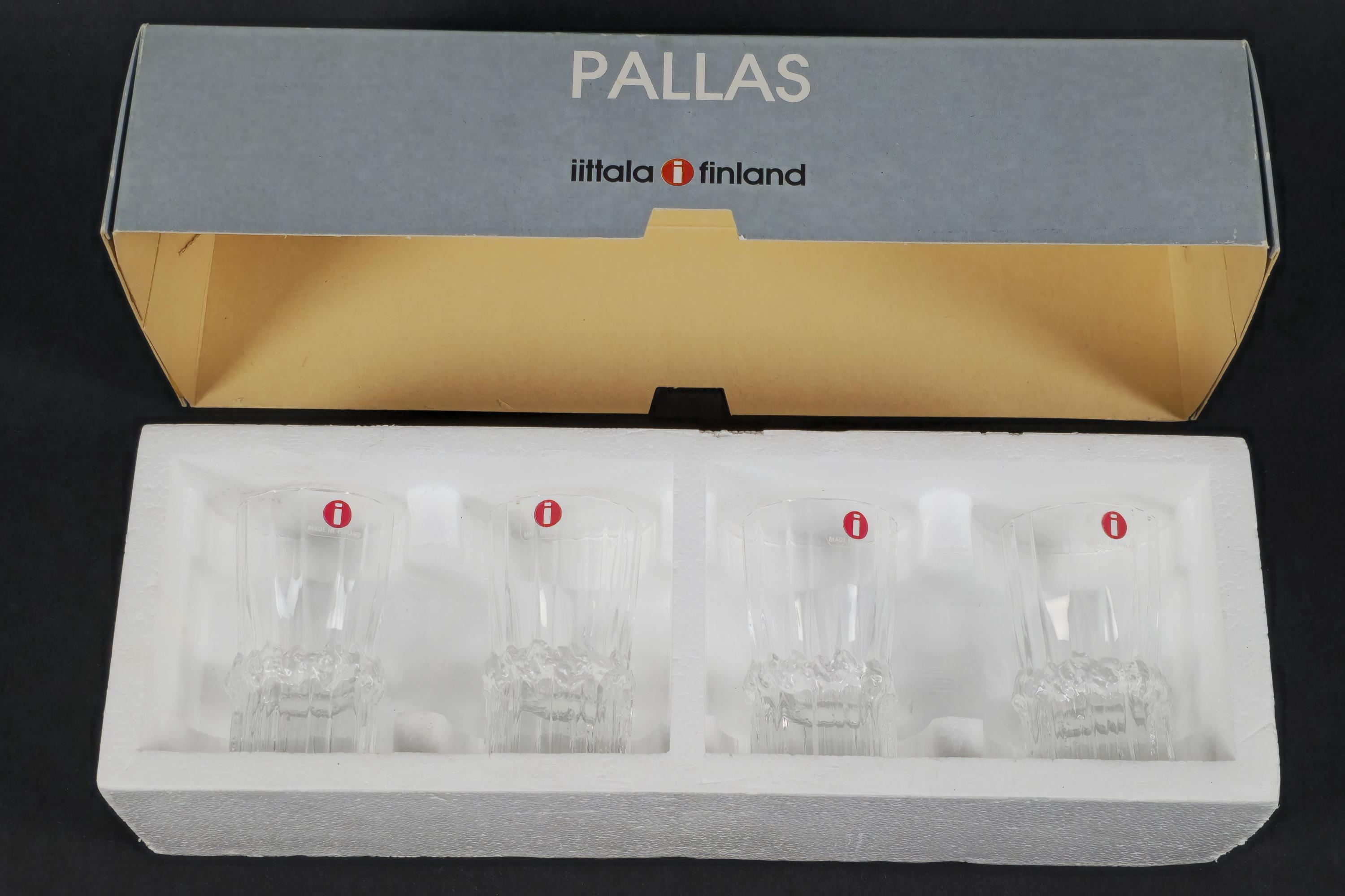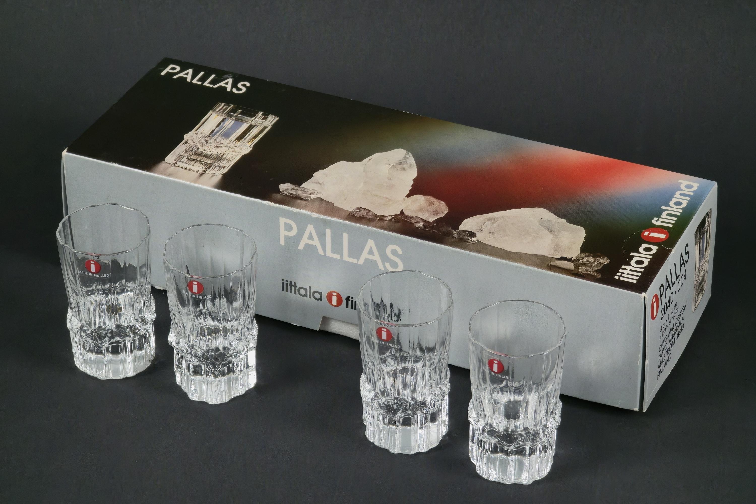 Vintage 1980s Iittala Pallas shot glasses by Tapio Wirkkala, Finland 1980s, a set of four in clear faceted crystal, each glass with a vertically ribbed and faceted body that catches and refracts light. New in original Iittala box, unused. 4cl / 1.5oz capacity.