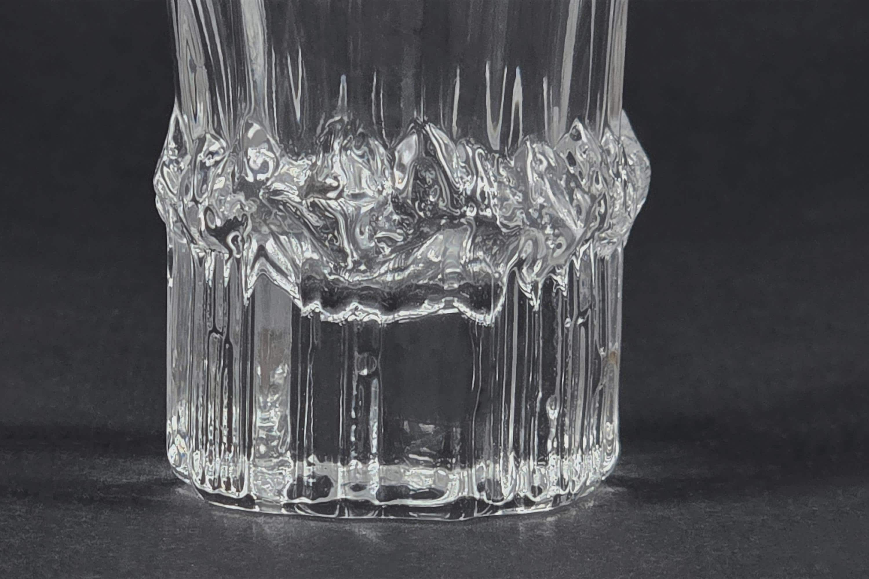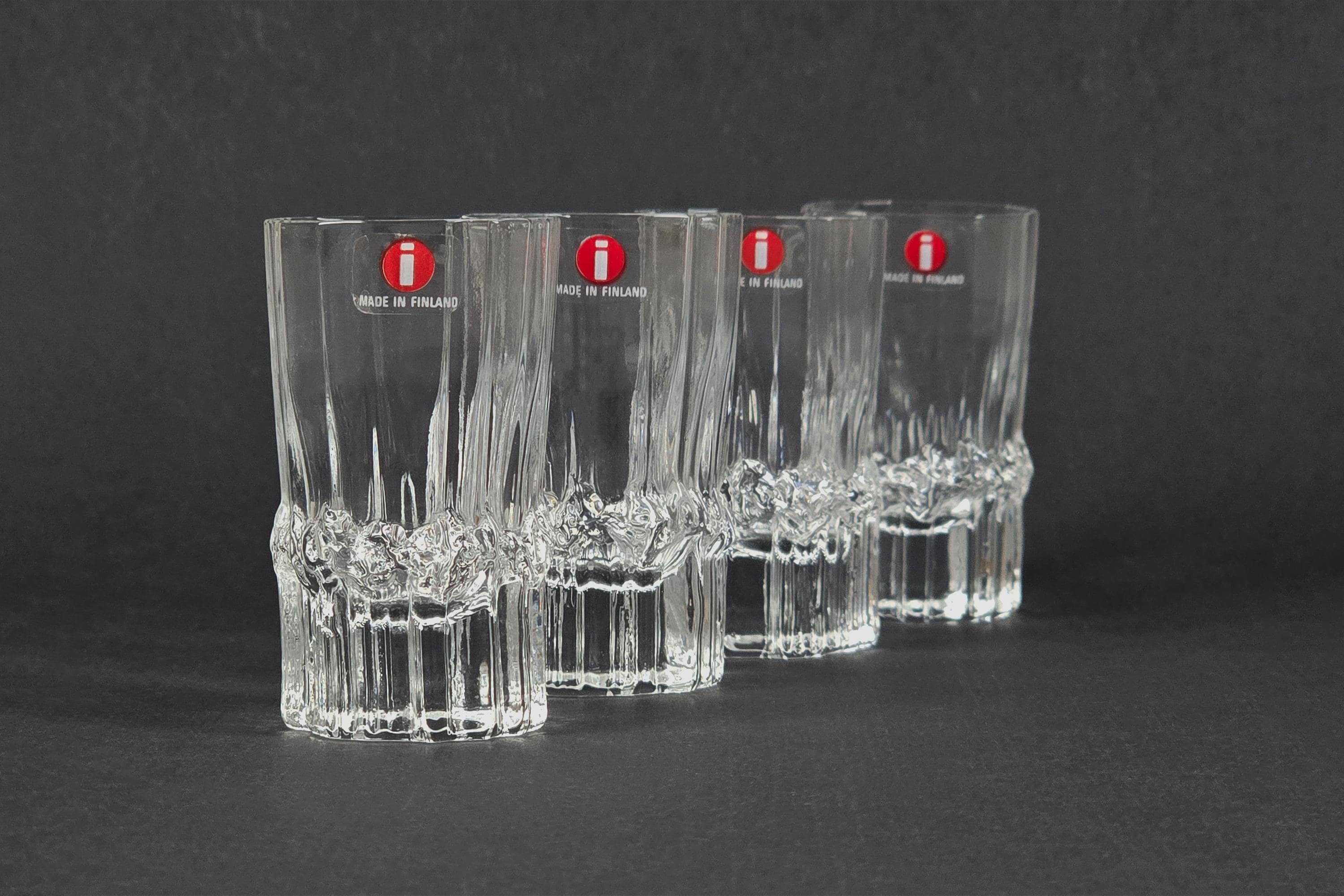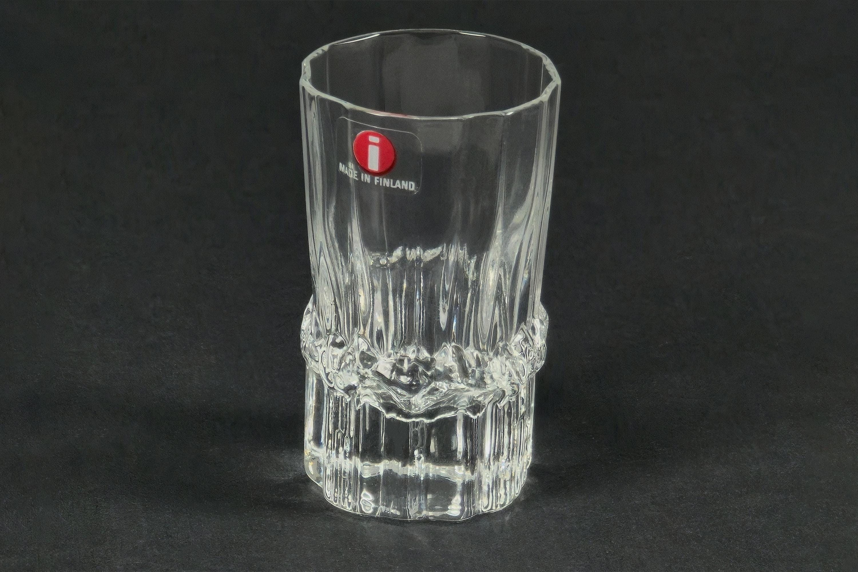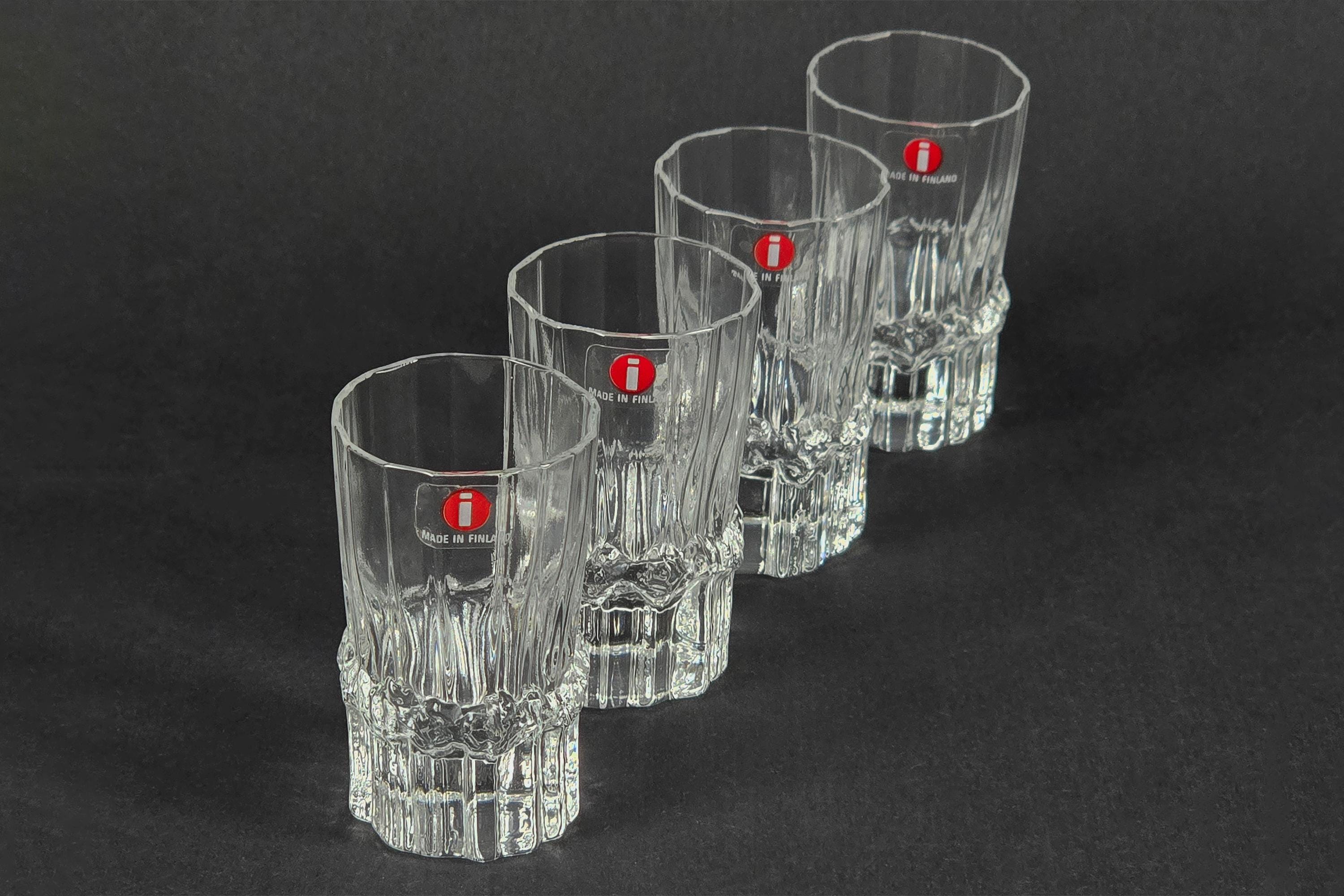 Vintage 1980s Iittala Pallas shot glasses by Tapio Wirkkala, Finland 1980s, a set of four in clear faceted crystal, each glass with a vertically ribbed and faceted body that catches and refracts light. New in original Iittala box, unused. 4cl / 1.5oz capacity.