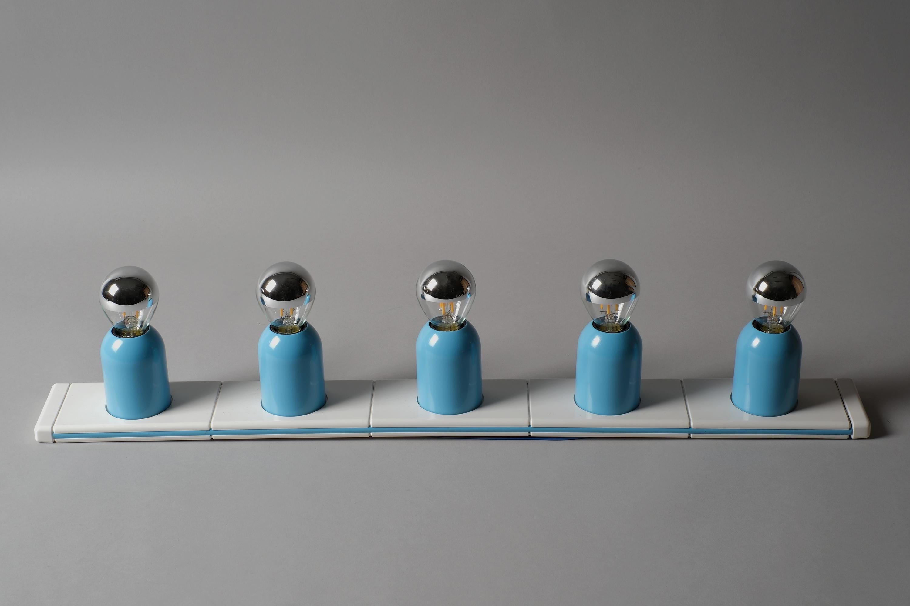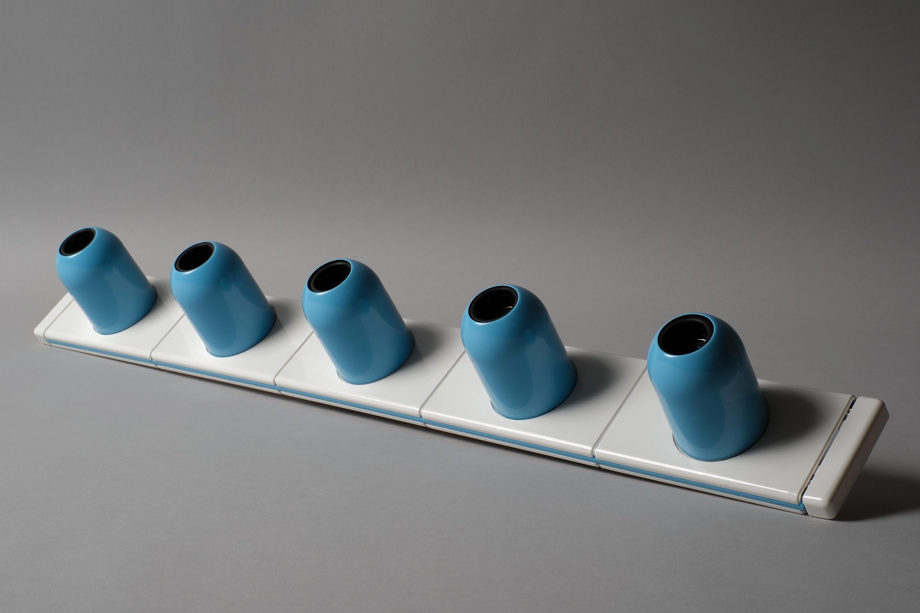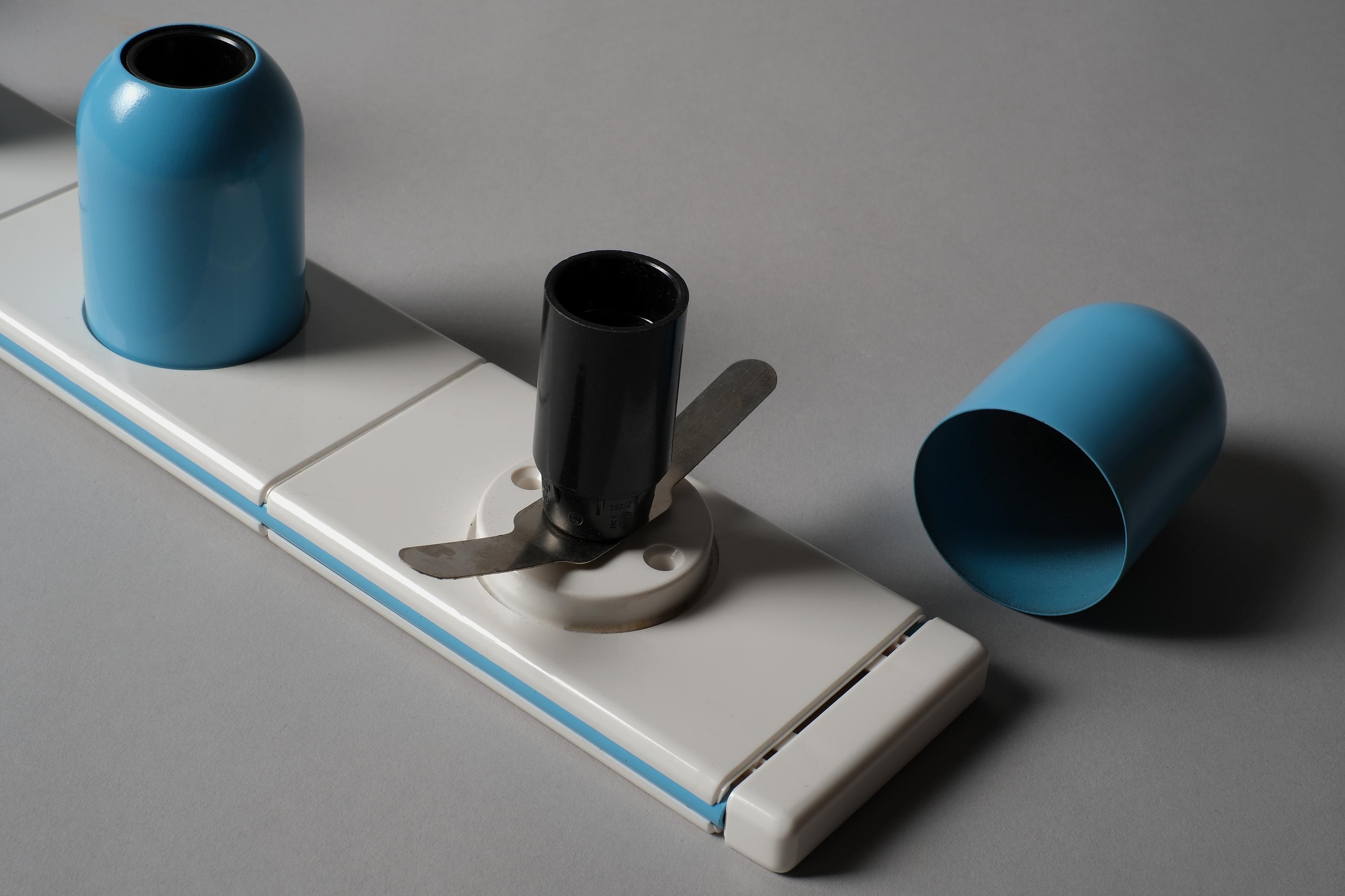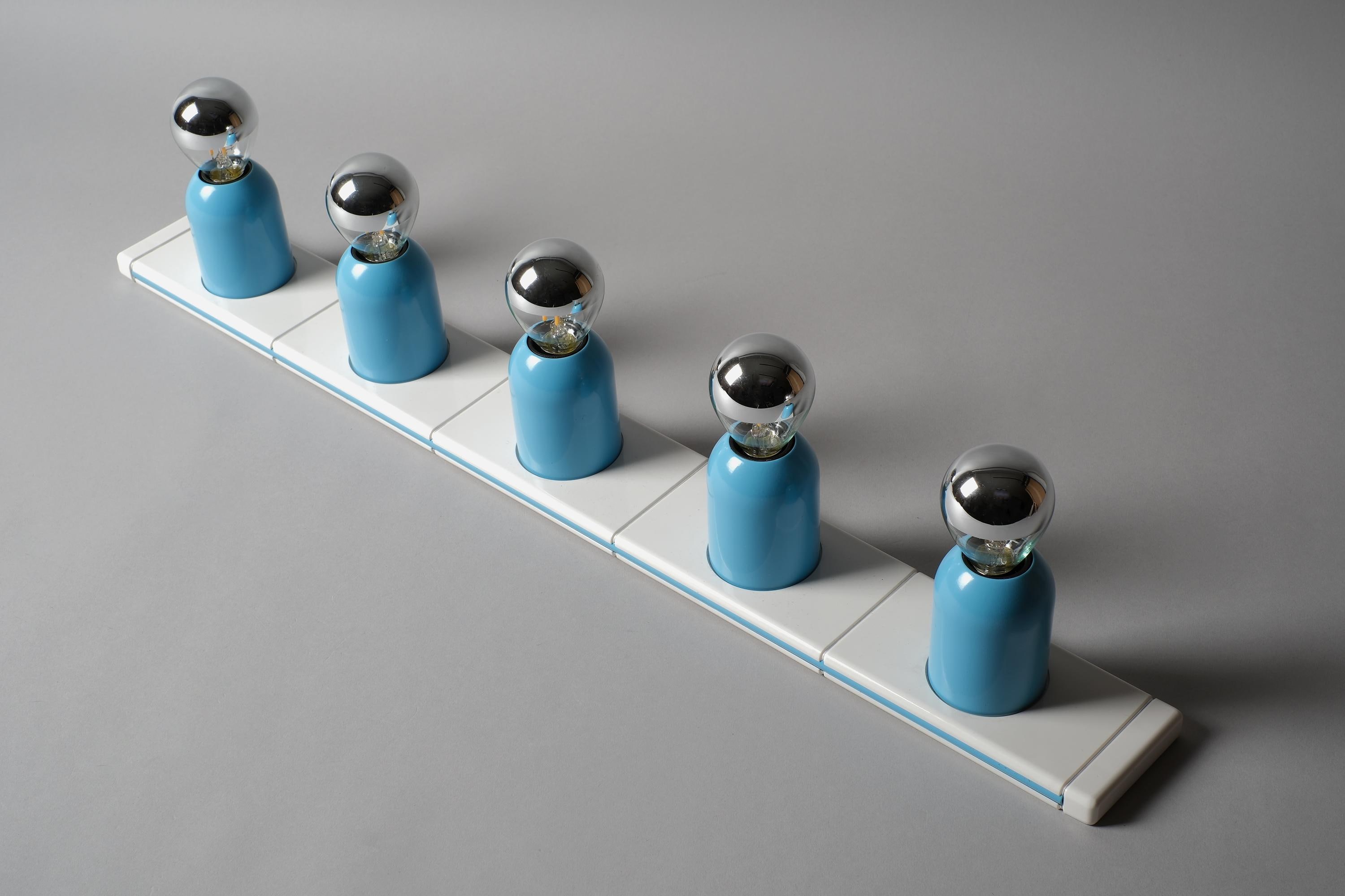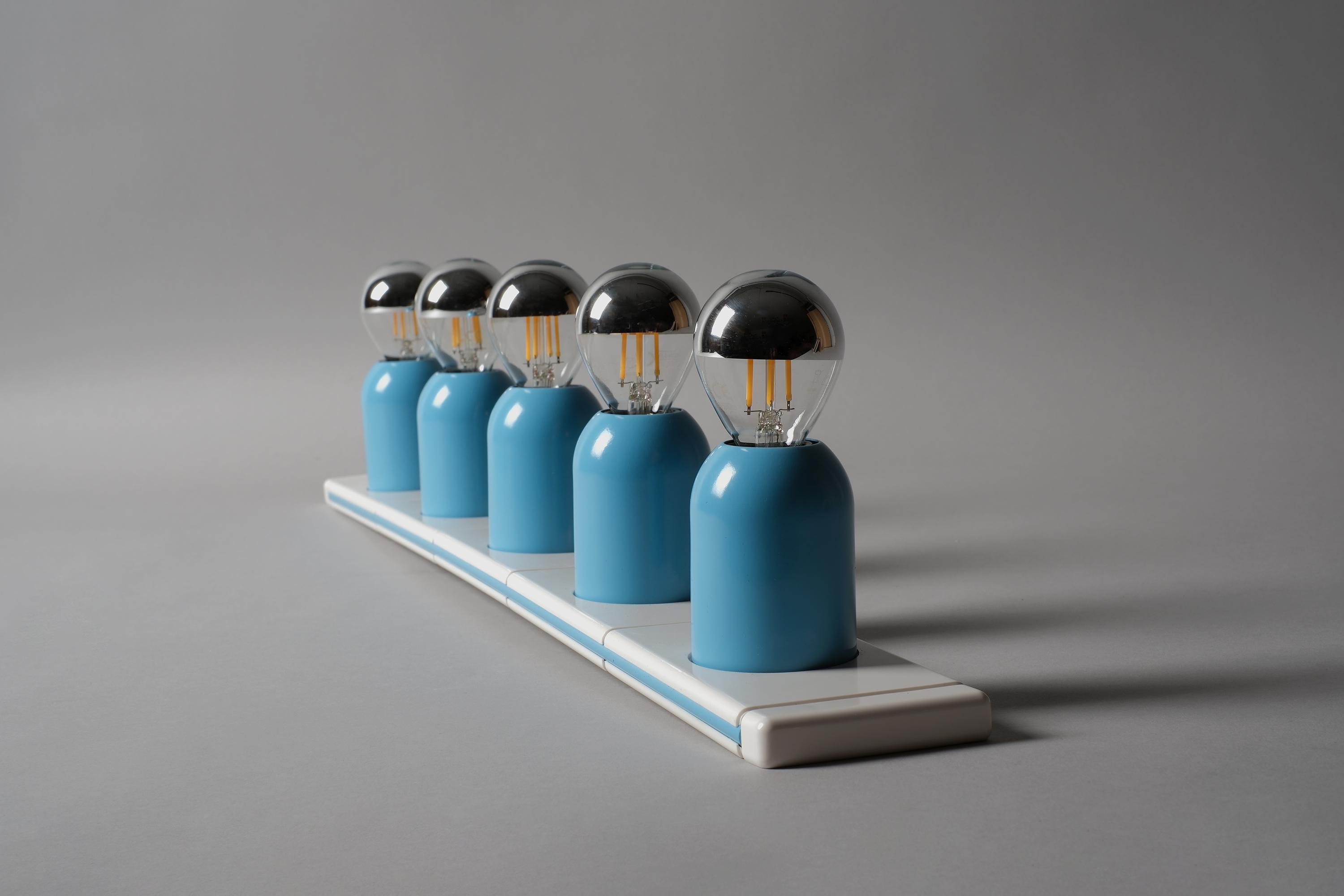 New in box 1970s Targetti Sankey Domino five-light wall lamp system by Ezio Bellini, Italy. White plastic mounting plate carrying five cylindrical blue metal fitting covers, each housing an E14 socket, the whole system functions as a modular wall-mounted light bar. New old stock, unused. Fully functional.