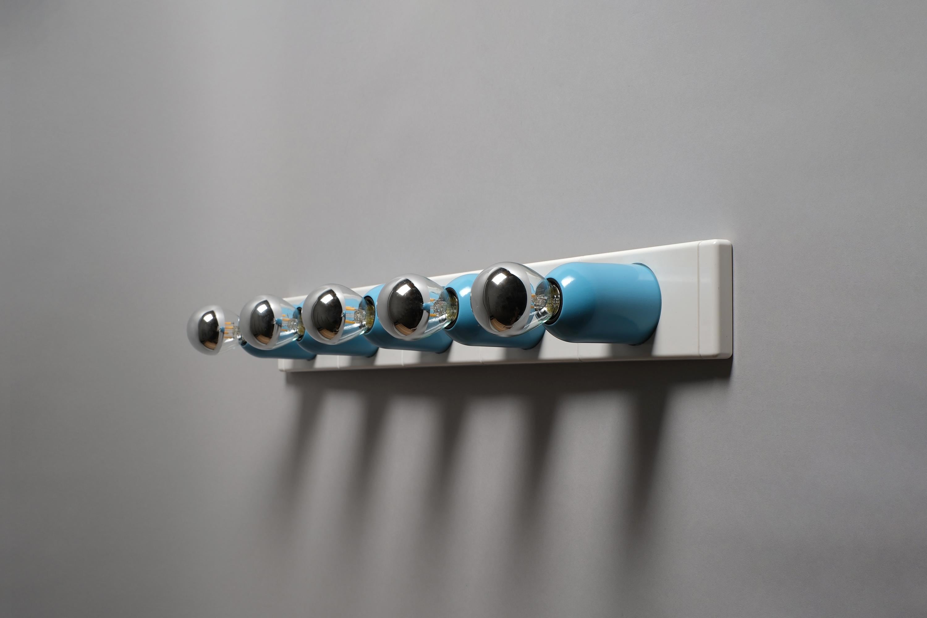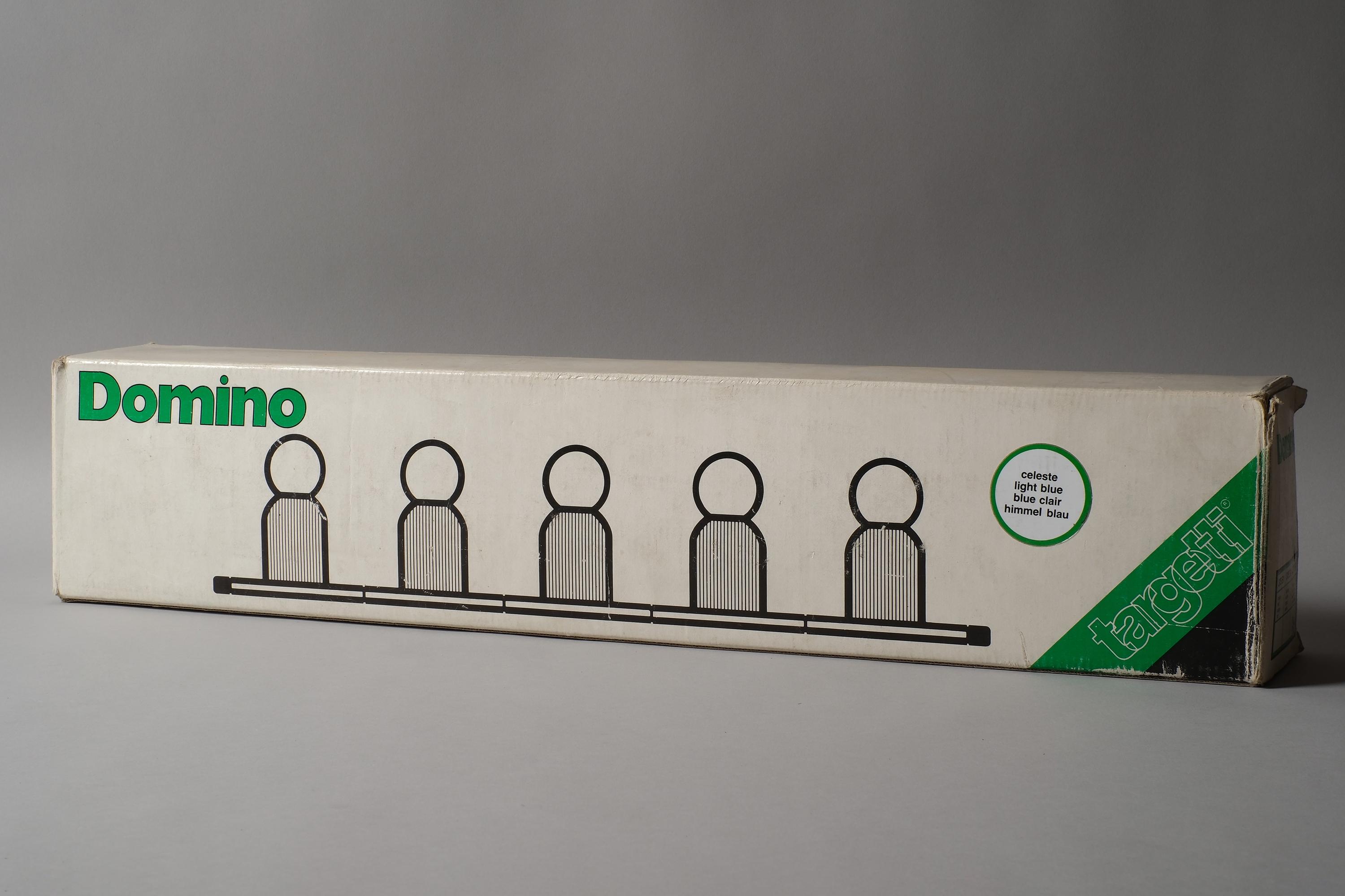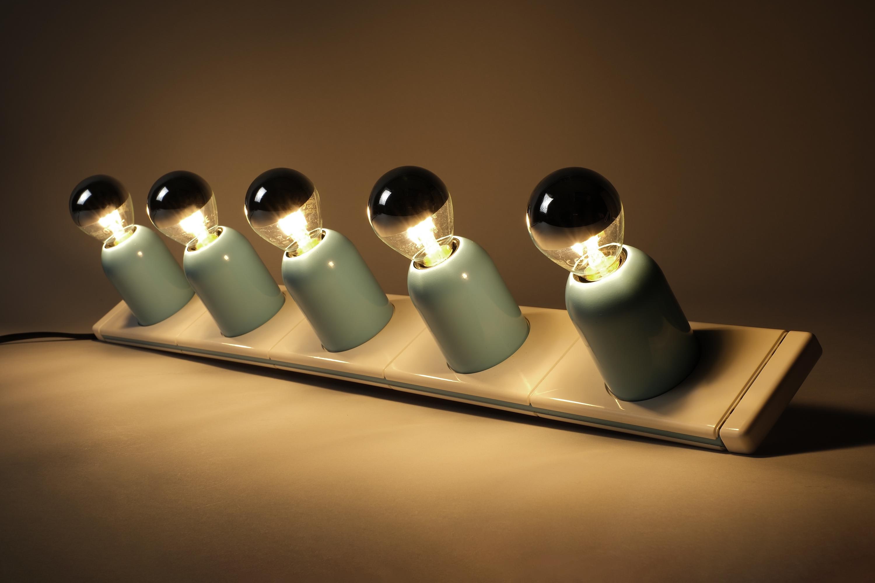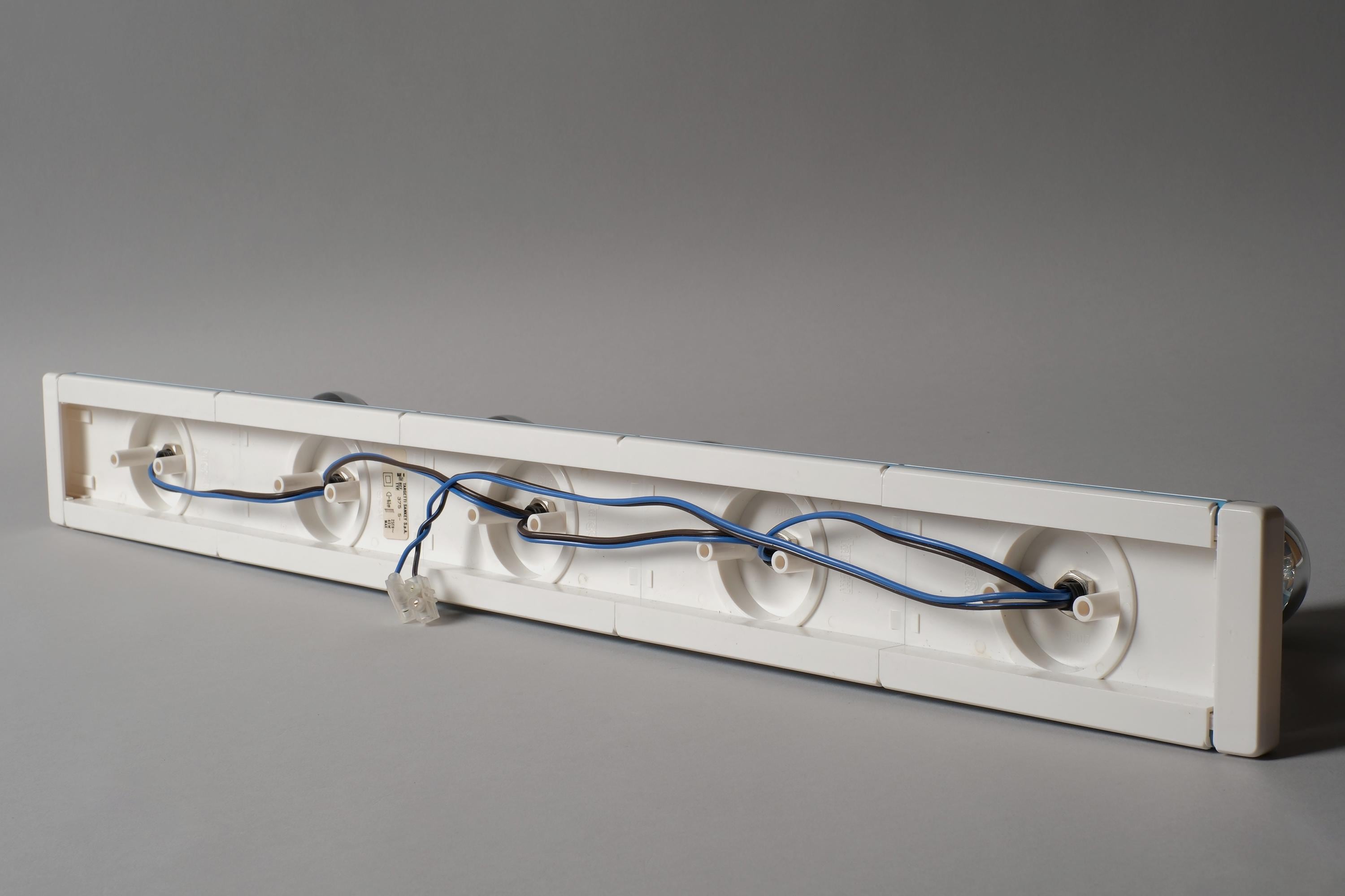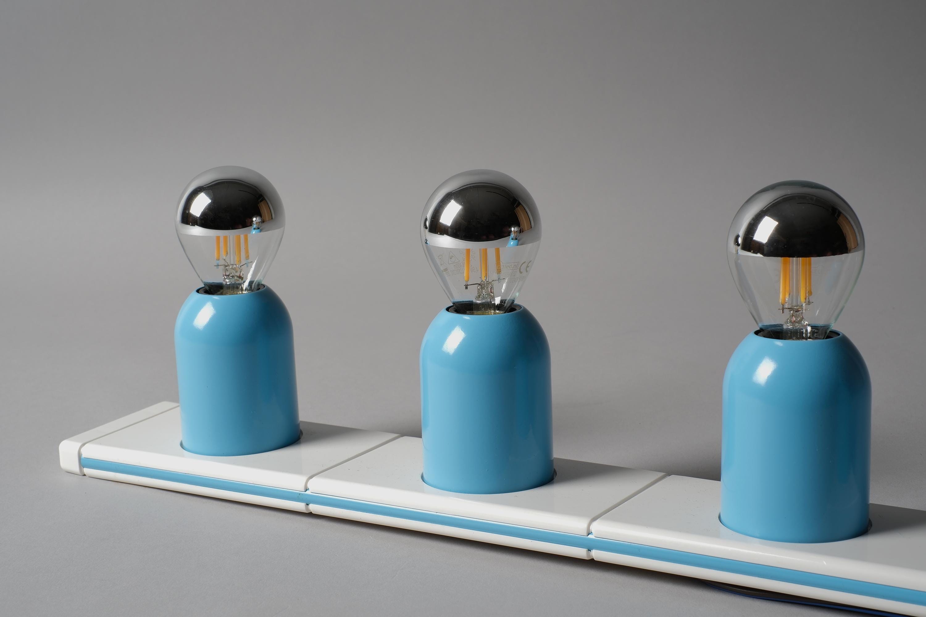 New in box 1970s Targetti Sankey Domino five-light wall lamp system by Ezio Bellini, Italy. White plastic mounting plate carrying five cylindrical blue metal fitting covers, each housing an E14 socket, the whole system functions as a modular wall-mounted light bar. New old stock, unused. Fully functional.