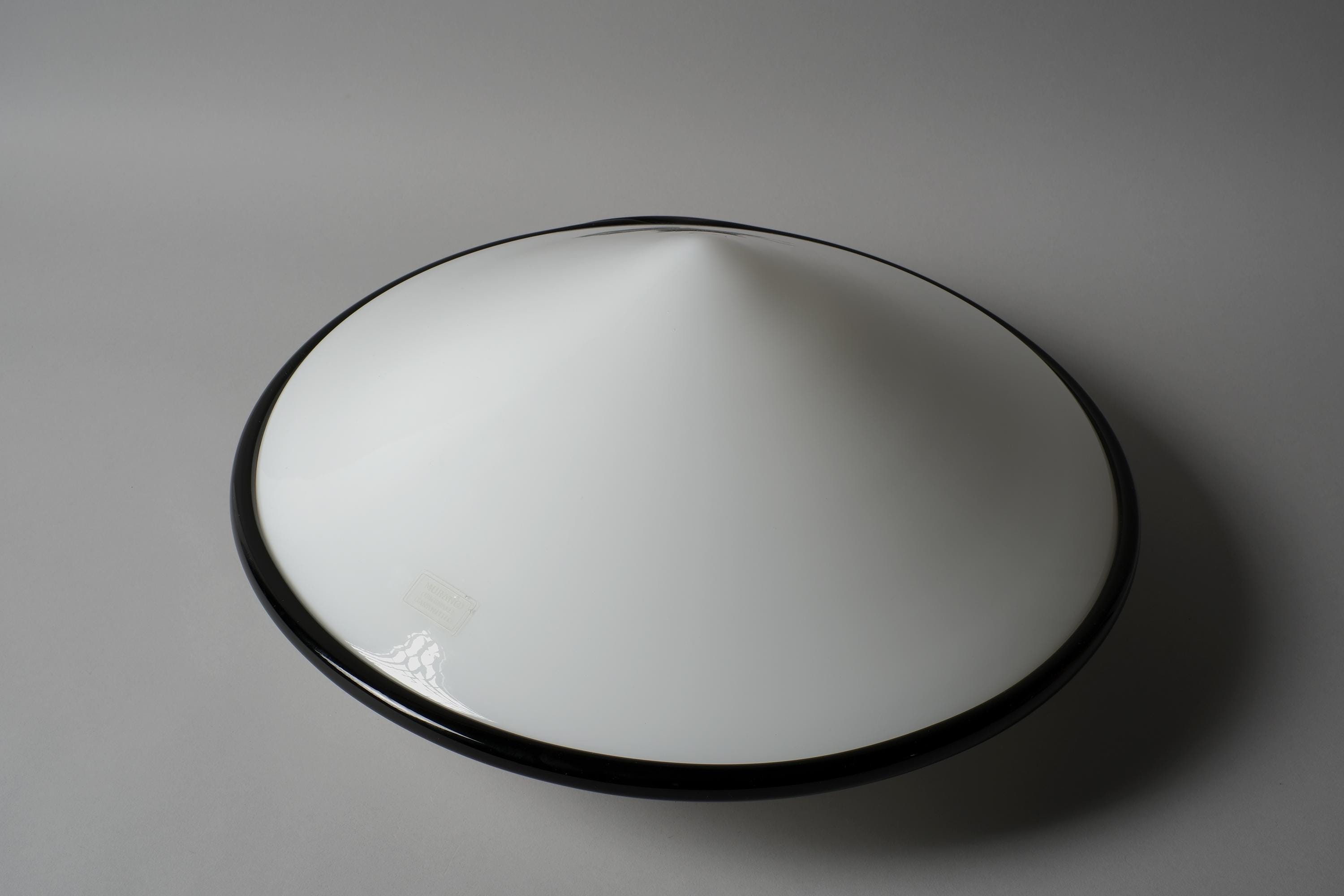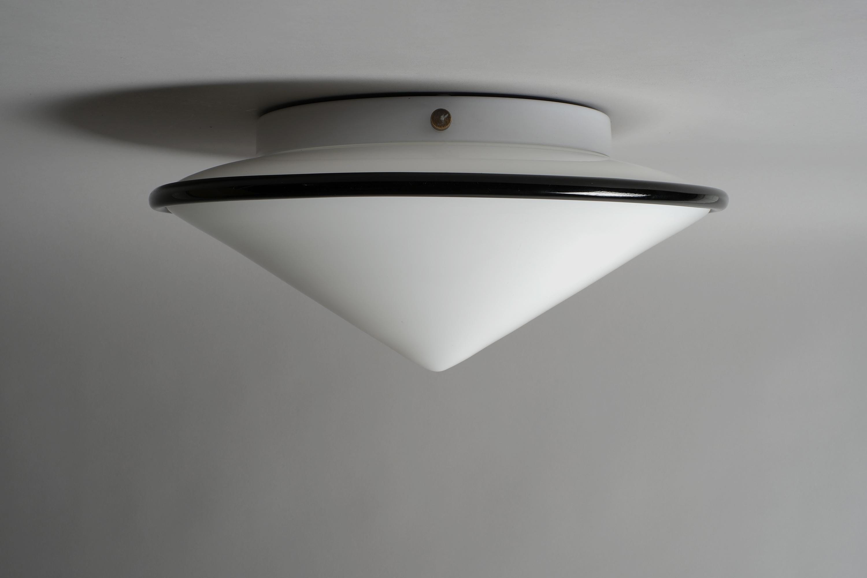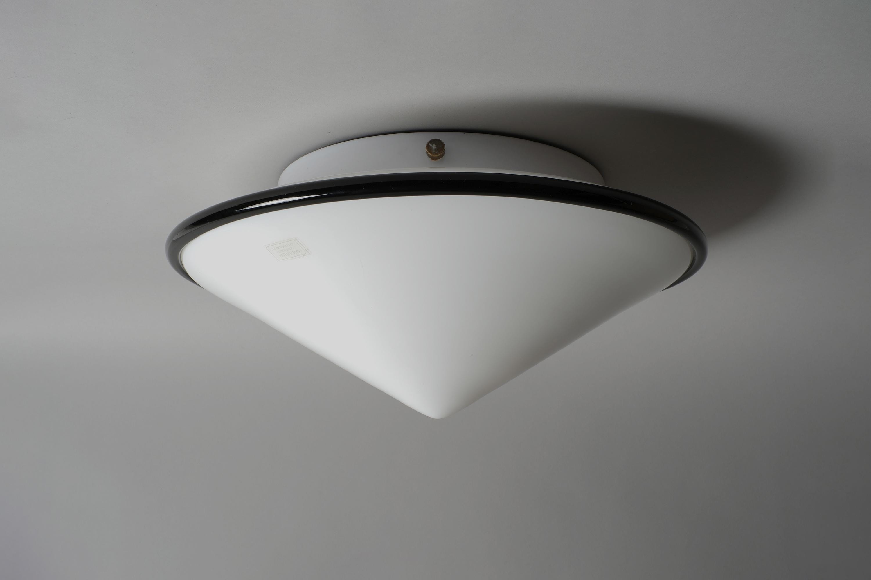 1980s Original Murano glass ceiling flush mount in opal white hand-blown glass with a black glass rim, Italy. Classic postmodern conical profile tapering from the wide black-rimmed base to a rounded apex, two E27 sockets concealed within, the opal glass diffuses light warmly and evenly across the room. Original Murano sticker on the shade. No chips, no cracks. Excellent condition.