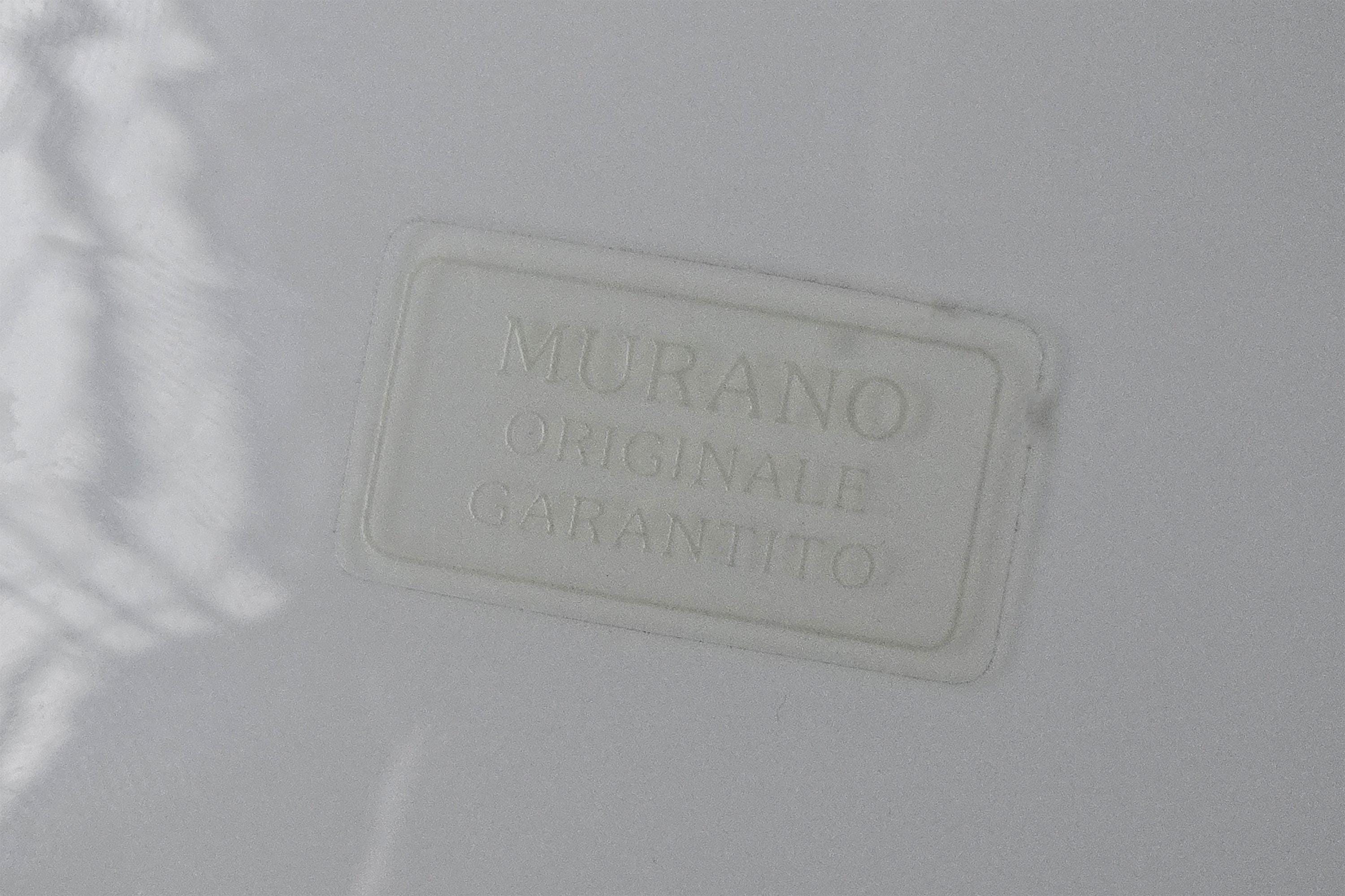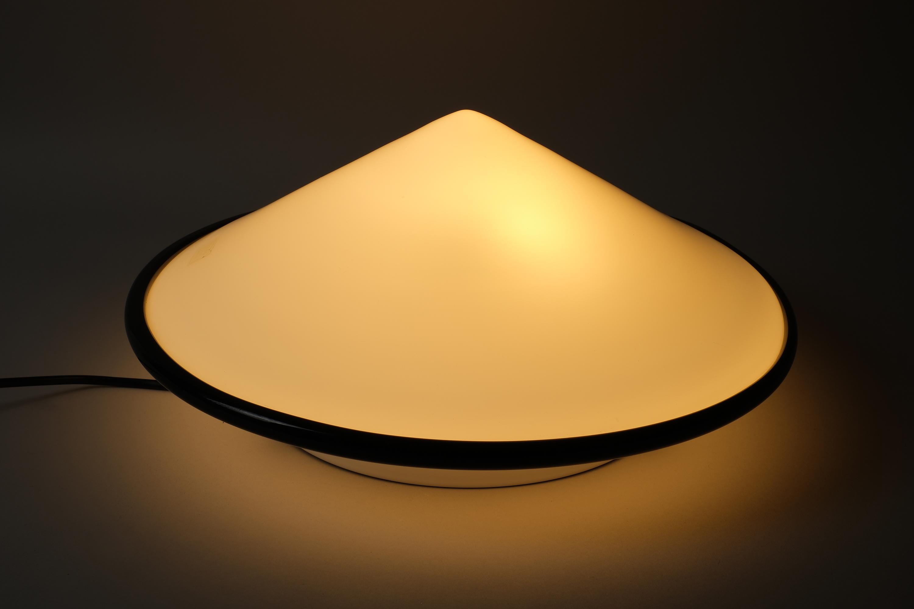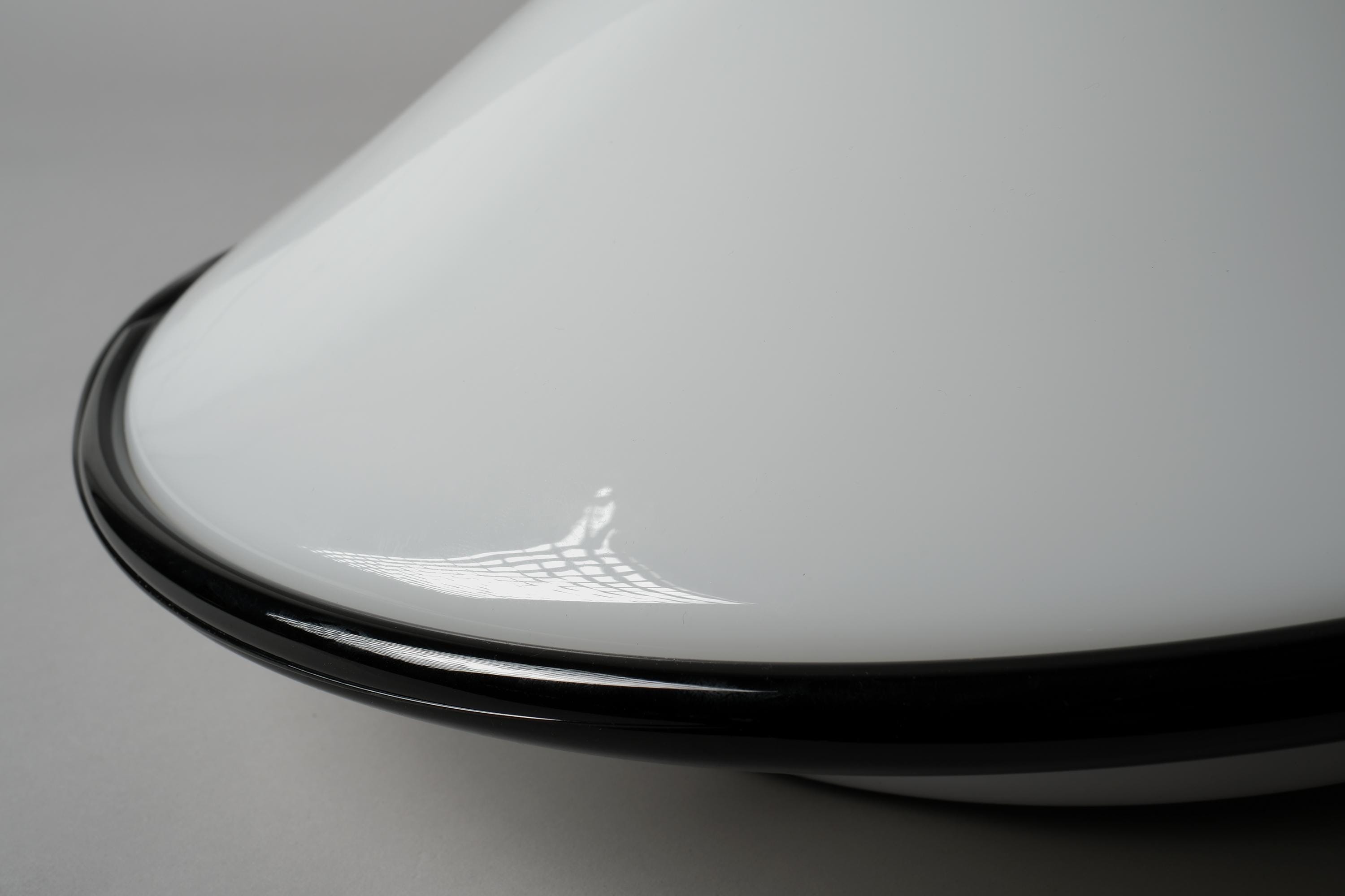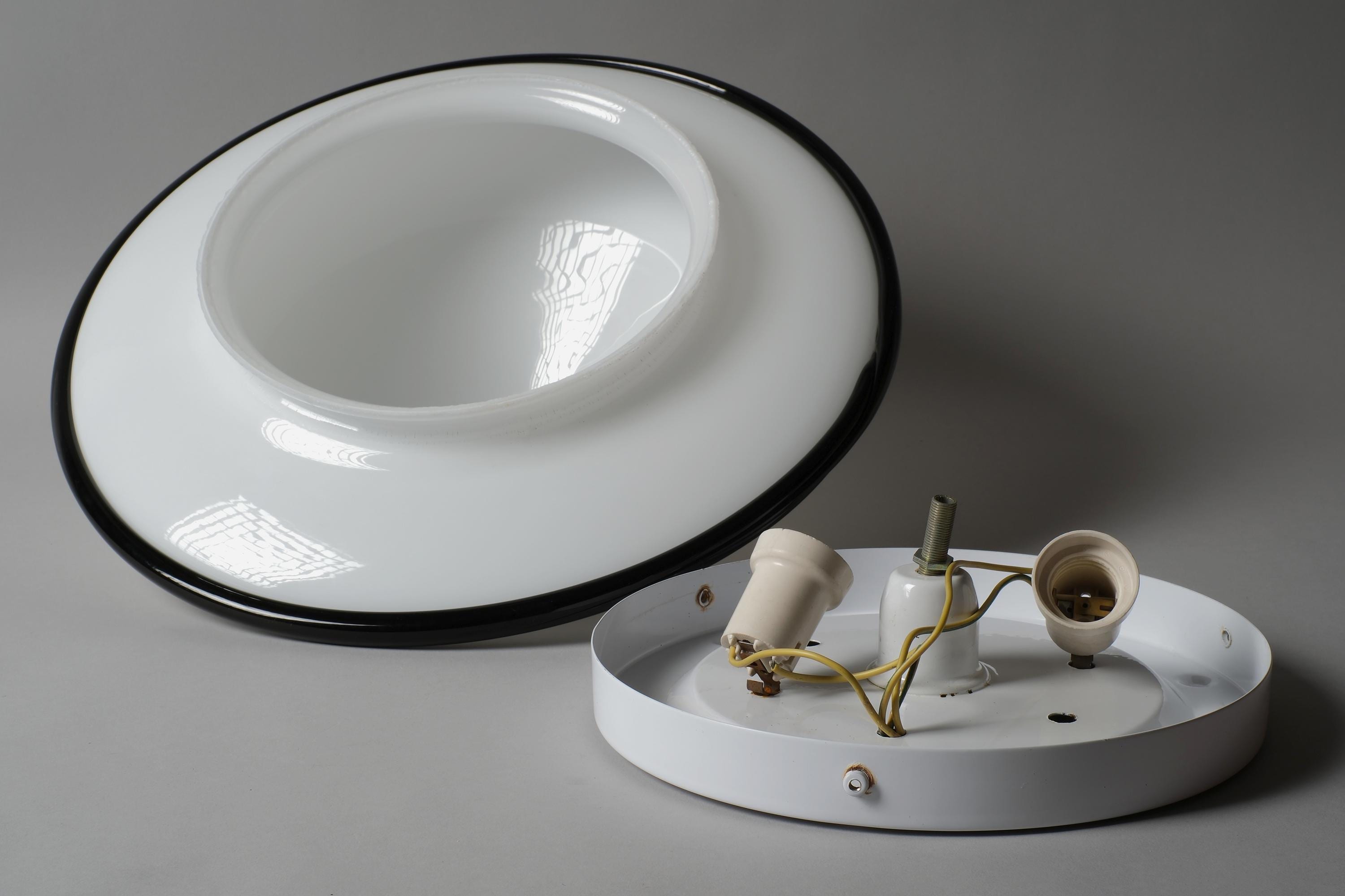 1980s Original Murano glass ceiling flush mount in opal white hand-blown glass with a black glass rim, Italy. Classic postmodern conical profile tapering from the wide black-rimmed base to a rounded apex, two E27 sockets concealed within, the opal glass diffuses light warmly and evenly across the room. Original Murano sticker on the shade. No chips, no cracks. Excellent condition.