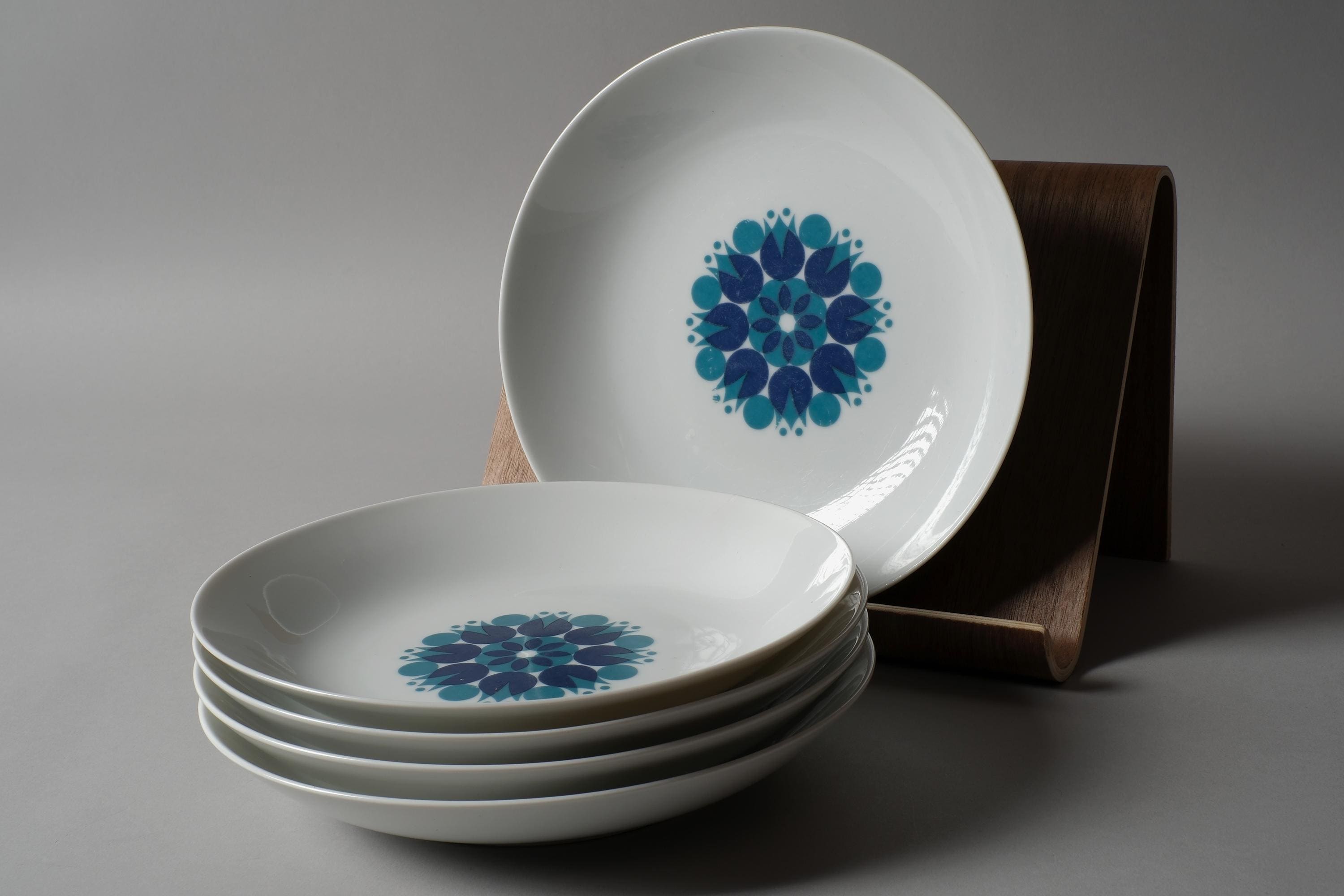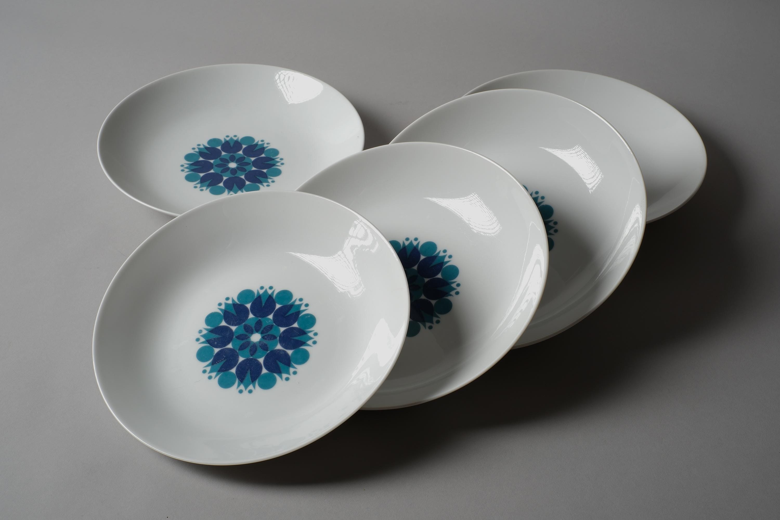 Vintage 1970s Thomas Porcelain Pinwheel Blue side plates, West Germany. Set of five in white porcelain with a central geometric pinwheel rosette in cobalt and teal blue, the pattern is characteristic of German porcelain production. Thomas mark on the reverse of each plate. Excellent condition, no chips or cracks.