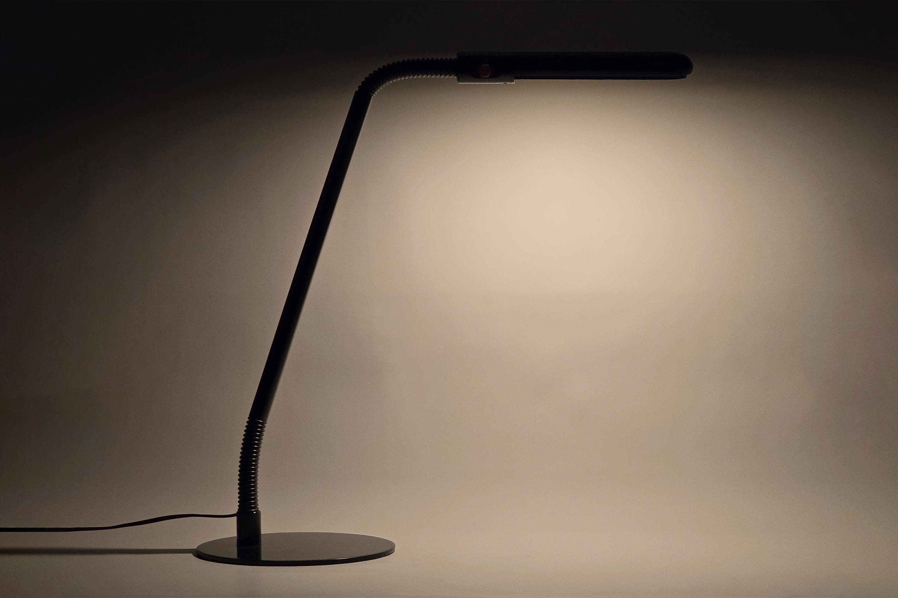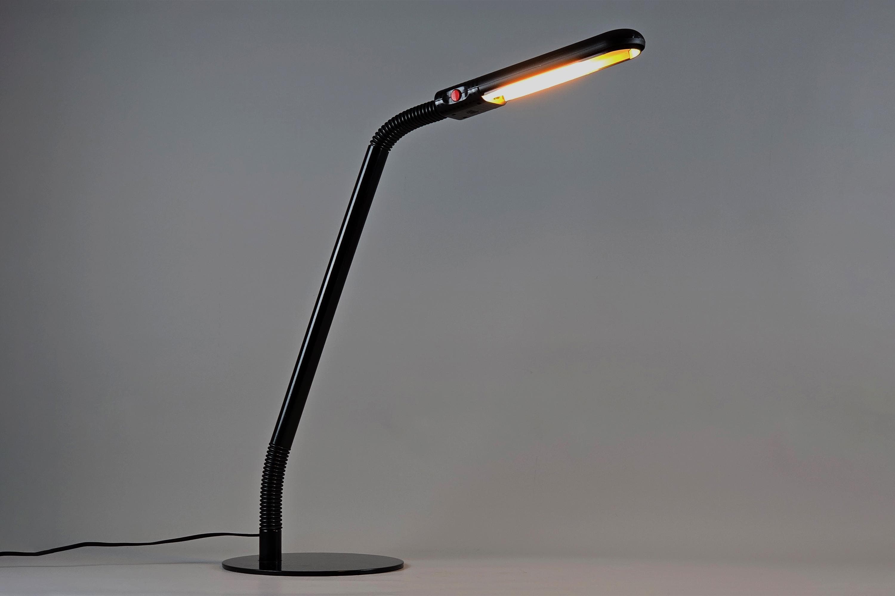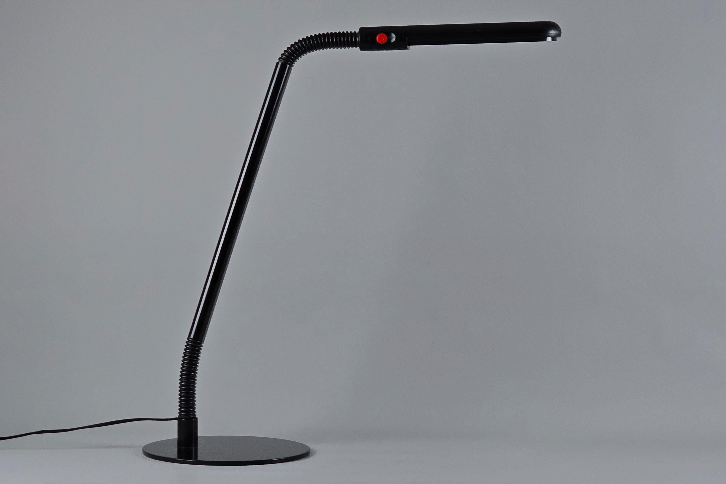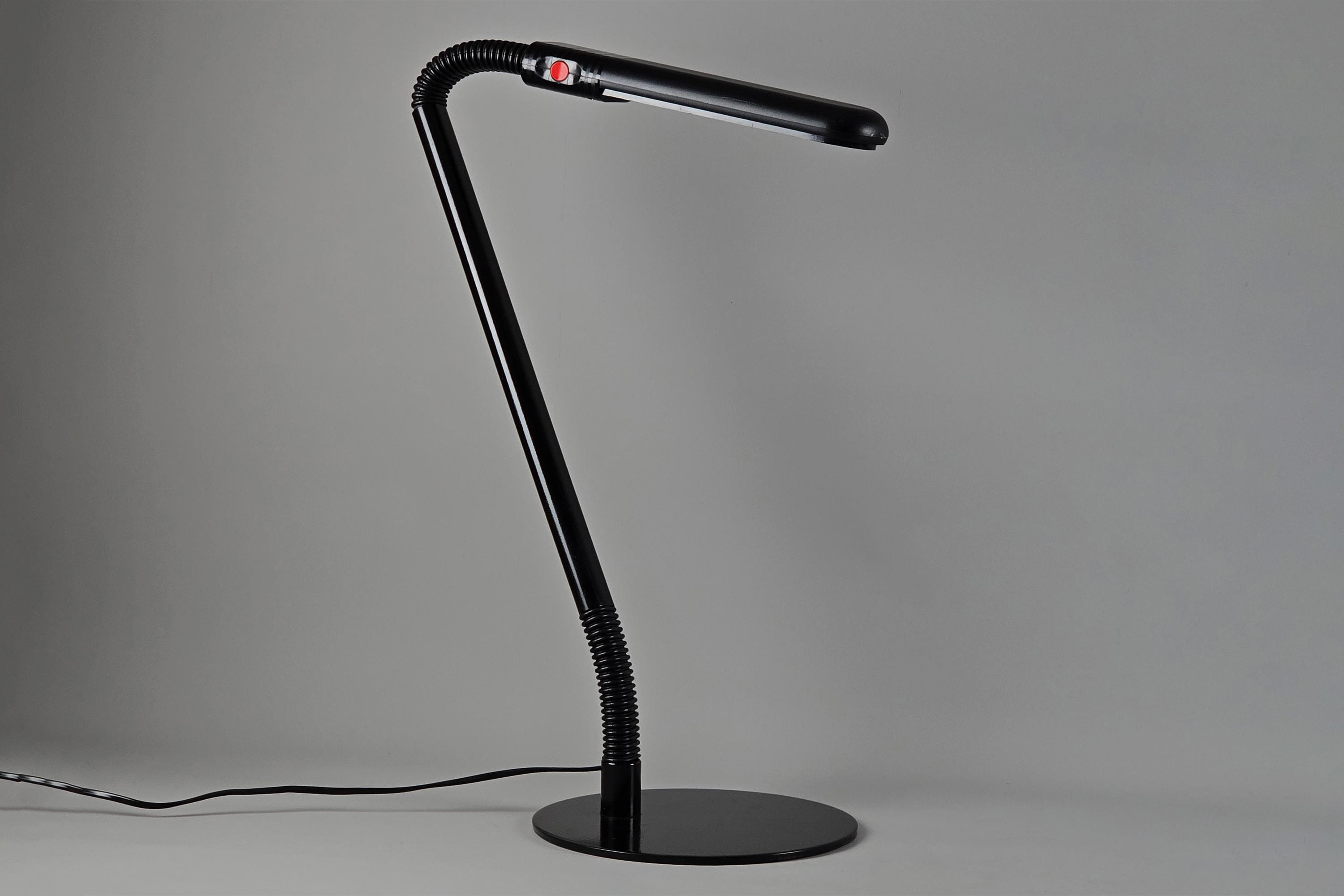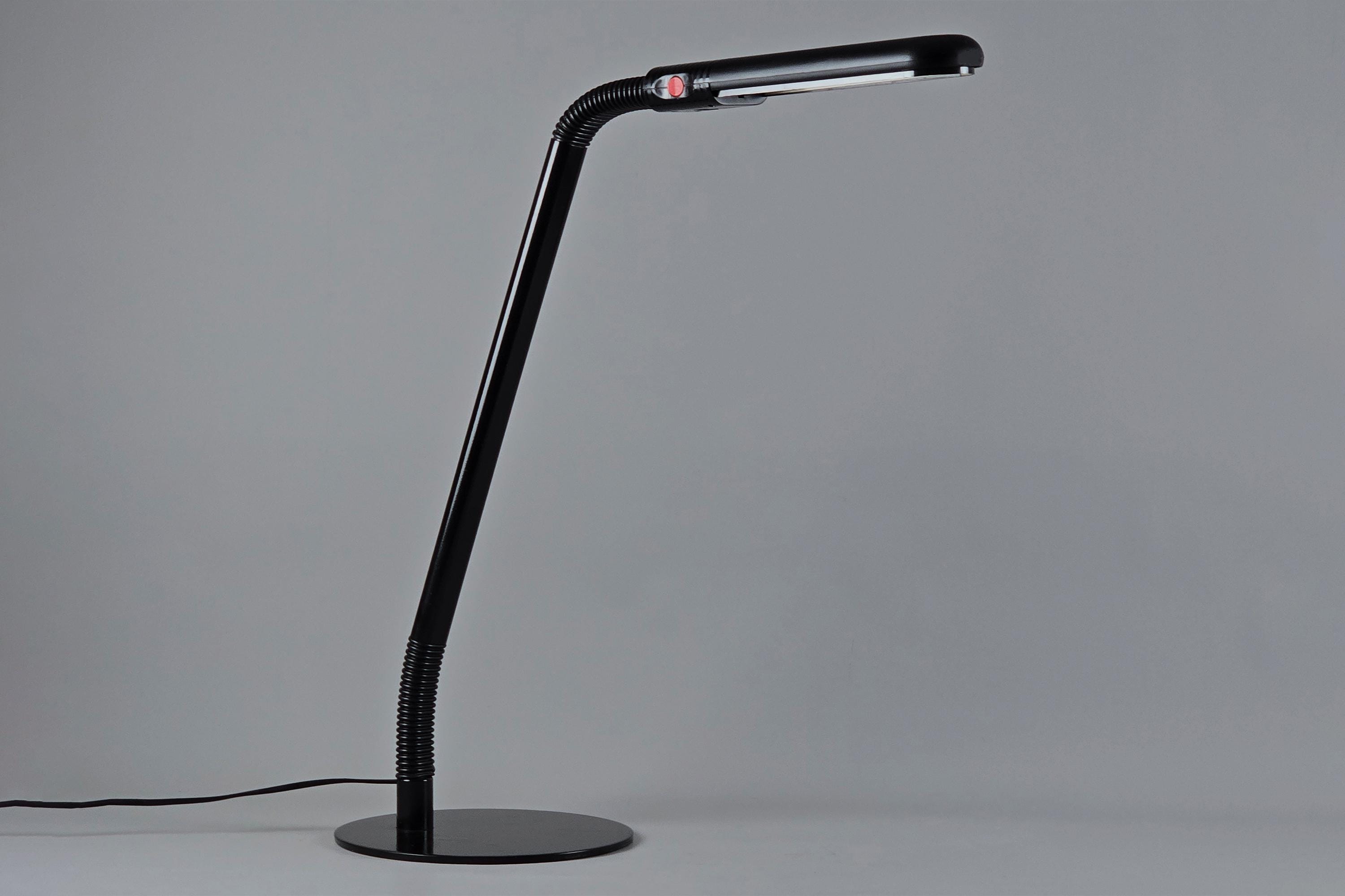 Manade LF11 Flexo task lamp by Philippe Michel, France 1983. Black lacquered metal arm in two articulated sections connected to a flat weighted base, two 360° swivel points which allows the head to be directed precisely, the compact fluorescent head produces a clean, focused work light.